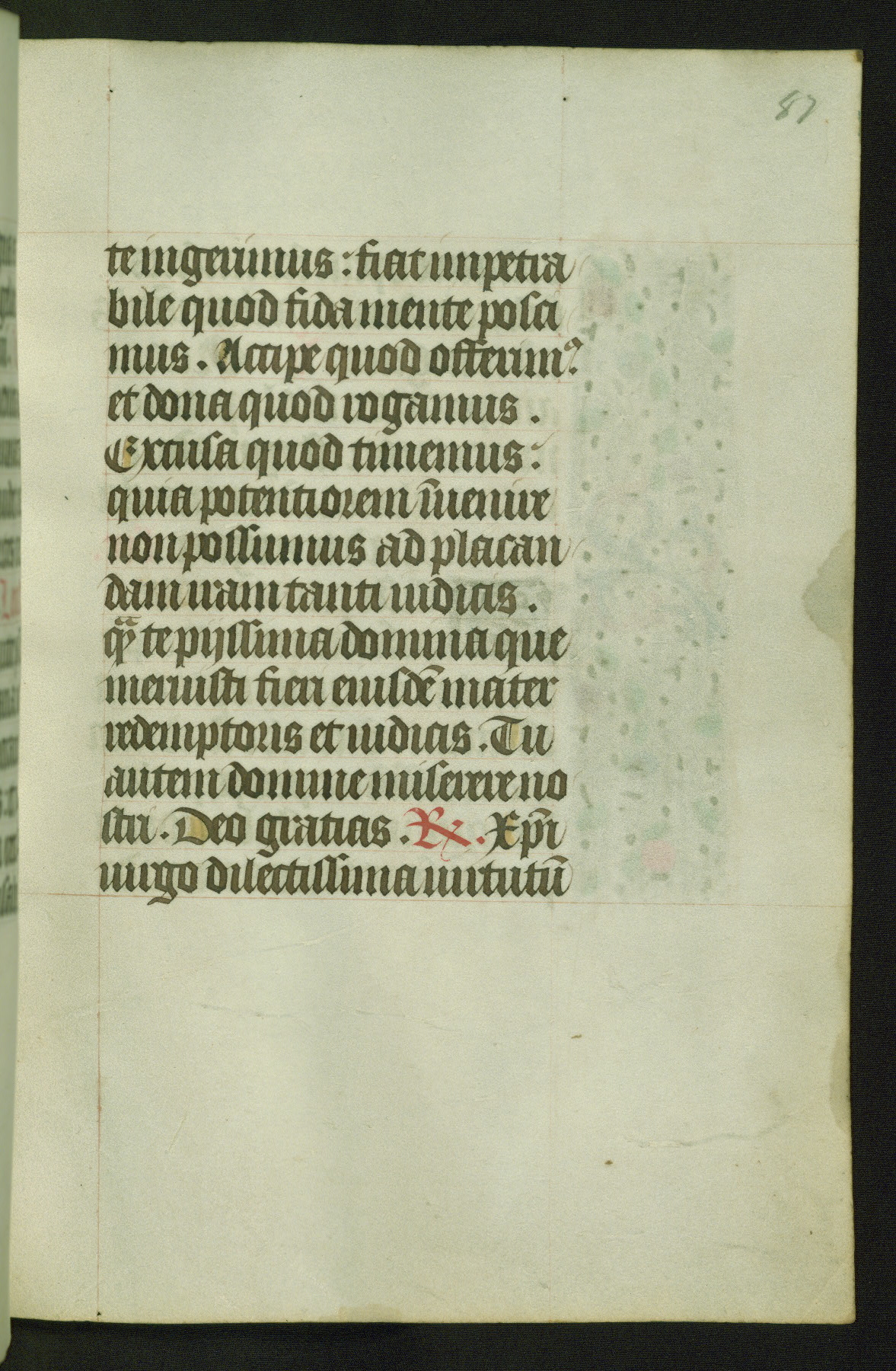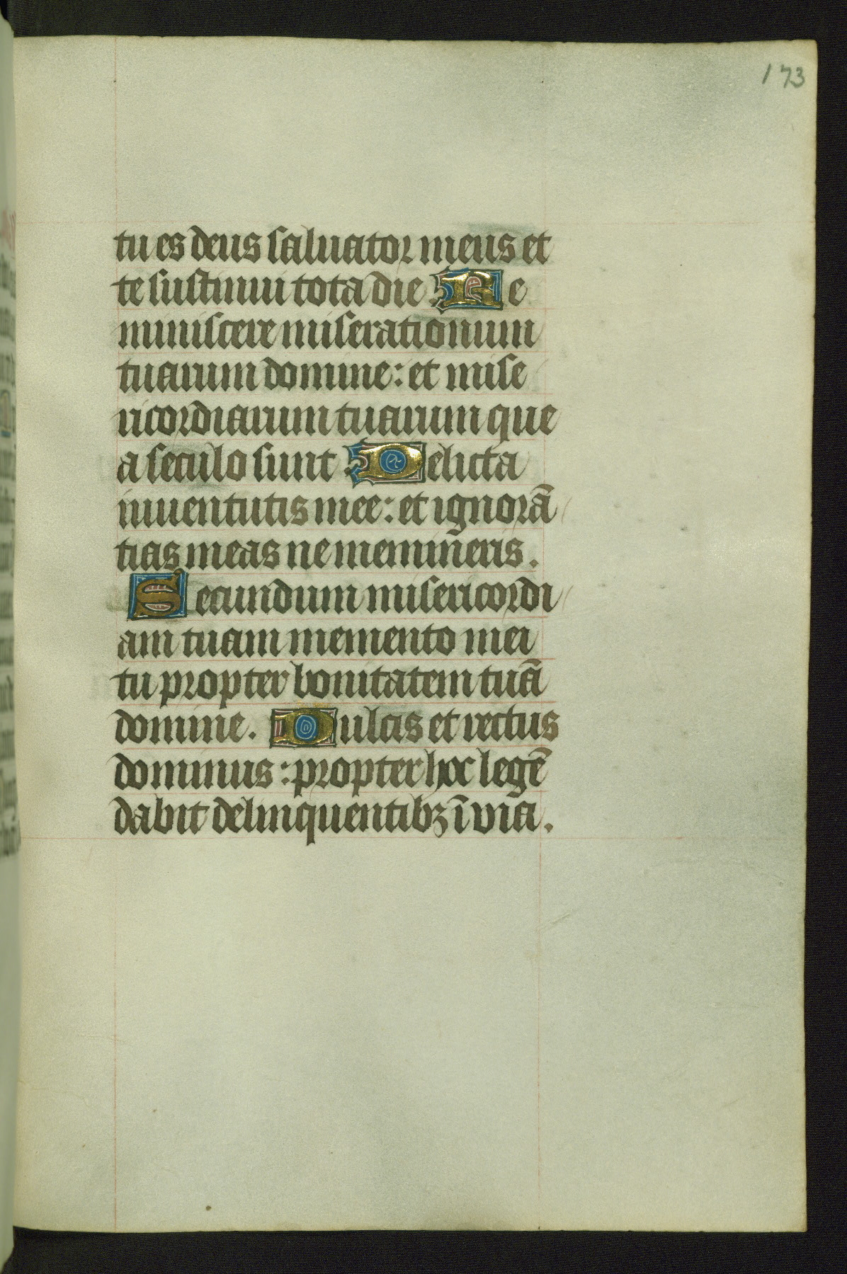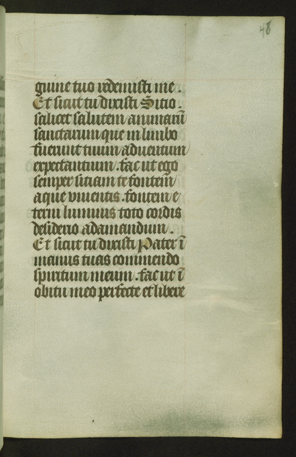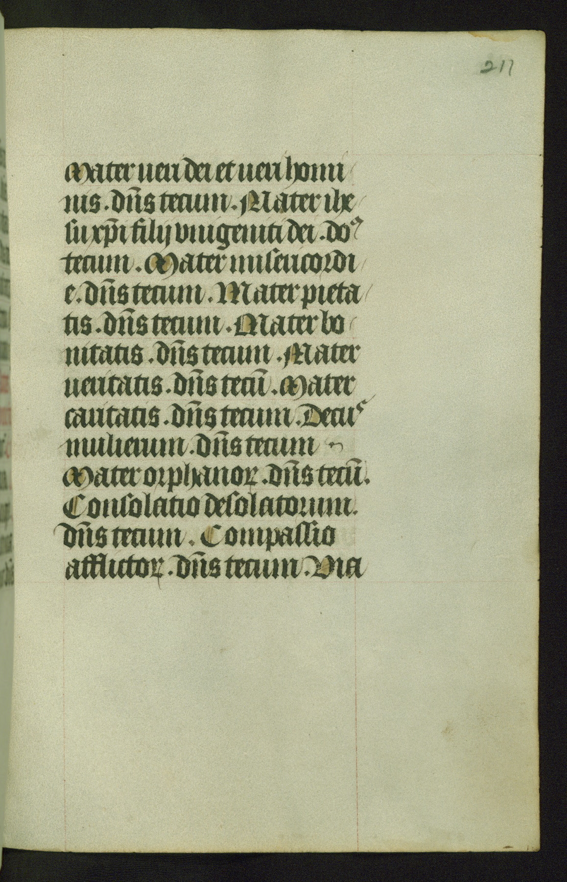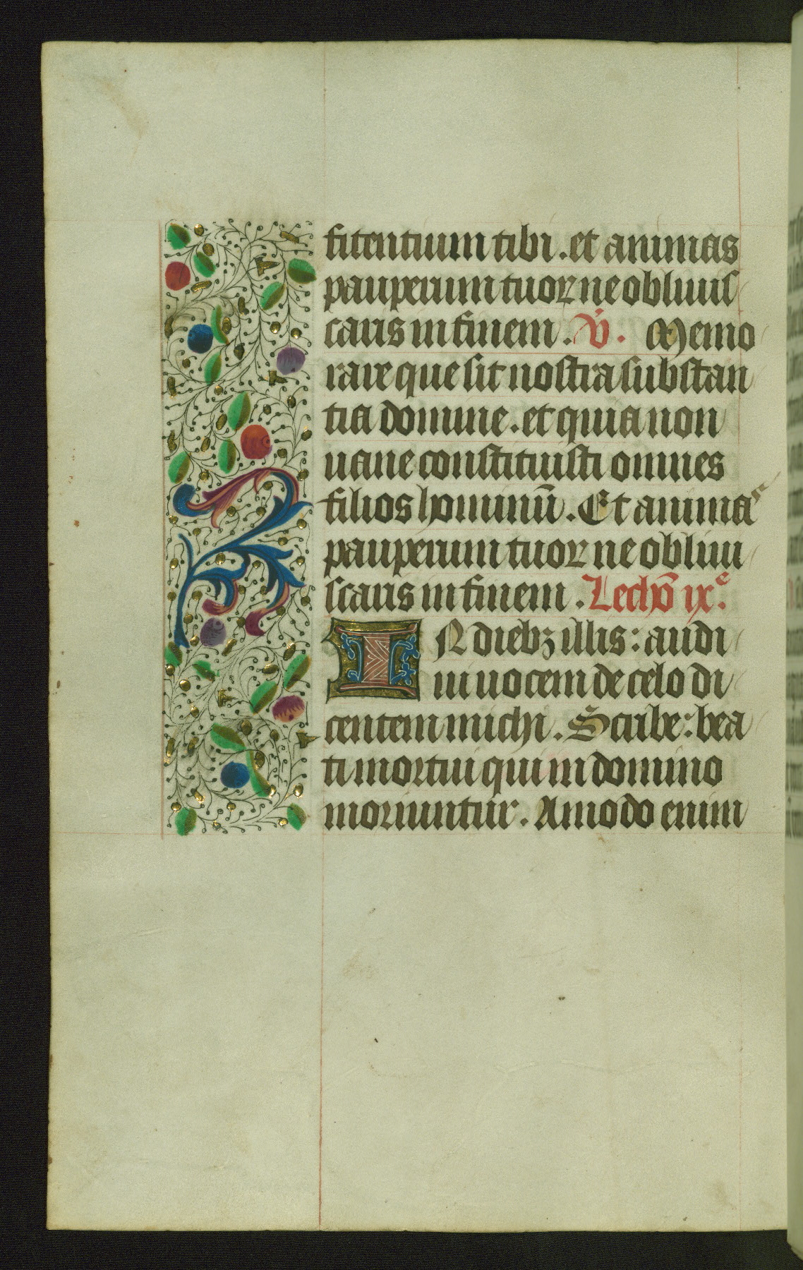 Completed for use of Cambrai, ca. 1450-60, this sizable Book of Hours is comprised of 265 folios, with two full-page miniatures (inserted) and thirteen historiated initials. Perhaps the focus on prayer rather than decoration was due to the presumed first owner, who was established in Mons and was associated with a Benedictine nunnery (dedicated to Sainte Waudry). Some Franciscan sympathies are indicated in the litany (fol. 147v), evinced by a citation of Bernardinus of Siena, Francis, and Clara.