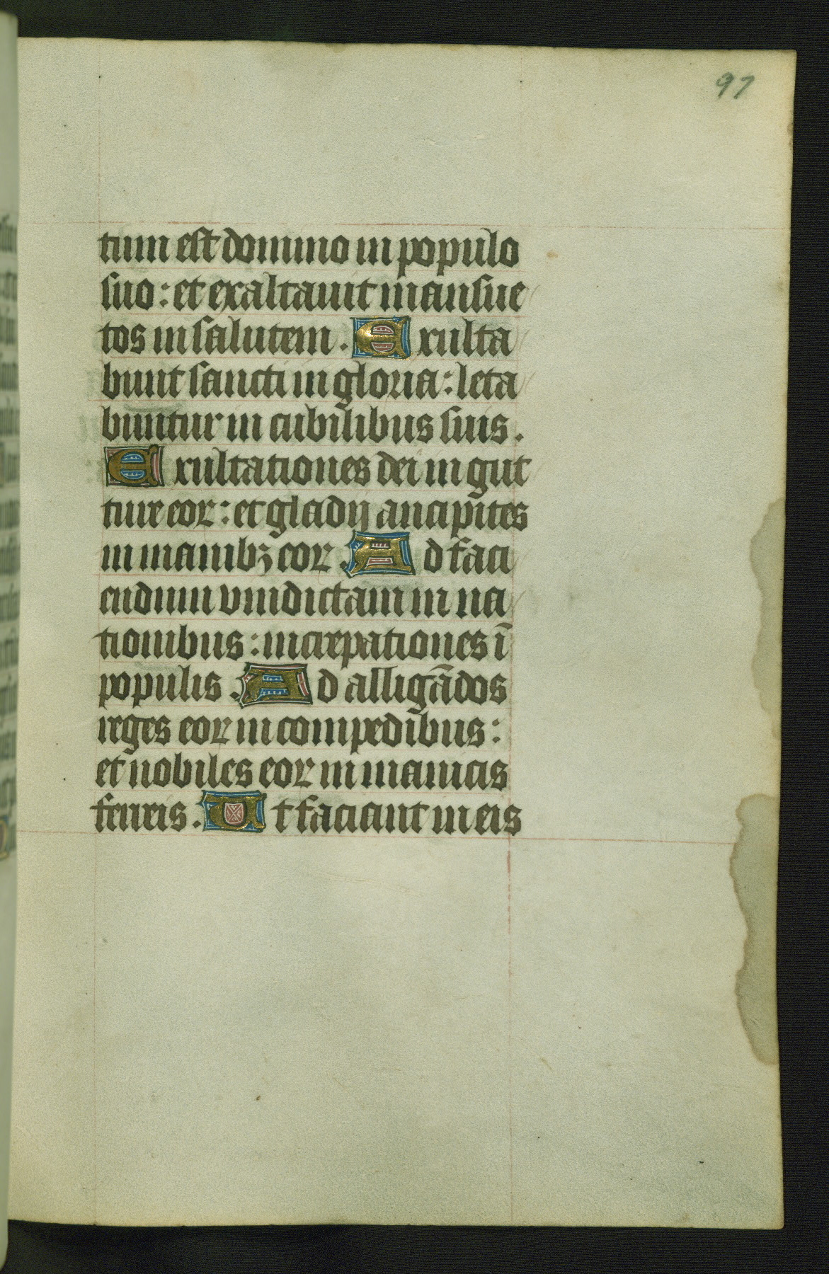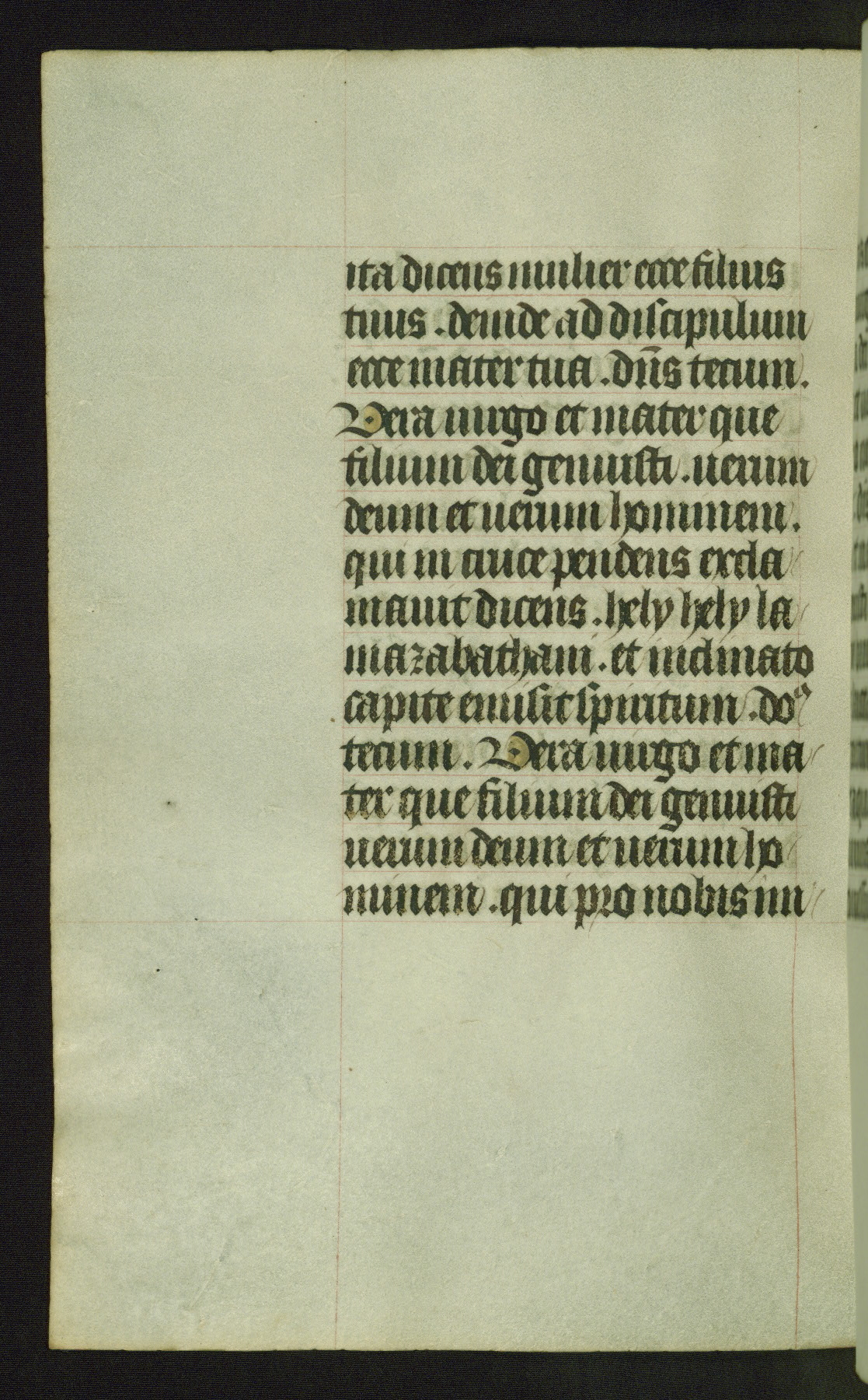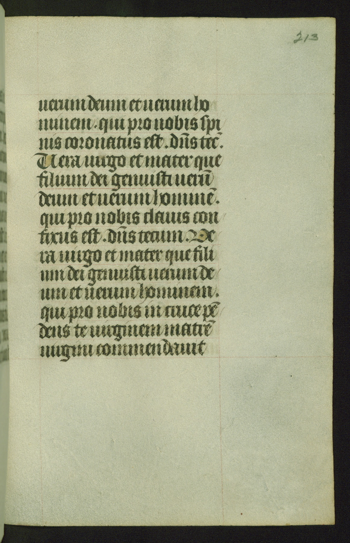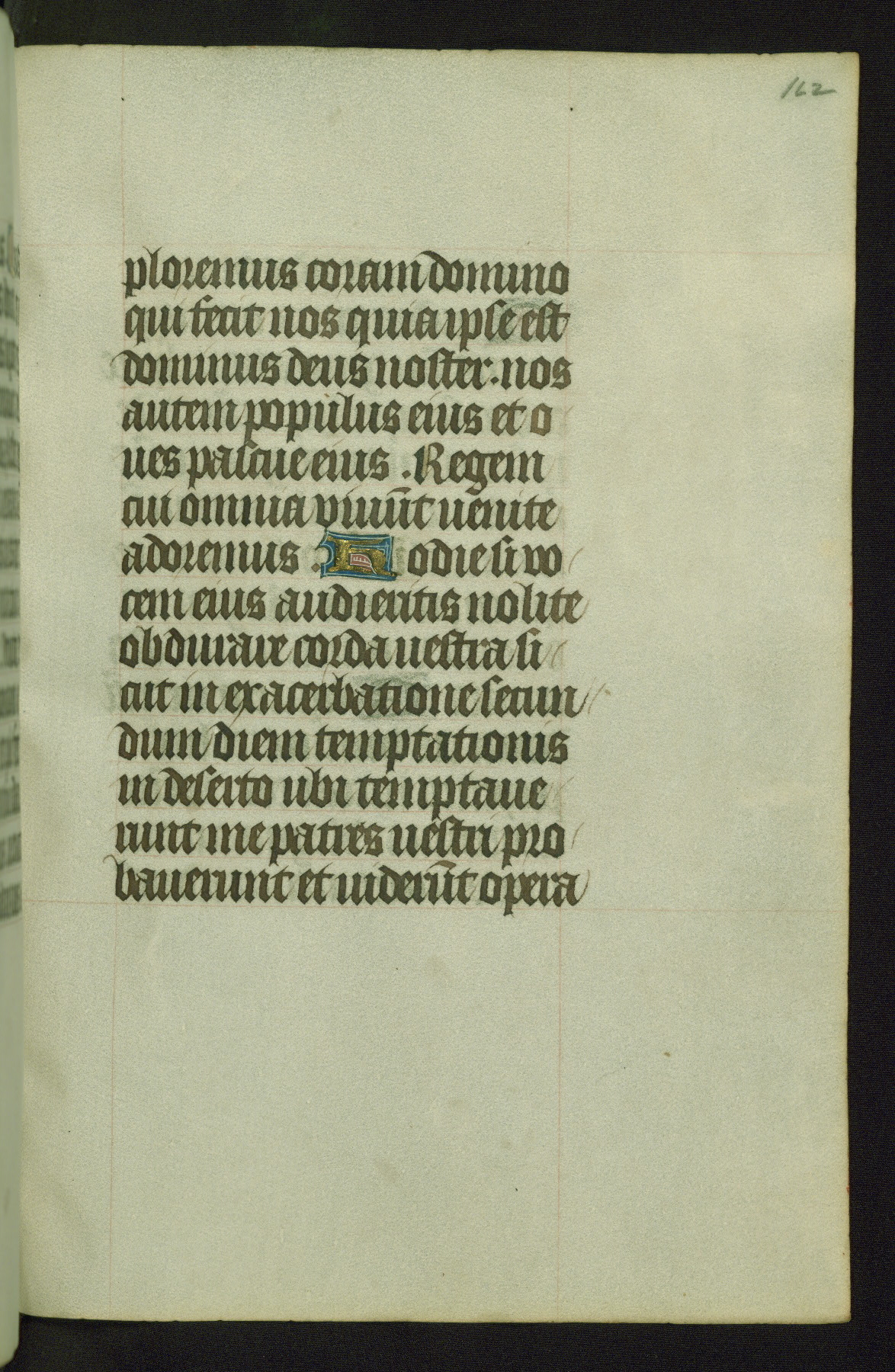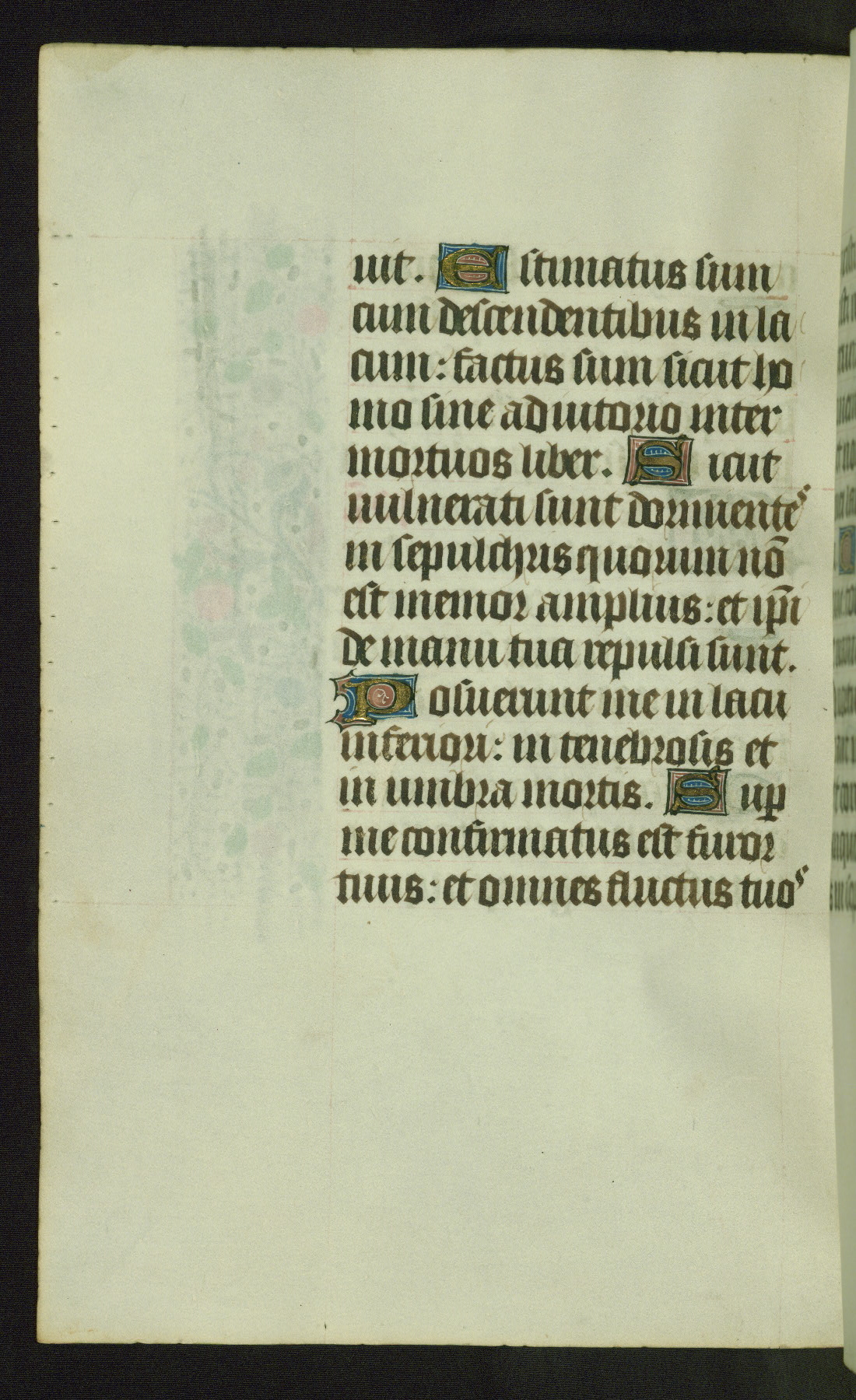 Completed for use of Cambrai, ca. 1450-60, this sizable Book of Hours is comprised of 265 folios, with two full-page miniatures (inserted) and thirteen historiated initials. Perhaps the focus on prayer rather than decoration was due to the presumed first owner, who was established in Mons and was associated with a Benedictine nunnery (dedicated to Sainte Waudry). Some Franciscan sympathies are indicated in the litany (fol. 147v), evinced by a citation of Bernardinus of Siena, Francis, and Clara.
