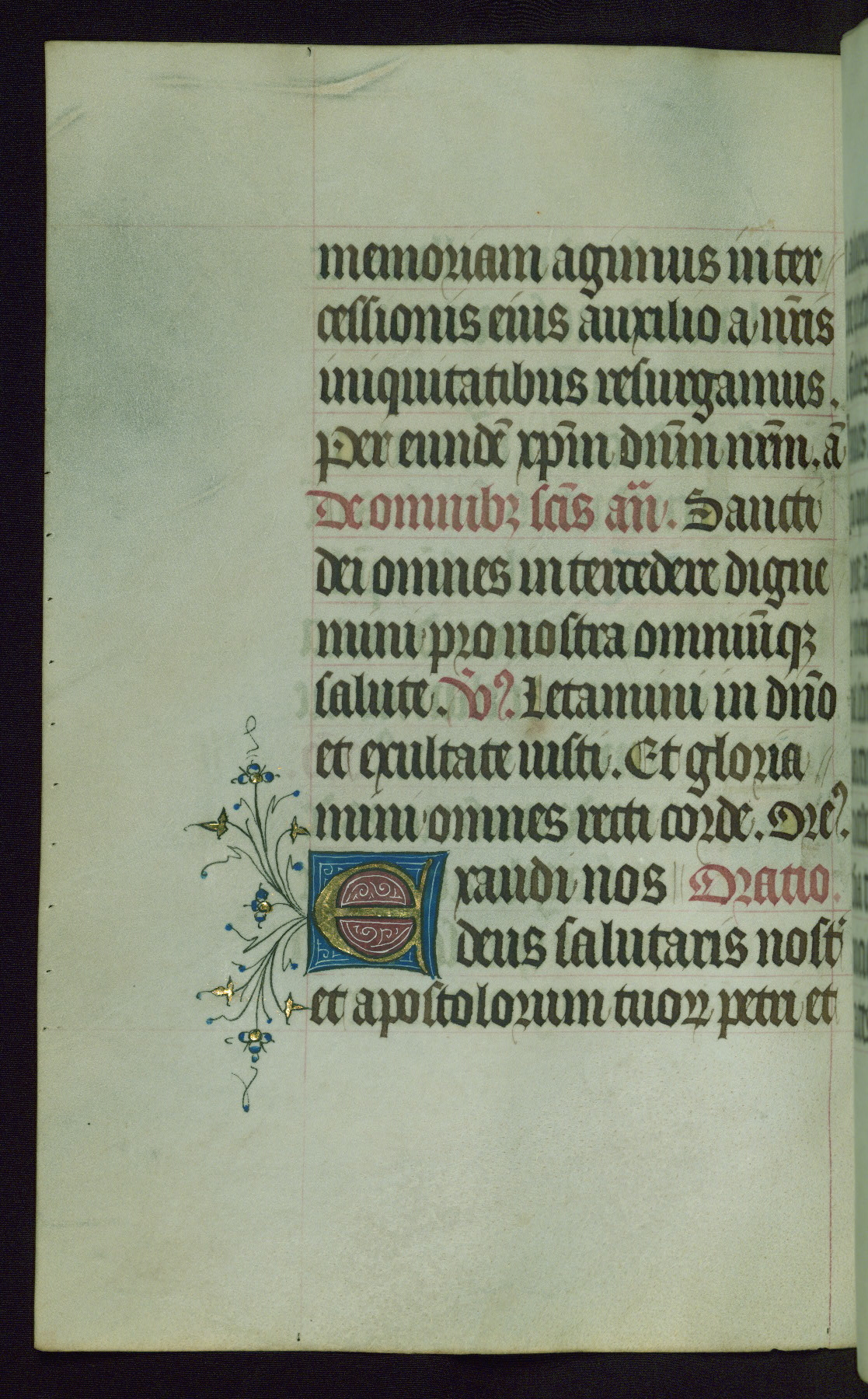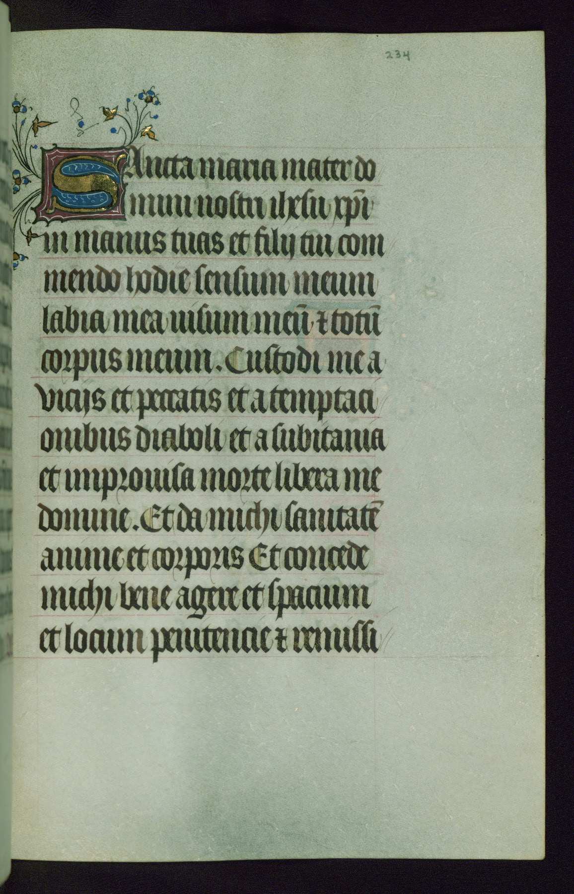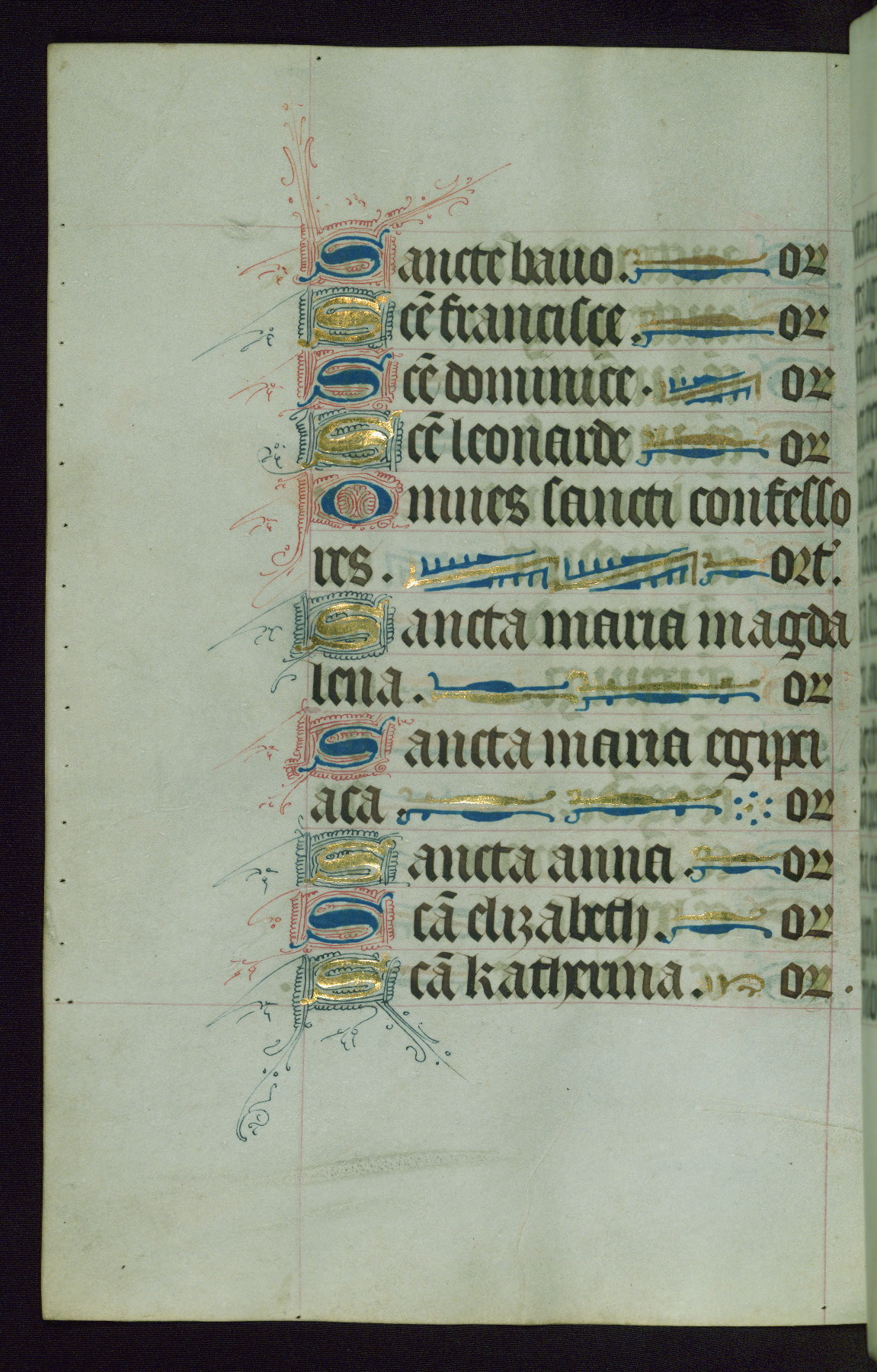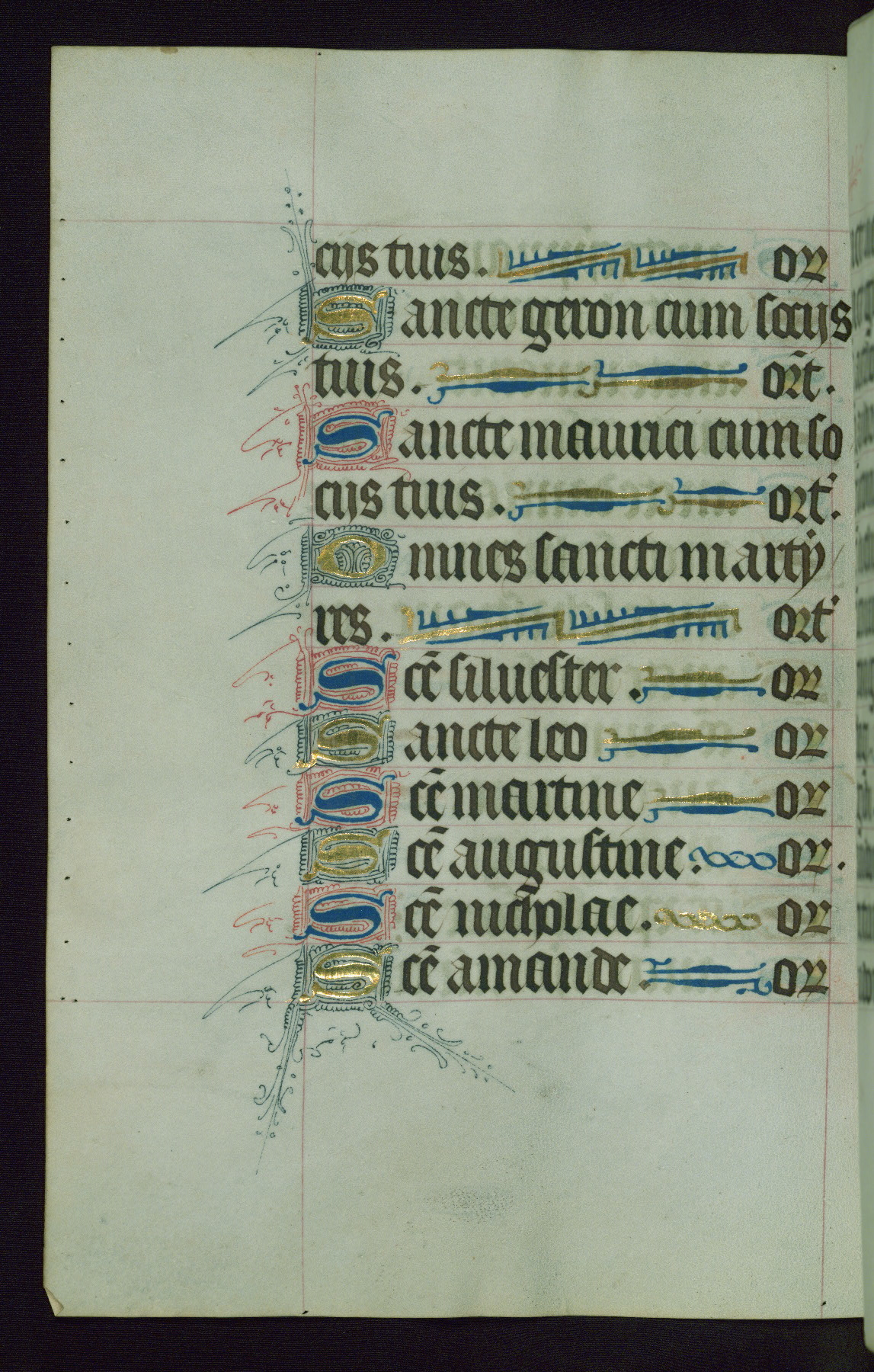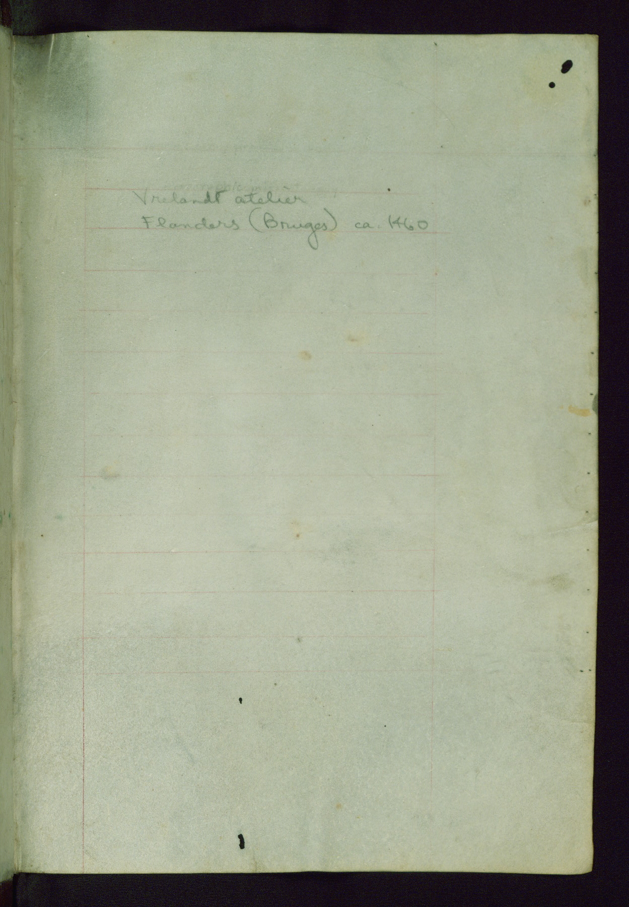 This Book of Hours, ca. 1460, was completed for use of Rome and illuminated under the influence, if not the direct participation, of Willem Vrelant. There remain twenty-two extant marginal calendar illustrations, thirteen extant full-page miniatures (many of which are paired with opening suffrages, perhaps suggesting a certain amount of significance to the owner), and one historiated initial. The contemporary binding, signed Livinus Stuaert, is dated 1477 and is most likely of Bruges or Ghent origin. It is thought that the first owner was French due to the French headings throughout and prominent fleur-de-lis figurations decorating the binding. Further, the first owner was likely female, suggested by the ways in which the book was structured to facilitate legibility. This is evinced by the large size of the script and the lack of abbreviations. While much of the text is standard, there remains evidence of personal significance and preference. This is seen in the chosen illuminations for those sections that are most significant to the owner. Most illuminations are paired with the opening page of staple Hours; however, many are accompanied by individual suffrages, constituting a large portion of the beginning of the manuscript. Personal preference is also shown in those sections of text that stray from the standard. The devotional sequence of this manuscript is notable for its sheer length and diversity of prayers as well as its inclusion of a French prayer not of official liturgy (fols. 215r-219v). The first collection of three prayers is headed and written in French. The prayer is attributed to St. Augustine and is described to guarantee a transformation of tribulation into joy through Christ's mercy, but only if the suppliant recites the prayer for thirty consecutive days. While it is not uncommon for evidence of an owner's predilections to surface in a Book of Hours, the particularly divergent features of this book allow readers to glean an intimate view of the patron.
