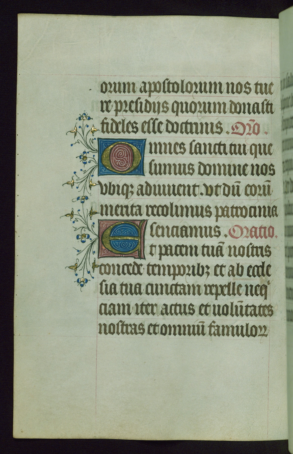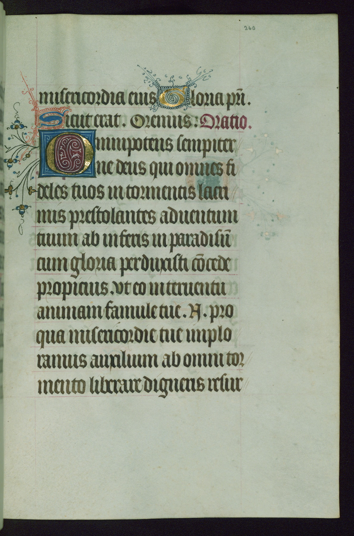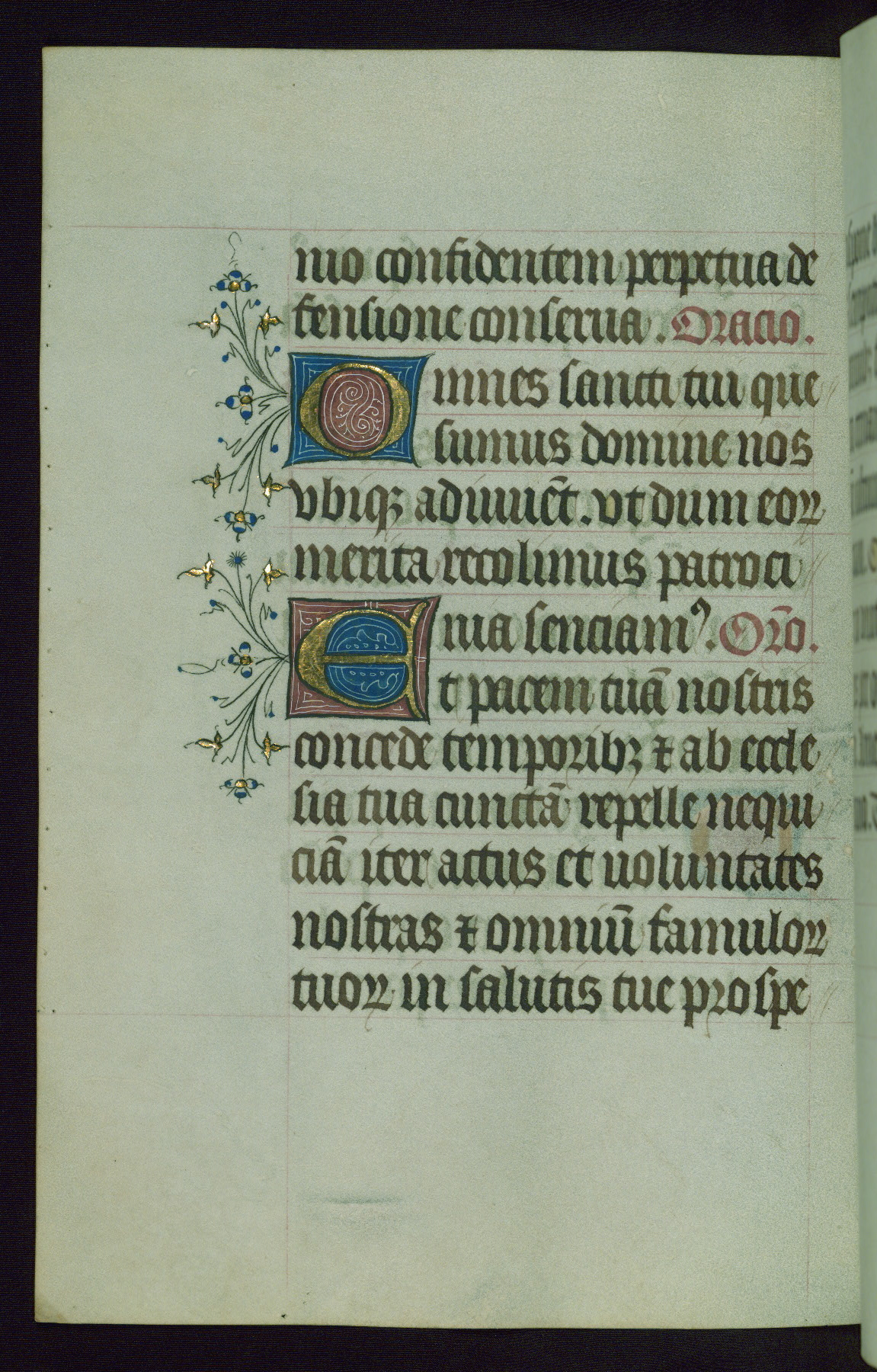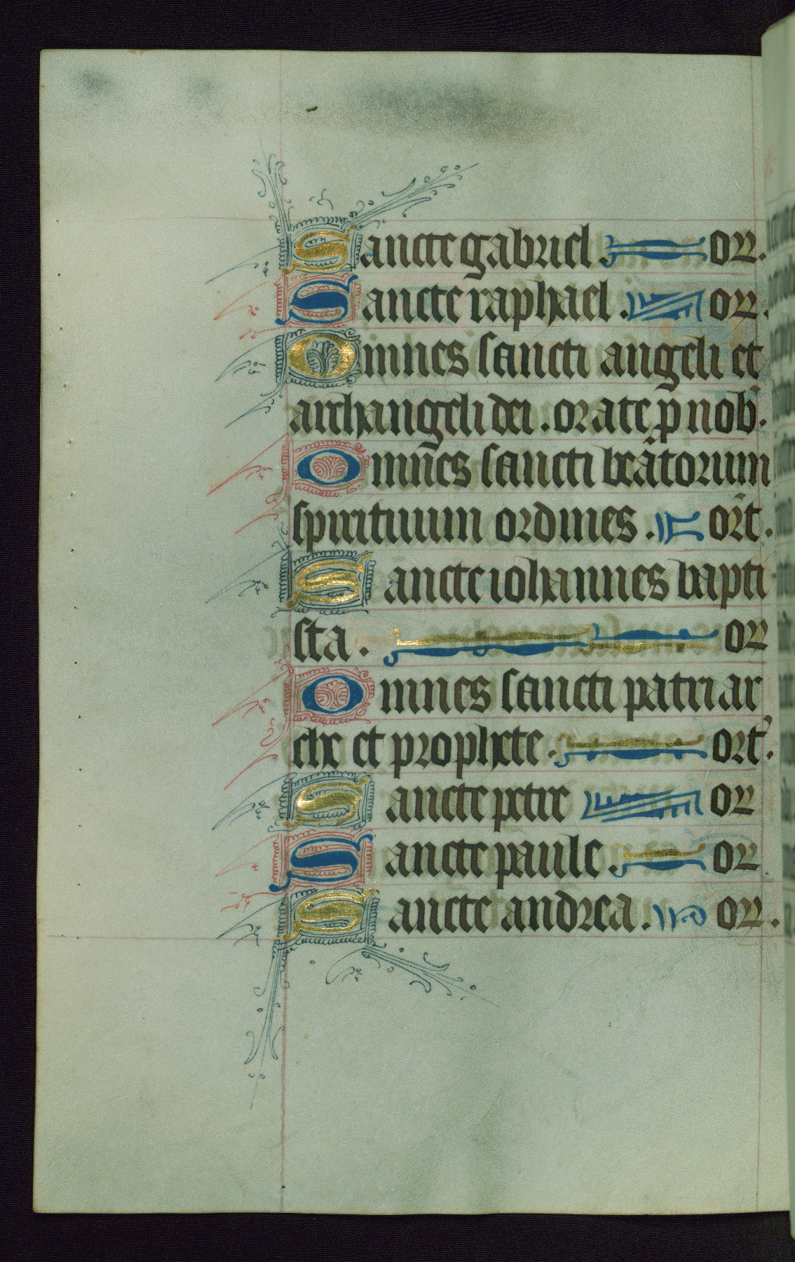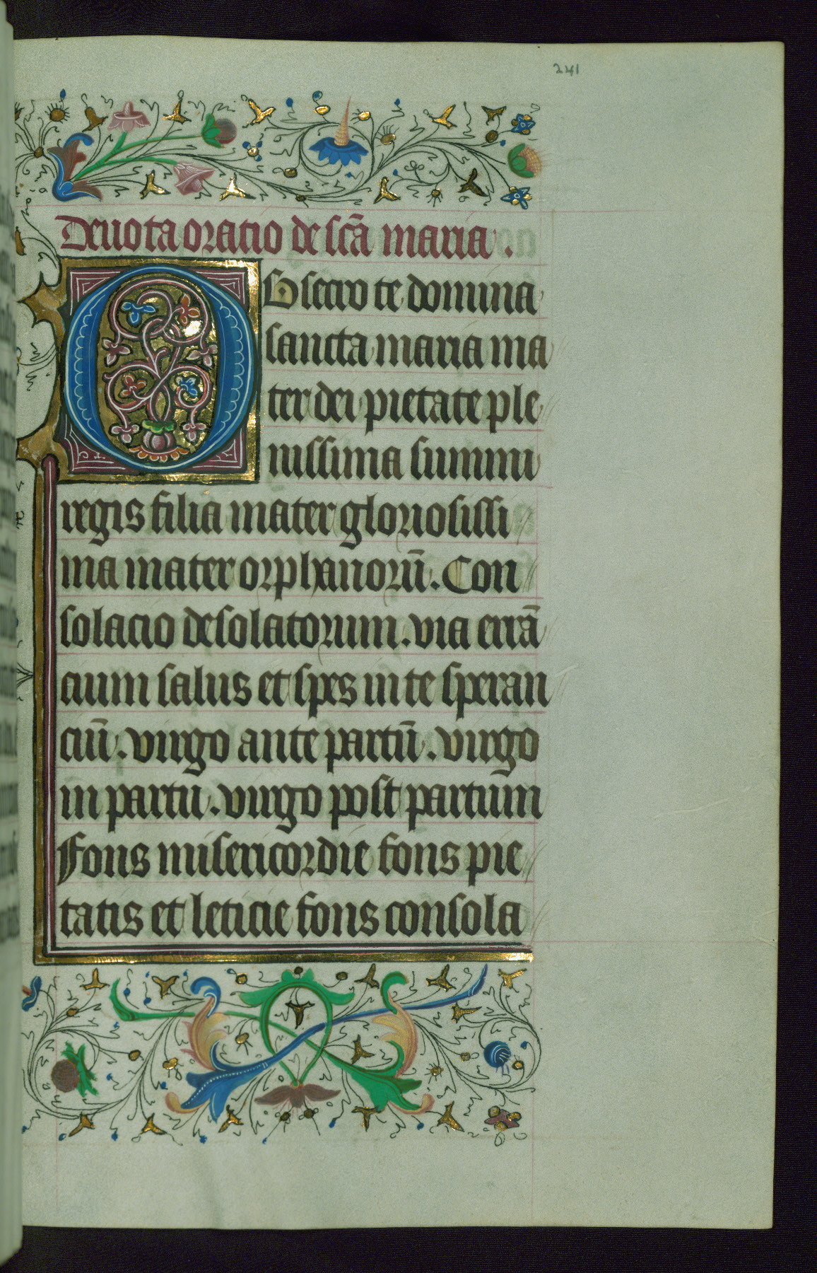 This Book of Hours, ca. 1460, was completed for use of Rome and illuminated under the influence, if not the direct participation, of Willem Vrelant. There remain twenty-two extant marginal calendar illustrations, thirteen extant full-page miniatures (many of which are paired with opening suffrages, perhaps suggesting a certain amount of significance to the owner), and one historiated initial. The contemporary binding, signed Livinus Stuaert, is dated 1477 and is most likely of Bruges or Ghent origin. It is thought that the first owner was French due to the French headings throughout and prominent fleur-de-lis figurations decorating the binding. Further, the first owner was likely female, suggested by the ways in which the book was structured to facilitate legibility. This is evinced by the large size of the script and the lack of abbreviations. While much of the text is standard, there remains evidence of personal significance and preference. This is seen in the chosen illuminations for those sections that are most significant to the owner. Most illuminations are paired with the opening page of staple Hours; however, many are accompanied by individual suffrages, constituting a large portion of the beginning of the manuscript. Personal preference is also shown in those sections of text that stray from the standard. The devotional sequence of this manuscript is notable for its sheer length and diversity of prayers as well as its inclusion of a French prayer not of official liturgy (fols. 215r-219v). The first collection of three prayers is headed and written in French. The prayer is attributed to St. Augustine and is described to guarantee a transformation of tribulation into joy through Christ's mercy, but only if the suppliant recites the prayer for thirty consecutive days. While it is not uncommon for evidence of an owner's predilections to surface in a Book of Hours, the particularly divergent features of this book allow readers to glean an intimate view of the patron.