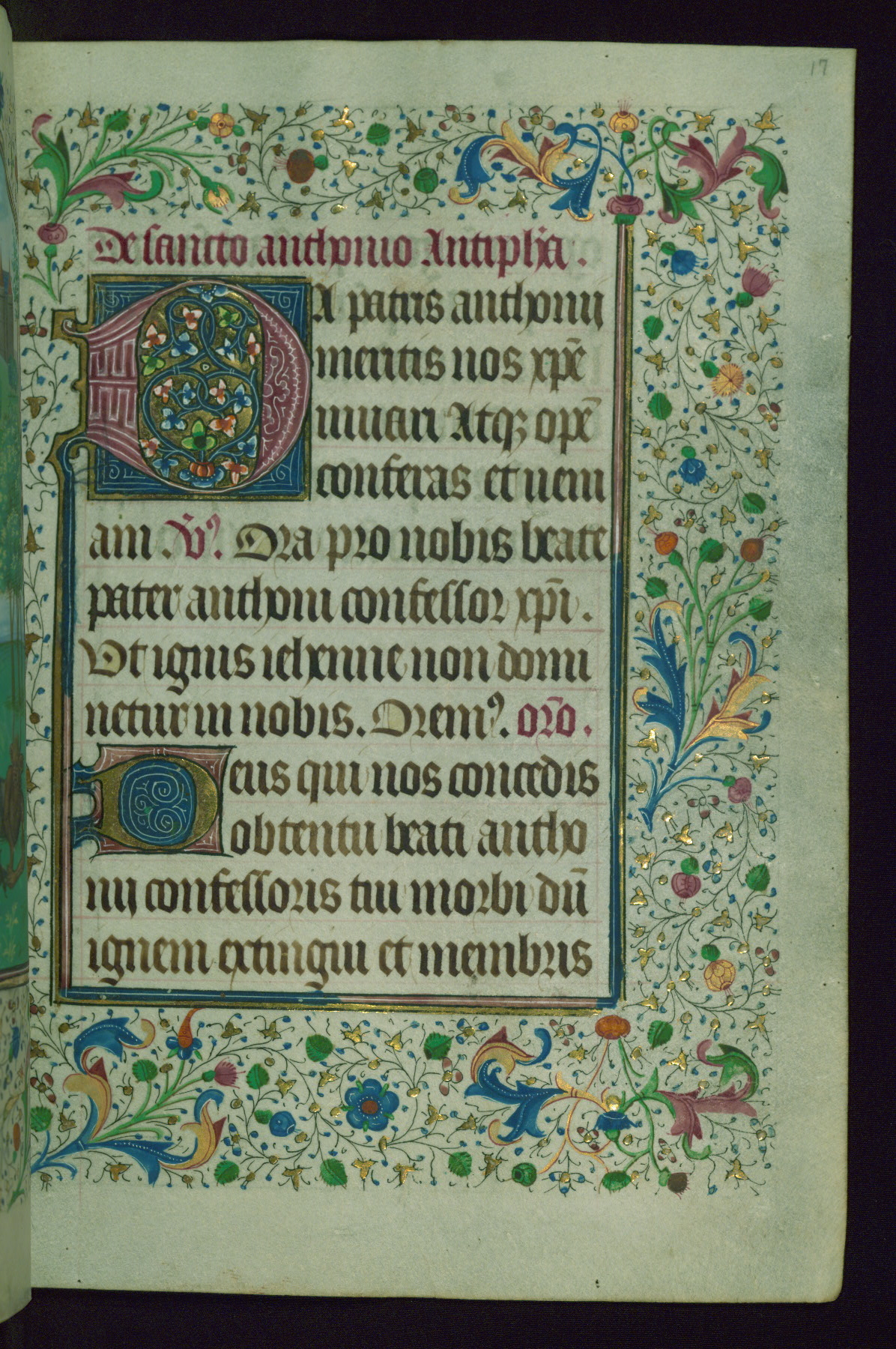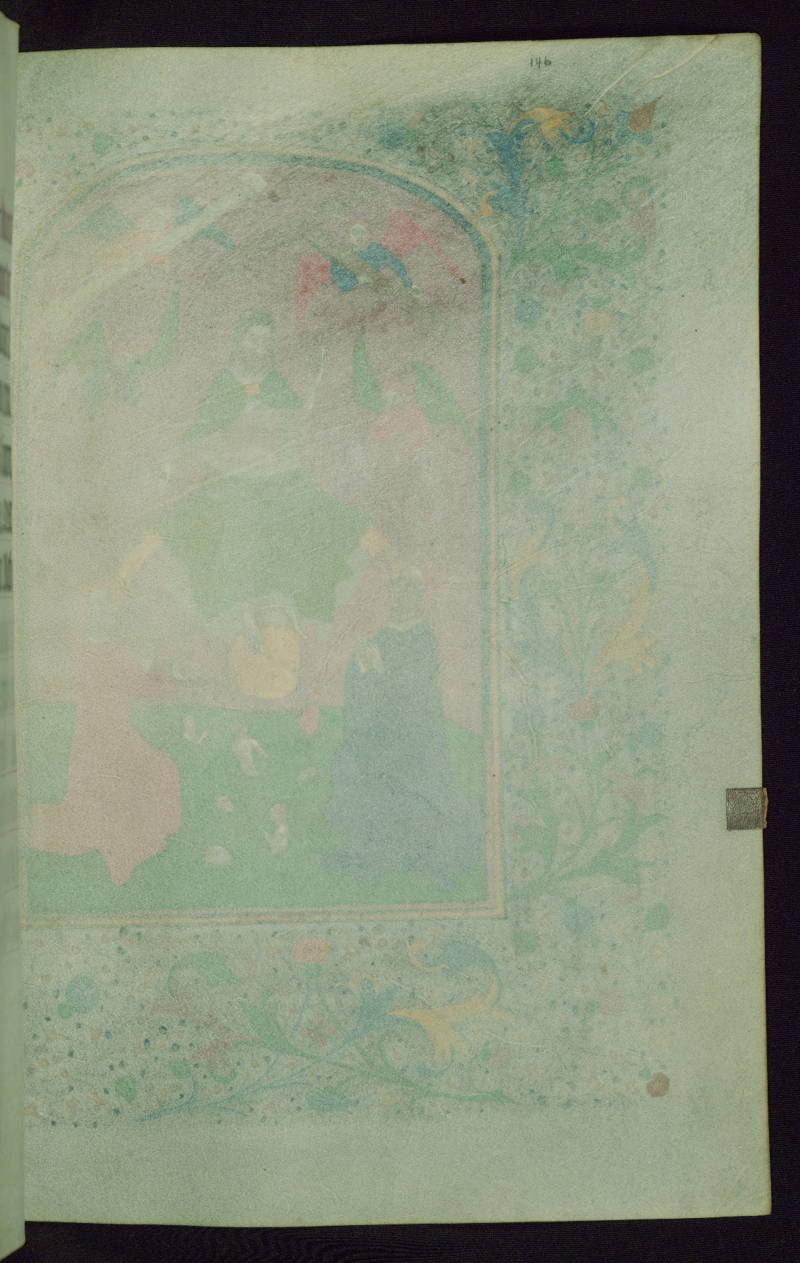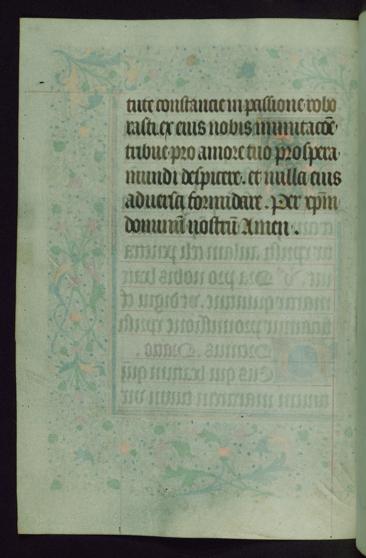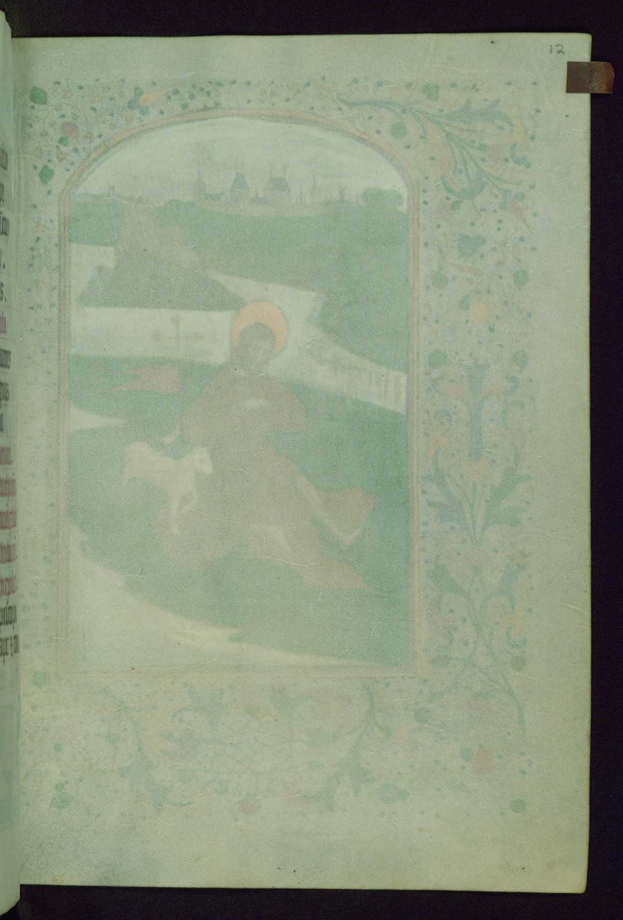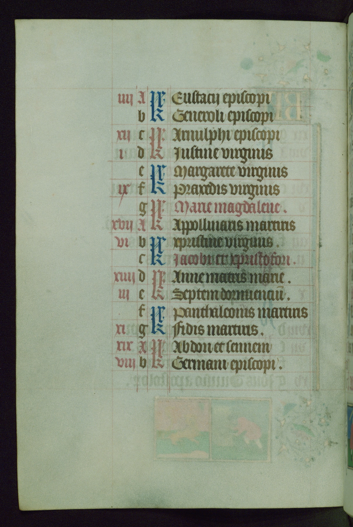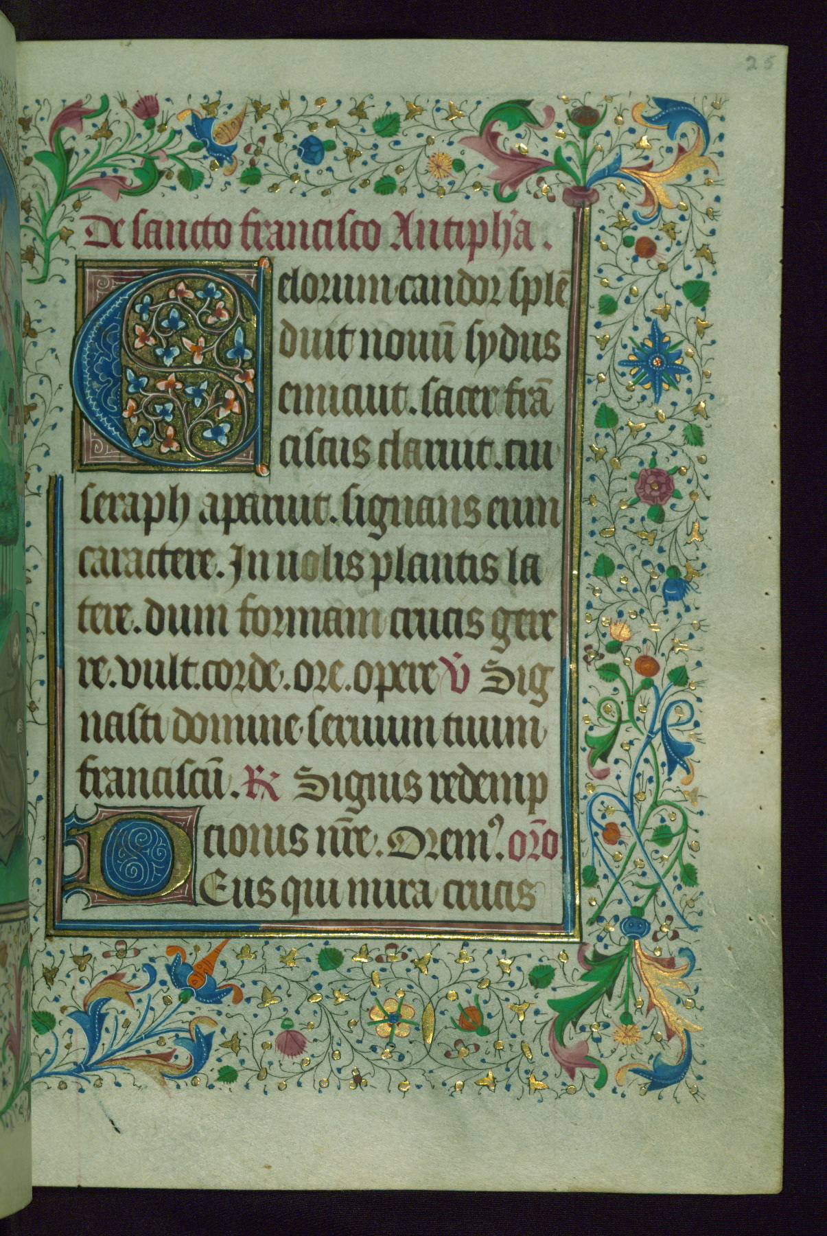 This Book of Hours, ca. 1460, was completed for use of Rome and illuminated under the influence, if not the direct participation, of Willem Vrelant. There remain twenty-two extant marginal calendar illustrations, thirteen extant full-page miniatures (many of which are paired with opening suffrages, perhaps suggesting a certain amount of significance to the owner), and one historiated initial. The contemporary binding, signed Livinus Stuaert, is dated 1477 and is most likely of Bruges or Ghent origin. It is thought that the first owner was French due to the French headings throughout and prominent fleur-de-lis figurations decorating the binding. Further, the first owner was likely female, suggested by the ways in which the book was structured to facilitate legibility. This is evinced by the large size of the script and the lack of abbreviations. While much of the text is standard, there remains evidence of personal significance and preference. This is seen in the chosen illuminations for those sections that are most significant to the owner. Most illuminations are paired with the opening page of staple Hours; however, many are accompanied by individual suffrages, constituting a large portion of the beginning of the manuscript. Personal preference is also shown in those sections of text that stray from the standard. The devotional sequence of this manuscript is notable for its sheer length and diversity of prayers as well as its inclusion of a French prayer not of official liturgy (fols. 215r-219v). The first collection of three prayers is headed and written in French. The prayer is attributed to St. Augustine and is described to guarantee a transformation of tribulation into joy through Christ's mercy, but only if the suppliant recites the prayer for thirty consecutive days. While it is not uncommon for evidence of an owner's predilections to surface in a Book of Hours, the particularly divergent features of this book allow readers to glean an intimate view of the patron.