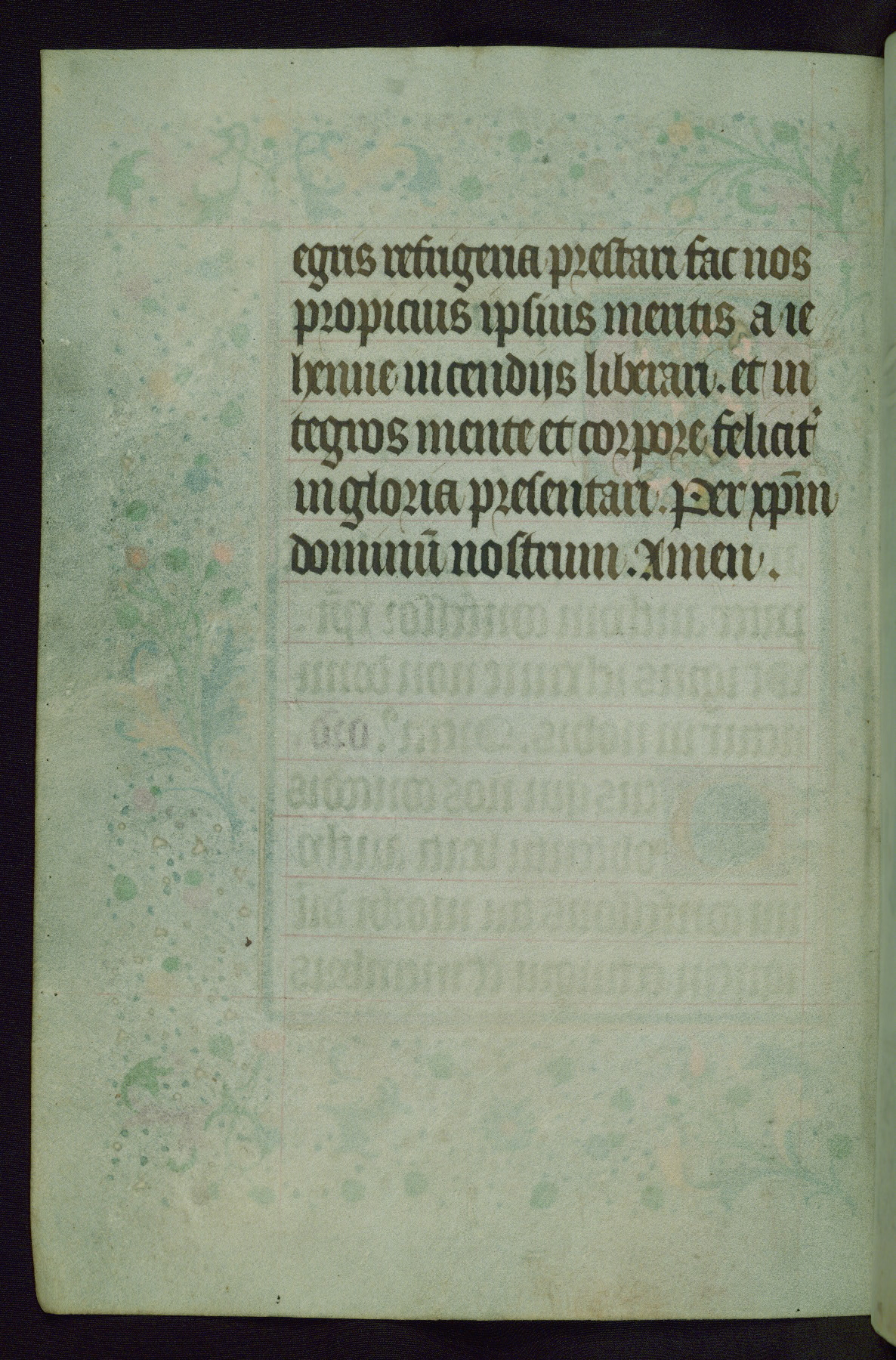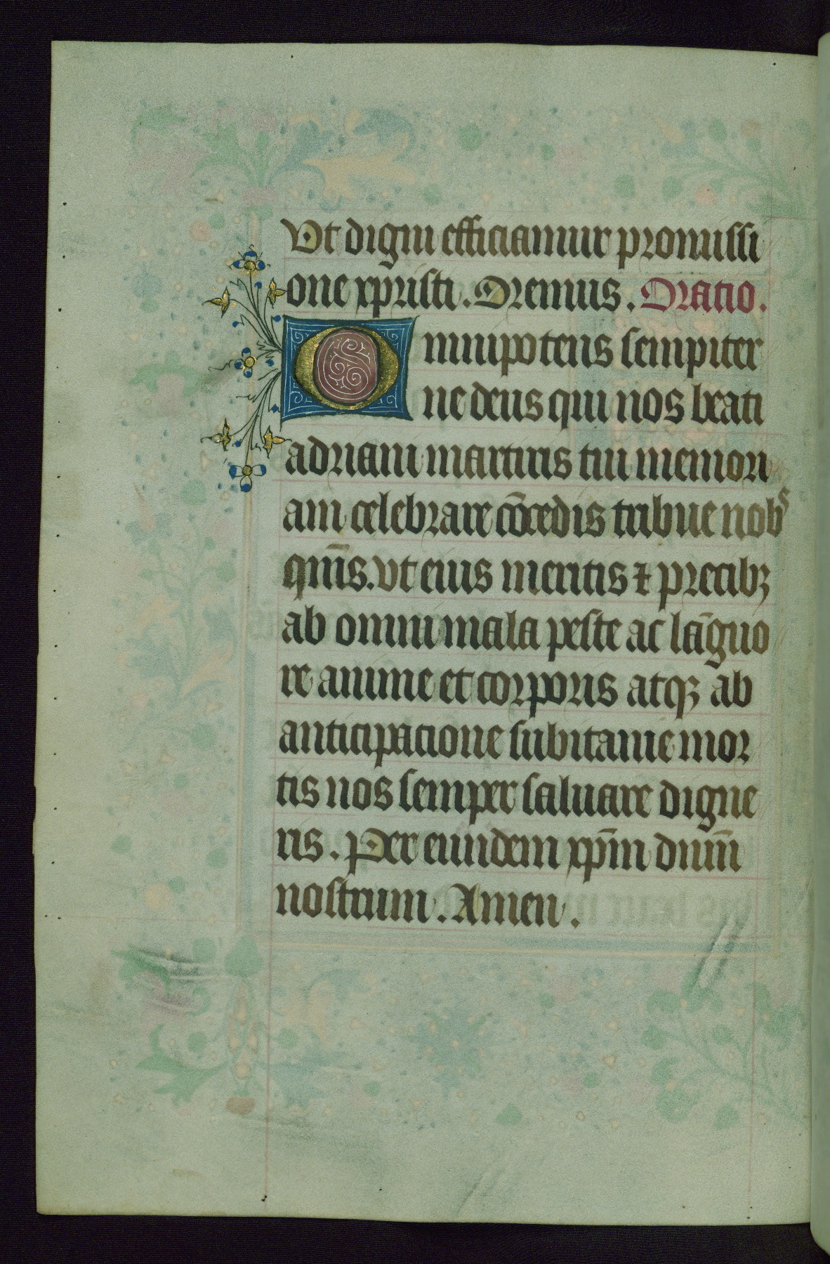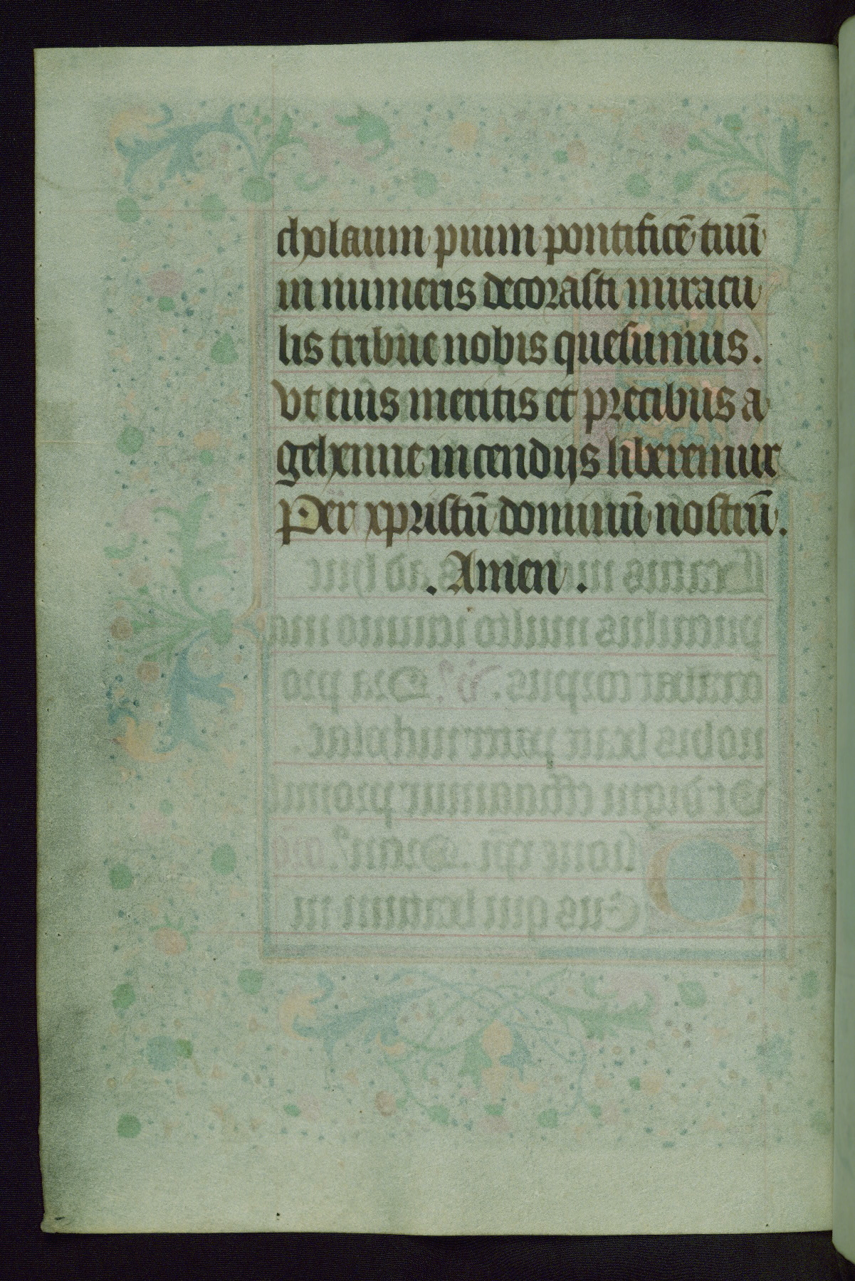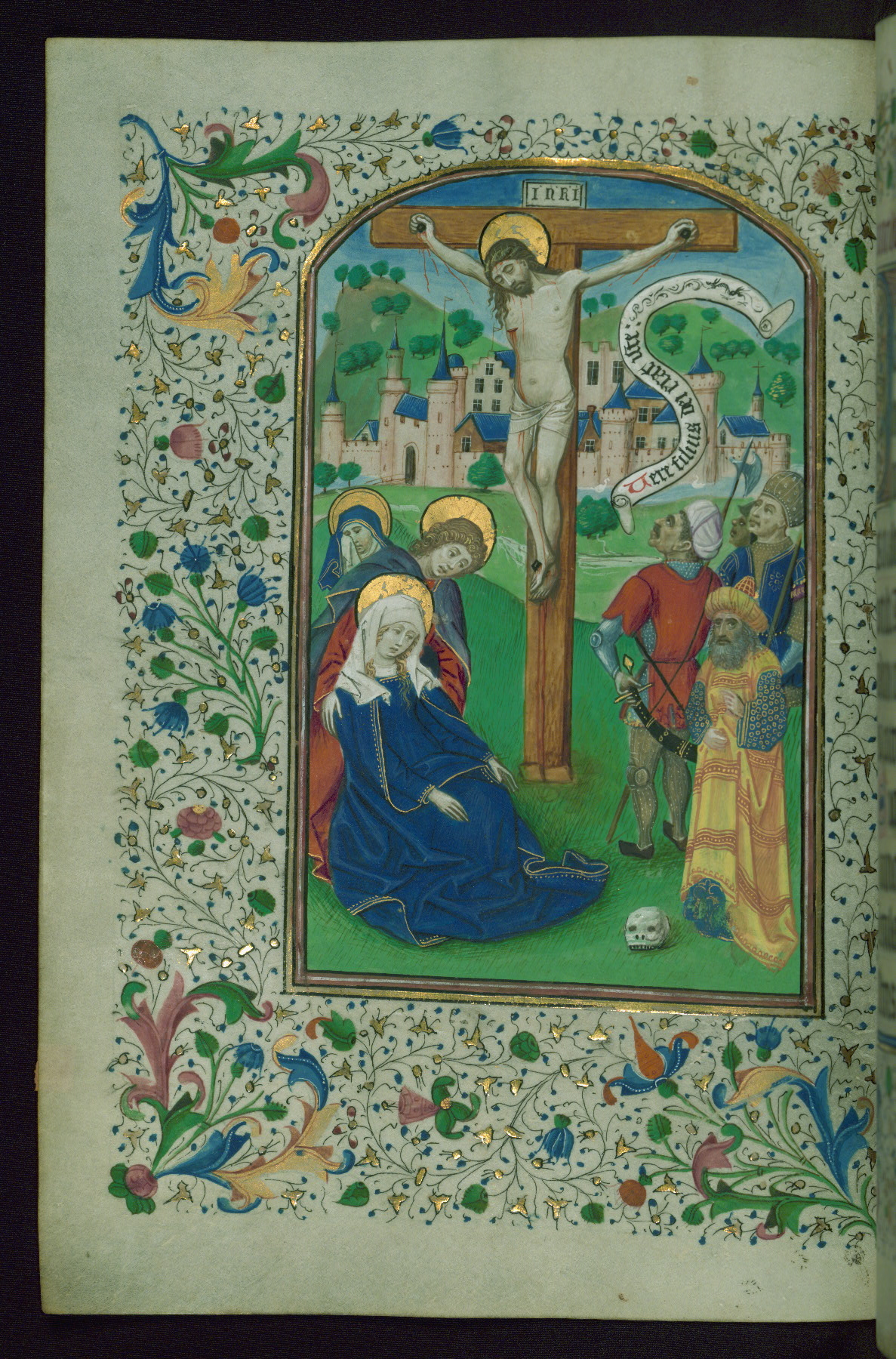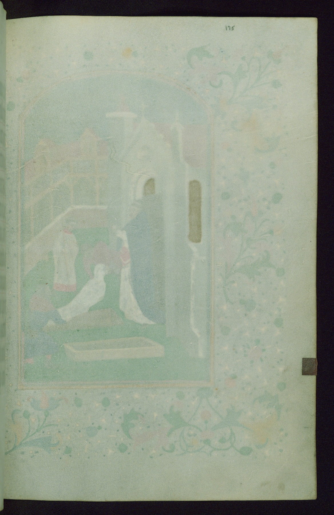 This Book of Hours, ca. 1460, was completed for use of Rome and illuminated under the influence, if not the direct participation, of Willem Vrelant. There remain twenty-two extant marginal calendar illustrations, thirteen extant full-page miniatures (many of which are paired with opening suffrages, perhaps suggesting a certain amount of significance to the owner), and one historiated initial. The contemporary binding, signed Livinus Stuaert, is dated 1477 and is most likely of Bruges or Ghent origin. It is thought that the first owner was French due to the French headings throughout and prominent fleur-de-lis figurations decorating the binding. Further, the first owner was likely female, suggested by the ways in which the book was structured to facilitate legibility. This is evinced by the large size of the script and the lack of abbreviations. While much of the text is standard, there remains evidence of personal significance and preference. This is seen in the chosen illuminations for those sections that are most significant to the owner. Most illuminations are paired with the opening page of staple Hours; however, many are accompanied by individual suffrages, constituting a large portion of the beginning of the manuscript. Personal preference is also shown in those sections of text that stray from the standard. The devotional sequence of this manuscript is notable for its sheer length and diversity of prayers as well as its inclusion of a French prayer not of official liturgy (fols. 215r-219v). The first collection of three prayers is headed and written in French. The prayer is attributed to St. Augustine and is described to guarantee a transformation of tribulation into joy through Christ's mercy, but only if the suppliant recites the prayer for thirty consecutive days. While it is not uncommon for evidence of an owner's predilections to surface in a Book of Hours, the particularly divergent features of this book allow readers to glean an intimate view of the patron.