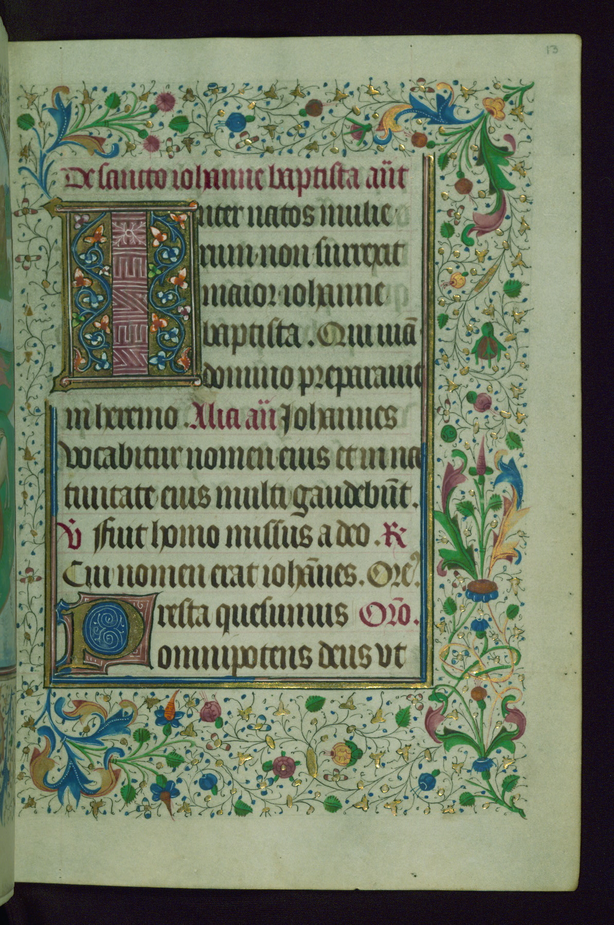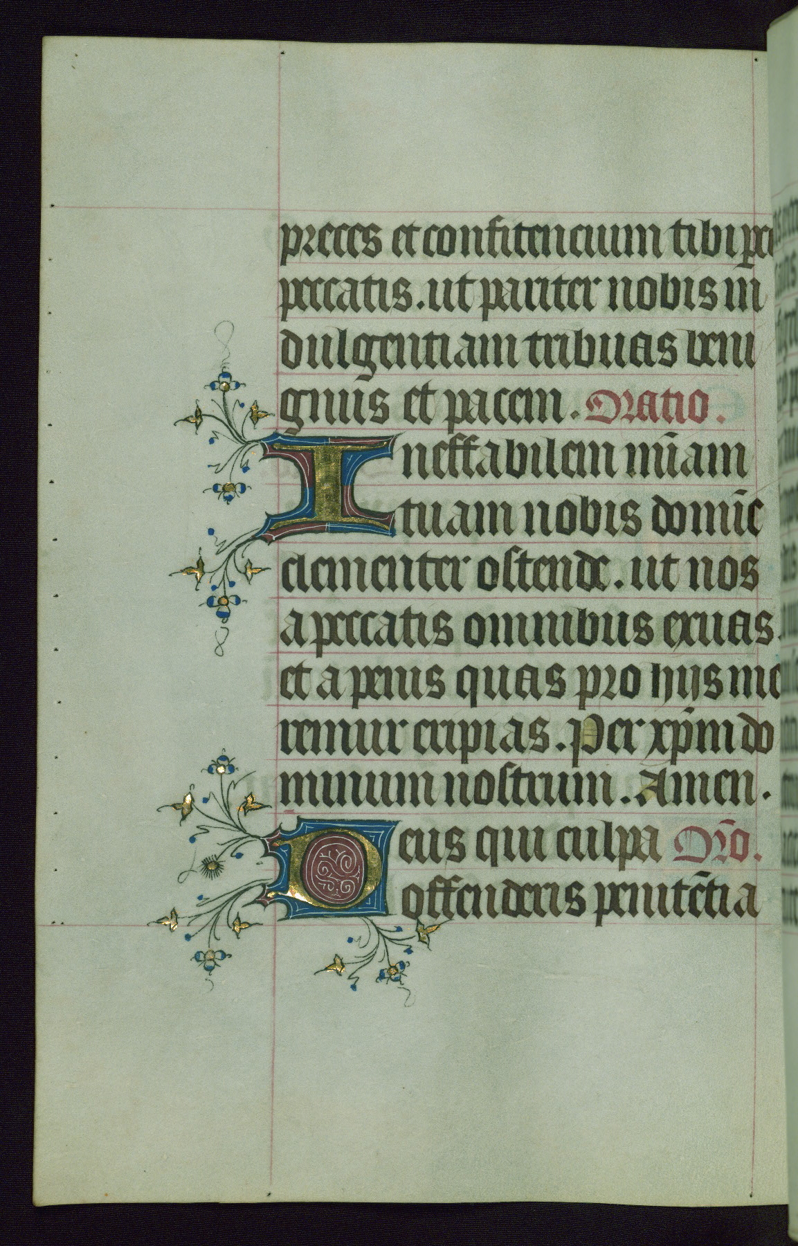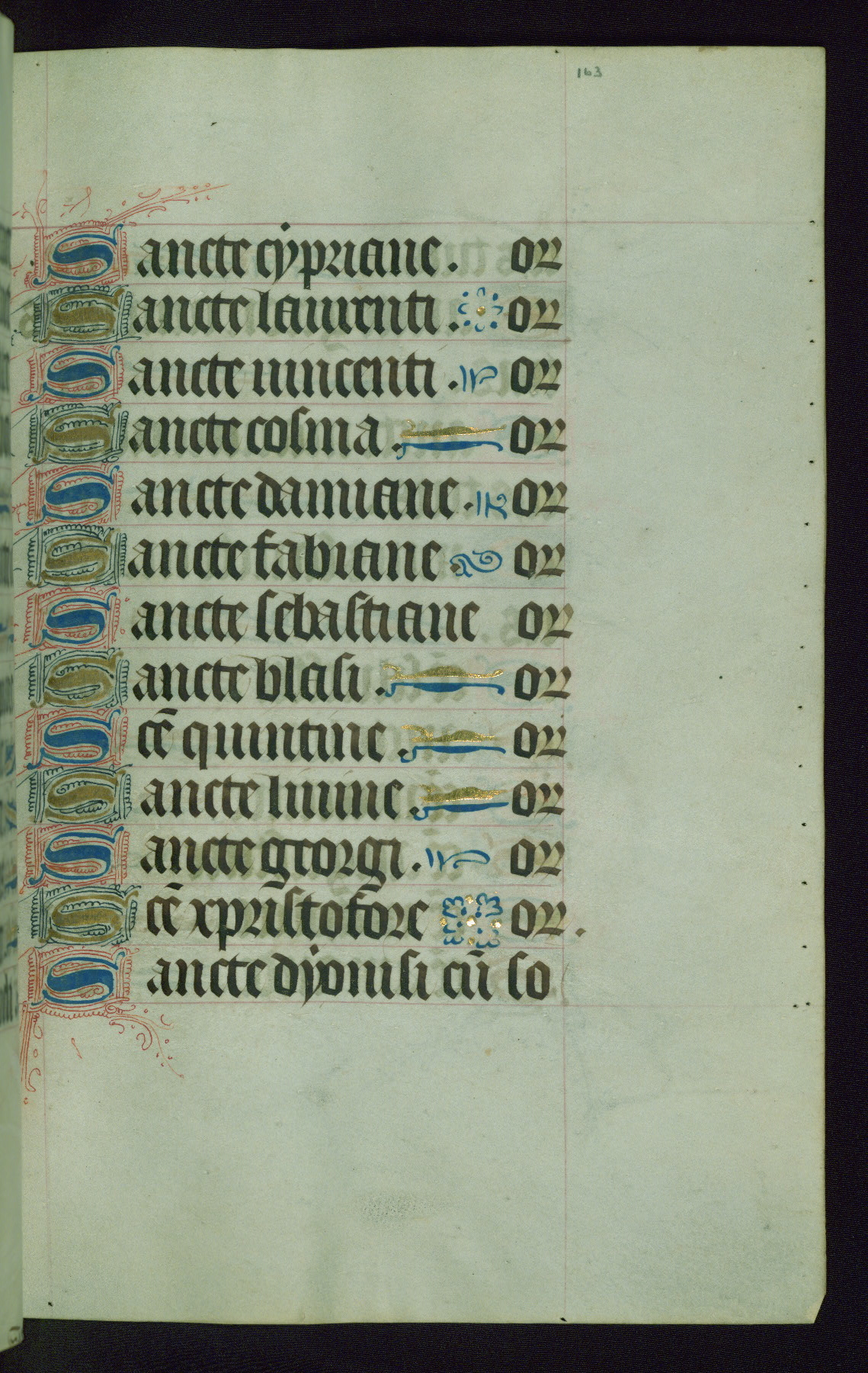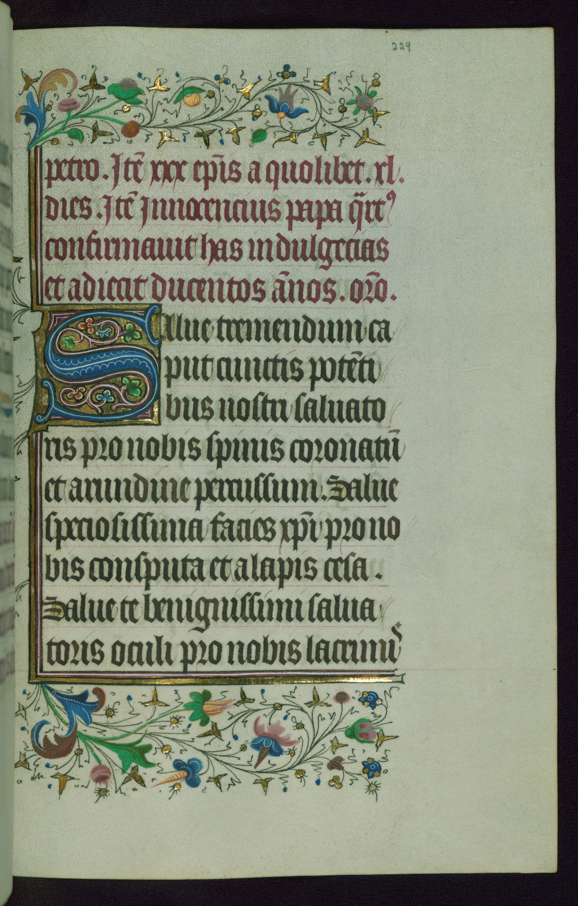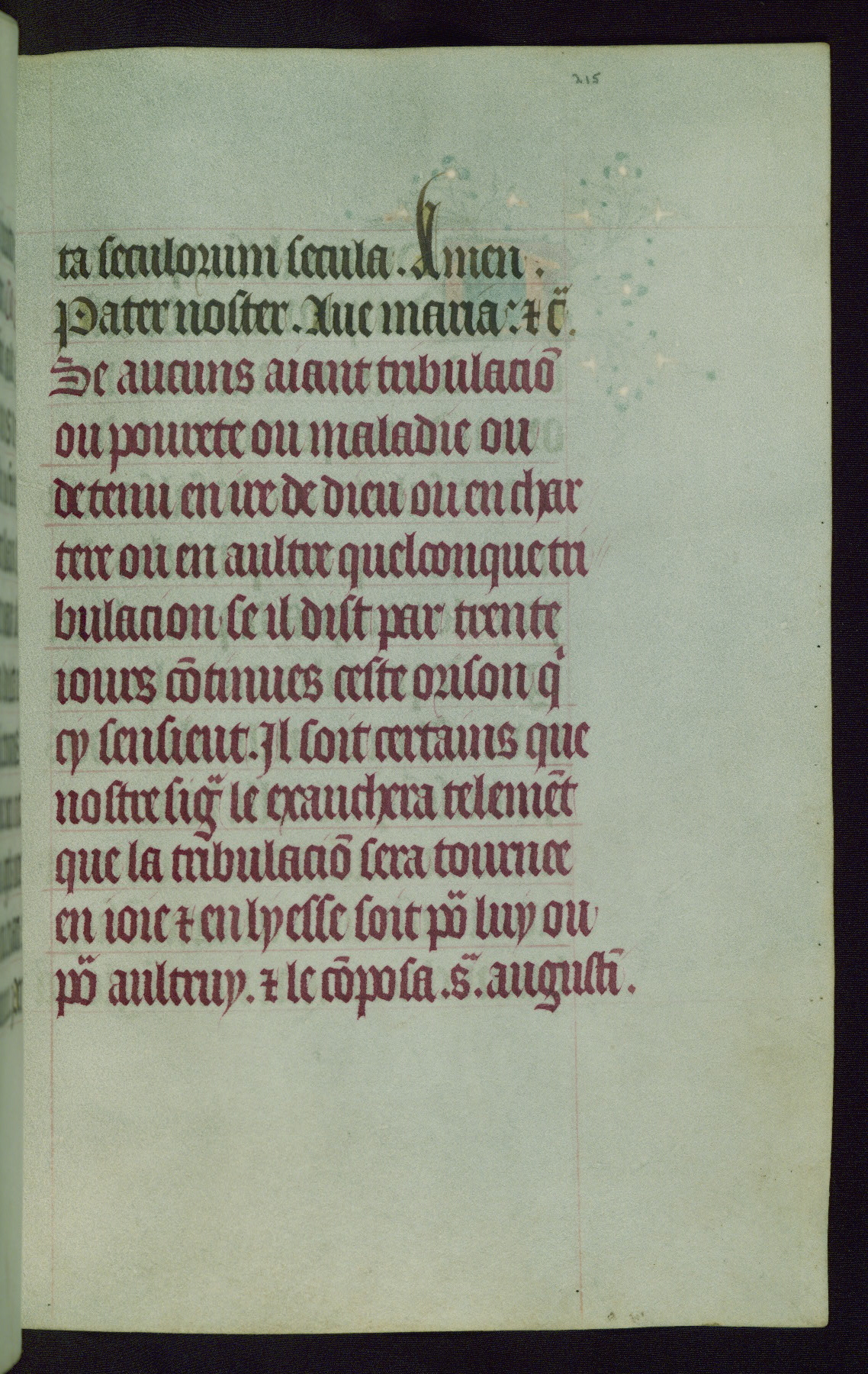 This Book of Hours, ca. 1460, was completed for use of Rome and illuminated under the influence, if not the direct participation, of Willem Vrelant. There remain twenty-two extant marginal calendar illustrations, thirteen extant full-page miniatures (many of which are paired with opening suffrages, perhaps suggesting a certain amount of significance to the owner), and one historiated initial. The contemporary binding, signed Livinus Stuaert, is dated 1477 and is most likely of Bruges or Ghent origin. It is thought that the first owner was French due to the French headings throughout and prominent fleur-de-lis figurations decorating the binding. Further, the first owner was likely female, suggested by the ways in which the book was structured to facilitate legibility. This is evinced by the large size of the script and the lack of abbreviations. While much of the text is standard, there remains evidence of personal significance and preference. This is seen in the chosen illuminations for those sections that are most significant to the owner. Most illuminations are paired with the opening page of staple Hours; however, many are accompanied by individual suffrages, constituting a large portion of the beginning of the manuscript. Personal preference is also shown in those sections of text that stray from the standard. The devotional sequence of this manuscript is notable for its sheer length and diversity of prayers as well as its inclusion of a French prayer not of official liturgy (fols. 215r-219v). The first collection of three prayers is headed and written in French. The prayer is attributed to St. Augustine and is described to guarantee a transformation of tribulation into joy through Christ's mercy, but only if the suppliant recites the prayer for thirty consecutive days. While it is not uncommon for evidence of an owner's predilections to surface in a Book of Hours, the particularly divergent features of this book allow readers to glean an intimate view of the patron.