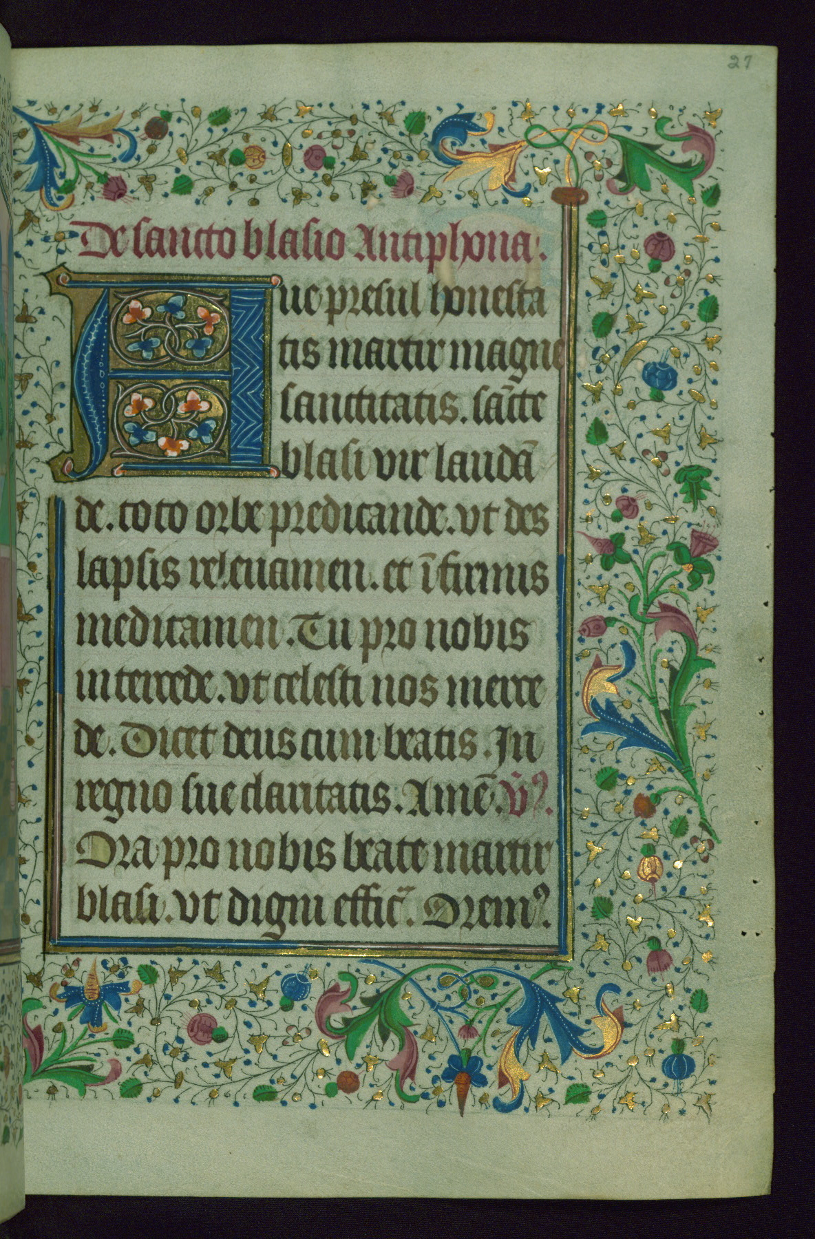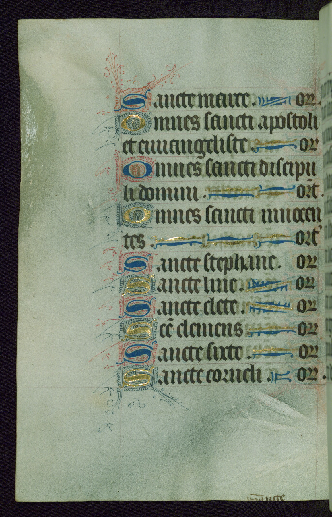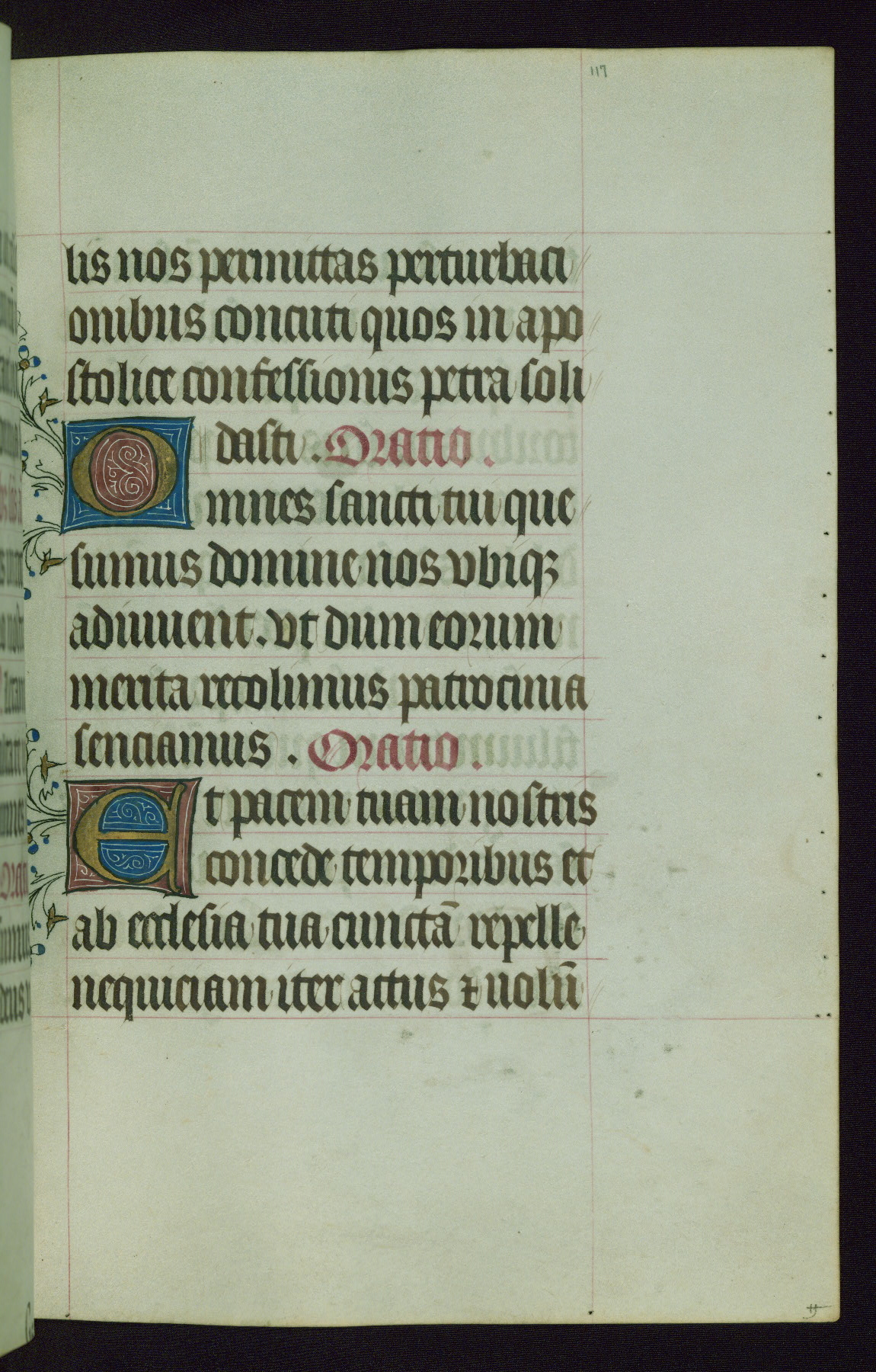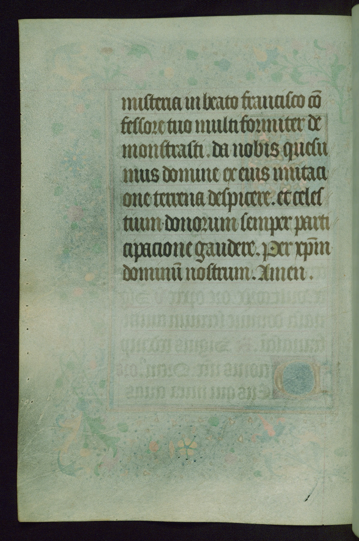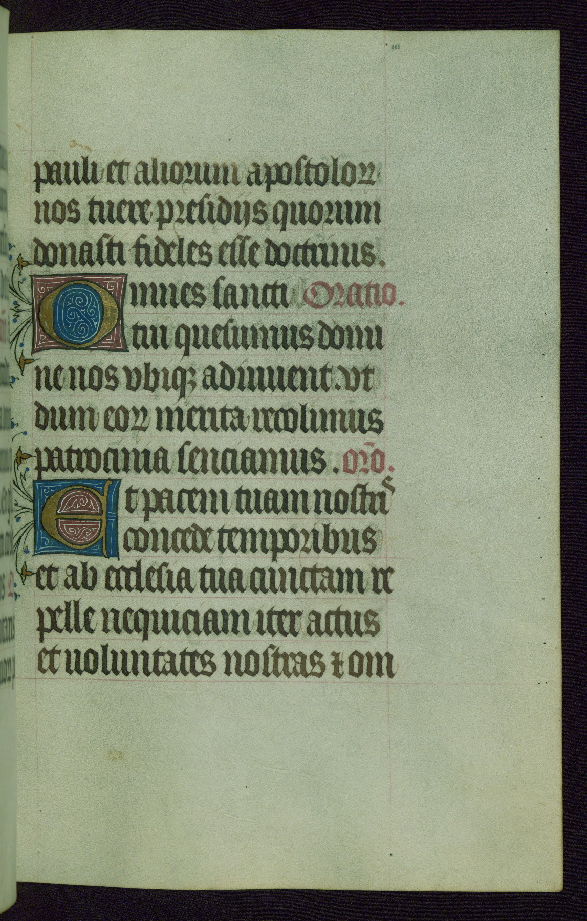 This Book of Hours, ca. 1460, was completed for use of Rome and illuminated under the influence, if not the direct participation, of Willem Vrelant. There remain twenty-two extant marginal calendar illustrations, thirteen extant full-page miniatures (many of which are paired with opening suffrages, perhaps suggesting a certain amount of significance to the owner), and one historiated initial. The contemporary binding, signed Livinus Stuaert, is dated 1477 and is most likely of Bruges or Ghent origin. It is thought that the first owner was French due to the French headings throughout and prominent fleur-de-lis figurations decorating the binding. Further, the first owner was likely female, suggested by the ways in which the book was structured to facilitate legibility. This is evinced by the large size of the script and the lack of abbreviations. While much of the text is standard, there remains evidence of personal significance and preference. This is seen in the chosen illuminations for those sections that are most significant to the owner. Most illuminations are paired with the opening page of staple Hours; however, many are accompanied by individual suffrages, constituting a large portion of the beginning of the manuscript. Personal preference is also shown in those sections of text that stray from the standard. The devotional sequence of this manuscript is notable for its sheer length and diversity of prayers as well as its inclusion of a French prayer not of official liturgy (fols. 215r-219v). The first collection of three prayers is headed and written in French. The prayer is attributed to St. Augustine and is described to guarantee a transformation of tribulation into joy through Christ's mercy, but only if the suppliant recites the prayer for thirty consecutive days. While it is not uncommon for evidence of an owner's predilections to surface in a Book of Hours, the particularly divergent features of this book allow readers to glean an intimate view of the patron.