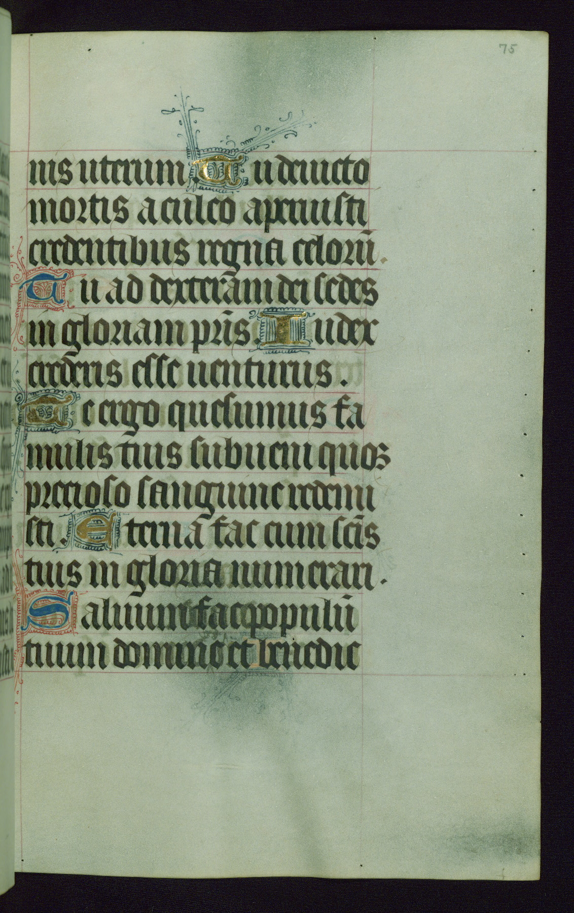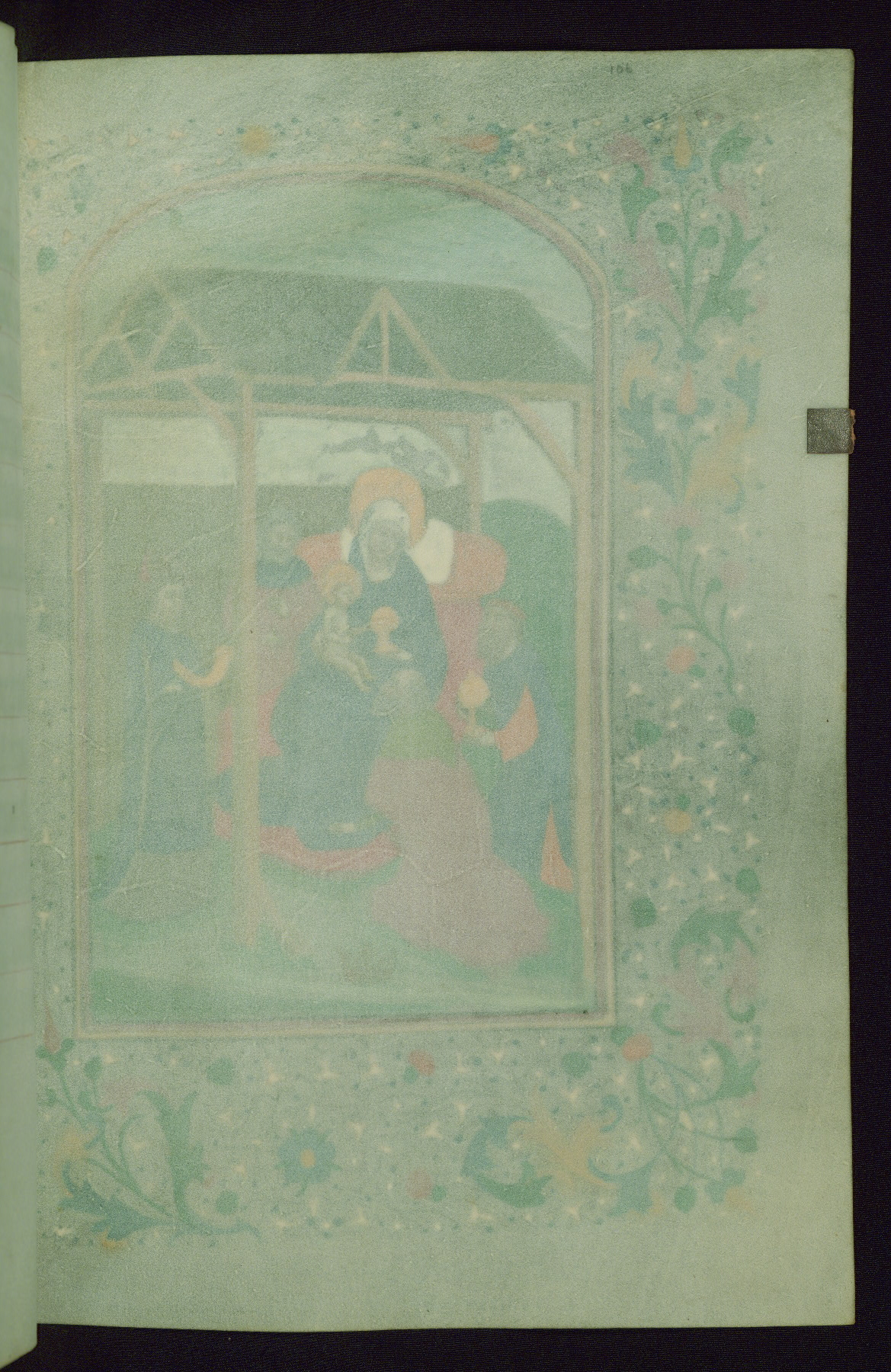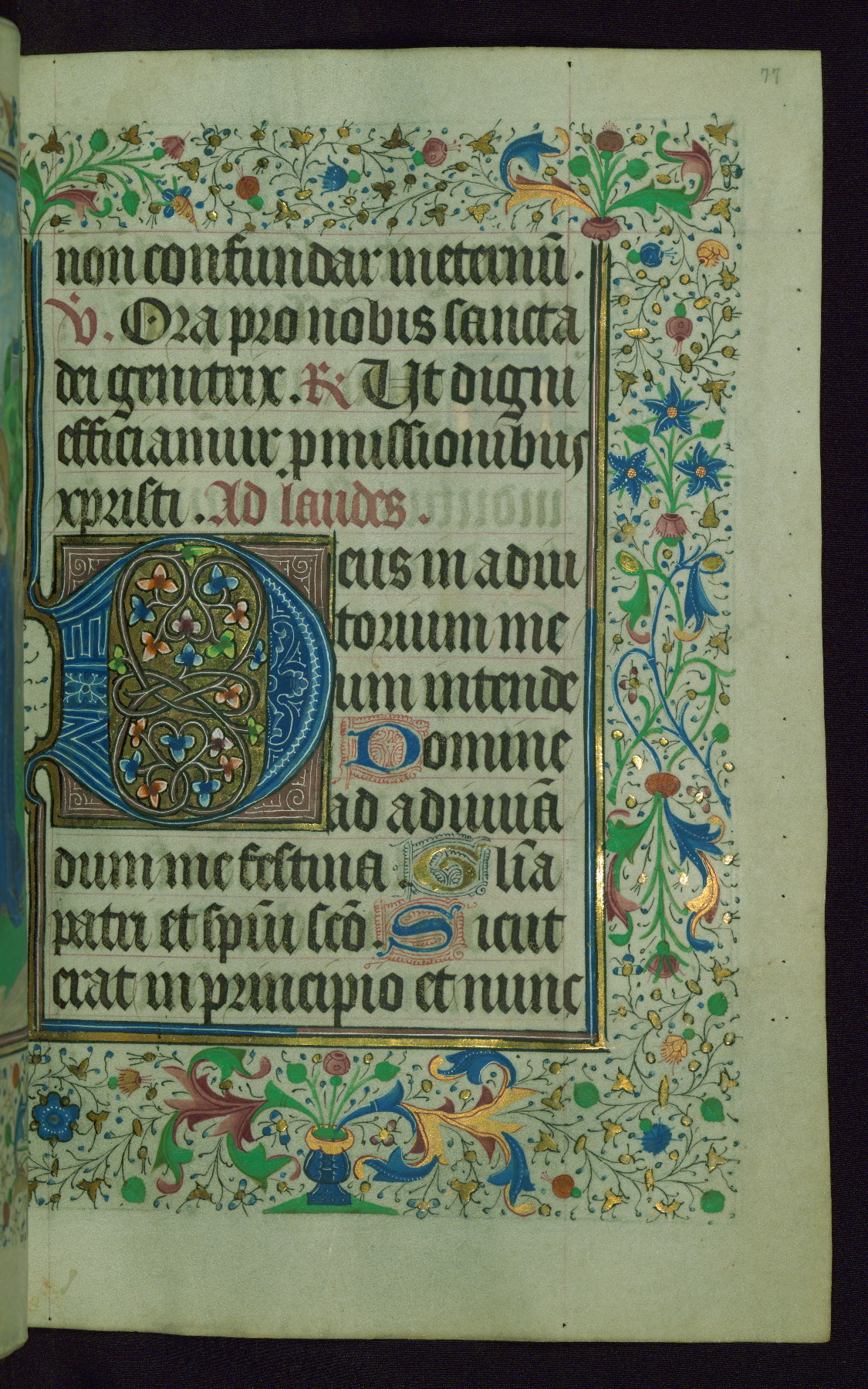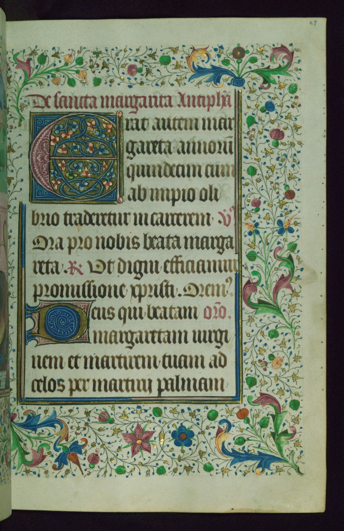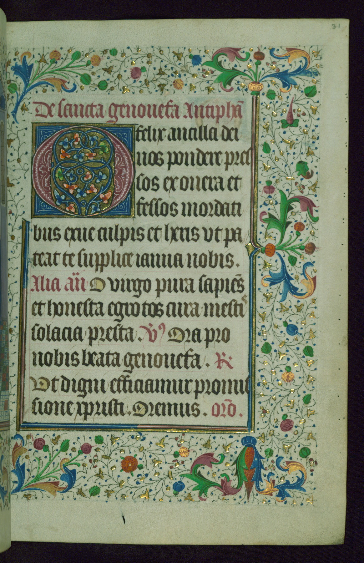 This Book of Hours, ca. 1460, was completed for use of Rome and illuminated under the influence, if not the direct participation, of Willem Vrelant. There remain twenty-two extant marginal calendar illustrations, thirteen extant full-page miniatures (many of which are paired with opening suffrages, perhaps suggesting a certain amount of significance to the owner), and one historiated initial. The contemporary binding, signed Livinus Stuaert, is dated 1477 and is most likely of Bruges or Ghent origin. It is thought that the first owner was French due to the French headings throughout and prominent fleur-de-lis figurations decorating the binding. Further, the first owner was likely female, suggested by the ways in which the book was structured to facilitate legibility. This is evinced by the large size of the script and the lack of abbreviations. While much of the text is standard, there remains evidence of personal significance and preference. This is seen in the chosen illuminations for those sections that are most significant to the owner. Most illuminations are paired with the opening page of staple Hours; however, many are accompanied by individual suffrages, constituting a large portion of the beginning of the manuscript. Personal preference is also shown in those sections of text that stray from the standard. The devotional sequence of this manuscript is notable for its sheer length and diversity of prayers as well as its inclusion of a French prayer not of official liturgy (fols. 215r-219v). The first collection of three prayers is headed and written in French. The prayer is attributed to St. Augustine and is described to guarantee a transformation of tribulation into joy through Christ's mercy, but only if the suppliant recites the prayer for thirty consecutive days. While it is not uncommon for evidence of an owner's predilections to surface in a Book of Hours, the particularly divergent features of this book allow readers to glean an intimate view of the patron.