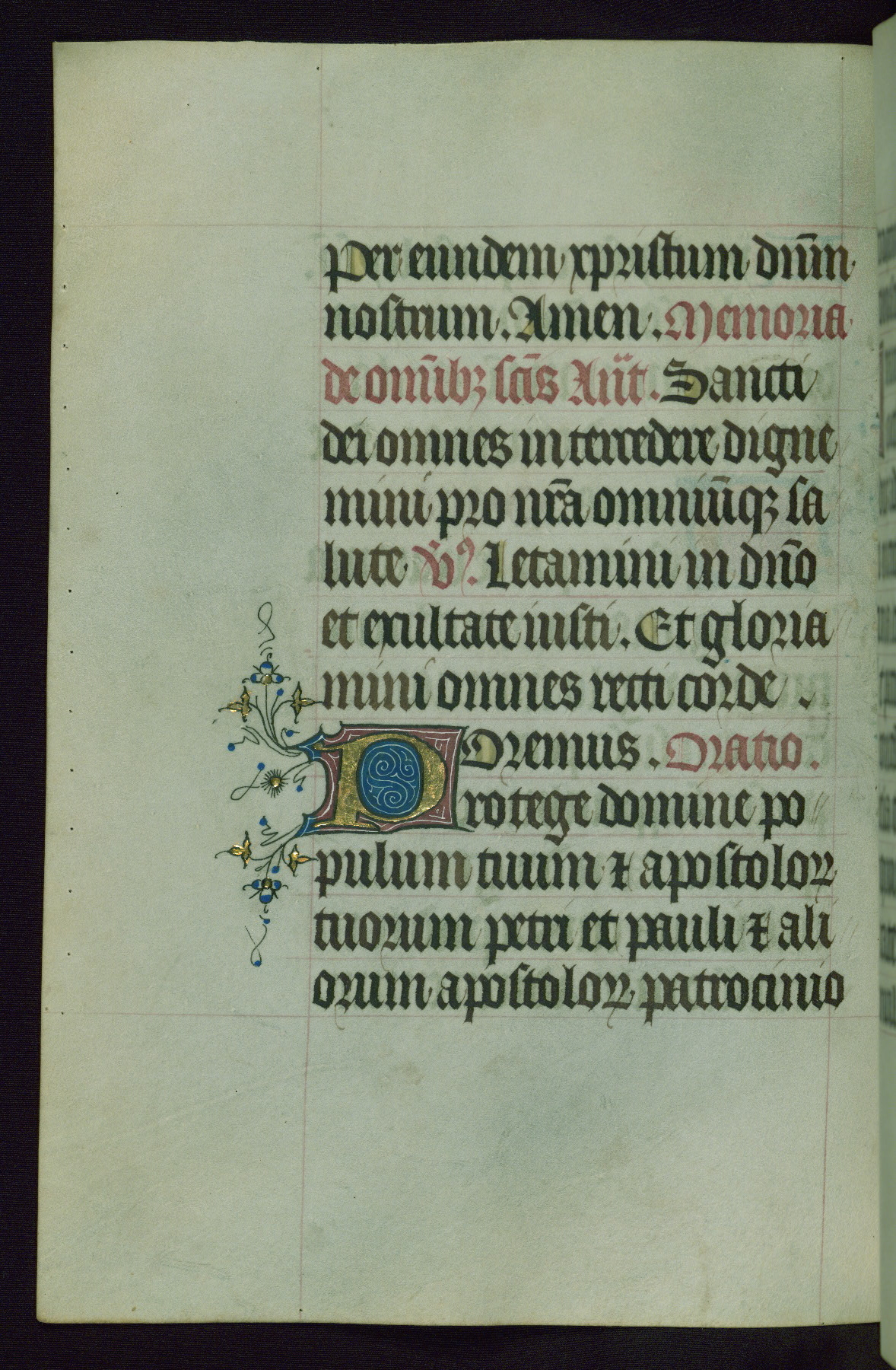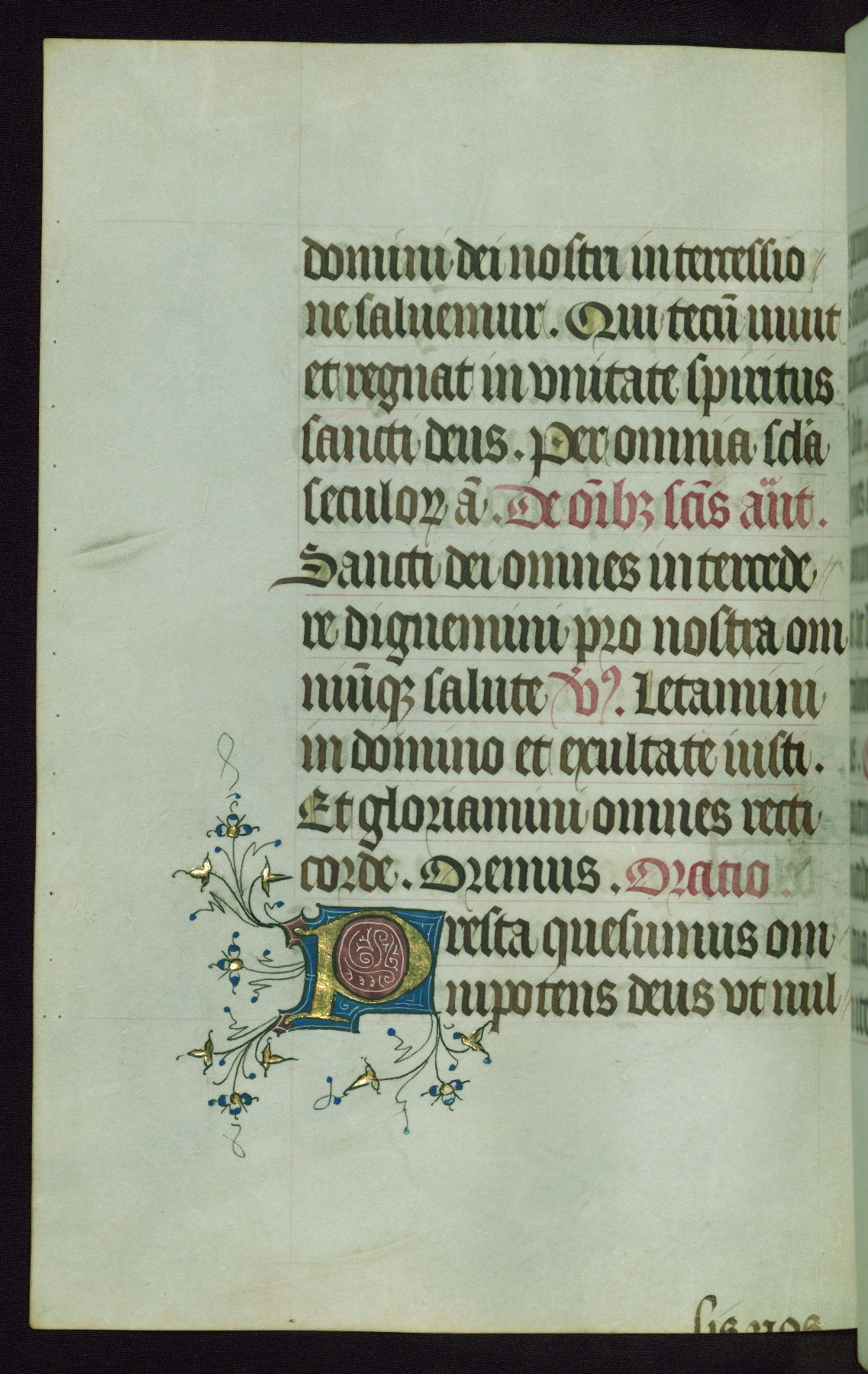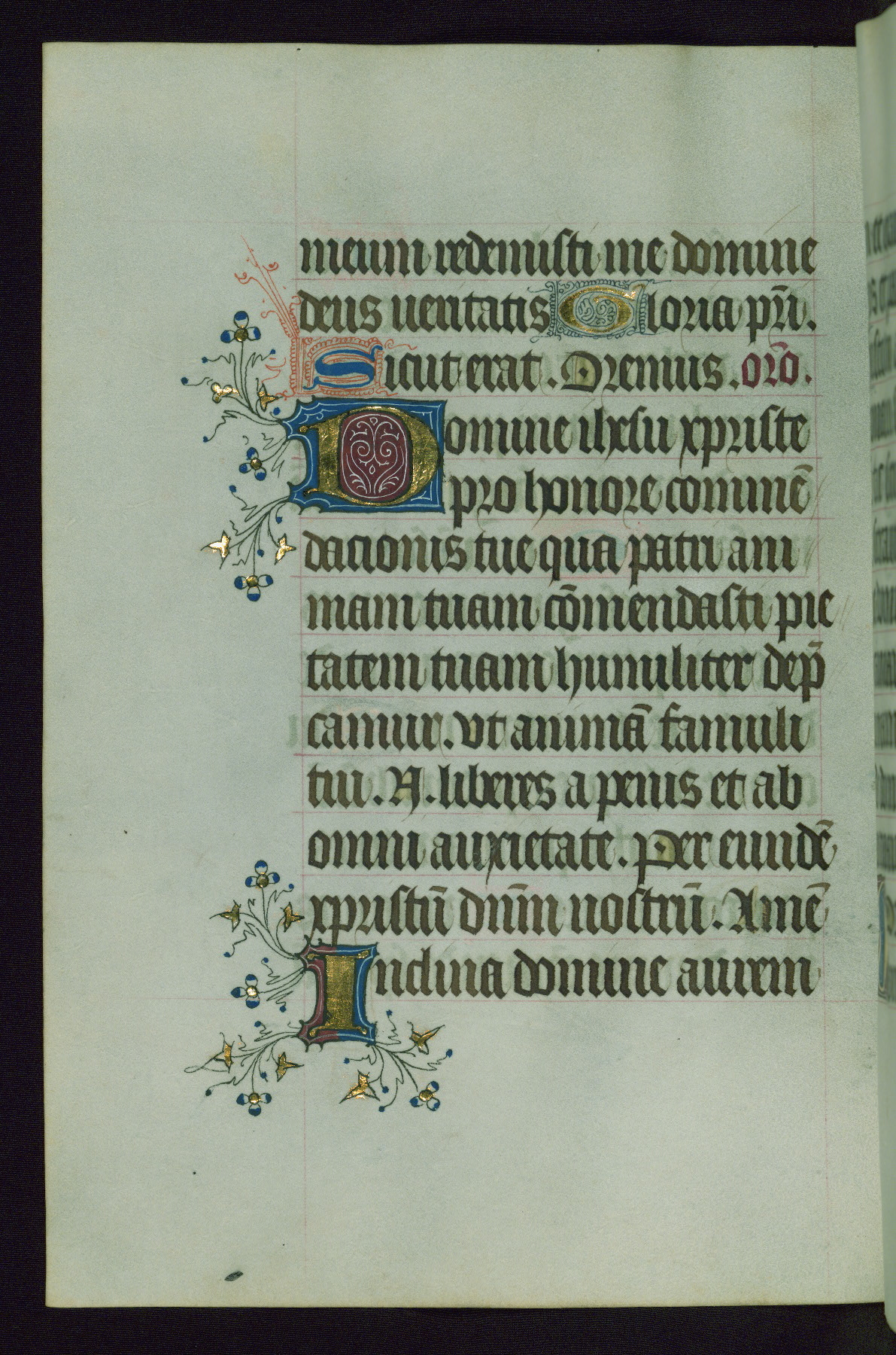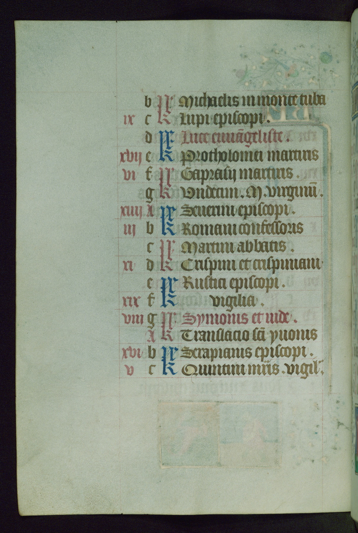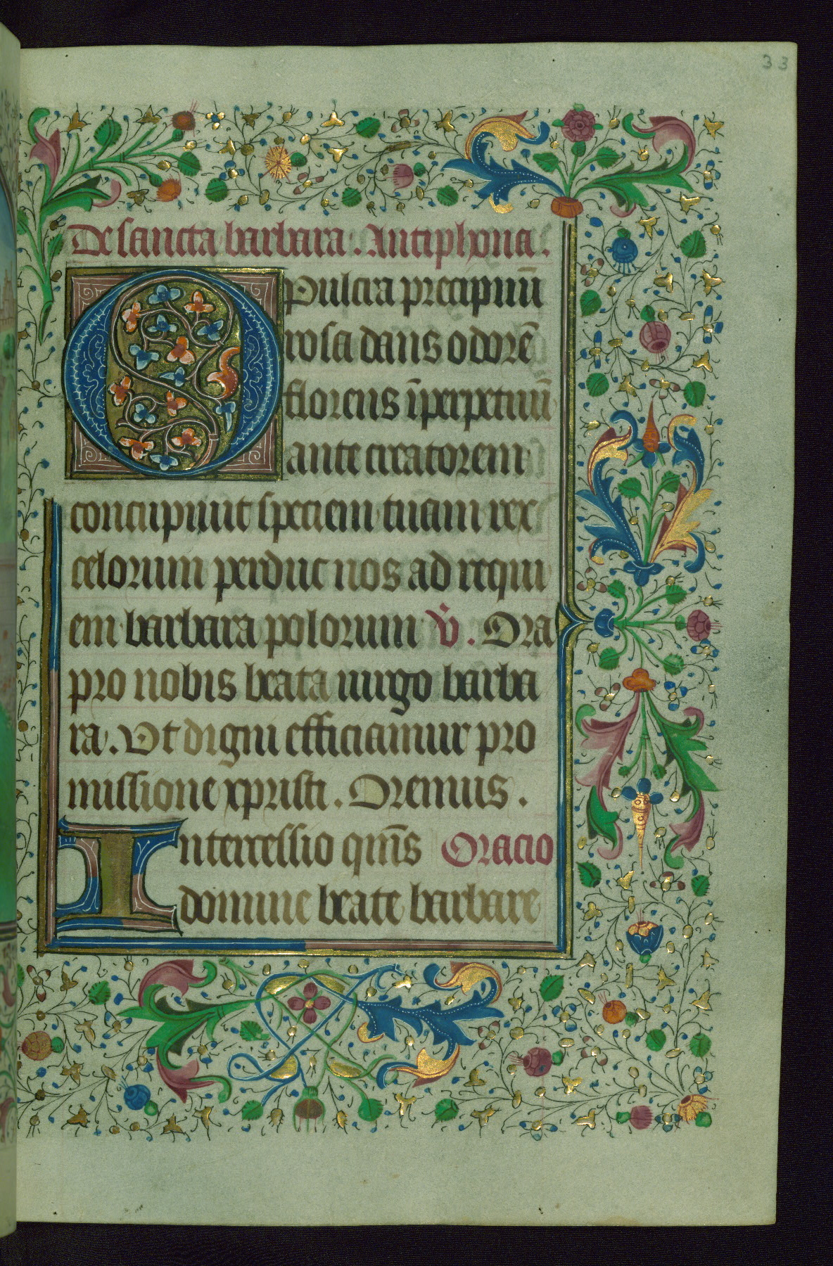 This Book of Hours, ca. 1460, was completed for use of Rome and illuminated under the influence, if not the direct participation, of Willem Vrelant. There remain twenty-two extant marginal calendar illustrations, thirteen extant full-page miniatures (many of which are paired with opening suffrages, perhaps suggesting a certain amount of significance to the owner), and one historiated initial. The contemporary binding, signed Livinus Stuaert, is dated 1477 and is most likely of Bruges or Ghent origin. It is thought that the first owner was French due to the French headings throughout and prominent fleur-de-lis figurations decorating the binding. Further, the first owner was likely female, suggested by the ways in which the book was structured to facilitate legibility. This is evinced by the large size of the script and the lack of abbreviations. While much of the text is standard, there remains evidence of personal significance and preference. This is seen in the chosen illuminations for those sections that are most significant to the owner. Most illuminations are paired with the opening page of staple Hours; however, many are accompanied by individual suffrages, constituting a large portion of the beginning of the manuscript. Personal preference is also shown in those sections of text that stray from the standard. The devotional sequence of this manuscript is notable for its sheer length and diversity of prayers as well as its inclusion of a French prayer not of official liturgy (fols. 215r-219v). The first collection of three prayers is headed and written in French. The prayer is attributed to St. Augustine and is described to guarantee a transformation of tribulation into joy through Christ's mercy, but only if the suppliant recites the prayer for thirty consecutive days. While it is not uncommon for evidence of an owner's predilections to surface in a Book of Hours, the particularly divergent features of this book allow readers to glean an intimate view of the patron.
