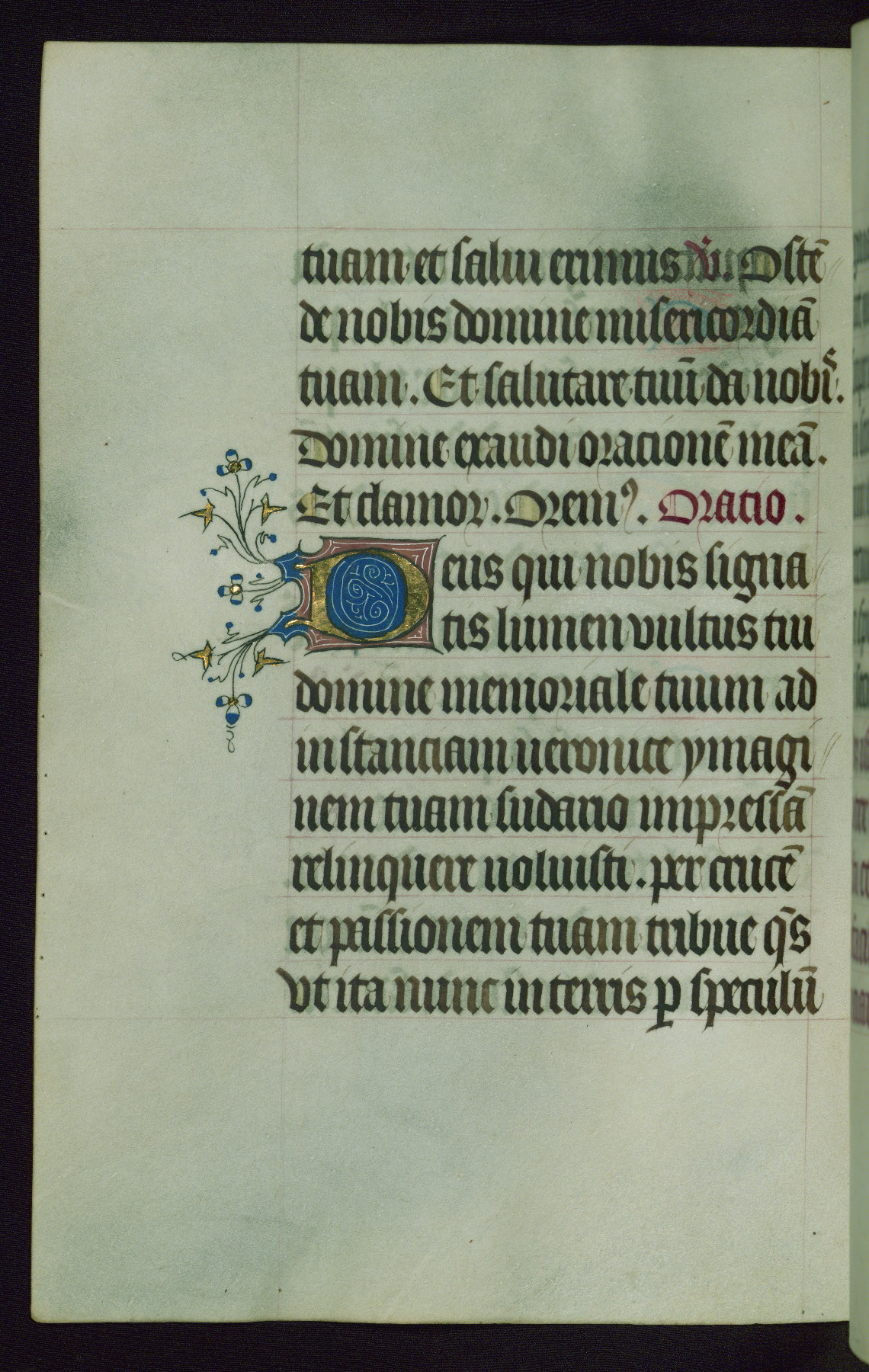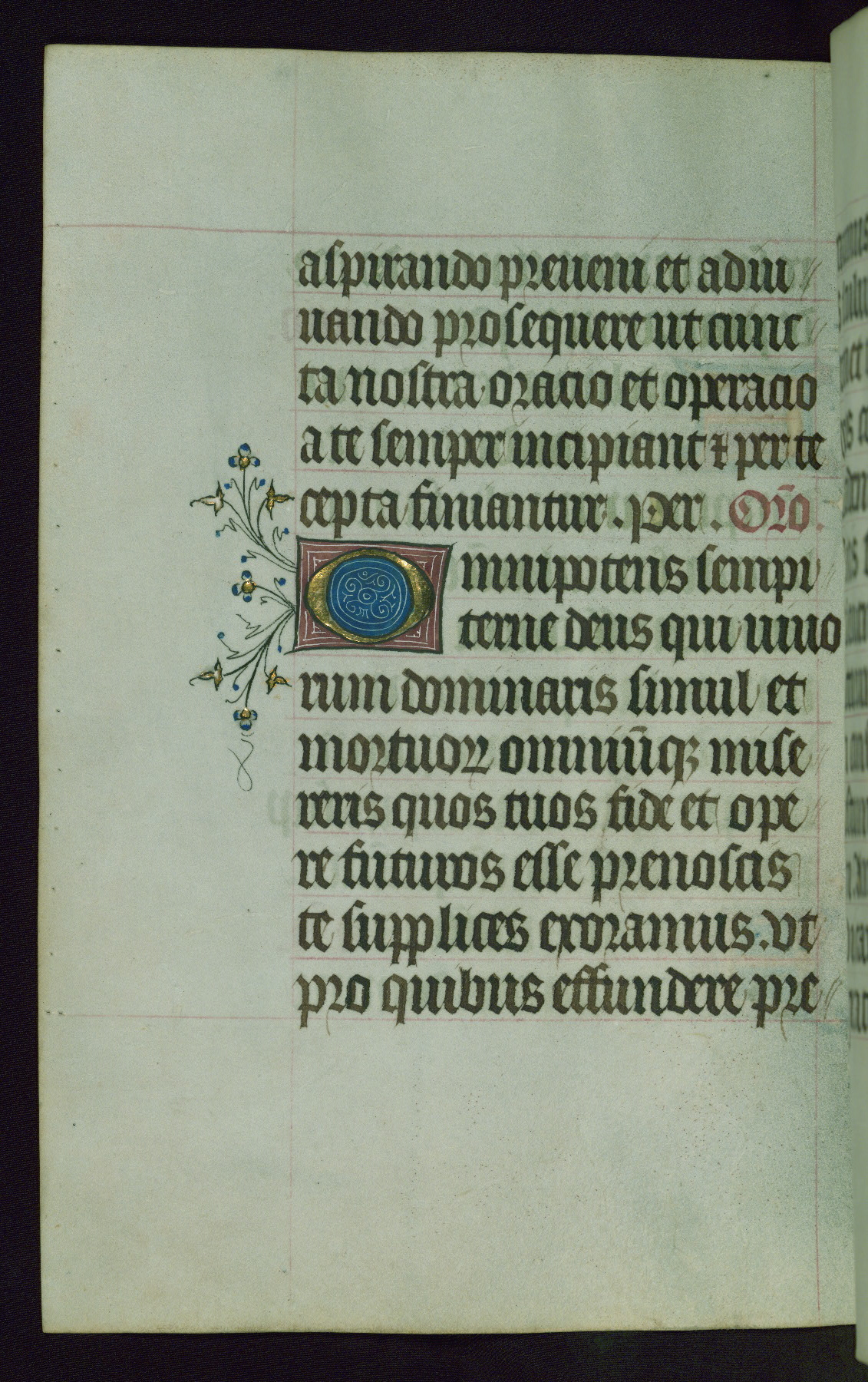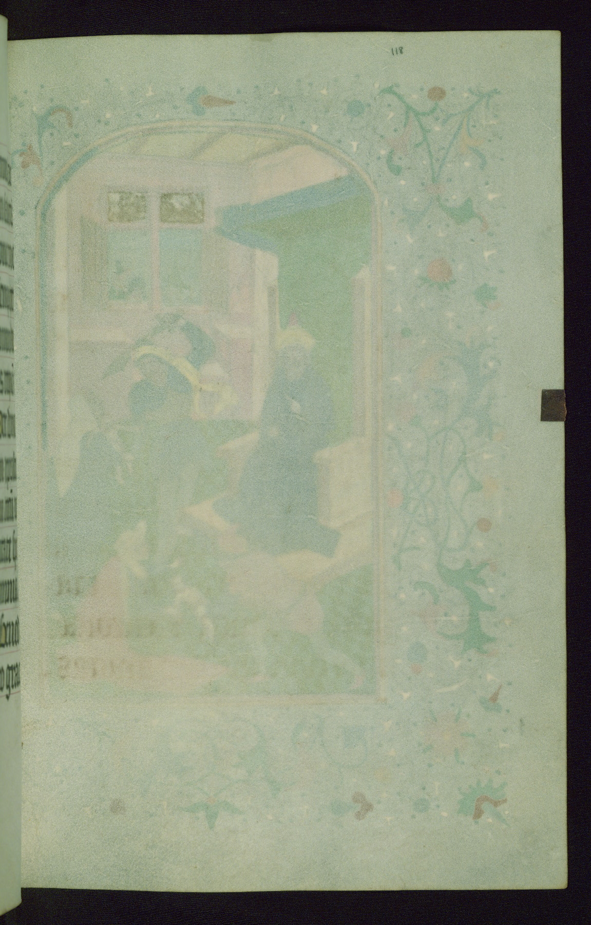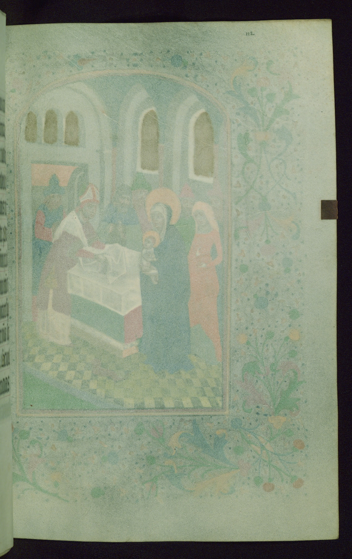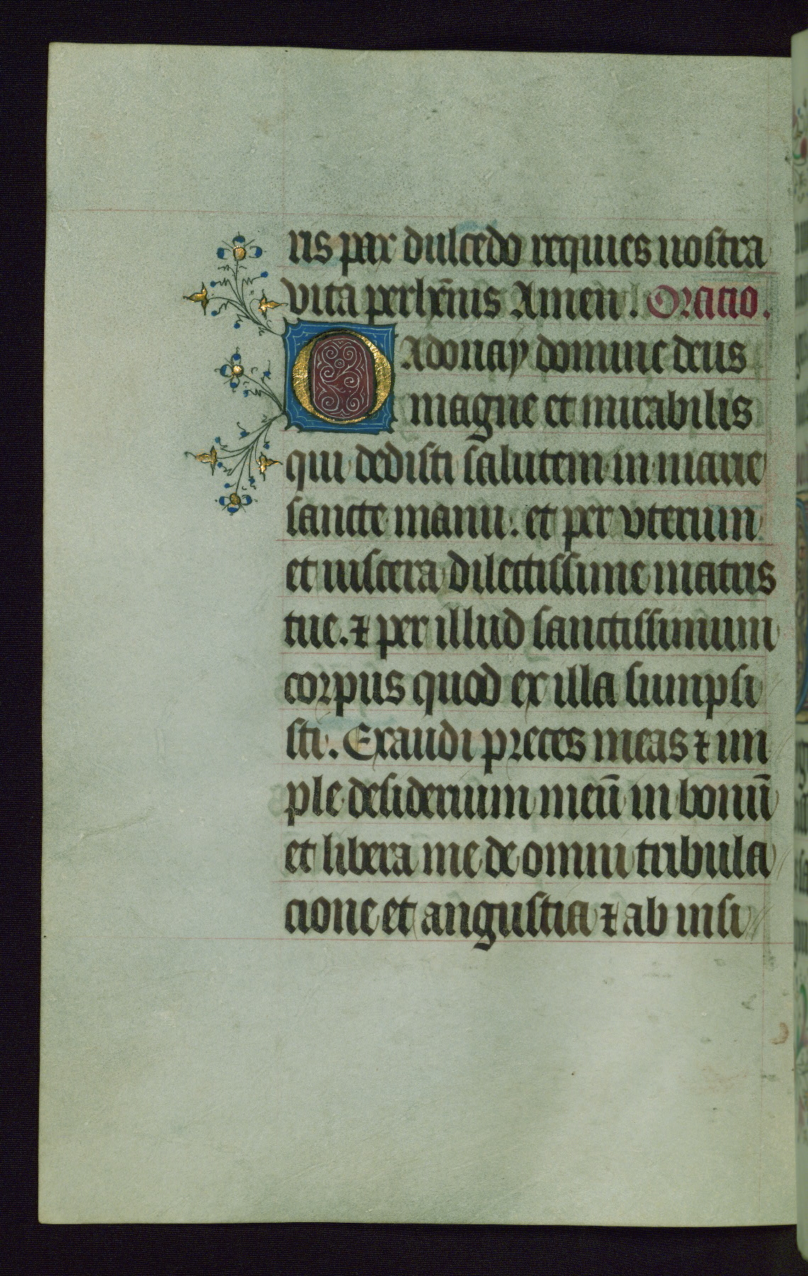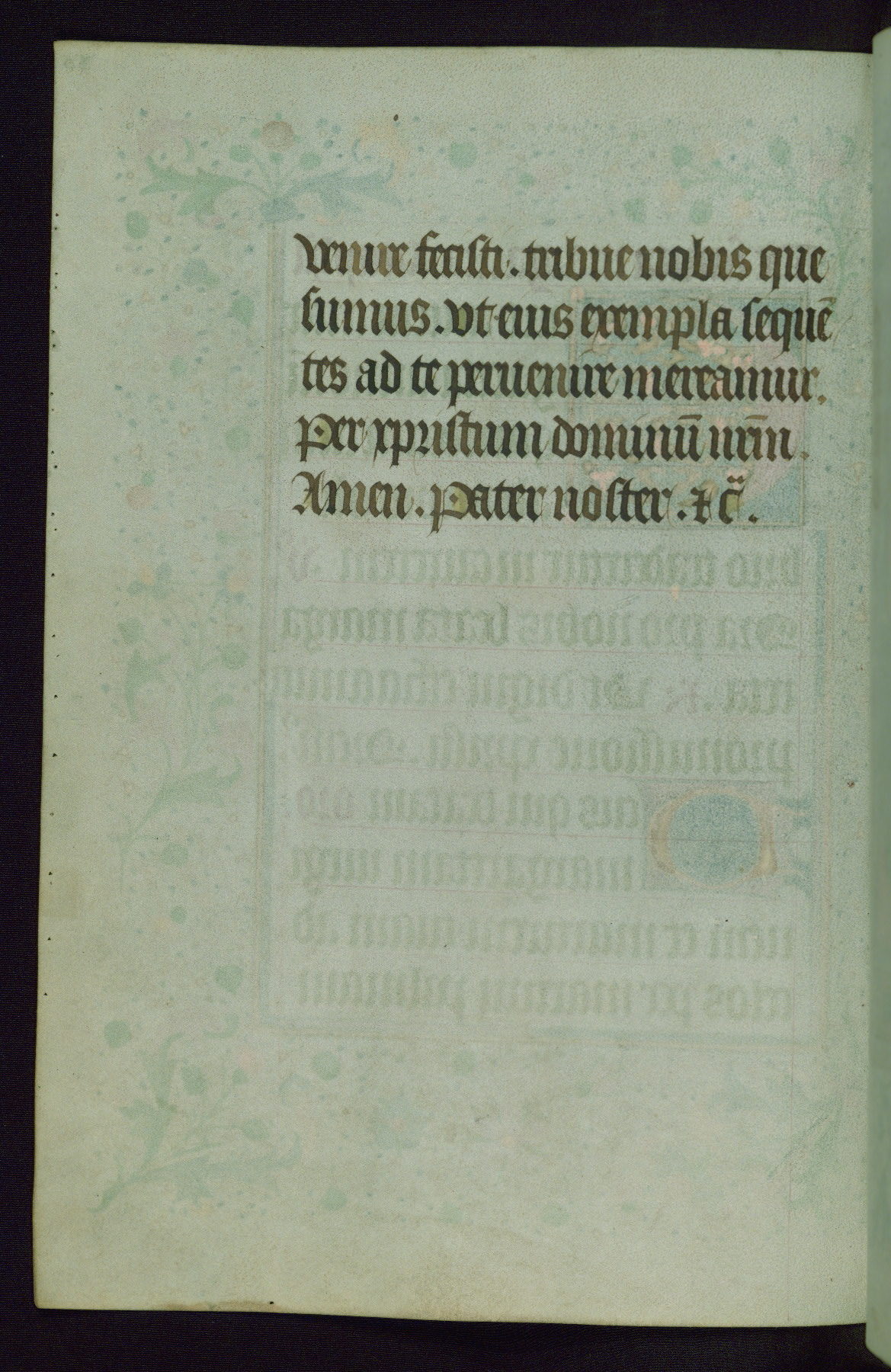 This Book of Hours, ca. 1460, was completed for use of Rome and illuminated under the influence, if not the direct participation, of Willem Vrelant. There remain twenty-two extant marginal calendar illustrations, thirteen extant full-page miniatures (many of which are paired with opening suffrages, perhaps suggesting a certain amount of significance to the owner), and one historiated initial. The contemporary binding, signed Livinus Stuaert, is dated 1477 and is most likely of Bruges or Ghent origin. It is thought that the first owner was French due to the French headings throughout and prominent fleur-de-lis figurations decorating the binding. Further, the first owner was likely female, suggested by the ways in which the book was structured to facilitate legibility. This is evinced by the large size of the script and the lack of abbreviations. While much of the text is standard, there remains evidence of personal significance and preference. This is seen in the chosen illuminations for those sections that are most significant to the owner. Most illuminations are paired with the opening page of staple Hours; however, many are accompanied by individual suffrages, constituting a large portion of the beginning of the manuscript. Personal preference is also shown in those sections of text that stray from the standard. The devotional sequence of this manuscript is notable for its sheer length and diversity of prayers as well as its inclusion of a French prayer not of official liturgy (fols. 215r-219v). The first collection of three prayers is headed and written in French. The prayer is attributed to St. Augustine and is described to guarantee a transformation of tribulation into joy through Christ's mercy, but only if the suppliant recites the prayer for thirty consecutive days. While it is not uncommon for evidence of an owner's predilections to surface in a Book of Hours, the particularly divergent features of this book allow readers to glean an intimate view of the patron.