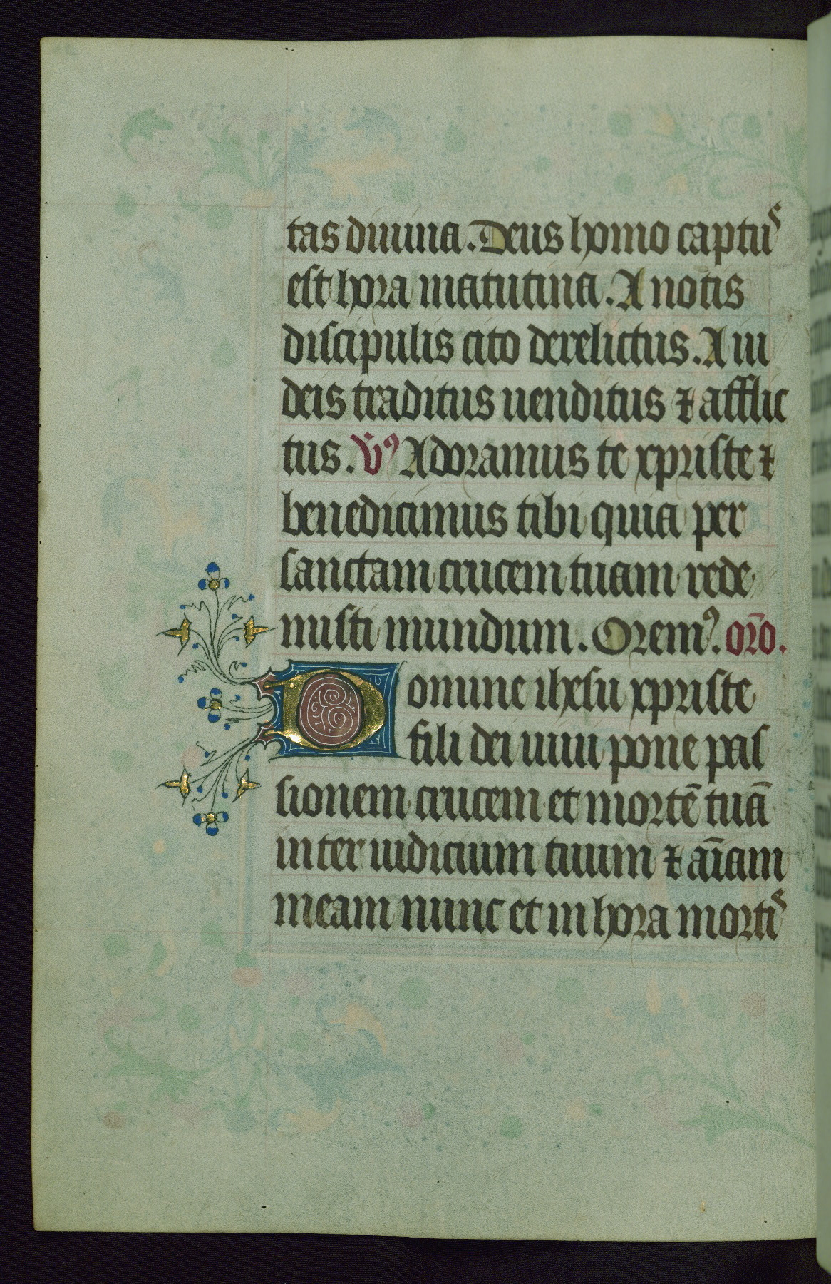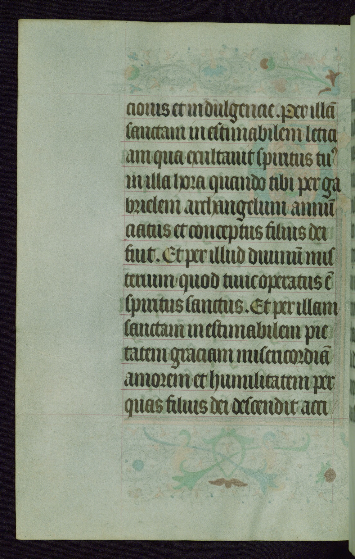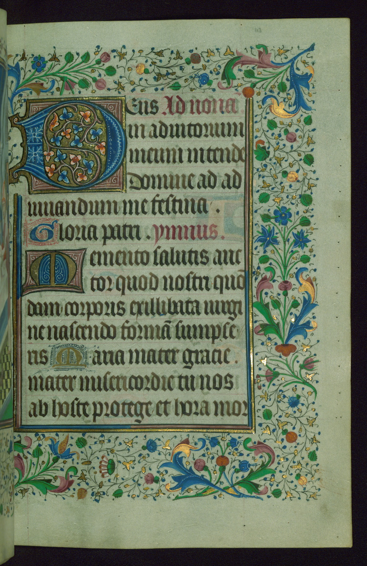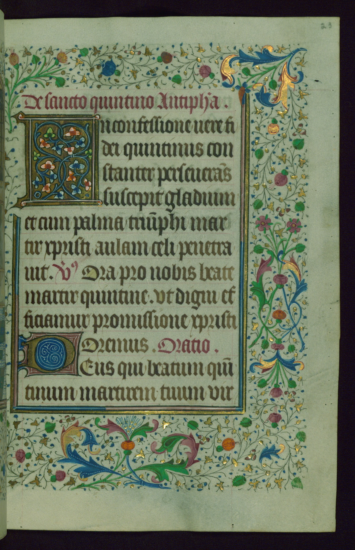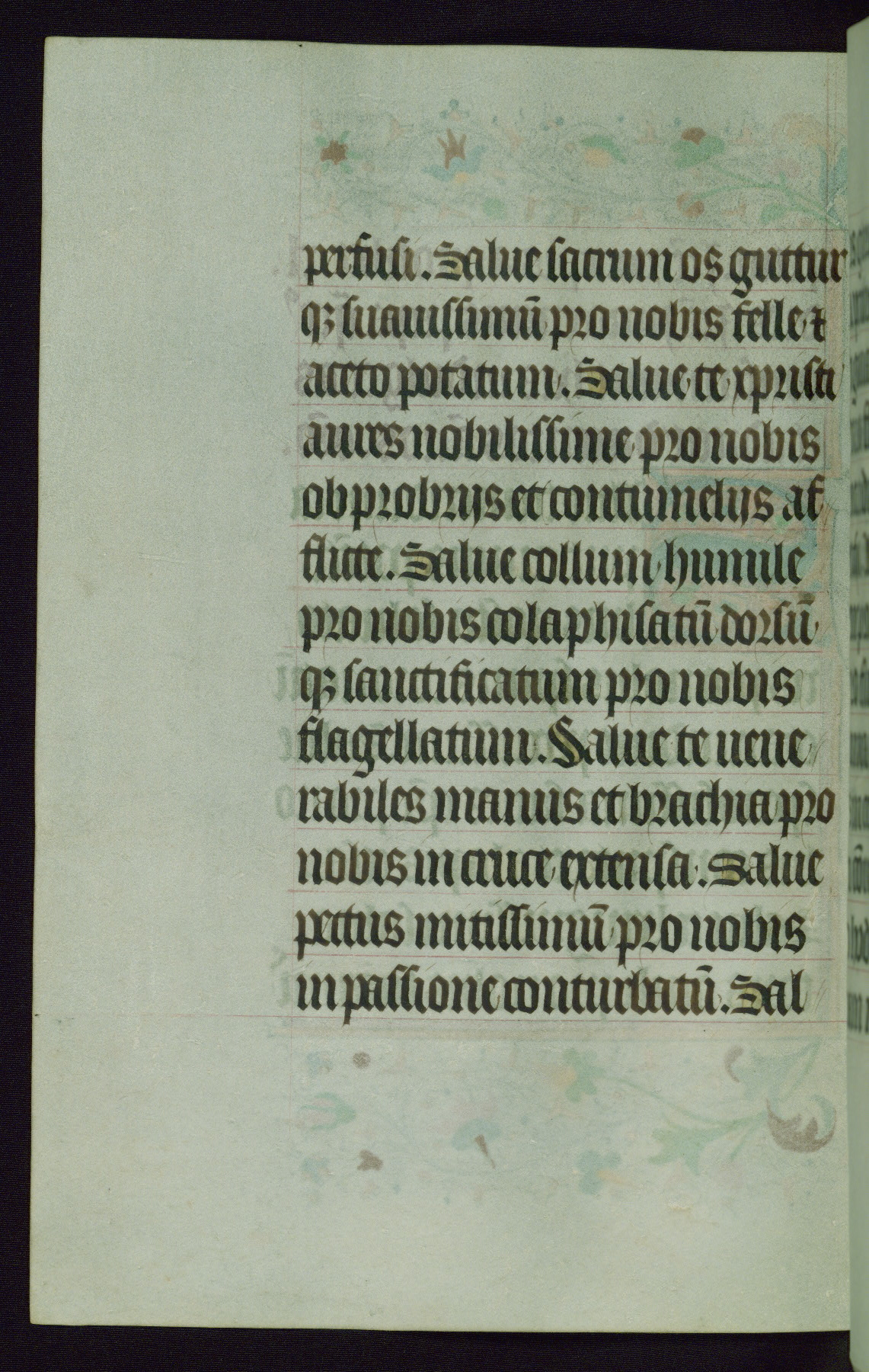 This Book of Hours, ca. 1460, was completed for use of Rome and illuminated under the influence, if not the direct participation, of Willem Vrelant. There remain twenty-two extant marginal calendar illustrations, thirteen extant full-page miniatures (many of which are paired with opening suffrages, perhaps suggesting a certain amount of significance to the owner), and one historiated initial. The contemporary binding, signed Livinus Stuaert, is dated 1477 and is most likely of Bruges or Ghent origin. It is thought that the first owner was French due to the French headings throughout and prominent fleur-de-lis figurations decorating the binding. Further, the first owner was likely female, suggested by the ways in which the book was structured to facilitate legibility. This is evinced by the large size of the script and the lack of abbreviations. While much of the text is standard, there remains evidence of personal significance and preference. This is seen in the chosen illuminations for those sections that are most significant to the owner. Most illuminations are paired with the opening page of staple Hours; however, many are accompanied by individual suffrages, constituting a large portion of the beginning of the manuscript. Personal preference is also shown in those sections of text that stray from the standard. The devotional sequence of this manuscript is notable for its sheer length and diversity of prayers as well as its inclusion of a French prayer not of official liturgy (fols. 215r-219v). The first collection of three prayers is headed and written in French. The prayer is attributed to St. Augustine and is described to guarantee a transformation of tribulation into joy through Christ's mercy, but only if the suppliant recites the prayer for thirty consecutive days. While it is not uncommon for evidence of an owner's predilections to surface in a Book of Hours, the particularly divergent features of this book allow readers to glean an intimate view of the patron.
