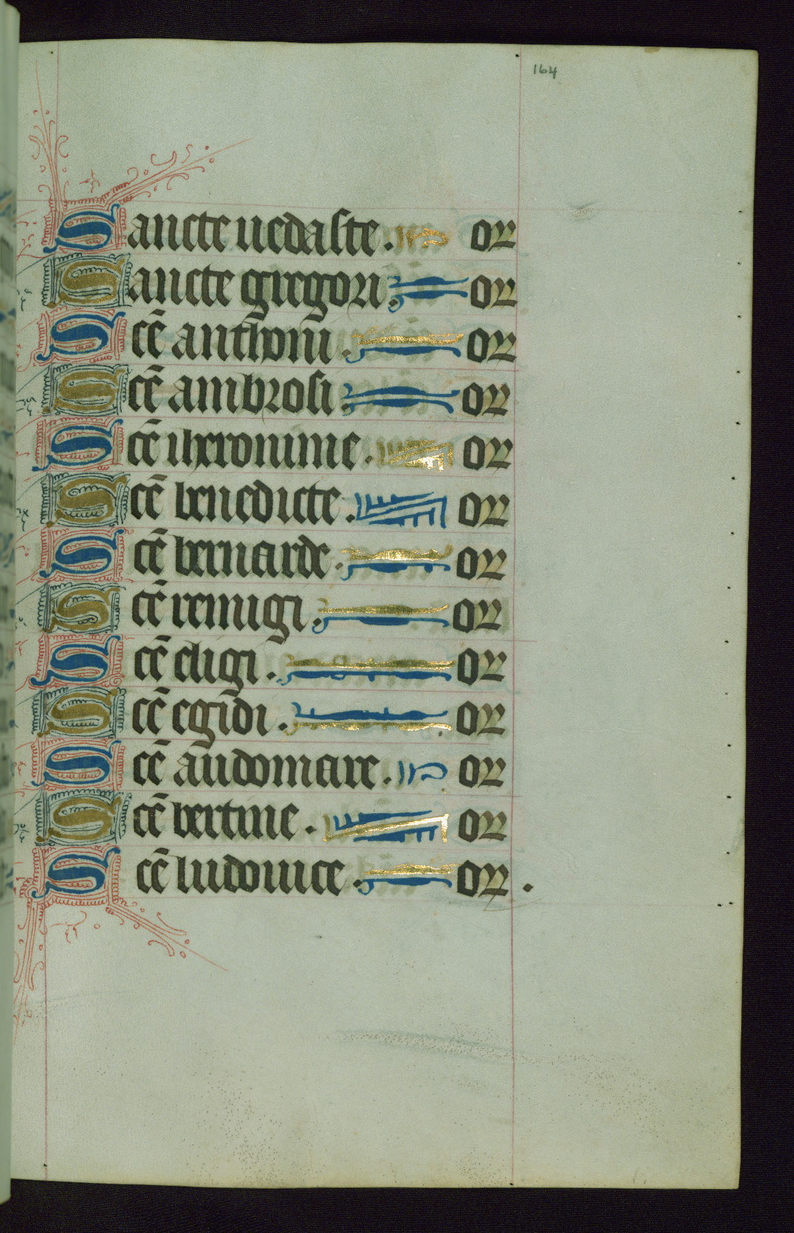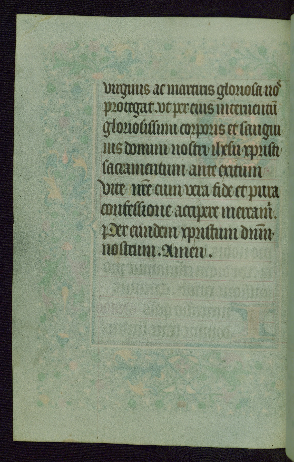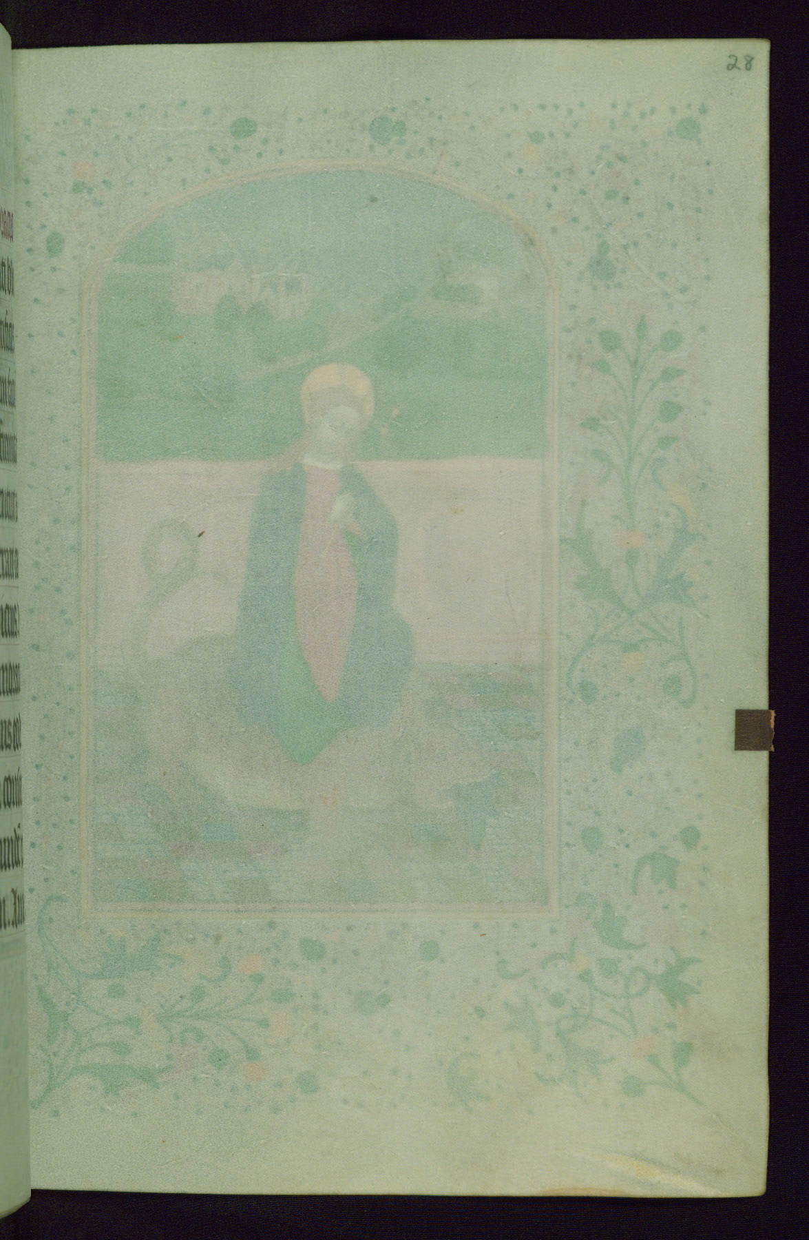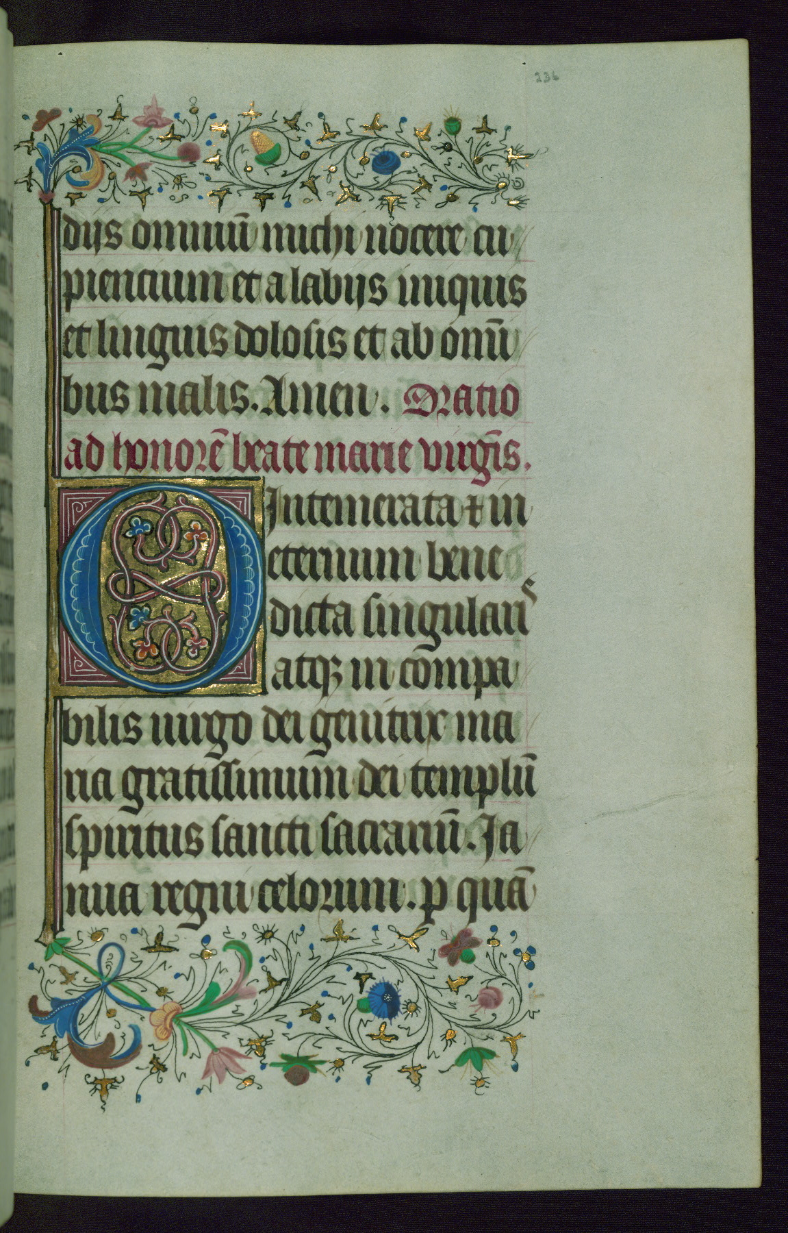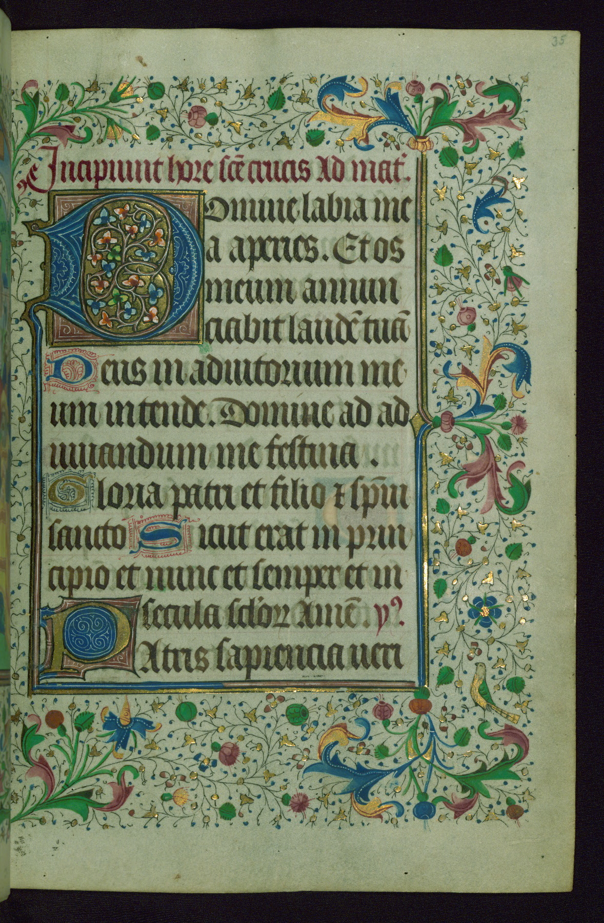 This Book of Hours, ca. 1460, was completed for use of Rome and illuminated under the influence, if not the direct participation, of Willem Vrelant. There remain twenty-two extant marginal calendar illustrations, thirteen extant full-page miniatures (many of which are paired with opening suffrages, perhaps suggesting a certain amount of significance to the owner), and one historiated initial. The contemporary binding, signed Livinus Stuaert, is dated 1477 and is most likely of Bruges or Ghent origin. It is thought that the first owner was French due to the French headings throughout and prominent fleur-de-lis figurations decorating the binding. Further, the first owner was likely female, suggested by the ways in which the book was structured to facilitate legibility. This is evinced by the large size of the script and the lack of abbreviations. While much of the text is standard, there remains evidence of personal significance and preference. This is seen in the chosen illuminations for those sections that are most significant to the owner. Most illuminations are paired with the opening page of staple Hours; however, many are accompanied by individual suffrages, constituting a large portion of the beginning of the manuscript. Personal preference is also shown in those sections of text that stray from the standard. The devotional sequence of this manuscript is notable for its sheer length and diversity of prayers as well as its inclusion of a French prayer not of official liturgy (fols. 215r-219v). The first collection of three prayers is headed and written in French. The prayer is attributed to St. Augustine and is described to guarantee a transformation of tribulation into joy through Christ's mercy, but only if the suppliant recites the prayer for thirty consecutive days. While it is not uncommon for evidence of an owner's predilections to surface in a Book of Hours, the particularly divergent features of this book allow readers to glean an intimate view of the patron.