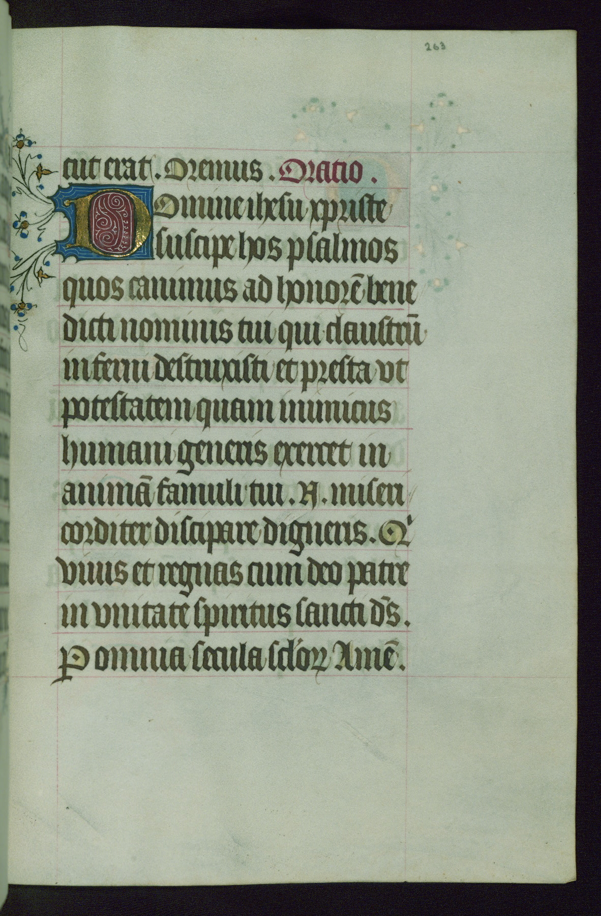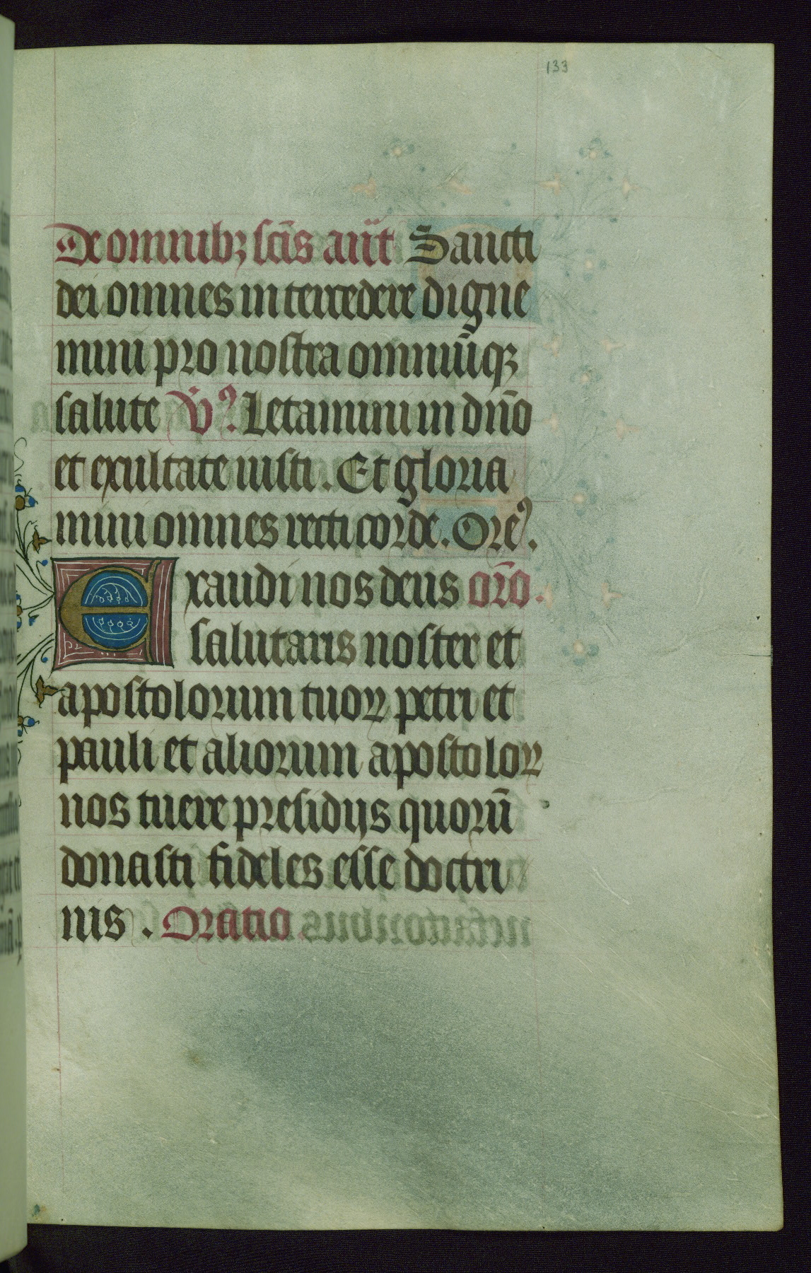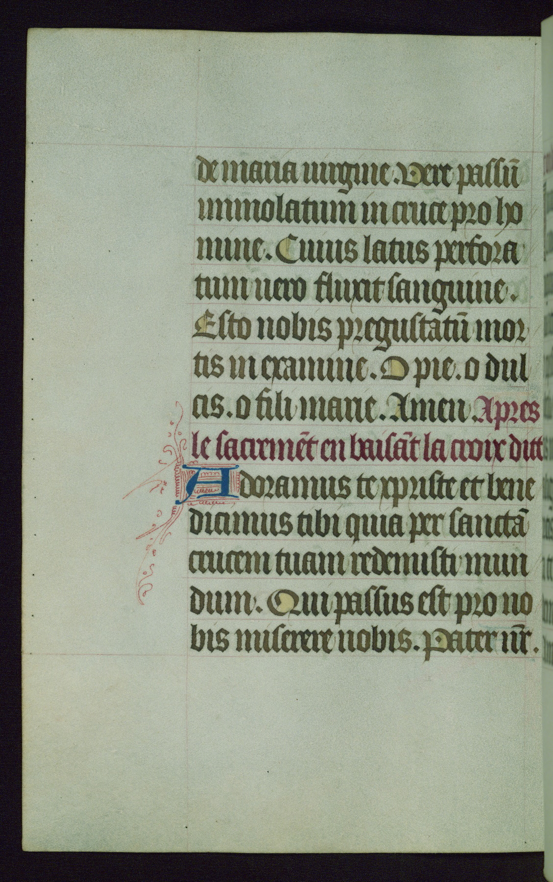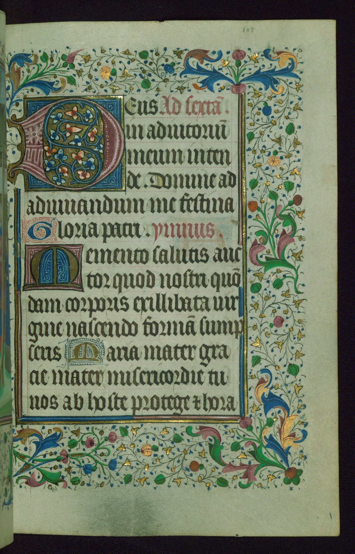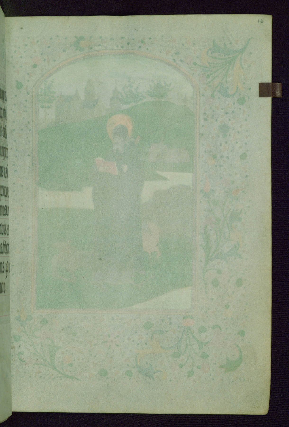 This Book of Hours, ca. 1460, was completed for use of Rome and illuminated under the influence, if not the direct participation, of Willem Vrelant. There remain twenty-two extant marginal calendar illustrations, thirteen extant full-page miniatures (many of which are paired with opening suffrages, perhaps suggesting a certain amount of significance to the owner), and one historiated initial. The contemporary binding, signed Livinus Stuaert, is dated 1477 and is most likely of Bruges or Ghent origin. It is thought that the first owner was French due to the French headings throughout and prominent fleur-de-lis figurations decorating the binding. Further, the first owner was likely female, suggested by the ways in which the book was structured to facilitate legibility. This is evinced by the large size of the script and the lack of abbreviations. While much of the text is standard, there remains evidence of personal significance and preference. This is seen in the chosen illuminations for those sections that are most significant to the owner. Most illuminations are paired with the opening page of staple Hours; however, many are accompanied by individual suffrages, constituting a large portion of the beginning of the manuscript. Personal preference is also shown in those sections of text that stray from the standard. The devotional sequence of this manuscript is notable for its sheer length and diversity of prayers as well as its inclusion of a French prayer not of official liturgy (fols. 215r-219v). The first collection of three prayers is headed and written in French. The prayer is attributed to St. Augustine and is described to guarantee a transformation of tribulation into joy through Christ's mercy, but only if the suppliant recites the prayer for thirty consecutive days. While it is not uncommon for evidence of an owner's predilections to surface in a Book of Hours, the particularly divergent features of this book allow readers to glean an intimate view of the patron.