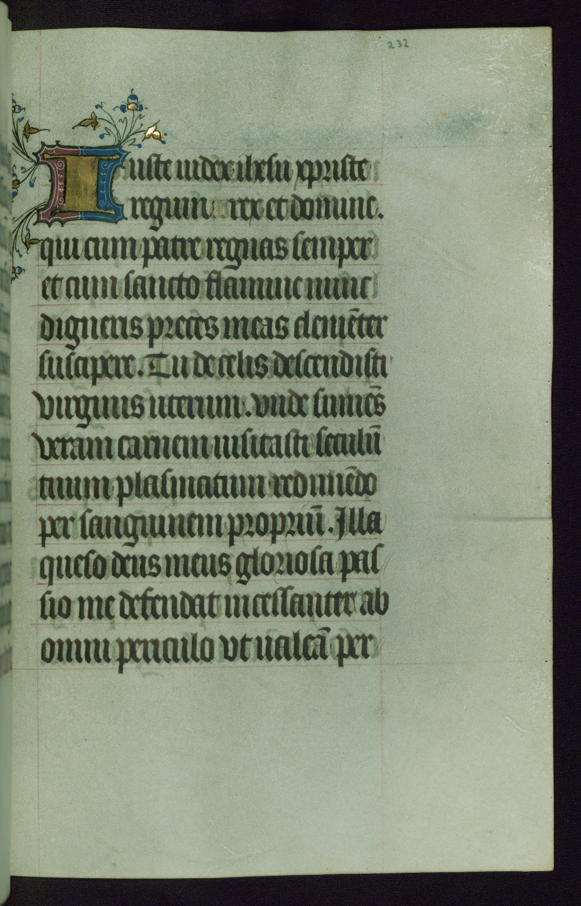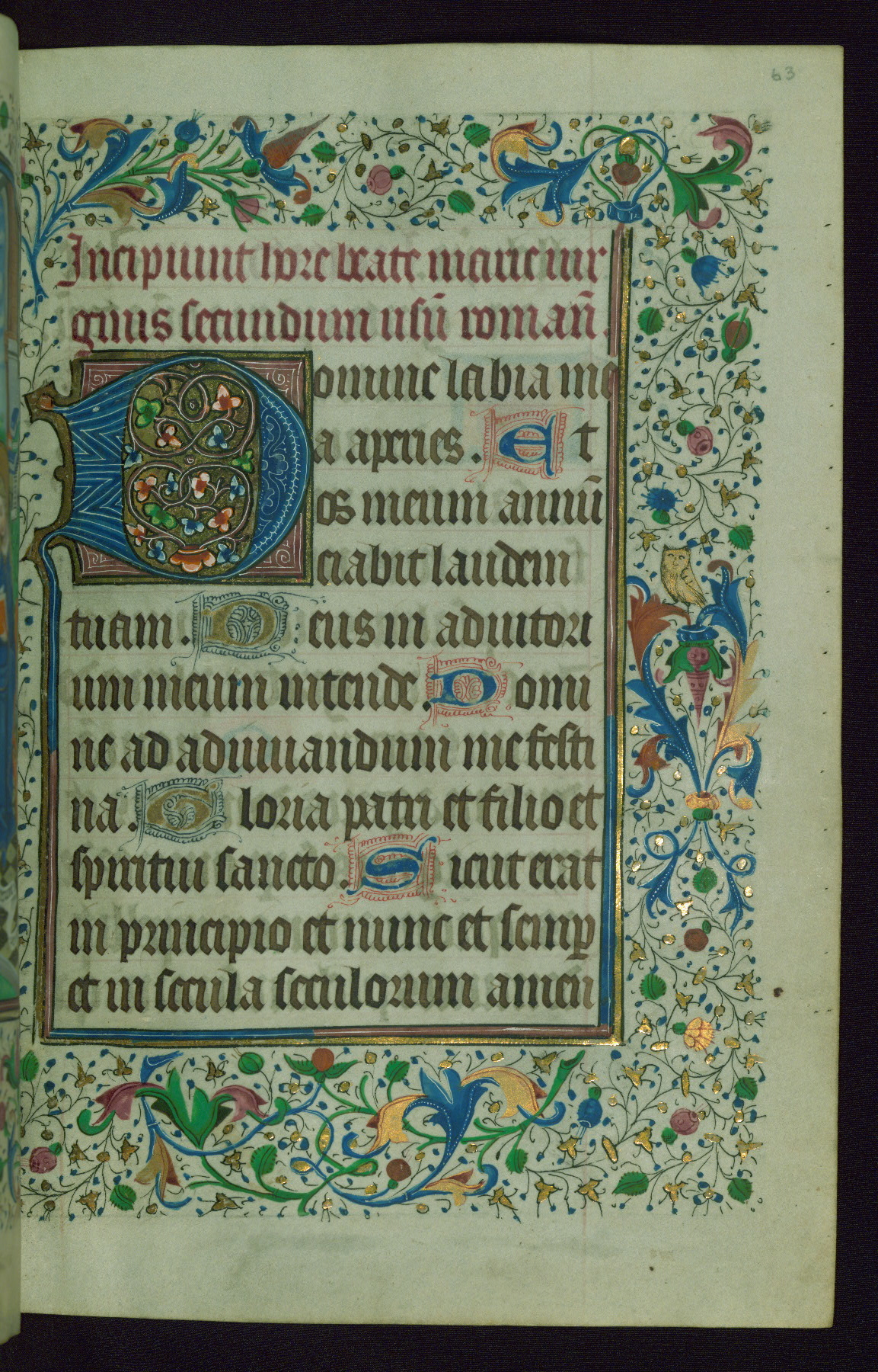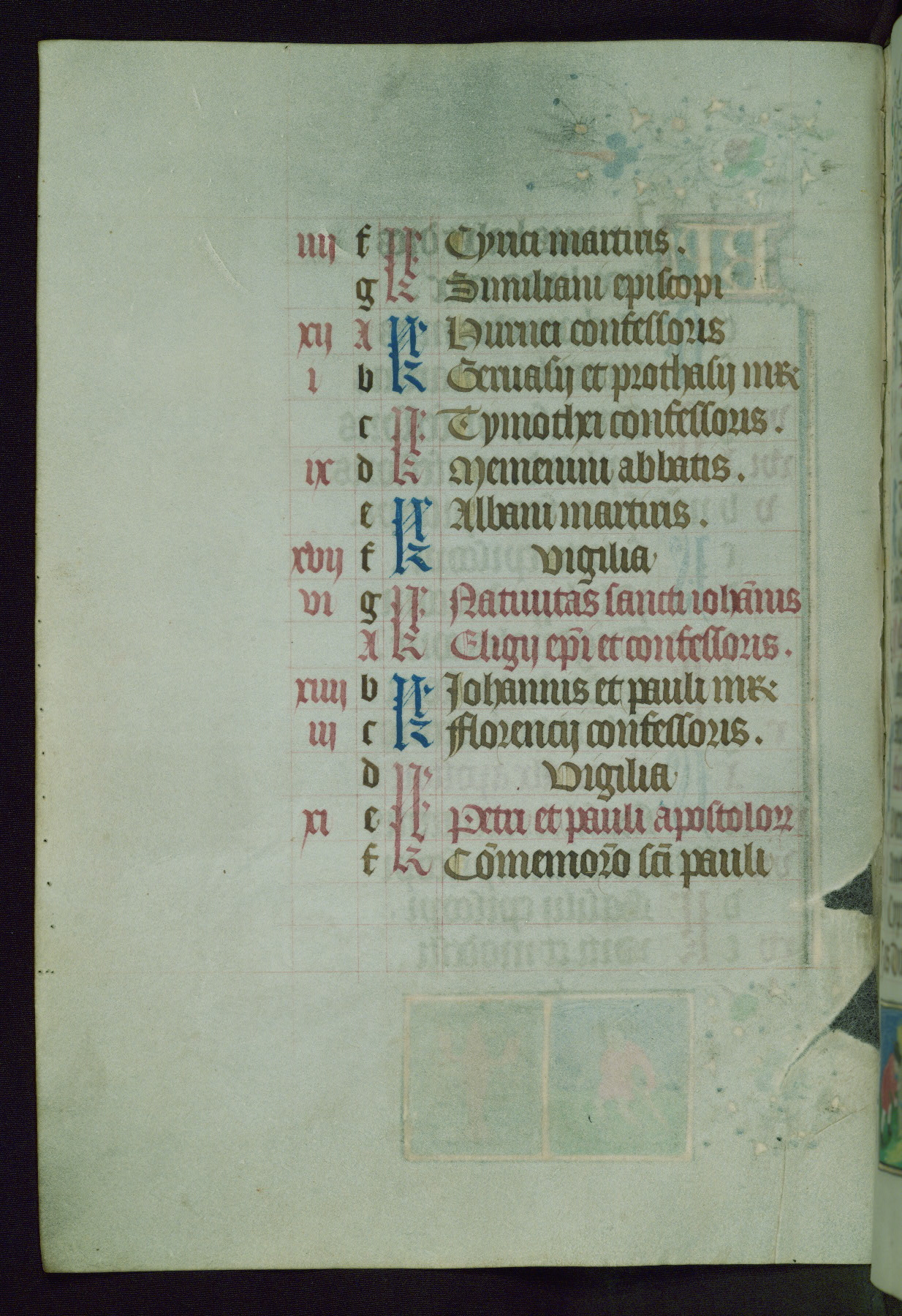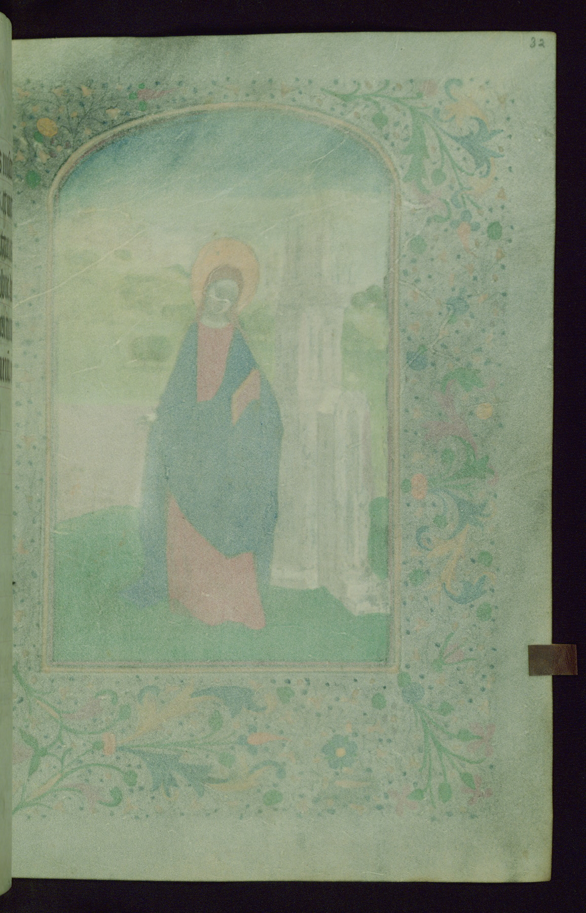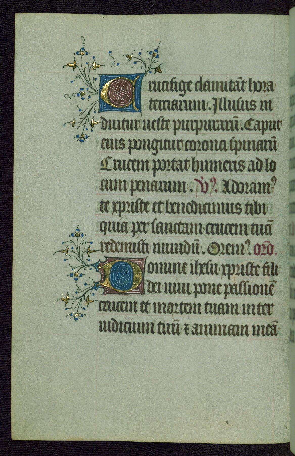 This Book of Hours, ca. 1460, was completed for use of Rome and illuminated under the influence, if not the direct participation, of Willem Vrelant. There remain twenty-two extant marginal calendar illustrations, thirteen extant full-page miniatures (many of which are paired with opening suffrages, perhaps suggesting a certain amount of significance to the owner), and one historiated initial. The contemporary binding, signed Livinus Stuaert, is dated 1477 and is most likely of Bruges or Ghent origin. It is thought that the first owner was French due to the French headings throughout and prominent fleur-de-lis figurations decorating the binding. Further, the first owner was likely female, suggested by the ways in which the book was structured to facilitate legibility. This is evinced by the large size of the script and the lack of abbreviations. While much of the text is standard, there remains evidence of personal significance and preference. This is seen in the chosen illuminations for those sections that are most significant to the owner. Most illuminations are paired with the opening page of staple Hours; however, many are accompanied by individual suffrages, constituting a large portion of the beginning of the manuscript. Personal preference is also shown in those sections of text that stray from the standard. The devotional sequence of this manuscript is notable for its sheer length and diversity of prayers as well as its inclusion of a French prayer not of official liturgy (fols. 215r-219v). The first collection of three prayers is headed and written in French. The prayer is attributed to St. Augustine and is described to guarantee a transformation of tribulation into joy through Christ's mercy, but only if the suppliant recites the prayer for thirty consecutive days. While it is not uncommon for evidence of an owner's predilections to surface in a Book of Hours, the particularly divergent features of this book allow readers to glean an intimate view of the patron.