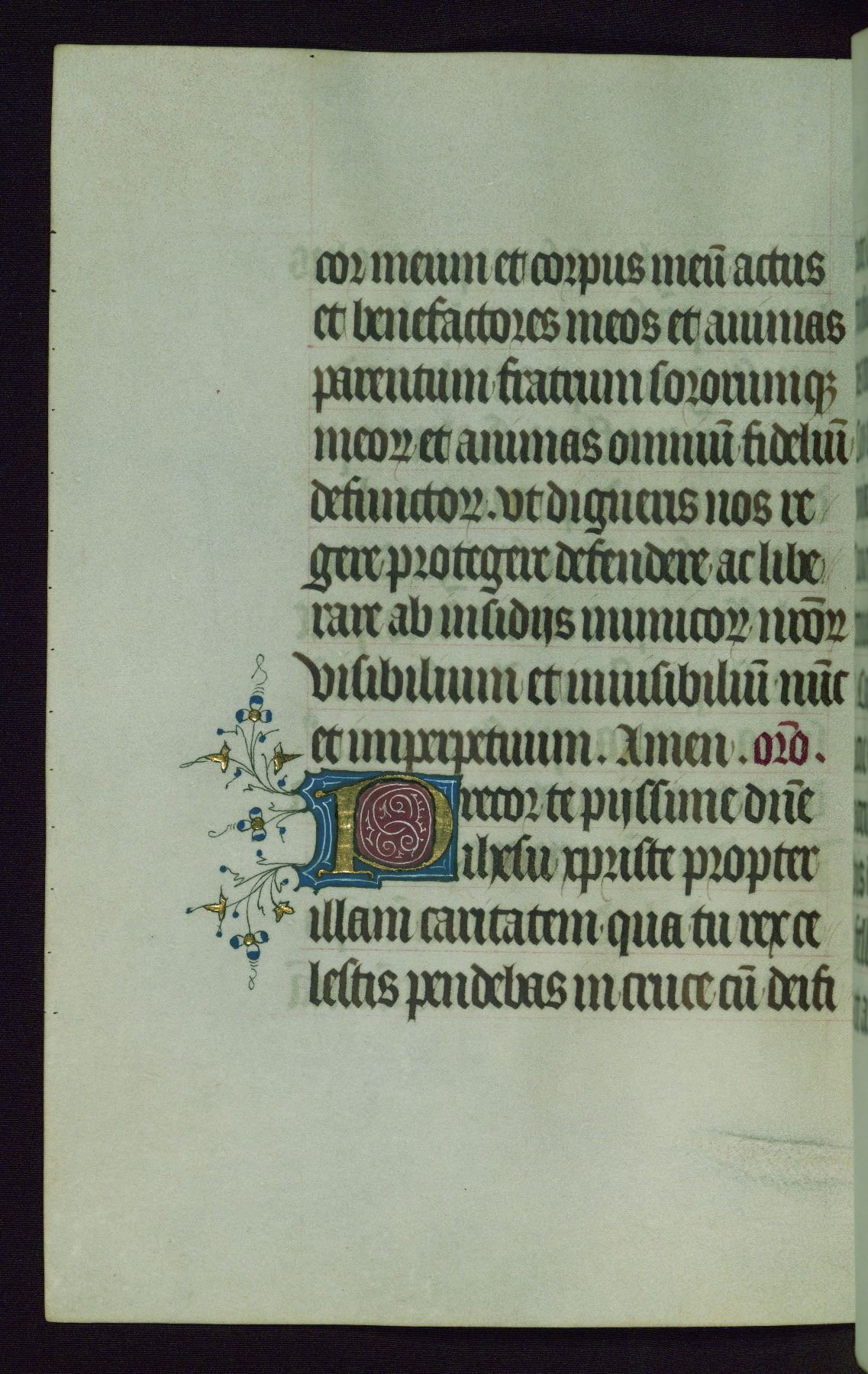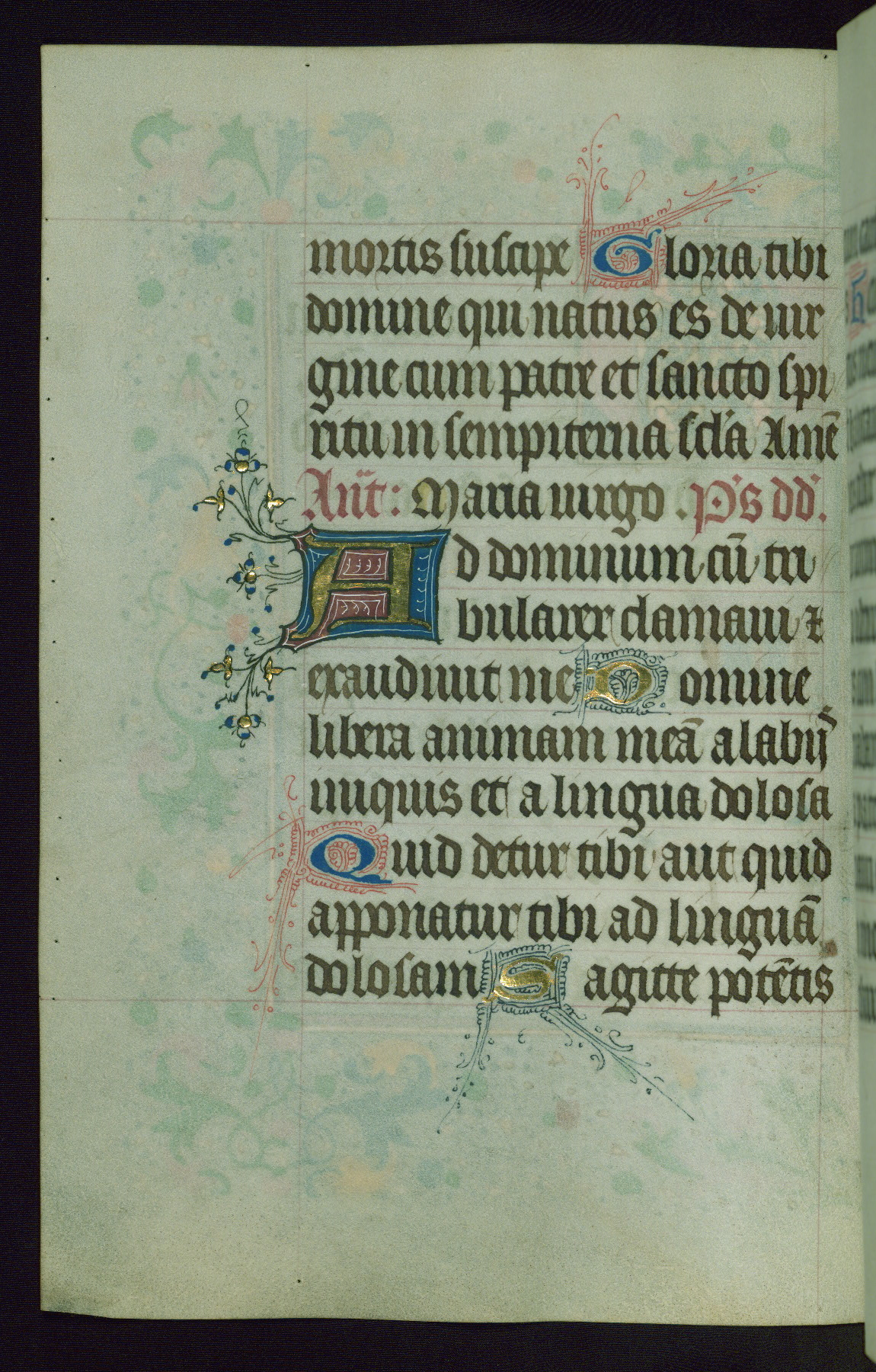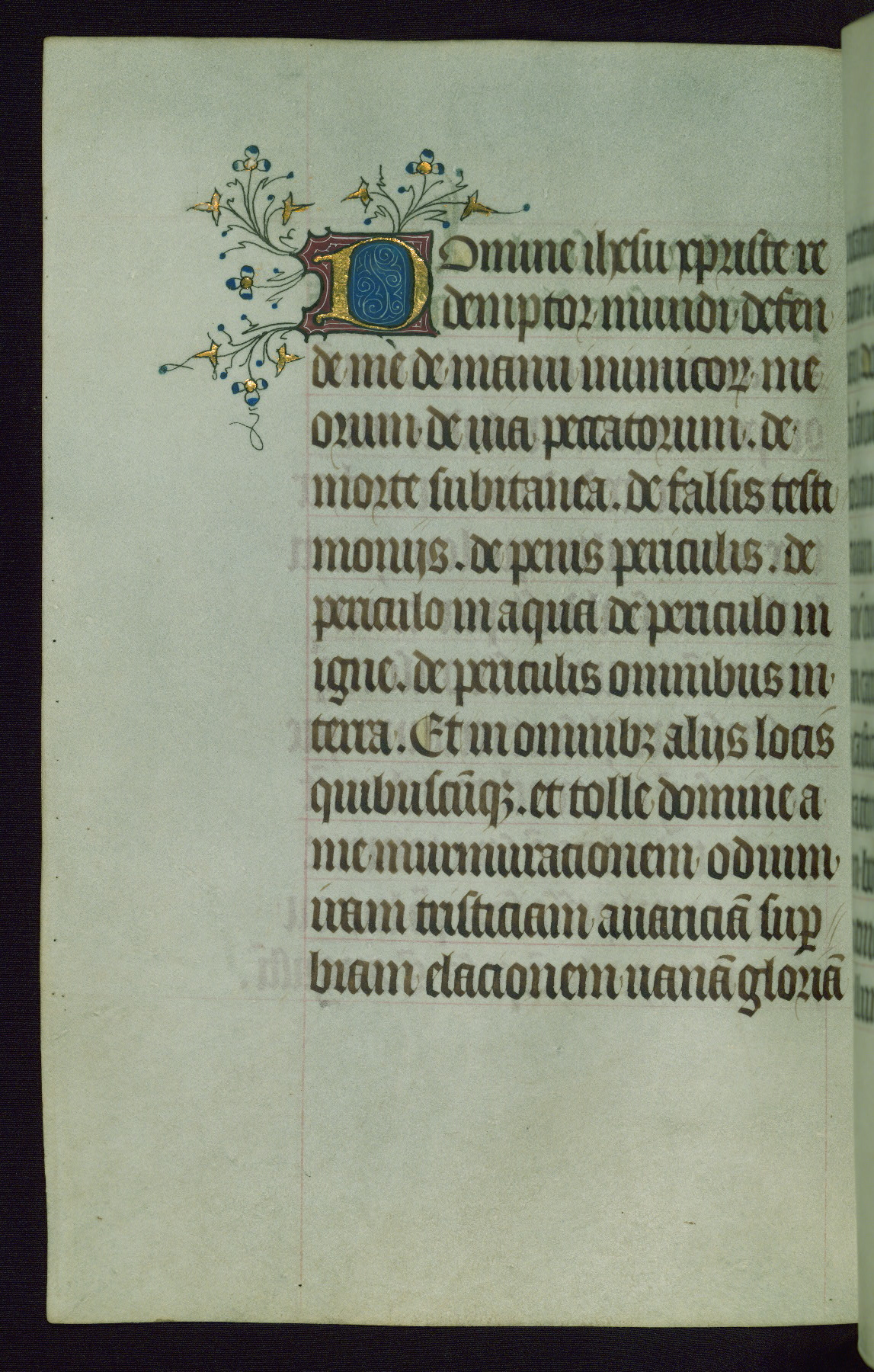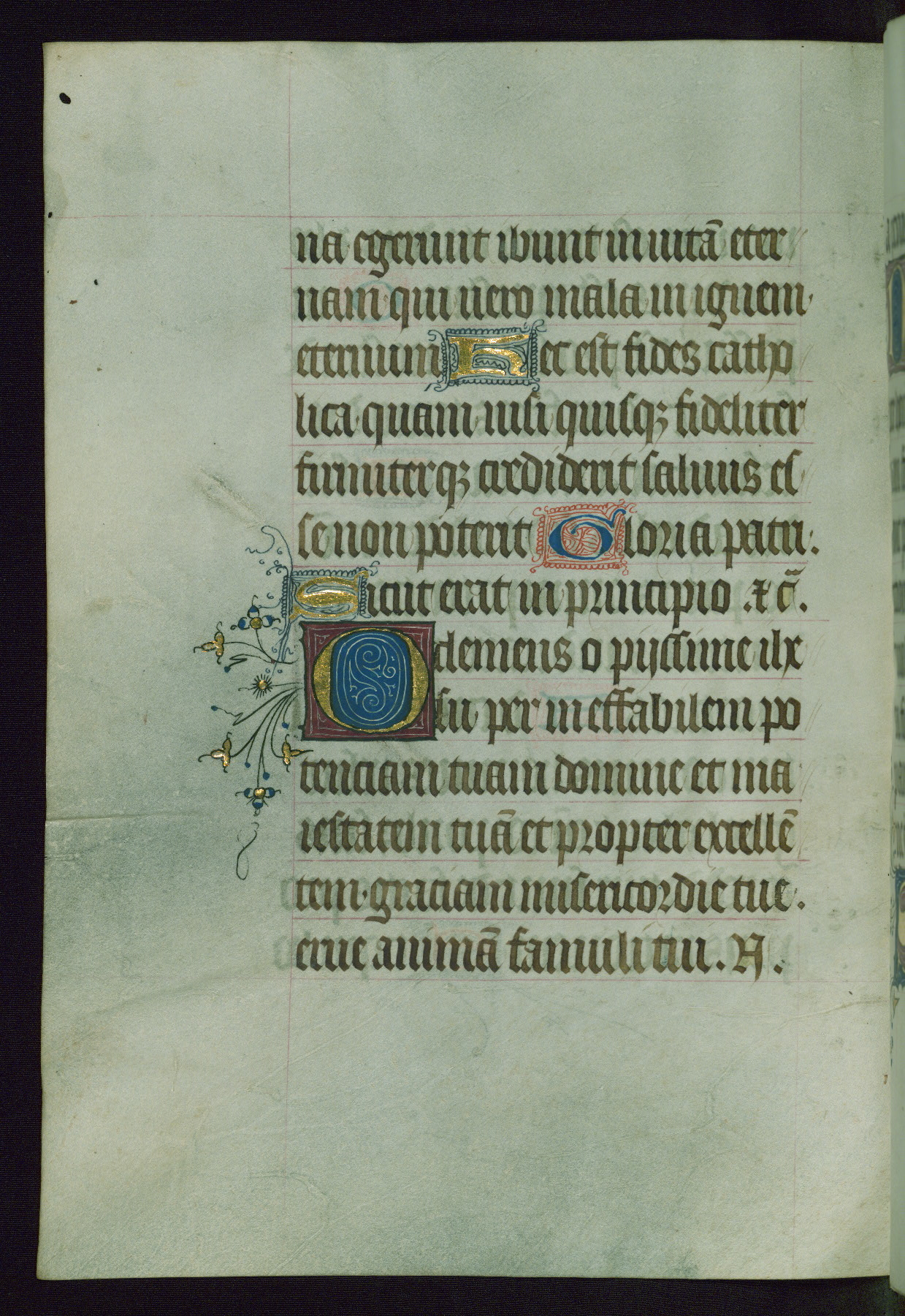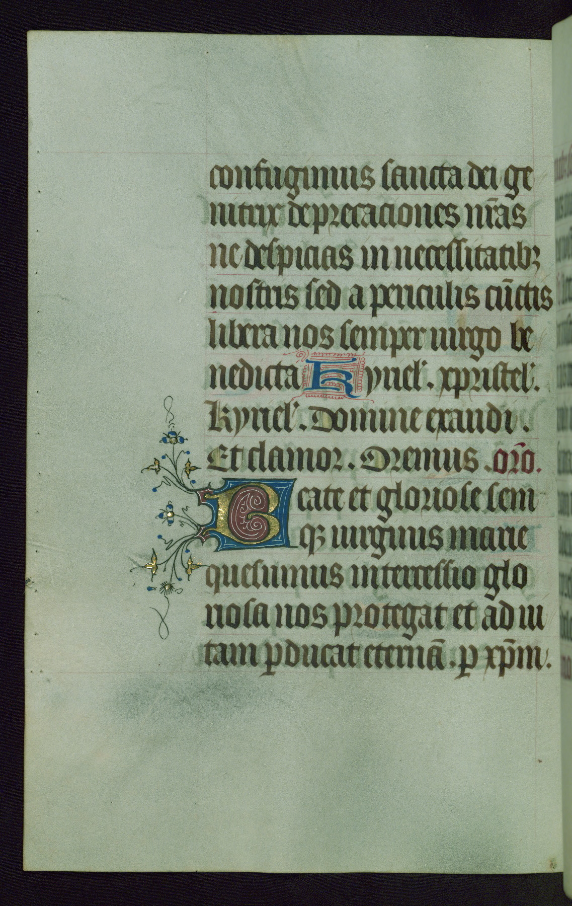 This Book of Hours, ca. 1460, was completed for use of Rome and illuminated under the influence, if not the direct participation, of Willem Vrelant. There remain twenty-two extant marginal calendar illustrations, thirteen extant full-page miniatures (many of which are paired with opening suffrages, perhaps suggesting a certain amount of significance to the owner), and one historiated initial. The contemporary binding, signed Livinus Stuaert, is dated 1477 and is most likely of Bruges or Ghent origin. It is thought that the first owner was French due to the French headings throughout and prominent fleur-de-lis figurations decorating the binding. Further, the first owner was likely female, suggested by the ways in which the book was structured to facilitate legibility. This is evinced by the large size of the script and the lack of abbreviations. While much of the text is standard, there remains evidence of personal significance and preference. This is seen in the chosen illuminations for those sections that are most significant to the owner. Most illuminations are paired with the opening page of staple Hours; however, many are accompanied by individual suffrages, constituting a large portion of the beginning of the manuscript. Personal preference is also shown in those sections of text that stray from the standard. The devotional sequence of this manuscript is notable for its sheer length and diversity of prayers as well as its inclusion of a French prayer not of official liturgy (fols. 215r-219v). The first collection of three prayers is headed and written in French. The prayer is attributed to St. Augustine and is described to guarantee a transformation of tribulation into joy through Christ's mercy, but only if the suppliant recites the prayer for thirty consecutive days. While it is not uncommon for evidence of an owner's predilections to surface in a Book of Hours, the particularly divergent features of this book allow readers to glean an intimate view of the patron.