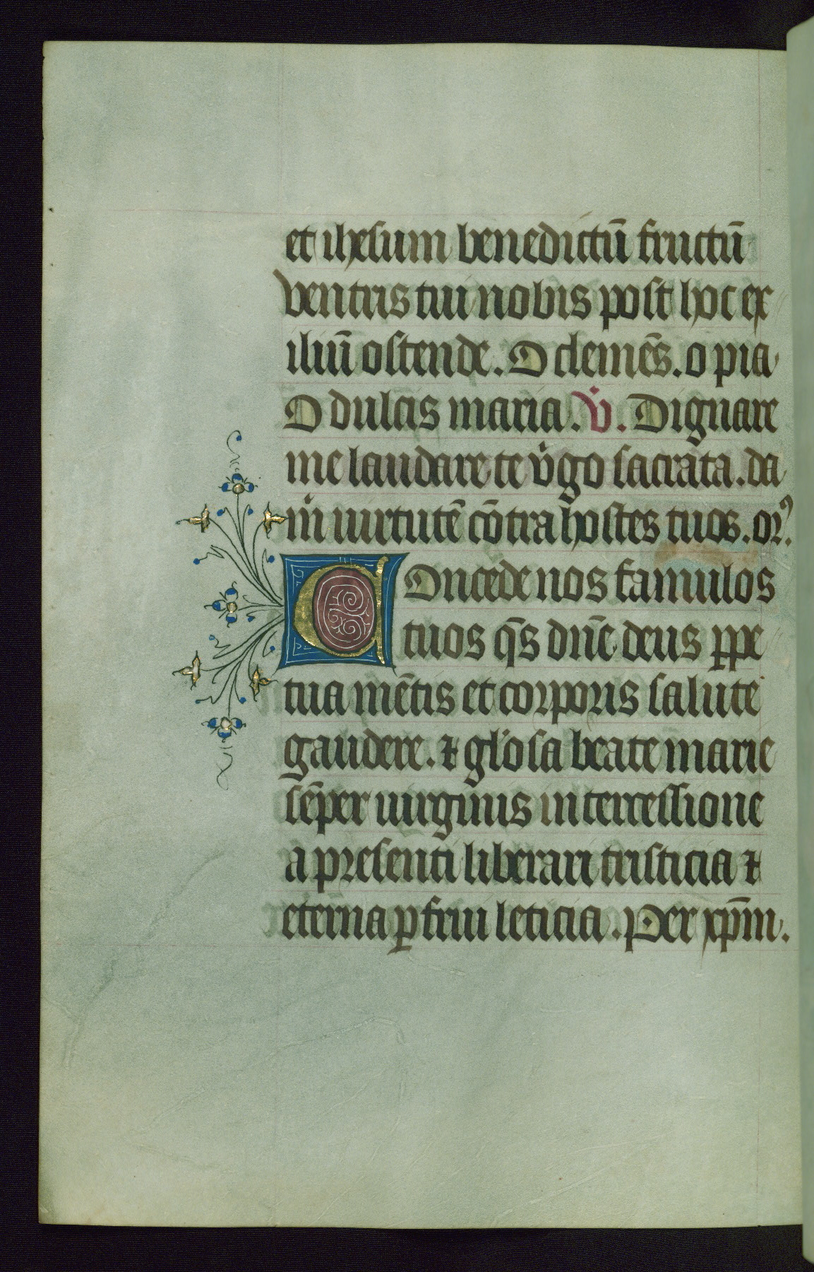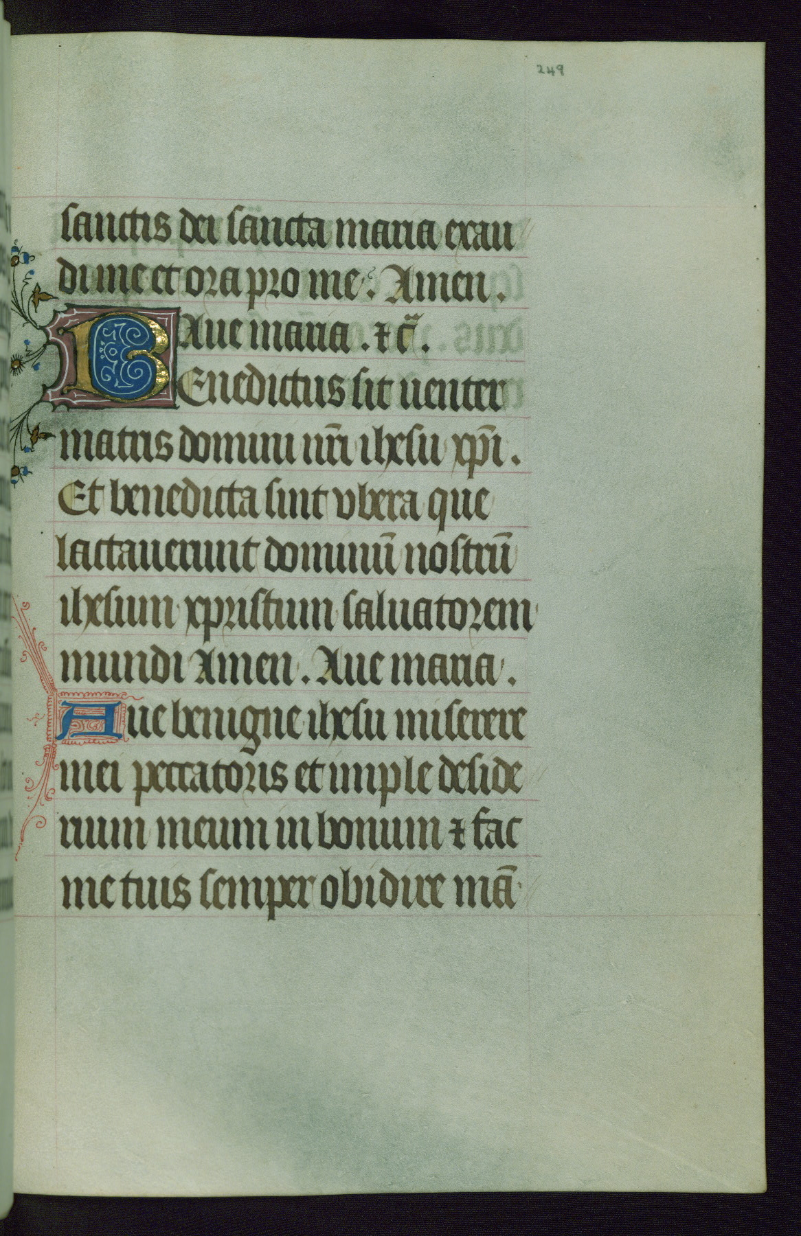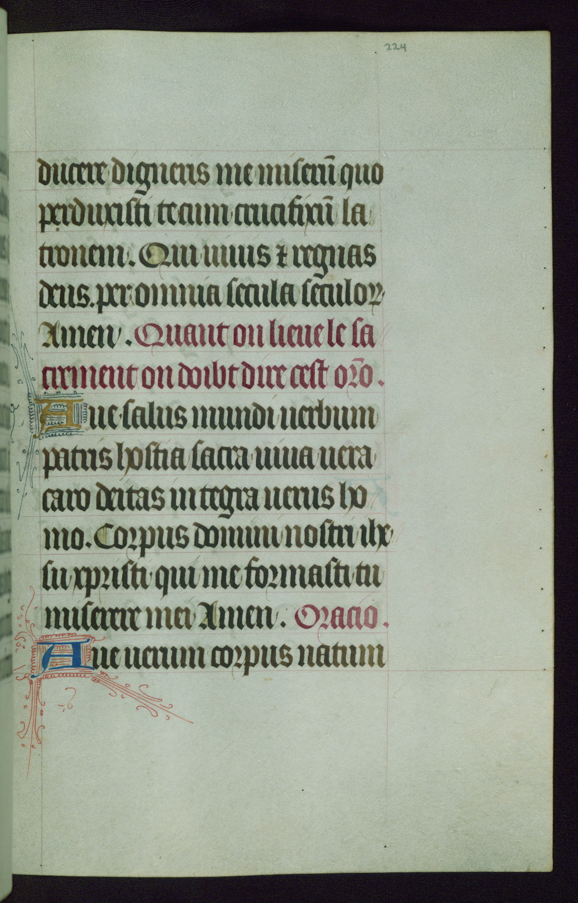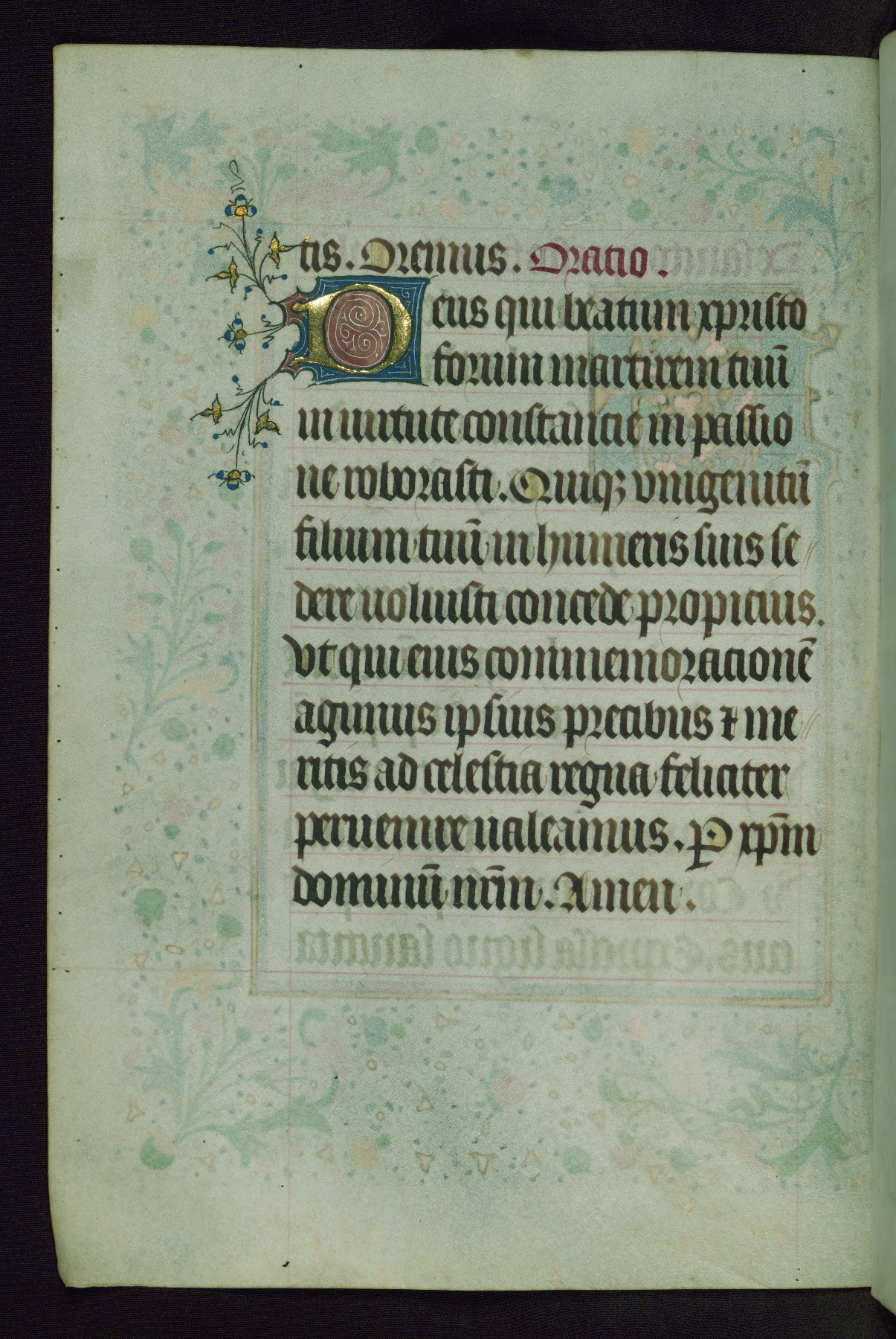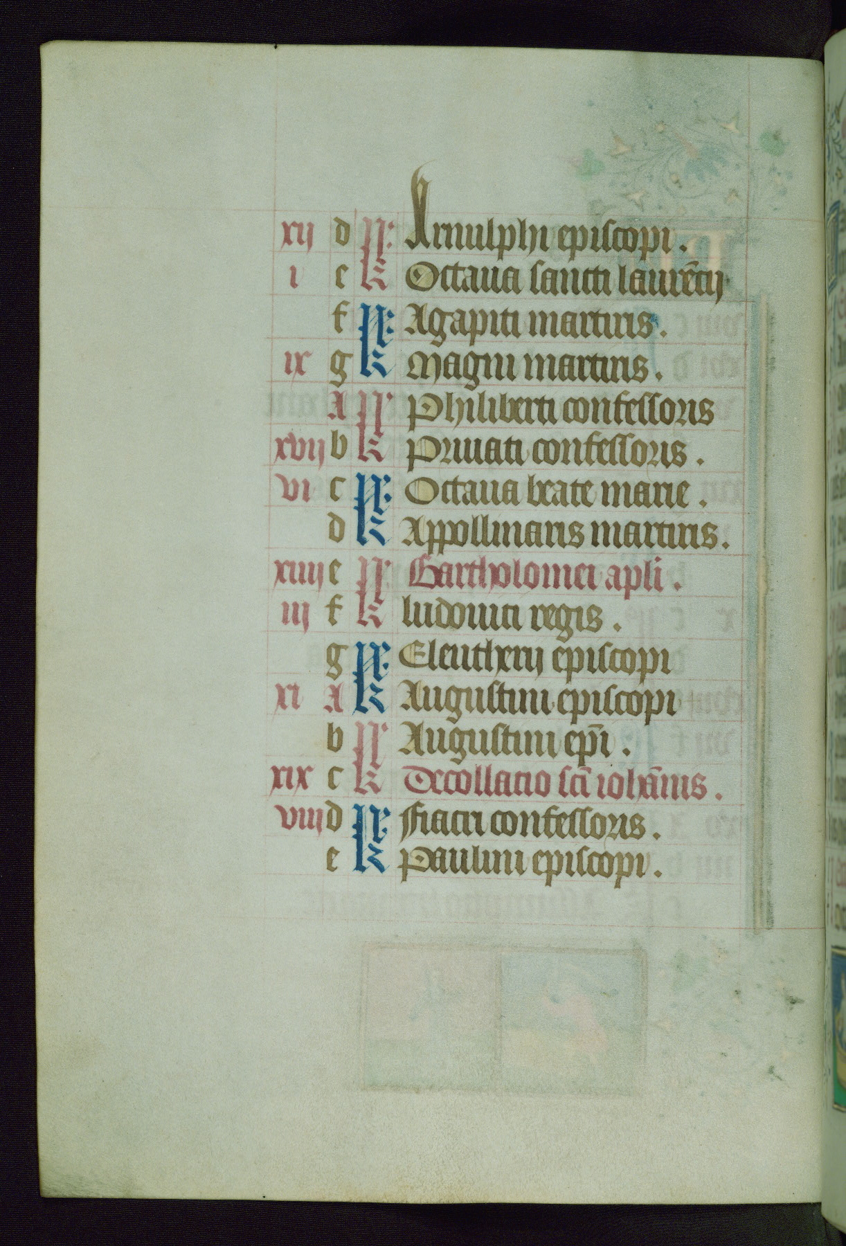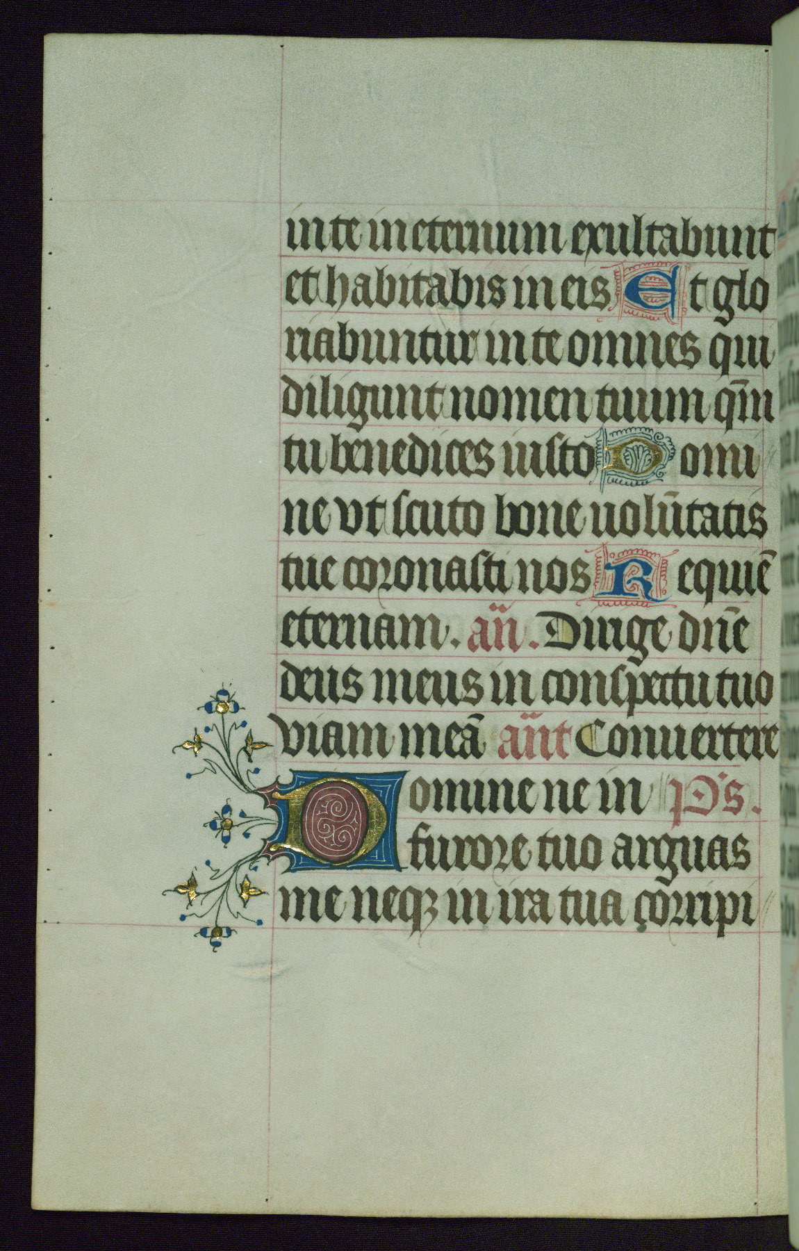 This Book of Hours, ca. 1460, was completed for use of Rome and illuminated under the influence, if not the direct participation, of Willem Vrelant. There remain twenty-two extant marginal calendar illustrations, thirteen extant full-page miniatures (many of which are paired with opening suffrages, perhaps suggesting a certain amount of significance to the owner), and one historiated initial. The contemporary binding, signed Livinus Stuaert, is dated 1477 and is most likely of Bruges or Ghent origin. It is thought that the first owner was French due to the French headings throughout and prominent fleur-de-lis figurations decorating the binding. Further, the first owner was likely female, suggested by the ways in which the book was structured to facilitate legibility. This is evinced by the large size of the script and the lack of abbreviations. While much of the text is standard, there remains evidence of personal significance and preference. This is seen in the chosen illuminations for those sections that are most significant to the owner. Most illuminations are paired with the opening page of staple Hours; however, many are accompanied by individual suffrages, constituting a large portion of the beginning of the manuscript. Personal preference is also shown in those sections of text that stray from the standard. The devotional sequence of this manuscript is notable for its sheer length and diversity of prayers as well as its inclusion of a French prayer not of official liturgy (fols. 215r-219v). The first collection of three prayers is headed and written in French. The prayer is attributed to St. Augustine and is described to guarantee a transformation of tribulation into joy through Christ's mercy, but only if the suppliant recites the prayer for thirty consecutive days. While it is not uncommon for evidence of an owner's predilections to surface in a Book of Hours, the particularly divergent features of this book allow readers to glean an intimate view of the patron.