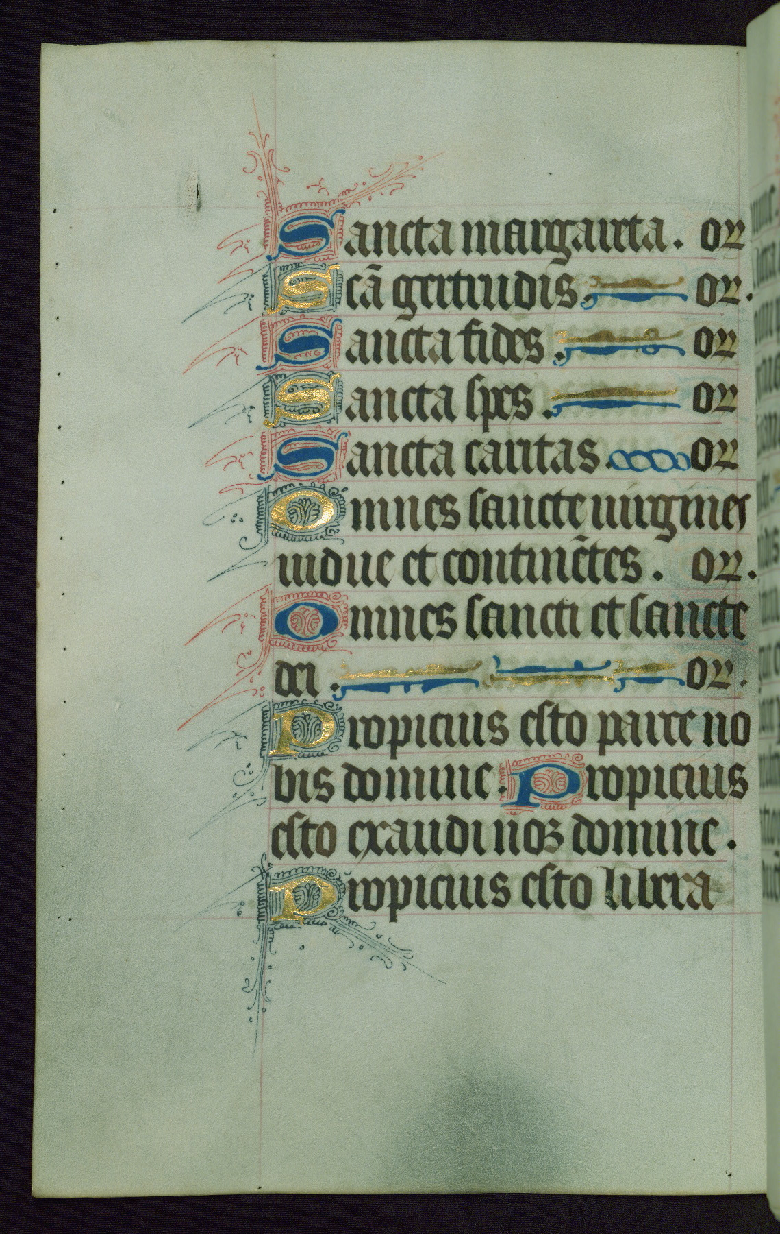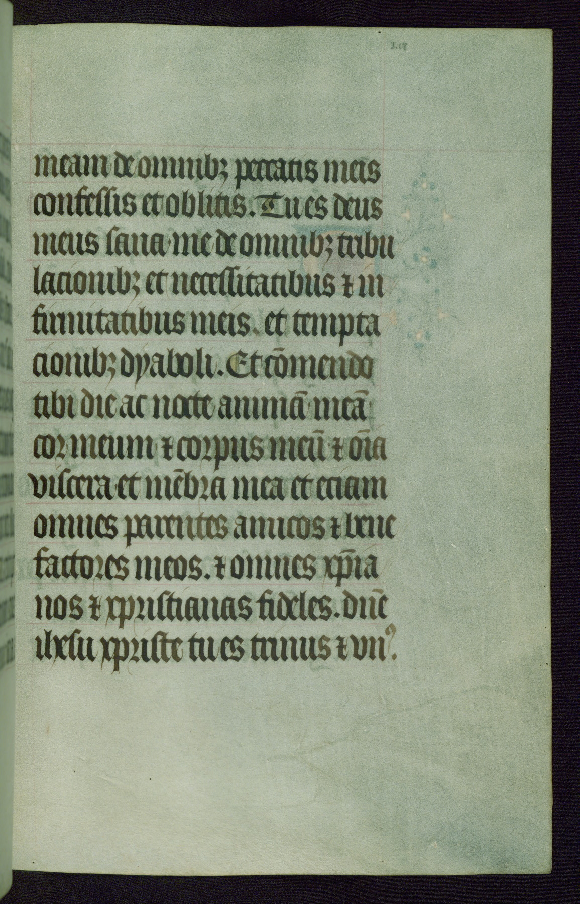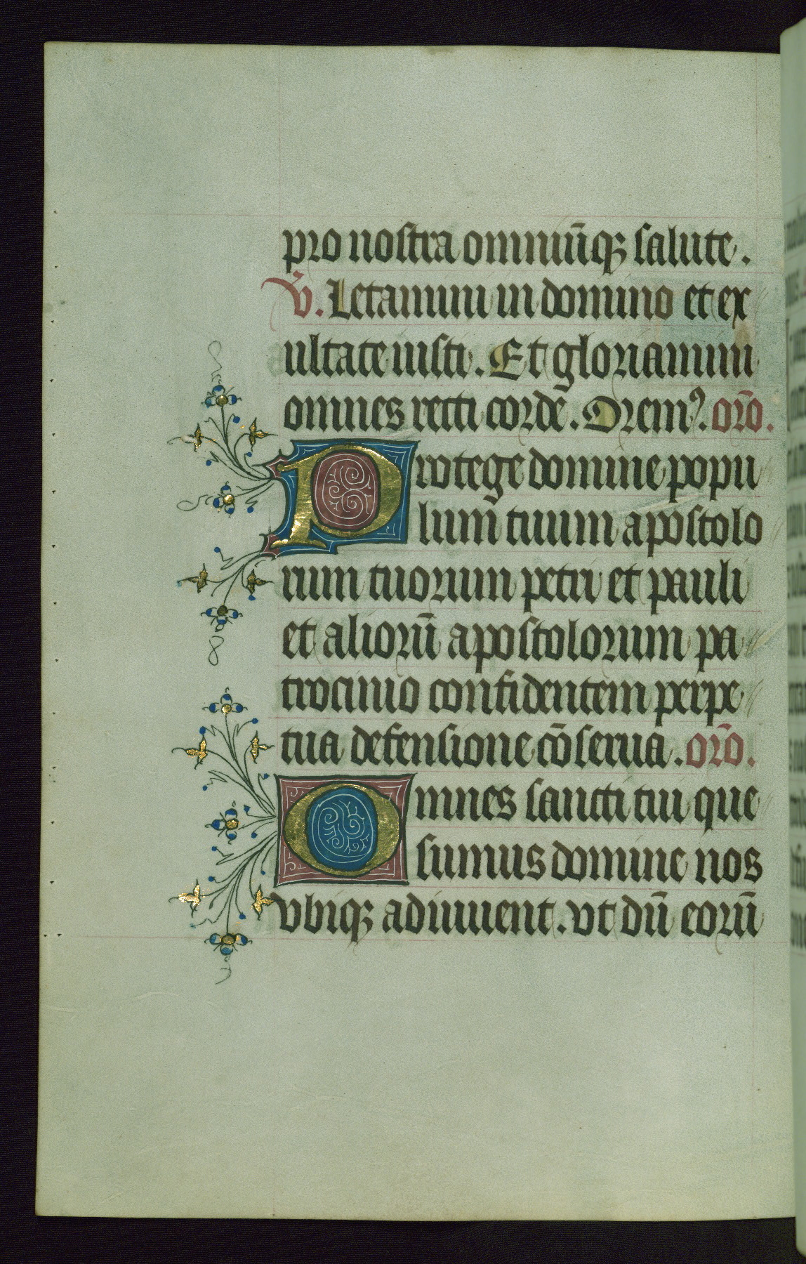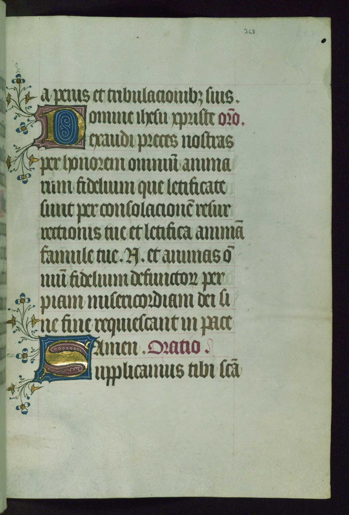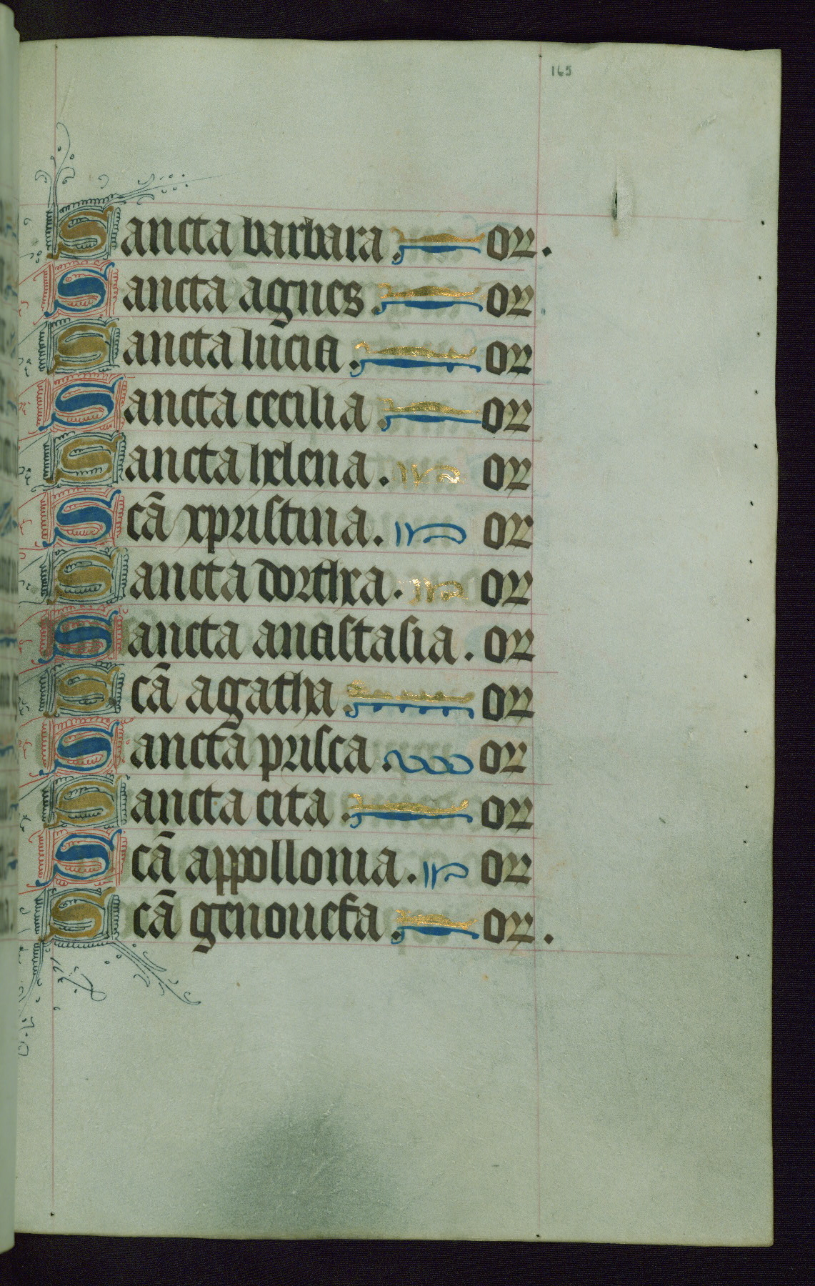 This Book of Hours, ca. 1460, was completed for use of Rome and illuminated under the influence, if not the direct participation, of Willem Vrelant. There remain twenty-two extant marginal calendar illustrations, thirteen extant full-page miniatures (many of which are paired with opening suffrages, perhaps suggesting a certain amount of significance to the owner), and one historiated initial. The contemporary binding, signed Livinus Stuaert, is dated 1477 and is most likely of Bruges or Ghent origin. It is thought that the first owner was French due to the French headings throughout and prominent fleur-de-lis figurations decorating the binding. Further, the first owner was likely female, suggested by the ways in which the book was structured to facilitate legibility. This is evinced by the large size of the script and the lack of abbreviations. While much of the text is standard, there remains evidence of personal significance and preference. This is seen in the chosen illuminations for those sections that are most significant to the owner. Most illuminations are paired with the opening page of staple Hours; however, many are accompanied by individual suffrages, constituting a large portion of the beginning of the manuscript. Personal preference is also shown in those sections of text that stray from the standard. The devotional sequence of this manuscript is notable for its sheer length and diversity of prayers as well as its inclusion of a French prayer not of official liturgy (fols. 215r-219v). The first collection of three prayers is headed and written in French. The prayer is attributed to St. Augustine and is described to guarantee a transformation of tribulation into joy through Christ's mercy, but only if the suppliant recites the prayer for thirty consecutive days. While it is not uncommon for evidence of an owner's predilections to surface in a Book of Hours, the particularly divergent features of this book allow readers to glean an intimate view of the patron.