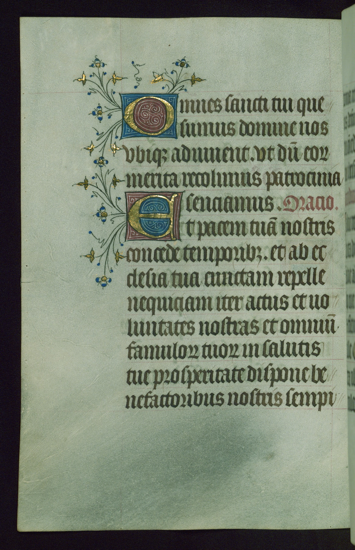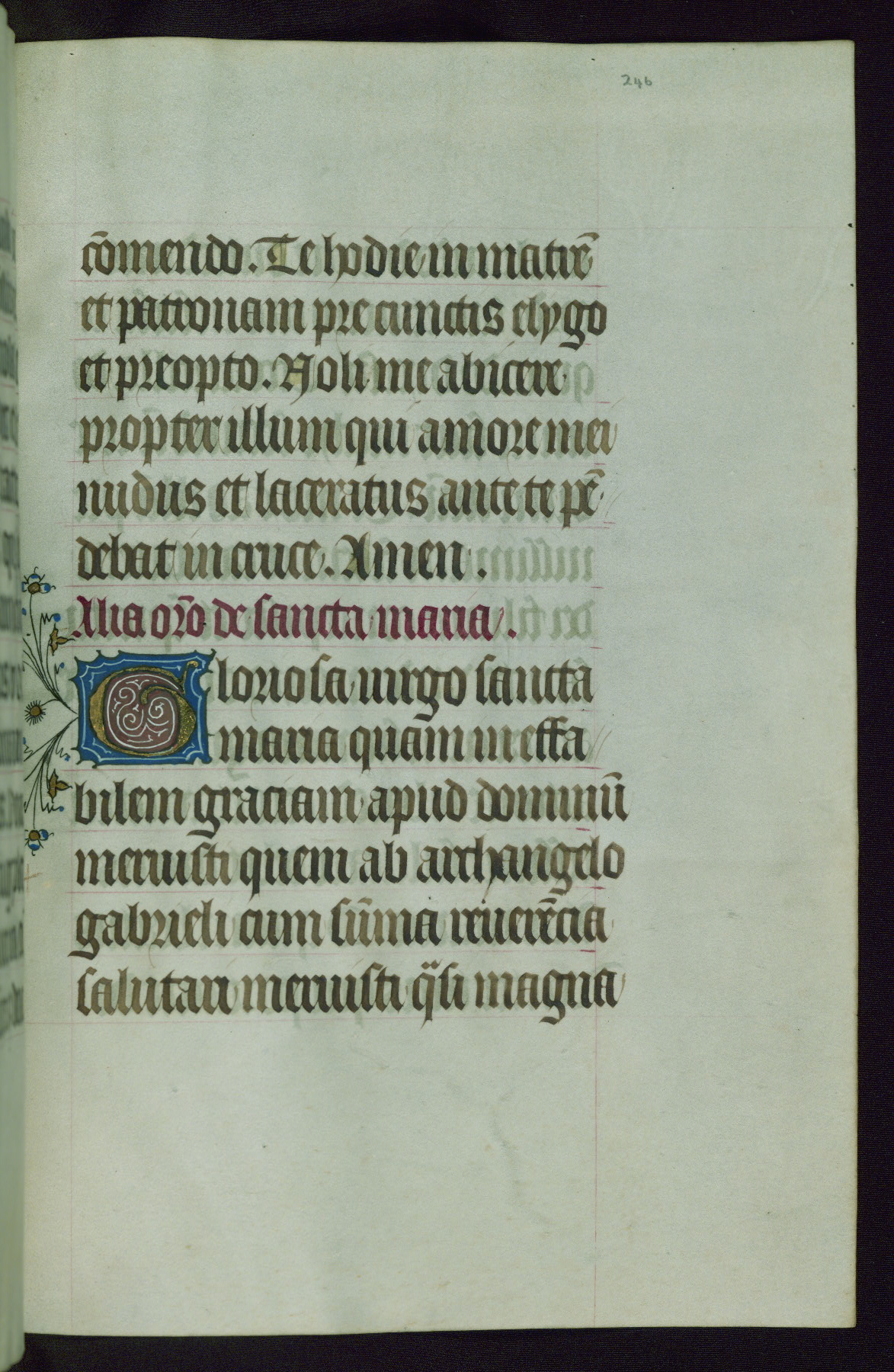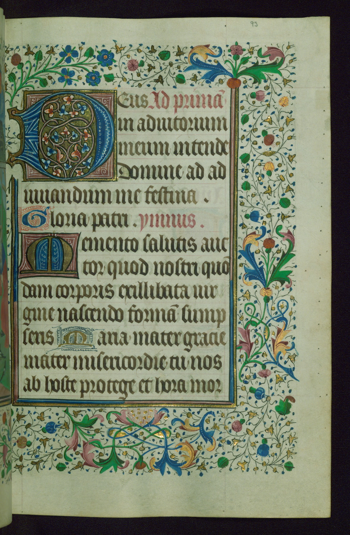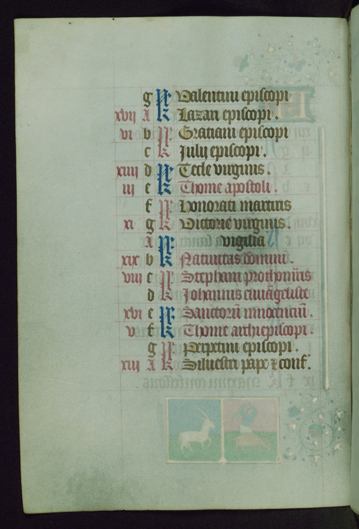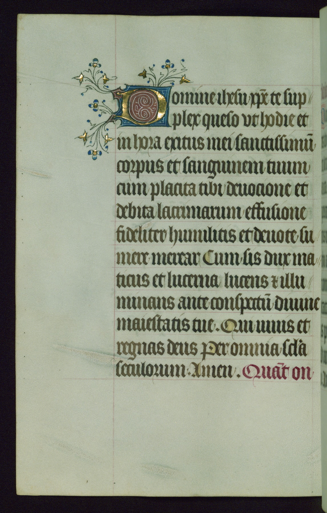 This Book of Hours, ca. 1460, was completed for use of Rome and illuminated under the influence, if not the direct participation, of Willem Vrelant. There remain twenty-two extant marginal calendar illustrations, thirteen extant full-page miniatures (many of which are paired with opening suffrages, perhaps suggesting a certain amount of significance to the owner), and one historiated initial. The contemporary binding, signed Livinus Stuaert, is dated 1477 and is most likely of Bruges or Ghent origin. It is thought that the first owner was French due to the French headings throughout and prominent fleur-de-lis figurations decorating the binding. Further, the first owner was likely female, suggested by the ways in which the book was structured to facilitate legibility. This is evinced by the large size of the script and the lack of abbreviations. While much of the text is standard, there remains evidence of personal significance and preference. This is seen in the chosen illuminations for those sections that are most significant to the owner. Most illuminations are paired with the opening page of staple Hours; however, many are accompanied by individual suffrages, constituting a large portion of the beginning of the manuscript. Personal preference is also shown in those sections of text that stray from the standard. The devotional sequence of this manuscript is notable for its sheer length and diversity of prayers as well as its inclusion of a French prayer not of official liturgy (fols. 215r-219v). The first collection of three prayers is headed and written in French. The prayer is attributed to St. Augustine and is described to guarantee a transformation of tribulation into joy through Christ's mercy, but only if the suppliant recites the prayer for thirty consecutive days. While it is not uncommon for evidence of an owner's predilections to surface in a Book of Hours, the particularly divergent features of this book allow readers to glean an intimate view of the patron.