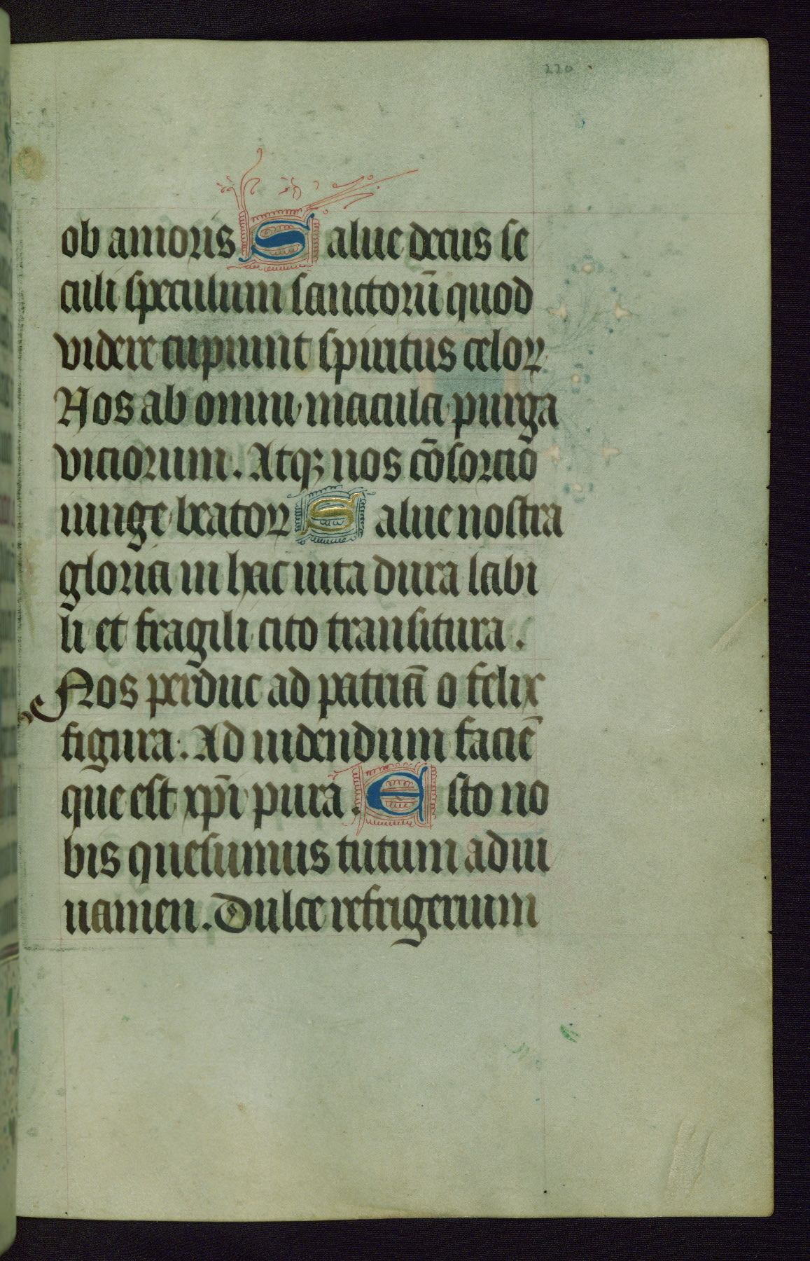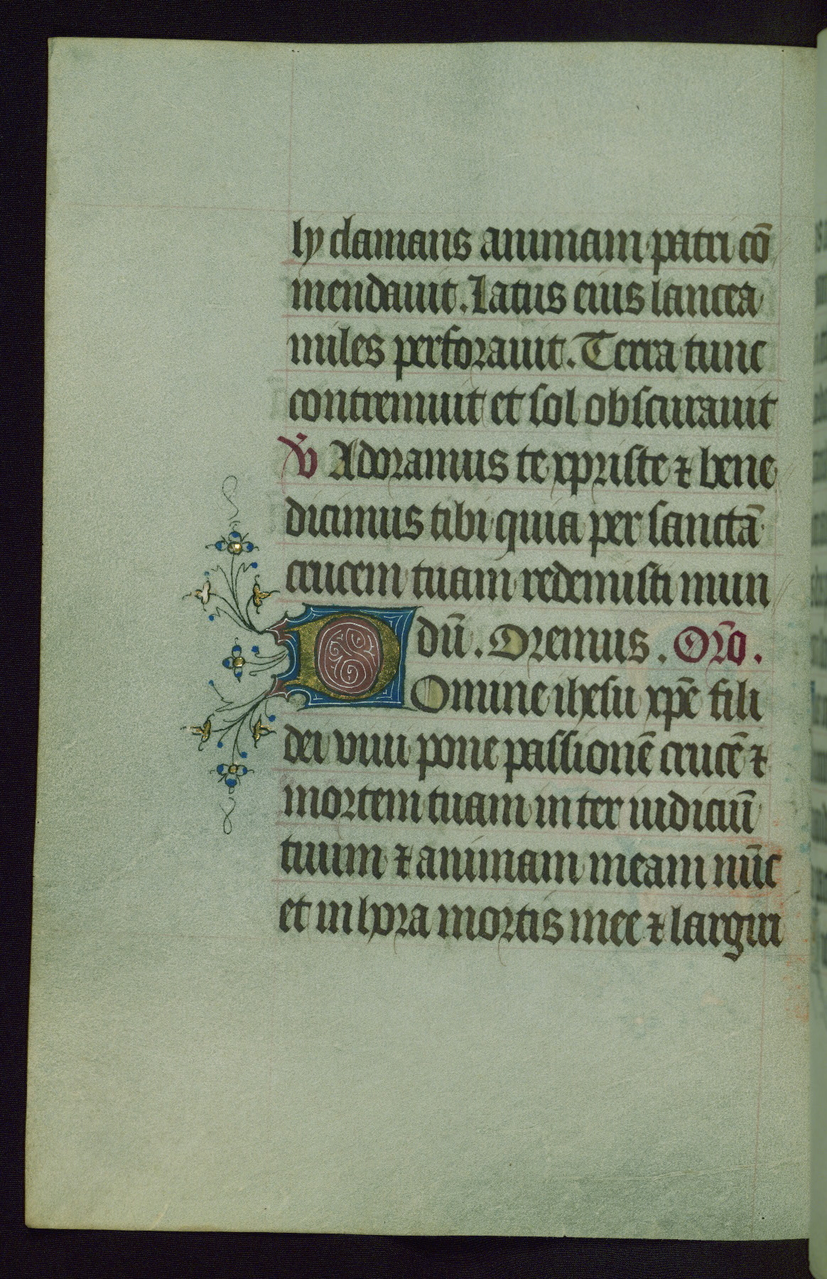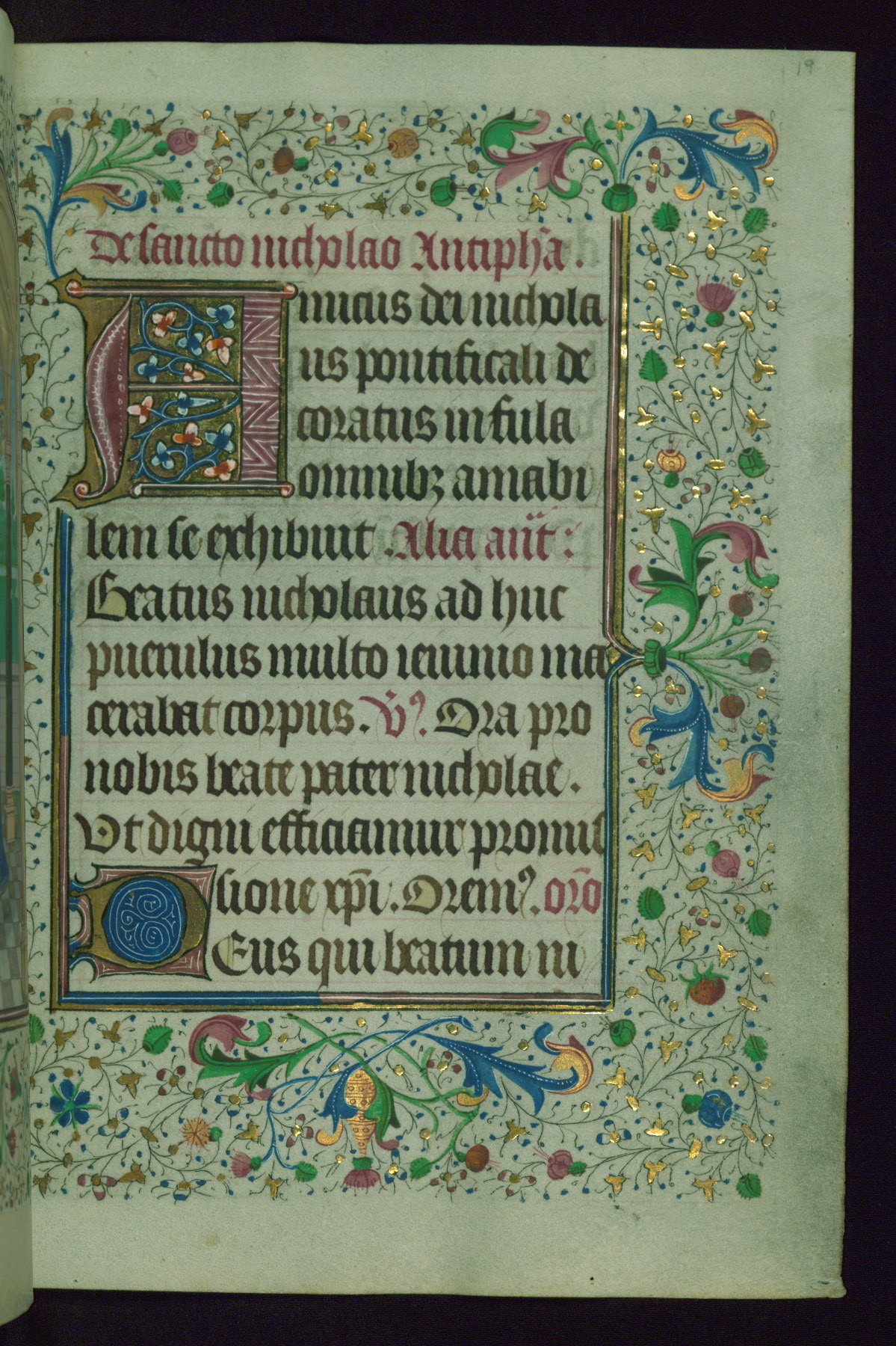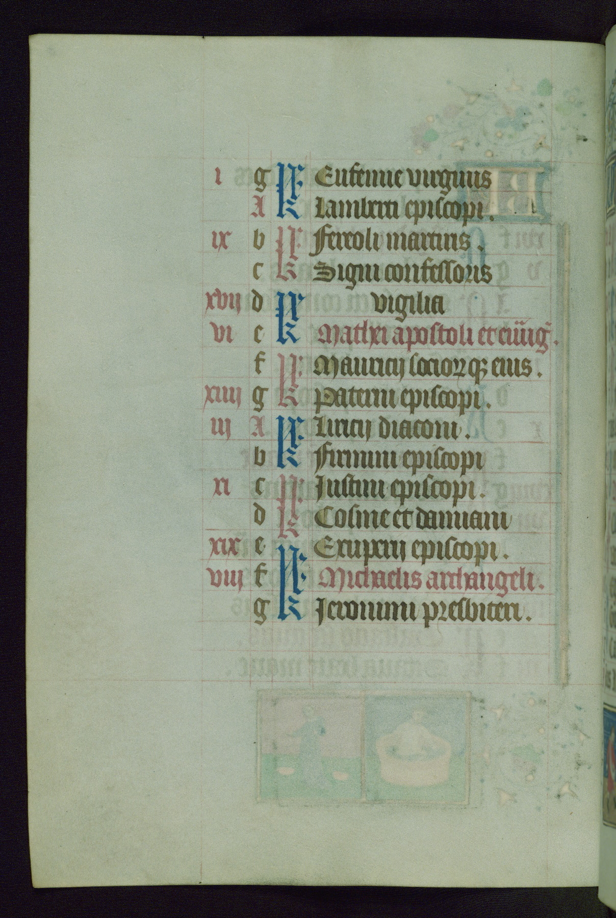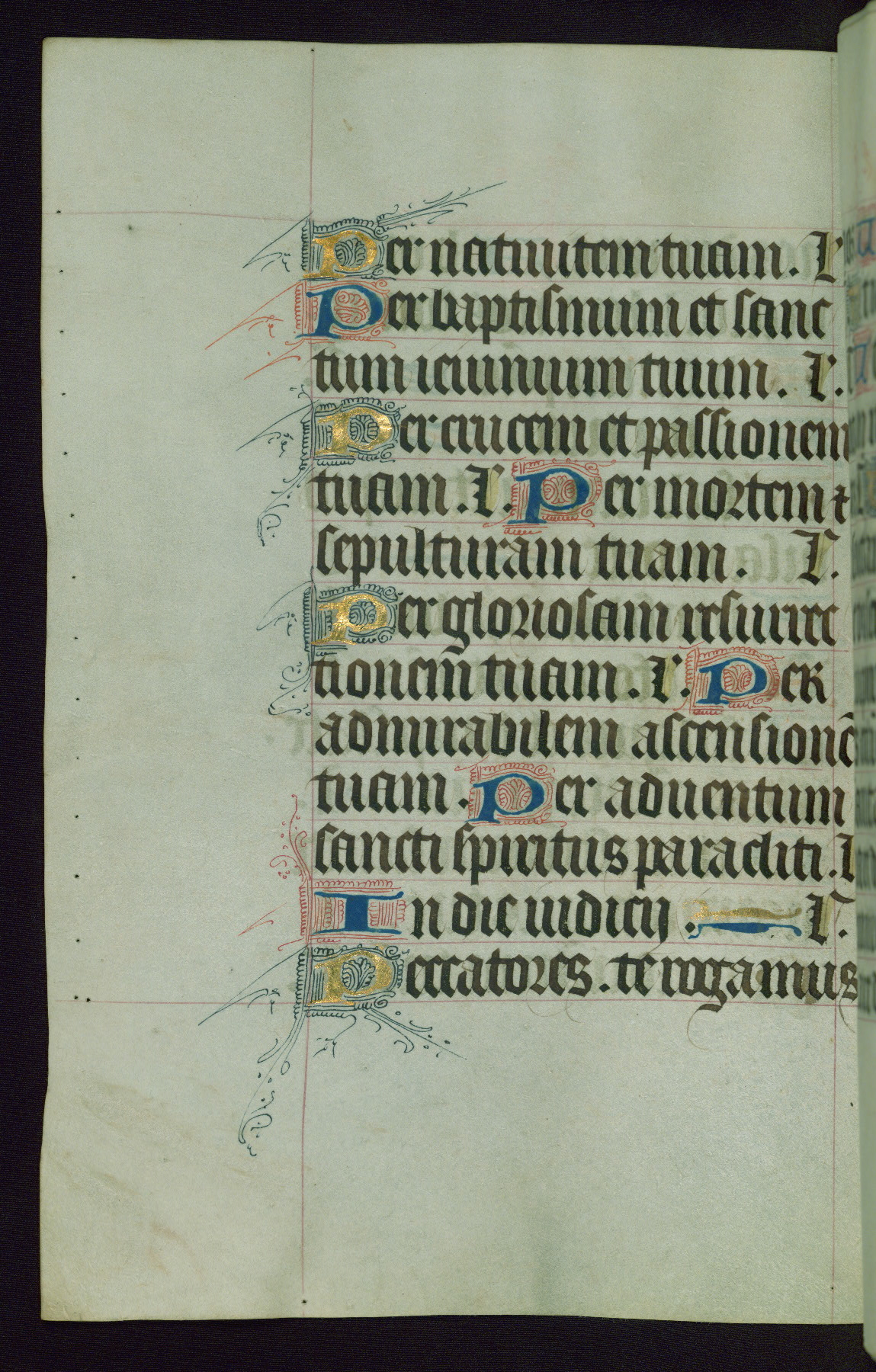 This Book of Hours, ca. 1460, was completed for use of Rome and illuminated under the influence, if not the direct participation, of Willem Vrelant. There remain twenty-two extant marginal calendar illustrations, thirteen extant full-page miniatures (many of which are paired with opening suffrages, perhaps suggesting a certain amount of significance to the owner), and one historiated initial. The contemporary binding, signed Livinus Stuaert, is dated 1477 and is most likely of Bruges or Ghent origin. It is thought that the first owner was French due to the French headings throughout and prominent fleur-de-lis figurations decorating the binding. Further, the first owner was likely female, suggested by the ways in which the book was structured to facilitate legibility. This is evinced by the large size of the script and the lack of abbreviations. While much of the text is standard, there remains evidence of personal significance and preference. This is seen in the chosen illuminations for those sections that are most significant to the owner. Most illuminations are paired with the opening page of staple Hours; however, many are accompanied by individual suffrages, constituting a large portion of the beginning of the manuscript. Personal preference is also shown in those sections of text that stray from the standard. The devotional sequence of this manuscript is notable for its sheer length and diversity of prayers as well as its inclusion of a French prayer not of official liturgy (fols. 215r-219v). The first collection of three prayers is headed and written in French. The prayer is attributed to St. Augustine and is described to guarantee a transformation of tribulation into joy through Christ's mercy, but only if the suppliant recites the prayer for thirty consecutive days. While it is not uncommon for evidence of an owner's predilections to surface in a Book of Hours, the particularly divergent features of this book allow readers to glean an intimate view of the patron.