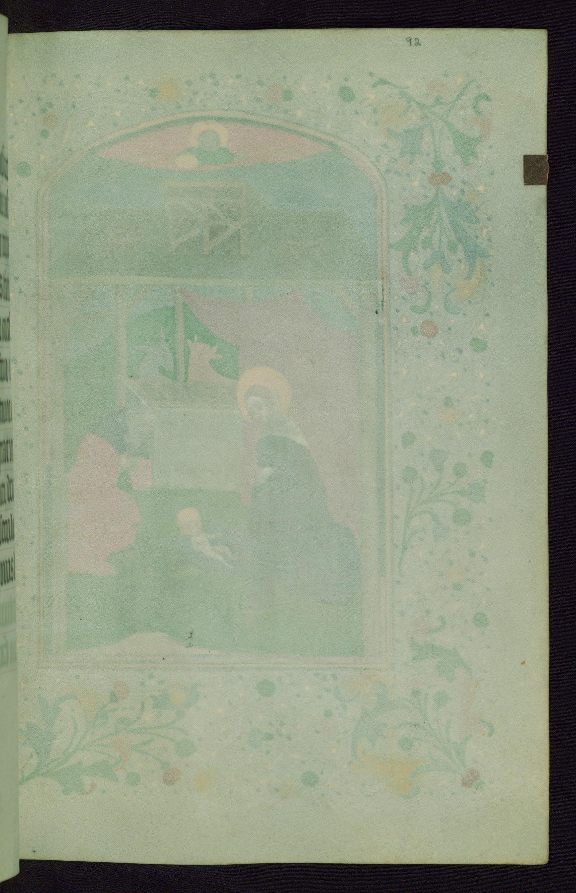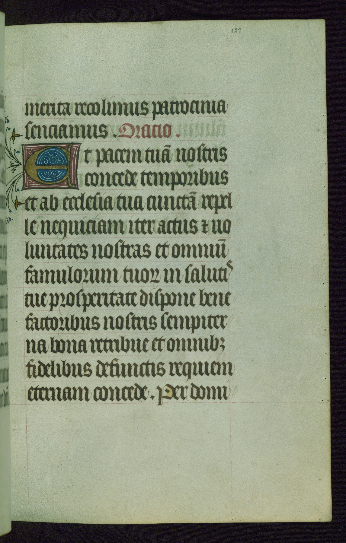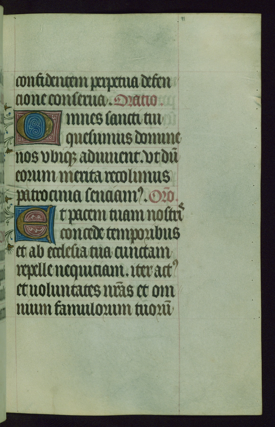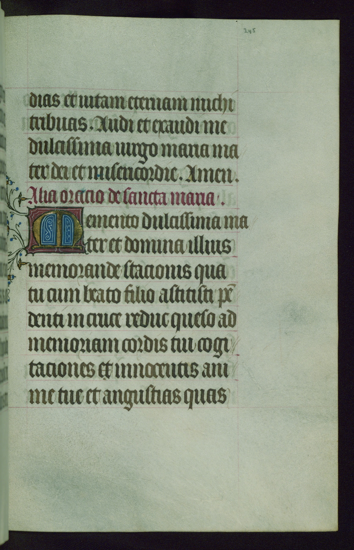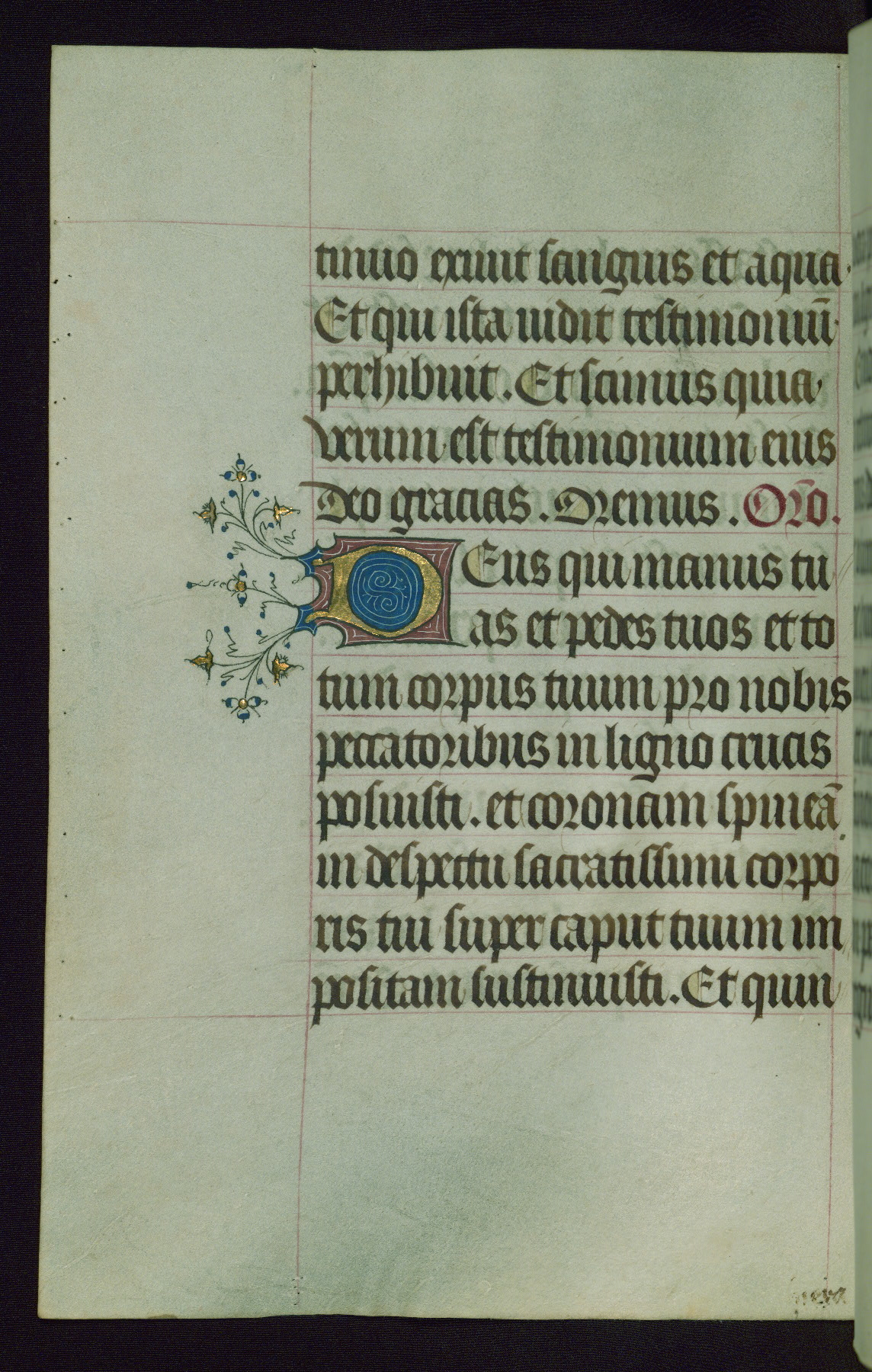 This Book of Hours, ca. 1460, was completed for use of Rome and illuminated under the influence, if not the direct participation, of Willem Vrelant. There remain twenty-two extant marginal calendar illustrations, thirteen extant full-page miniatures (many of which are paired with opening suffrages, perhaps suggesting a certain amount of significance to the owner), and one historiated initial. The contemporary binding, signed Livinus Stuaert, is dated 1477 and is most likely of Bruges or Ghent origin. It is thought that the first owner was French due to the French headings throughout and prominent fleur-de-lis figurations decorating the binding. Further, the first owner was likely female, suggested by the ways in which the book was structured to facilitate legibility. This is evinced by the large size of the script and the lack of abbreviations. While much of the text is standard, there remains evidence of personal significance and preference. This is seen in the chosen illuminations for those sections that are most significant to the owner. Most illuminations are paired with the opening page of staple Hours; however, many are accompanied by individual suffrages, constituting a large portion of the beginning of the manuscript. Personal preference is also shown in those sections of text that stray from the standard. The devotional sequence of this manuscript is notable for its sheer length and diversity of prayers as well as its inclusion of a French prayer not of official liturgy (fols. 215r-219v). The first collection of three prayers is headed and written in French. The prayer is attributed to St. Augustine and is described to guarantee a transformation of tribulation into joy through Christ's mercy, but only if the suppliant recites the prayer for thirty consecutive days. While it is not uncommon for evidence of an owner's predilections to surface in a Book of Hours, the particularly divergent features of this book allow readers to glean an intimate view of the patron.