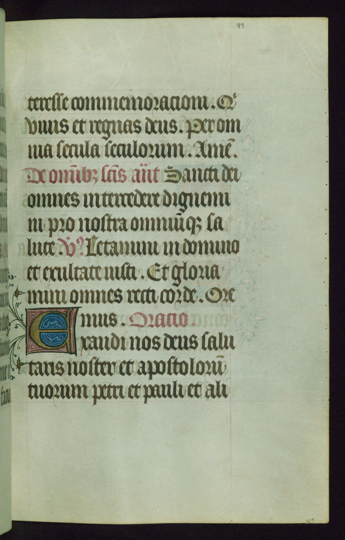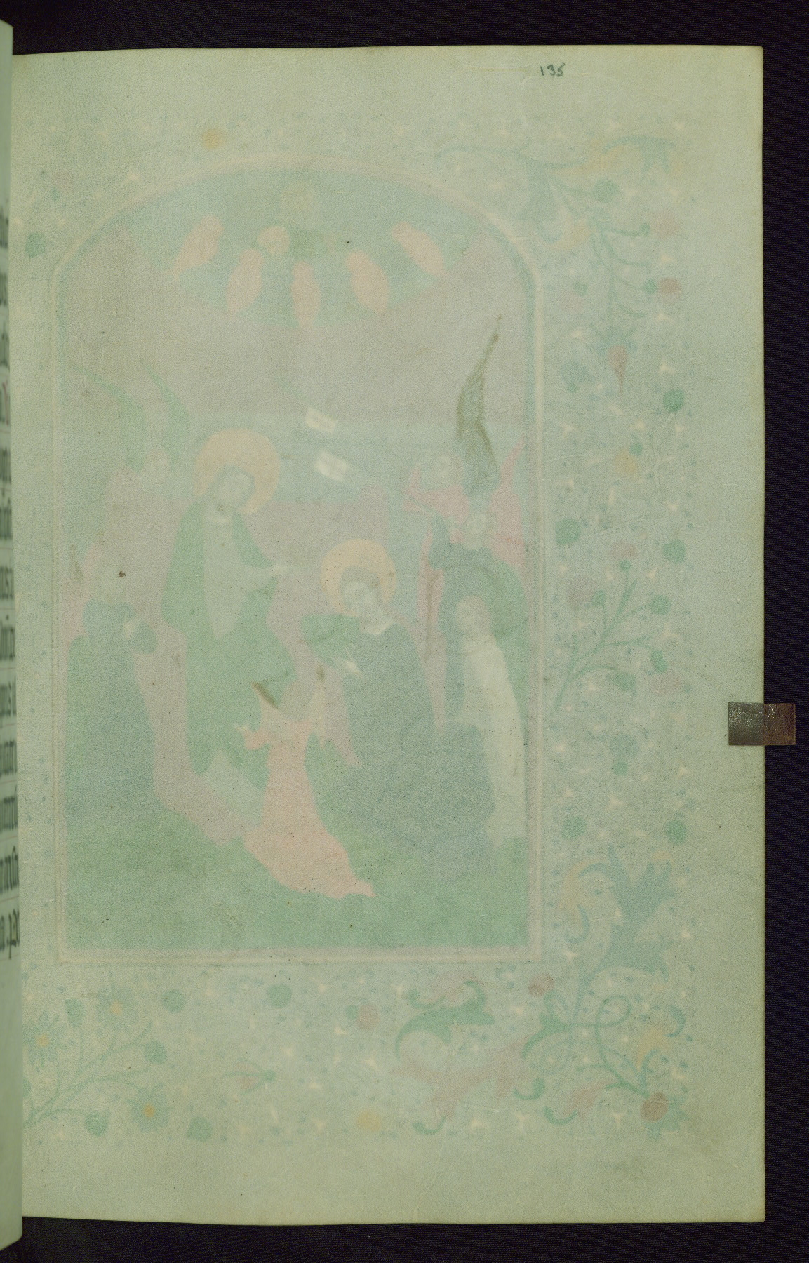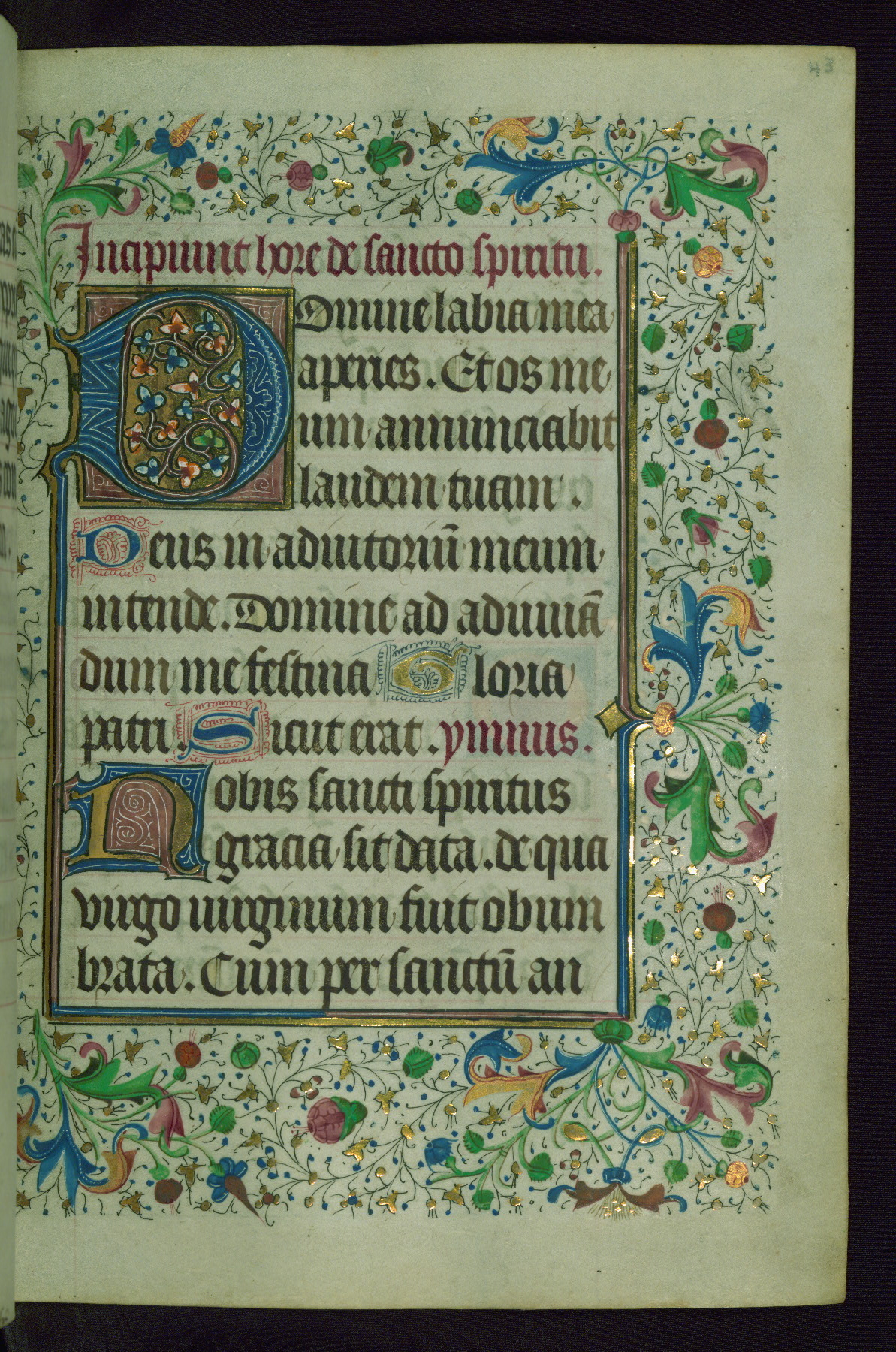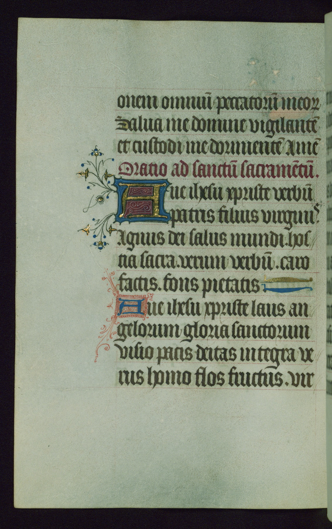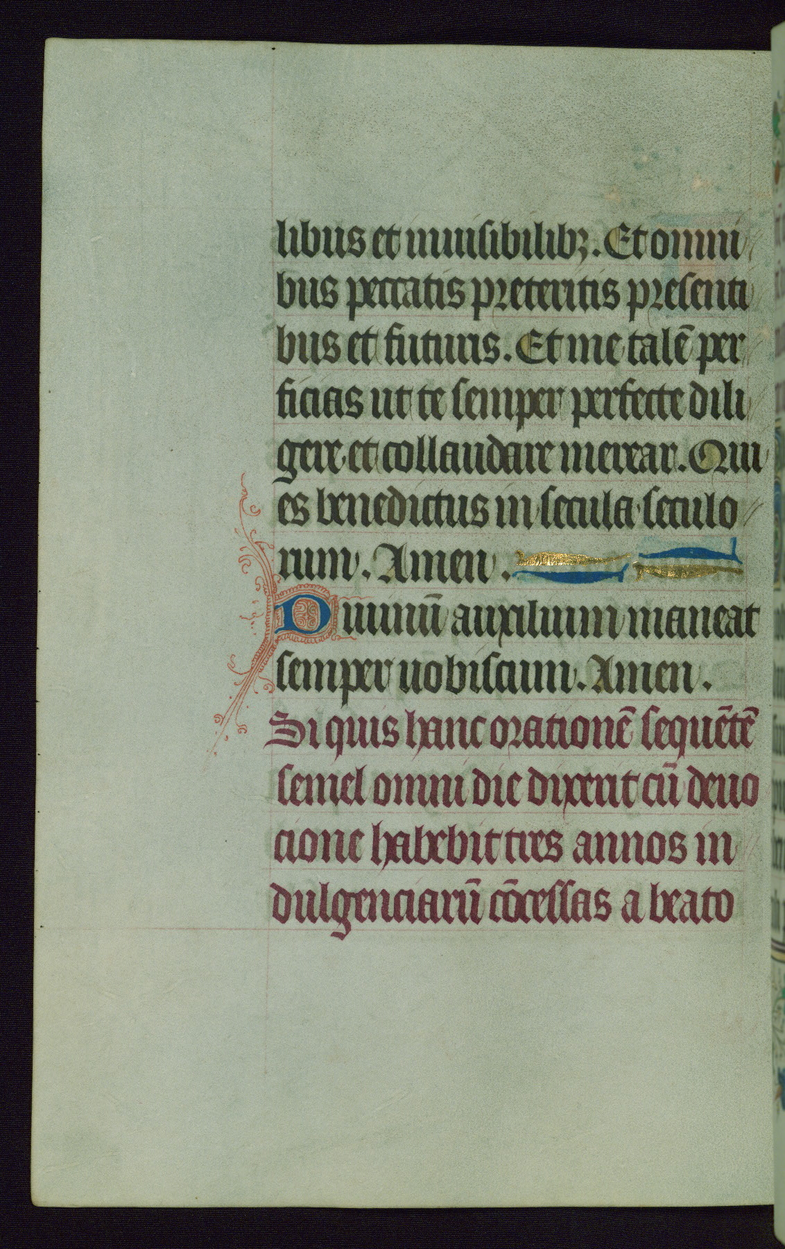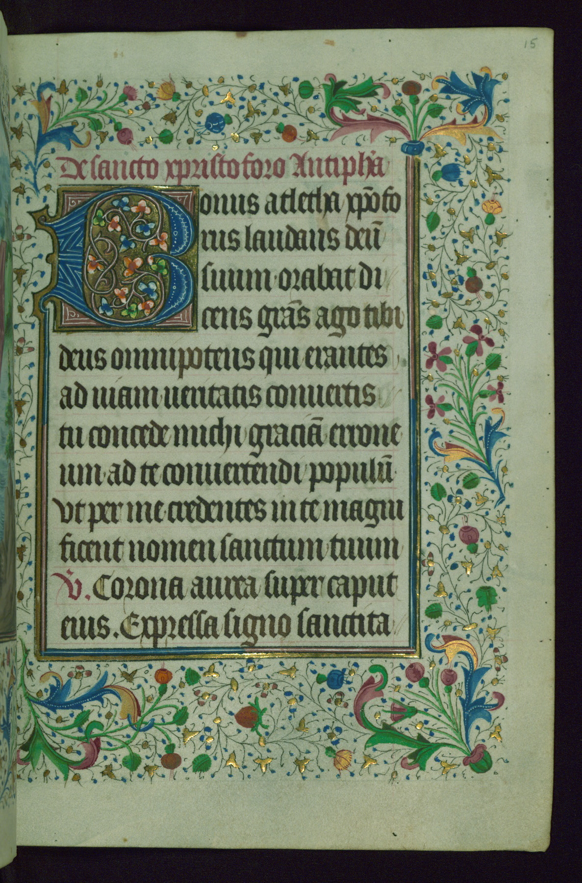 This Book of Hours, ca. 1460, was completed for use of Rome and illuminated under the influence, if not the direct participation, of Willem Vrelant. There remain twenty-two extant marginal calendar illustrations, thirteen extant full-page miniatures (many of which are paired with opening suffrages, perhaps suggesting a certain amount of significance to the owner), and one historiated initial. The contemporary binding, signed Livinus Stuaert, is dated 1477 and is most likely of Bruges or Ghent origin. It is thought that the first owner was French due to the French headings throughout and prominent fleur-de-lis figurations decorating the binding. Further, the first owner was likely female, suggested by the ways in which the book was structured to facilitate legibility. This is evinced by the large size of the script and the lack of abbreviations. While much of the text is standard, there remains evidence of personal significance and preference. This is seen in the chosen illuminations for those sections that are most significant to the owner. Most illuminations are paired with the opening page of staple Hours; however, many are accompanied by individual suffrages, constituting a large portion of the beginning of the manuscript. Personal preference is also shown in those sections of text that stray from the standard. The devotional sequence of this manuscript is notable for its sheer length and diversity of prayers as well as its inclusion of a French prayer not of official liturgy (fols. 215r-219v). The first collection of three prayers is headed and written in French. The prayer is attributed to St. Augustine and is described to guarantee a transformation of tribulation into joy through Christ's mercy, but only if the suppliant recites the prayer for thirty consecutive days. While it is not uncommon for evidence of an owner's predilections to surface in a Book of Hours, the particularly divergent features of this book allow readers to glean an intimate view of the patron.