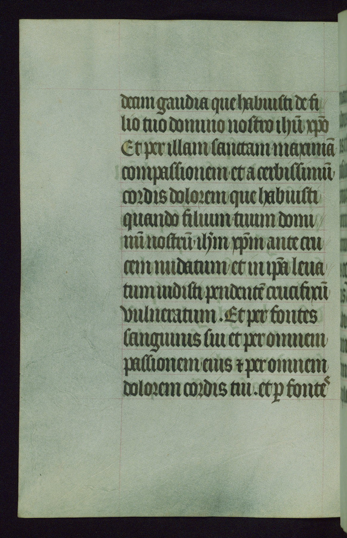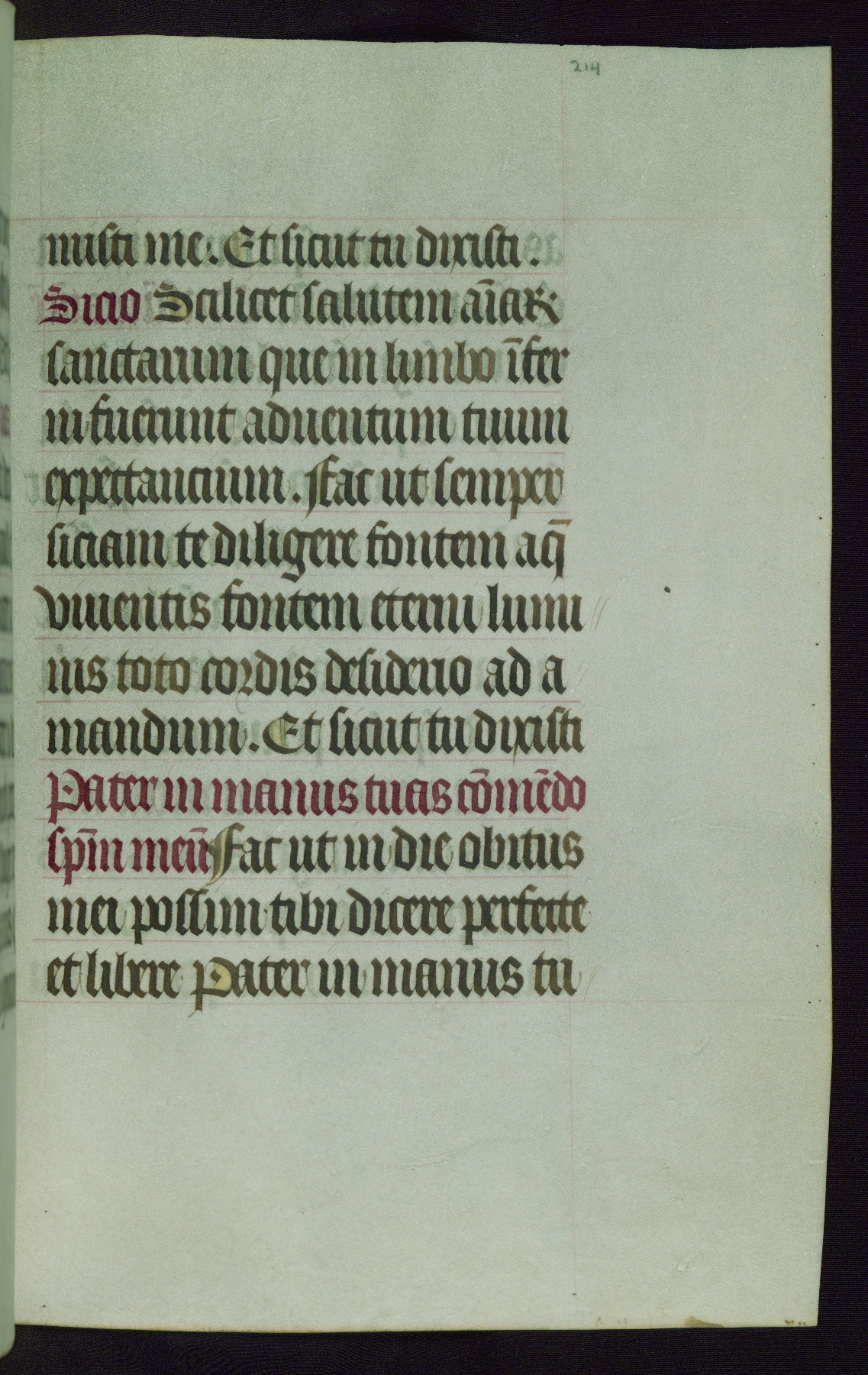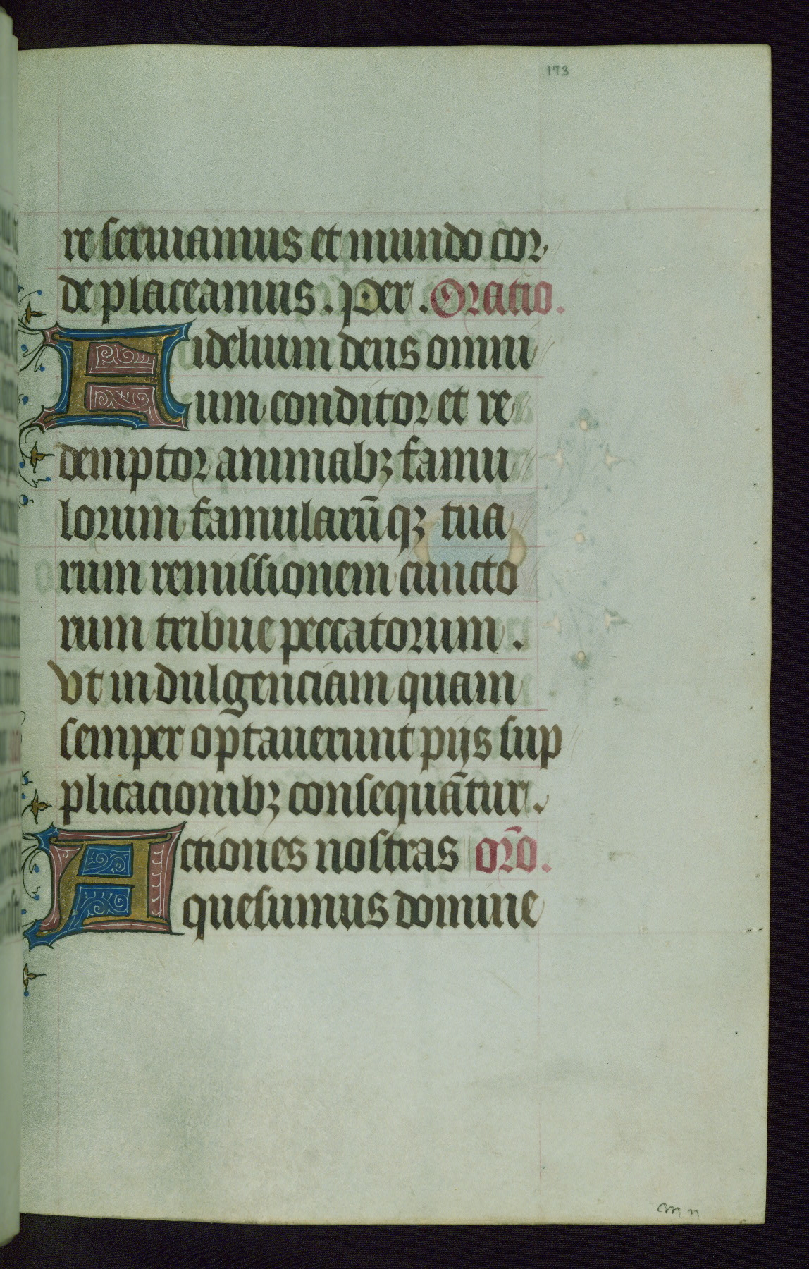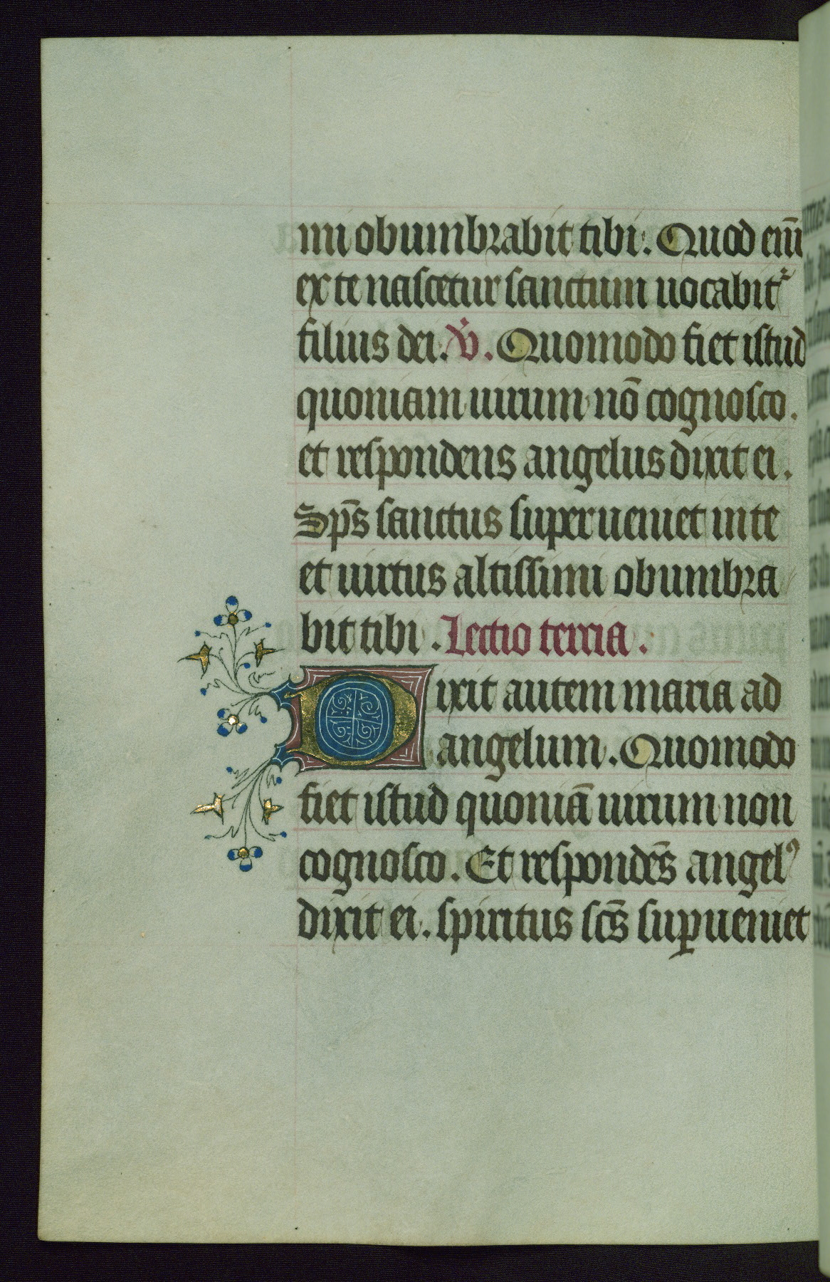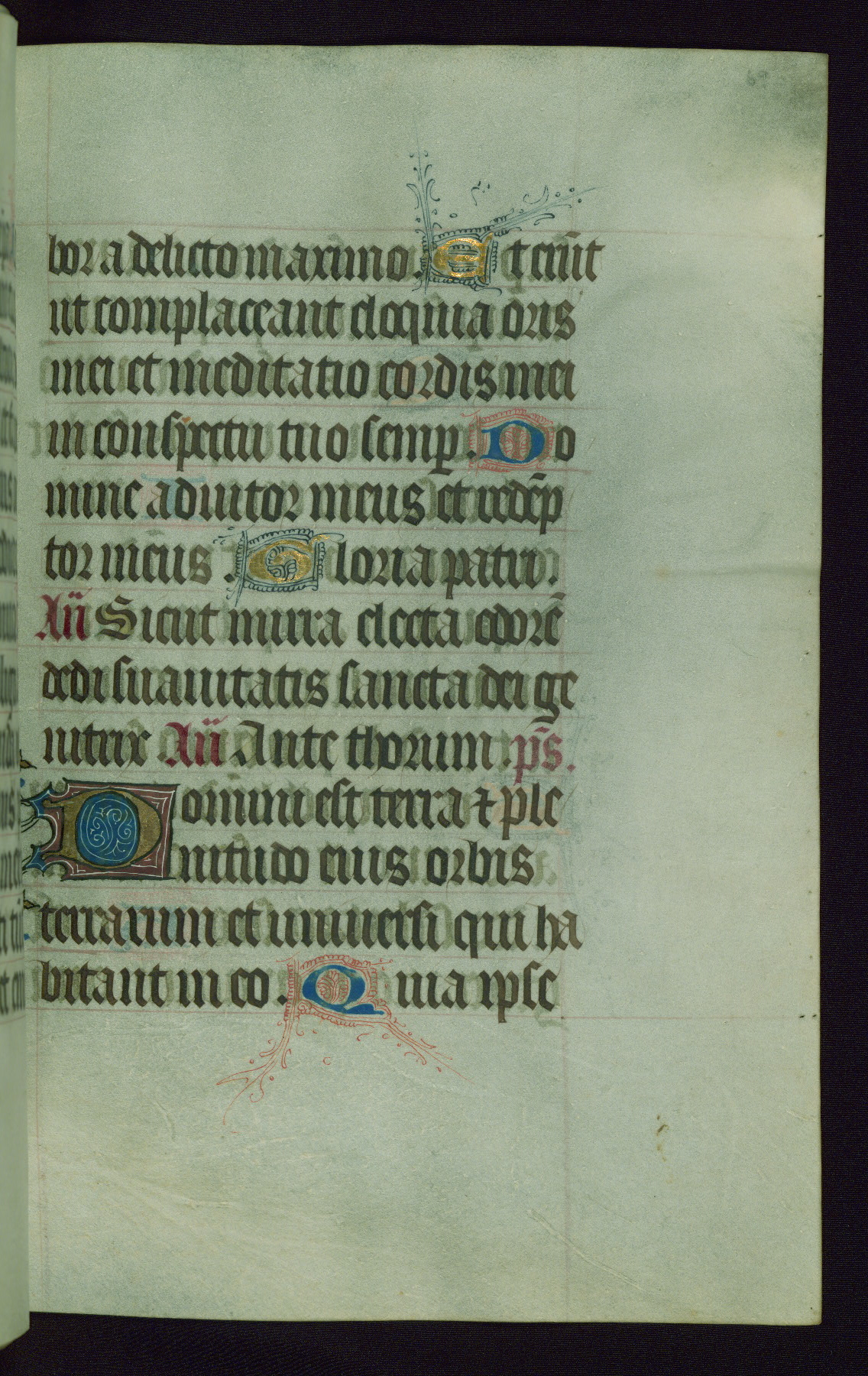 This Book of Hours, ca. 1460, was completed for use of Rome and illuminated under the influence, if not the direct participation, of Willem Vrelant. There remain twenty-two extant marginal calendar illustrations, thirteen extant full-page miniatures (many of which are paired with opening suffrages, perhaps suggesting a certain amount of significance to the owner), and one historiated initial. The contemporary binding, signed Livinus Stuaert, is dated 1477 and is most likely of Bruges or Ghent origin. It is thought that the first owner was French due to the French headings throughout and prominent fleur-de-lis figurations decorating the binding. Further, the first owner was likely female, suggested by the ways in which the book was structured to facilitate legibility. This is evinced by the large size of the script and the lack of abbreviations. While much of the text is standard, there remains evidence of personal significance and preference. This is seen in the chosen illuminations for those sections that are most significant to the owner. Most illuminations are paired with the opening page of staple Hours; however, many are accompanied by individual suffrages, constituting a large portion of the beginning of the manuscript. Personal preference is also shown in those sections of text that stray from the standard. The devotional sequence of this manuscript is notable for its sheer length and diversity of prayers as well as its inclusion of a French prayer not of official liturgy (fols. 215r-219v). The first collection of three prayers is headed and written in French. The prayer is attributed to St. Augustine and is described to guarantee a transformation of tribulation into joy through Christ's mercy, but only if the suppliant recites the prayer for thirty consecutive days. While it is not uncommon for evidence of an owner's predilections to surface in a Book of Hours, the particularly divergent features of this book allow readers to glean an intimate view of the patron.