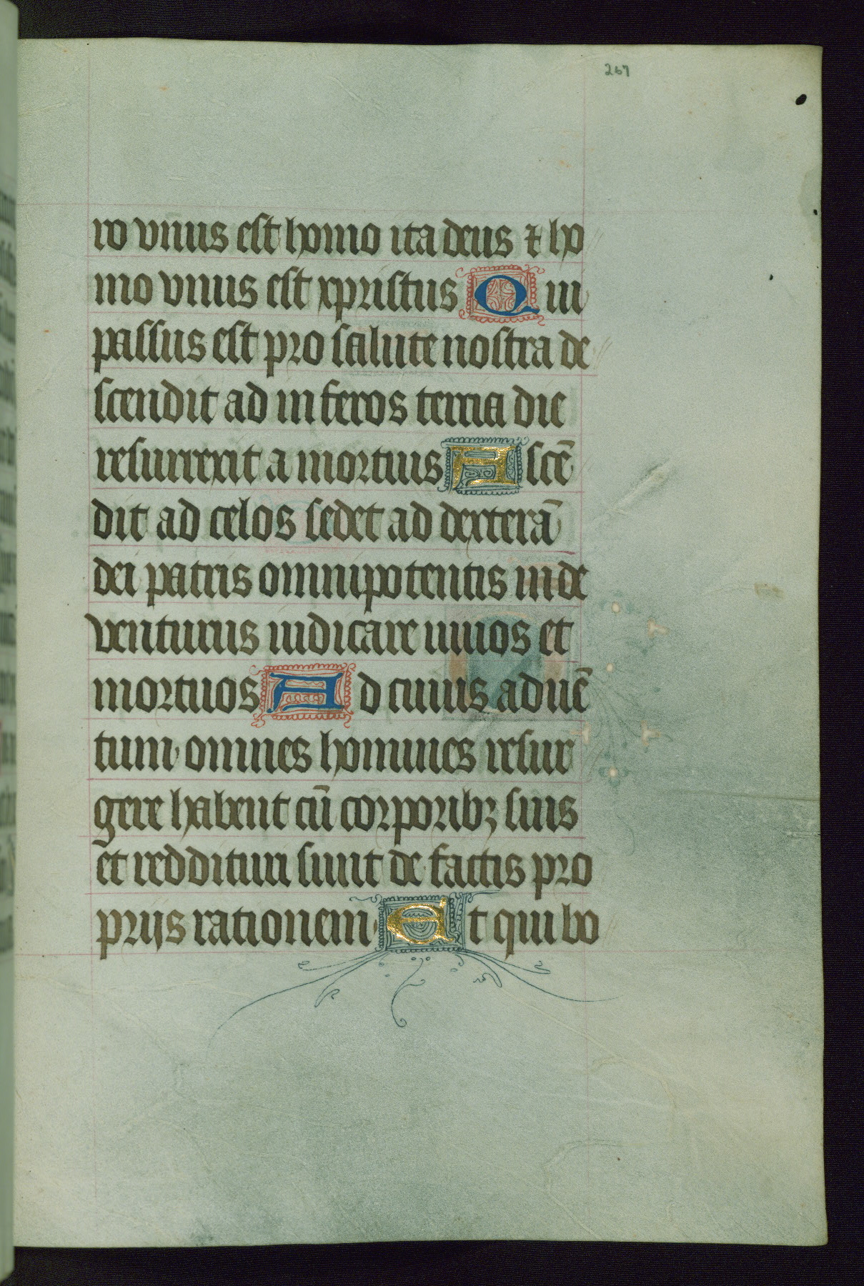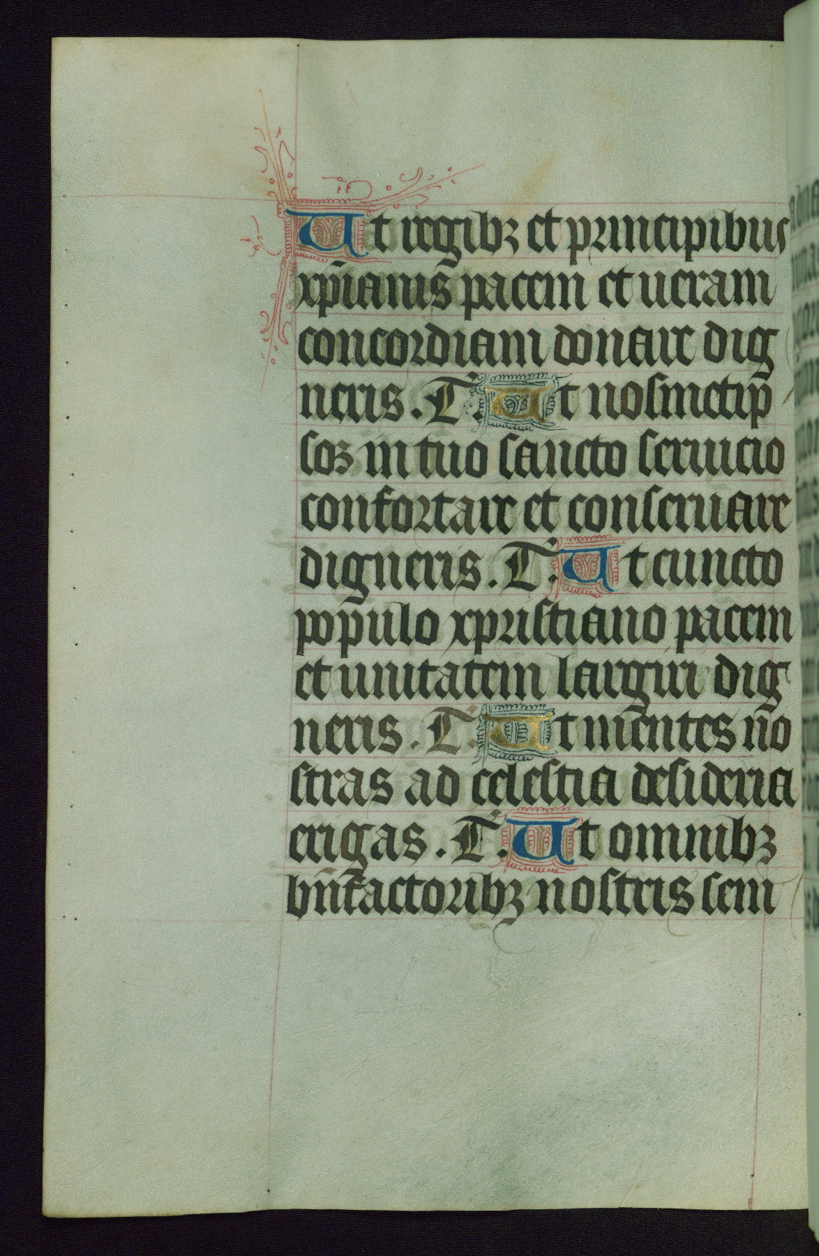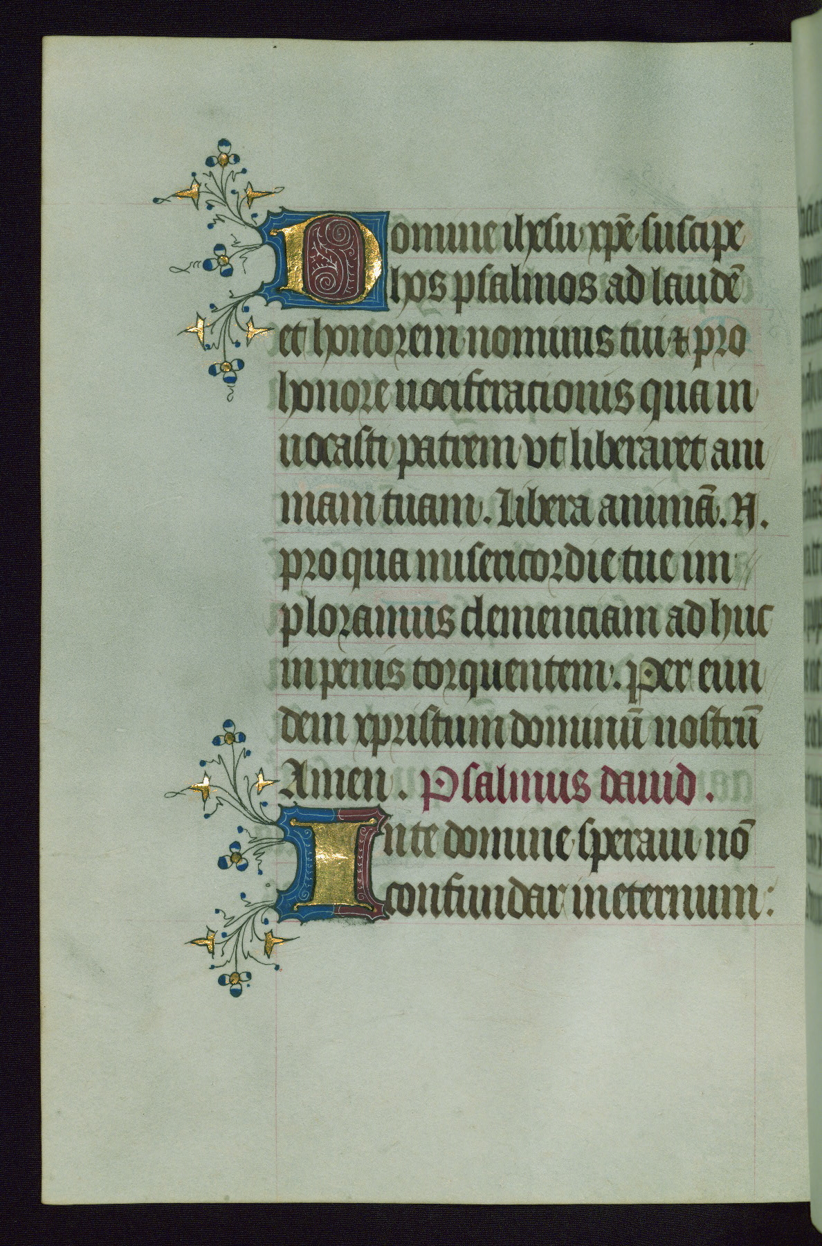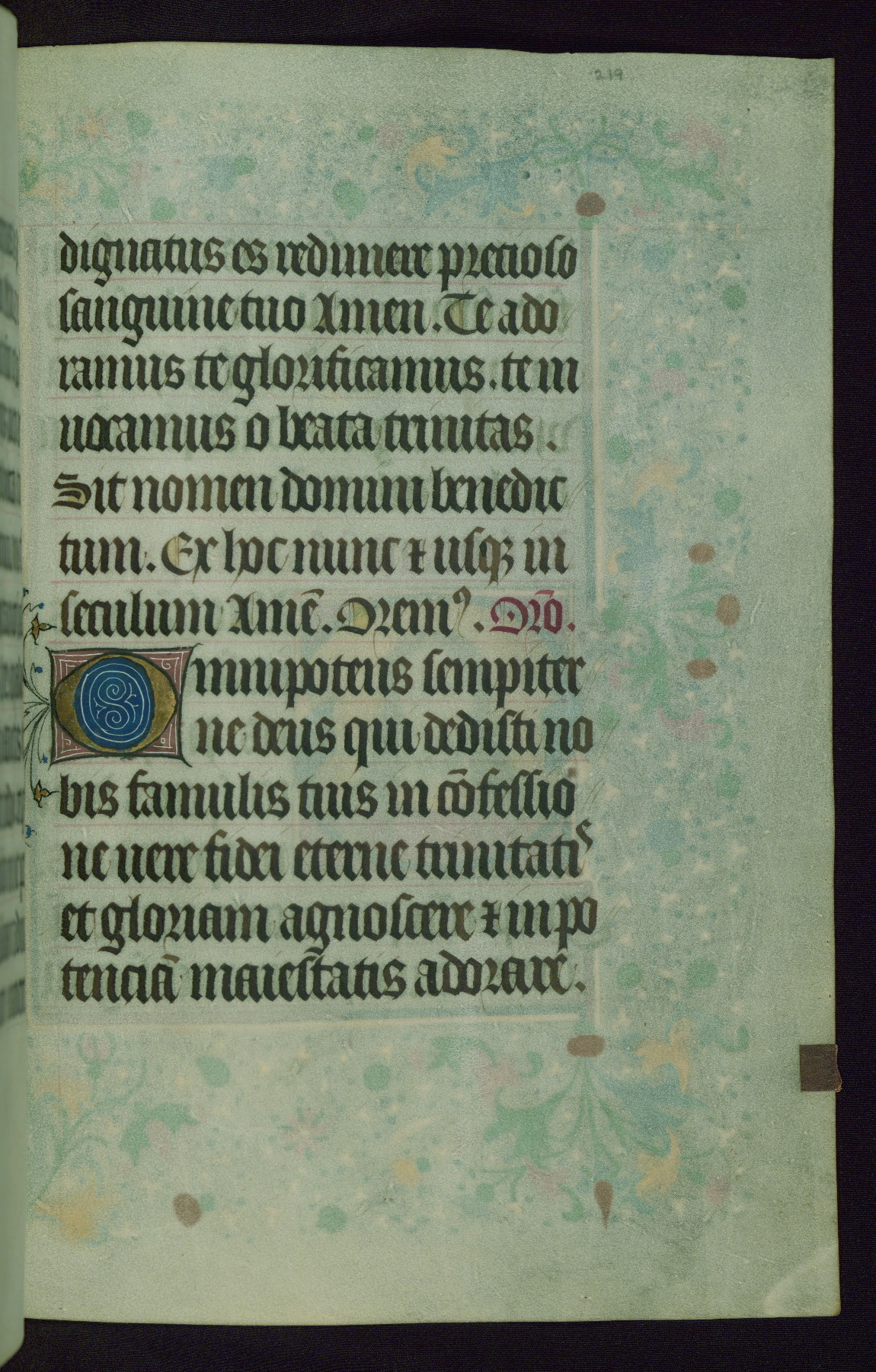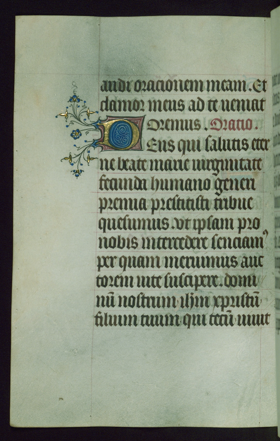 This Book of Hours, ca. 1460, was completed for use of Rome and illuminated under the influence, if not the direct participation, of Willem Vrelant. There remain twenty-two extant marginal calendar illustrations, thirteen extant full-page miniatures (many of which are paired with opening suffrages, perhaps suggesting a certain amount of significance to the owner), and one historiated initial. The contemporary binding, signed Livinus Stuaert, is dated 1477 and is most likely of Bruges or Ghent origin. It is thought that the first owner was French due to the French headings throughout and prominent fleur-de-lis figurations decorating the binding. Further, the first owner was likely female, suggested by the ways in which the book was structured to facilitate legibility. This is evinced by the large size of the script and the lack of abbreviations. While much of the text is standard, there remains evidence of personal significance and preference. This is seen in the chosen illuminations for those sections that are most significant to the owner. Most illuminations are paired with the opening page of staple Hours; however, many are accompanied by individual suffrages, constituting a large portion of the beginning of the manuscript. Personal preference is also shown in those sections of text that stray from the standard. The devotional sequence of this manuscript is notable for its sheer length and diversity of prayers as well as its inclusion of a French prayer not of official liturgy (fols. 215r-219v). The first collection of three prayers is headed and written in French. The prayer is attributed to St. Augustine and is described to guarantee a transformation of tribulation into joy through Christ's mercy, but only if the suppliant recites the prayer for thirty consecutive days. While it is not uncommon for evidence of an owner's predilections to surface in a Book of Hours, the particularly divergent features of this book allow readers to glean an intimate view of the patron.