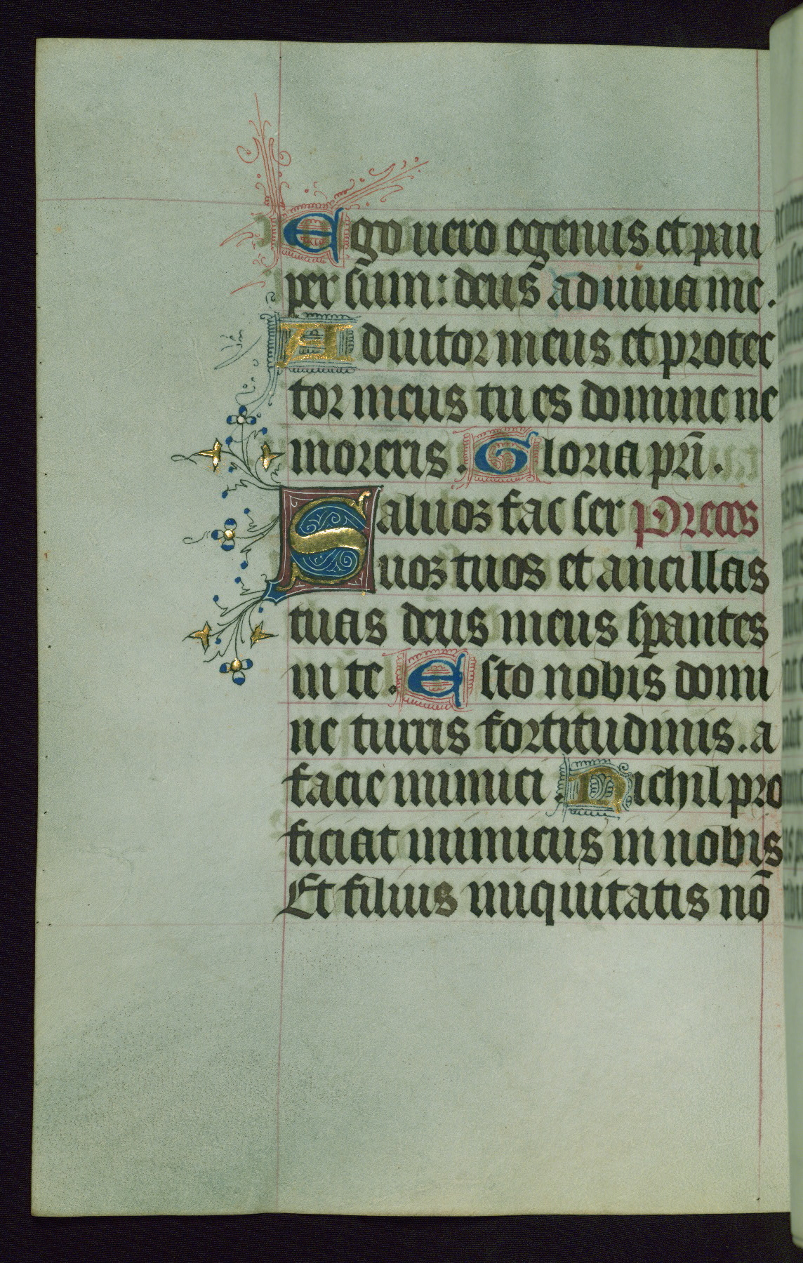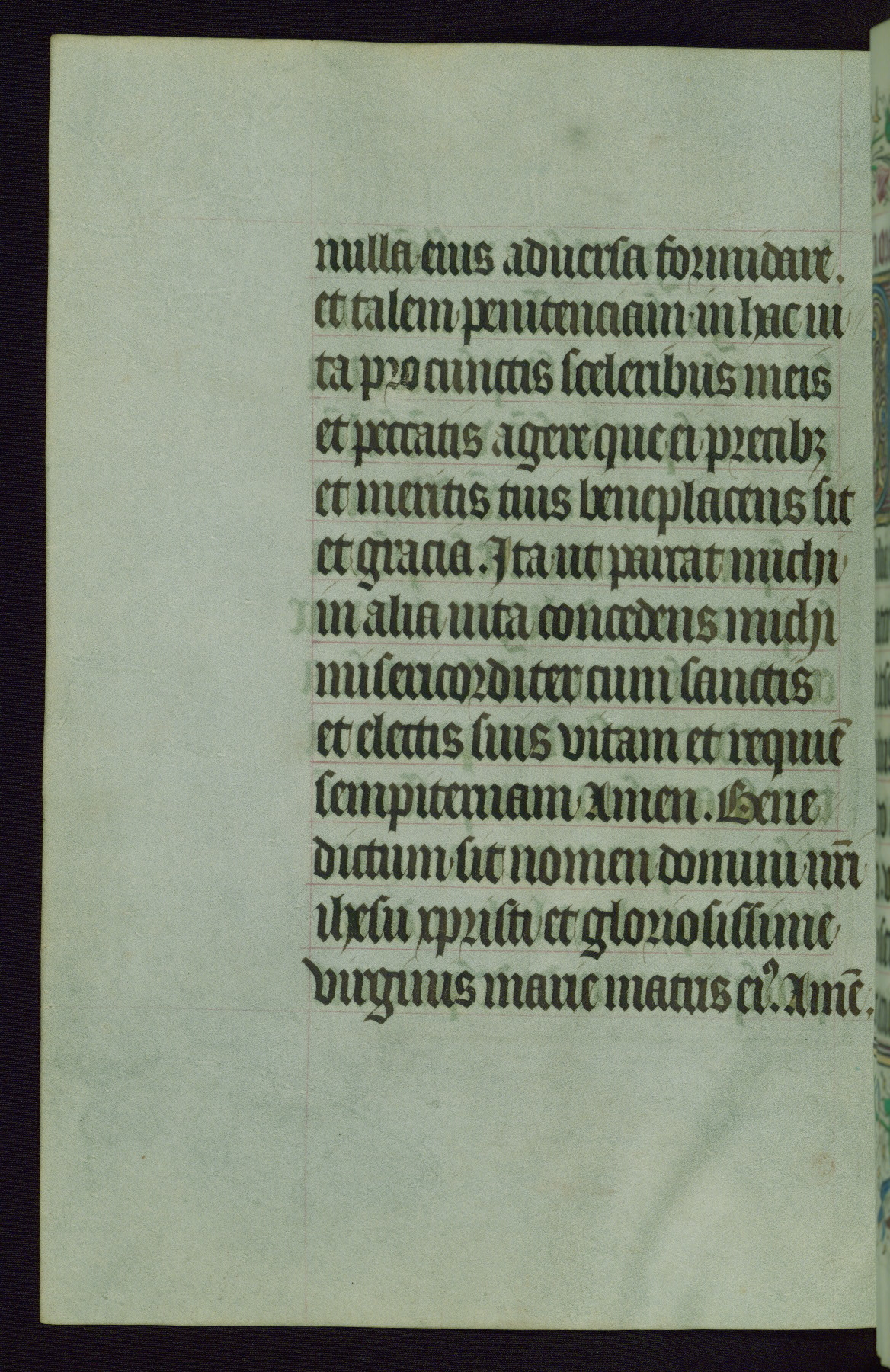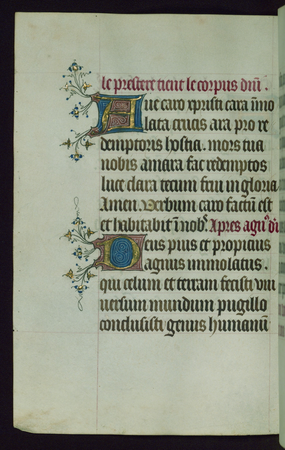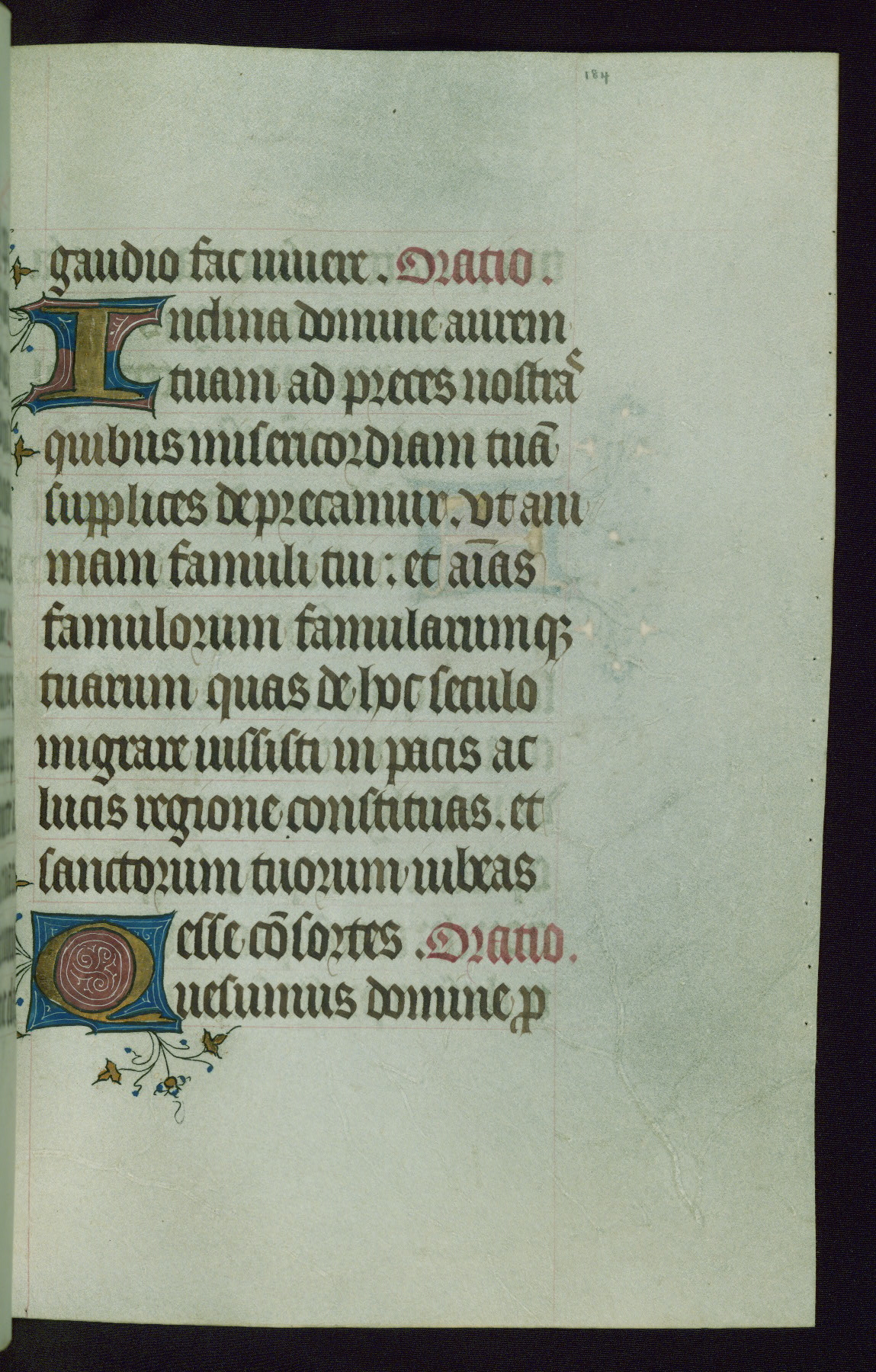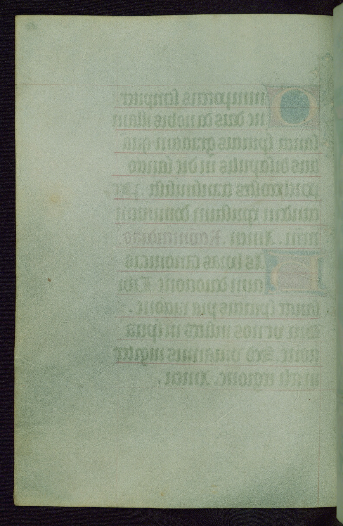 This Book of Hours, ca. 1460, was completed for use of Rome and illuminated under the influence, if not the direct participation, of Willem Vrelant. There remain twenty-two extant marginal calendar illustrations, thirteen extant full-page miniatures (many of which are paired with opening suffrages, perhaps suggesting a certain amount of significance to the owner), and one historiated initial. The contemporary binding, signed Livinus Stuaert, is dated 1477 and is most likely of Bruges or Ghent origin. It is thought that the first owner was French due to the French headings throughout and prominent fleur-de-lis figurations decorating the binding. Further, the first owner was likely female, suggested by the ways in which the book was structured to facilitate legibility. This is evinced by the large size of the script and the lack of abbreviations. While much of the text is standard, there remains evidence of personal significance and preference. This is seen in the chosen illuminations for those sections that are most significant to the owner. Most illuminations are paired with the opening page of staple Hours; however, many are accompanied by individual suffrages, constituting a large portion of the beginning of the manuscript. Personal preference is also shown in those sections of text that stray from the standard. The devotional sequence of this manuscript is notable for its sheer length and diversity of prayers as well as its inclusion of a French prayer not of official liturgy (fols. 215r-219v). The first collection of three prayers is headed and written in French. The prayer is attributed to St. Augustine and is described to guarantee a transformation of tribulation into joy through Christ's mercy, but only if the suppliant recites the prayer for thirty consecutive days. While it is not uncommon for evidence of an owner's predilections to surface in a Book of Hours, the particularly divergent features of this book allow readers to glean an intimate view of the patron.