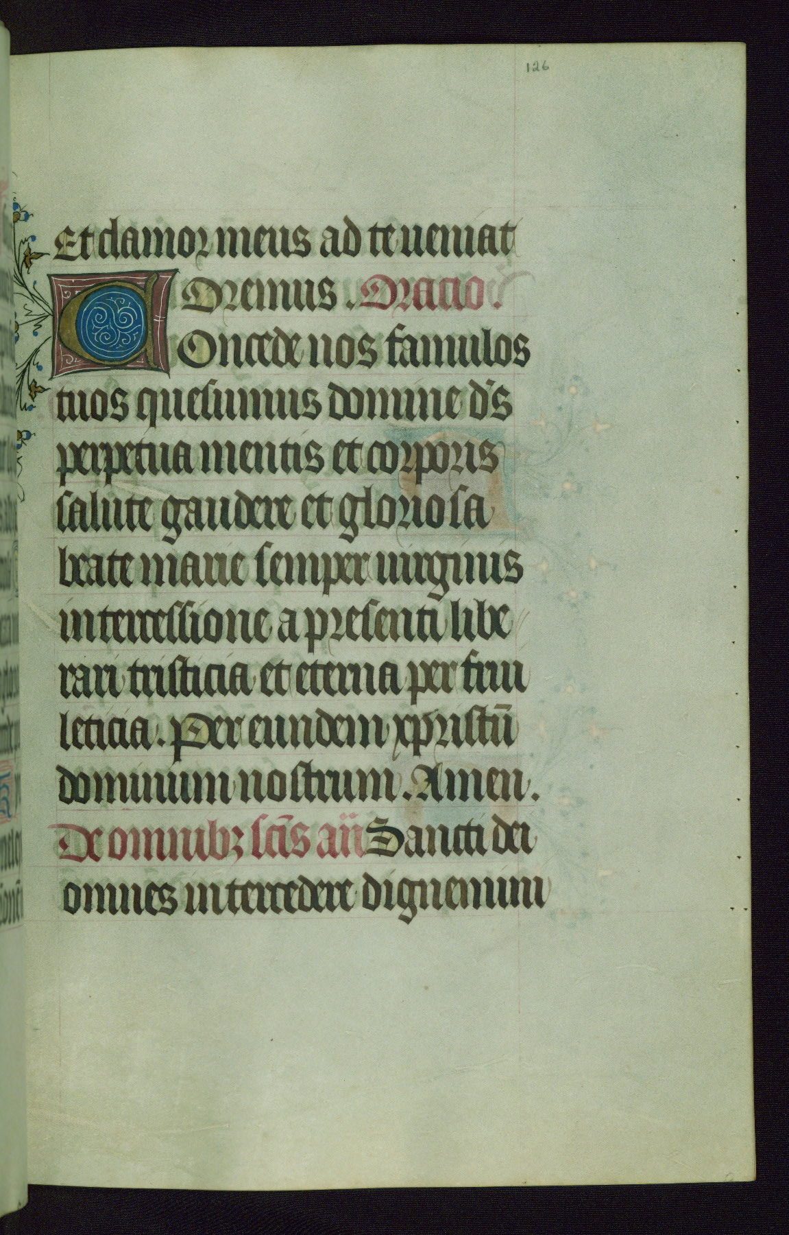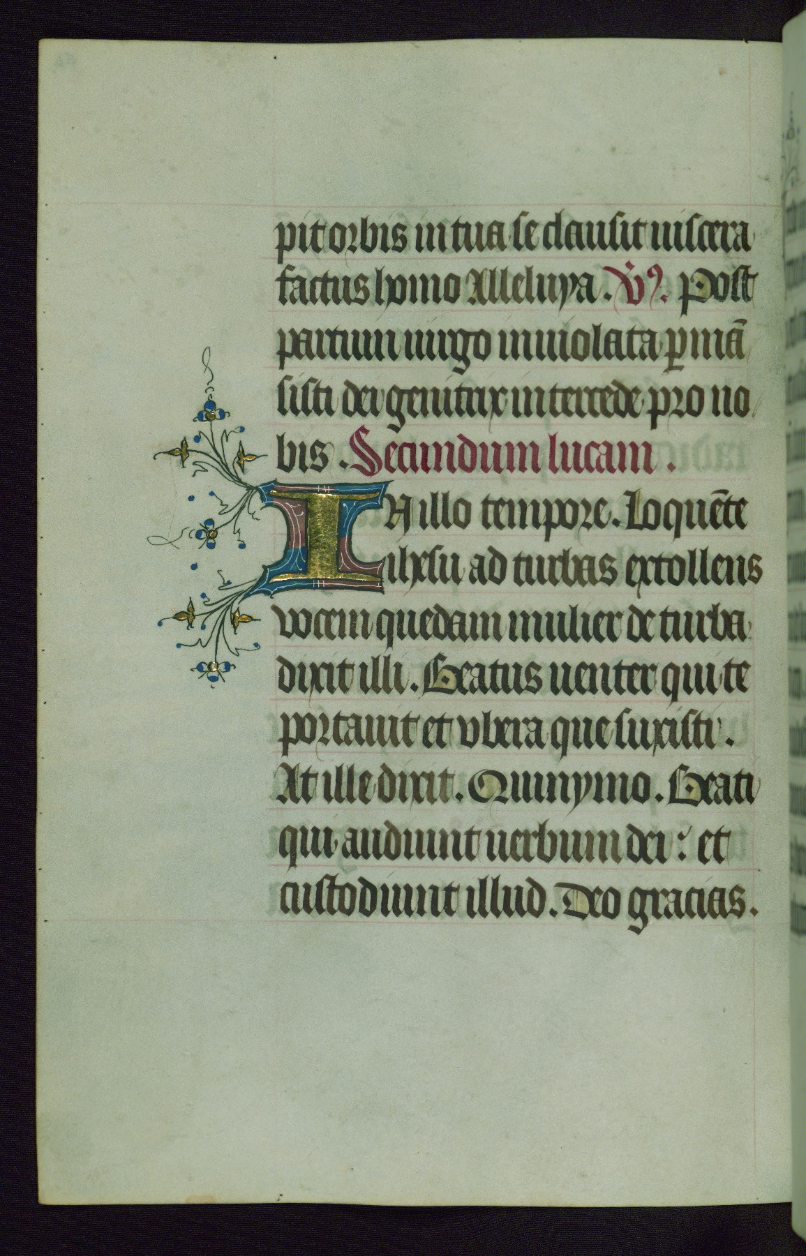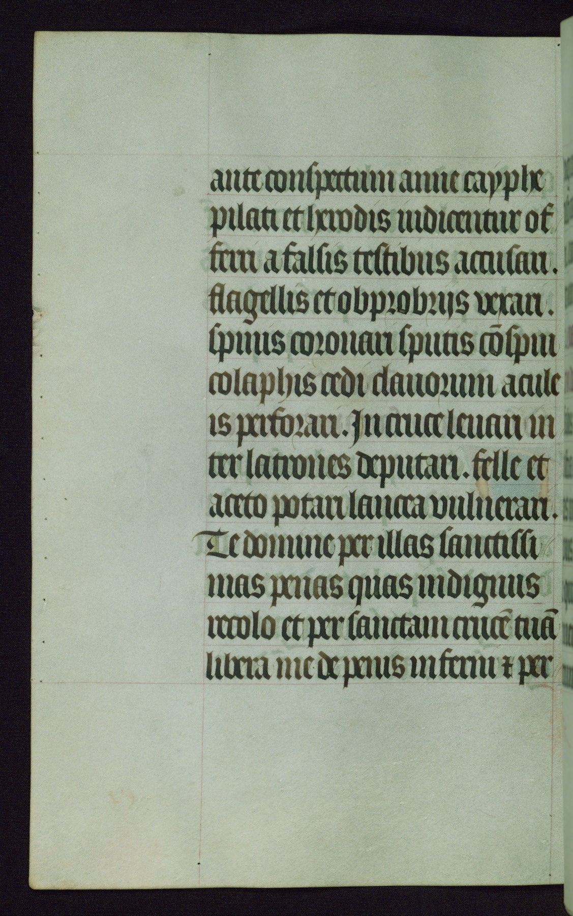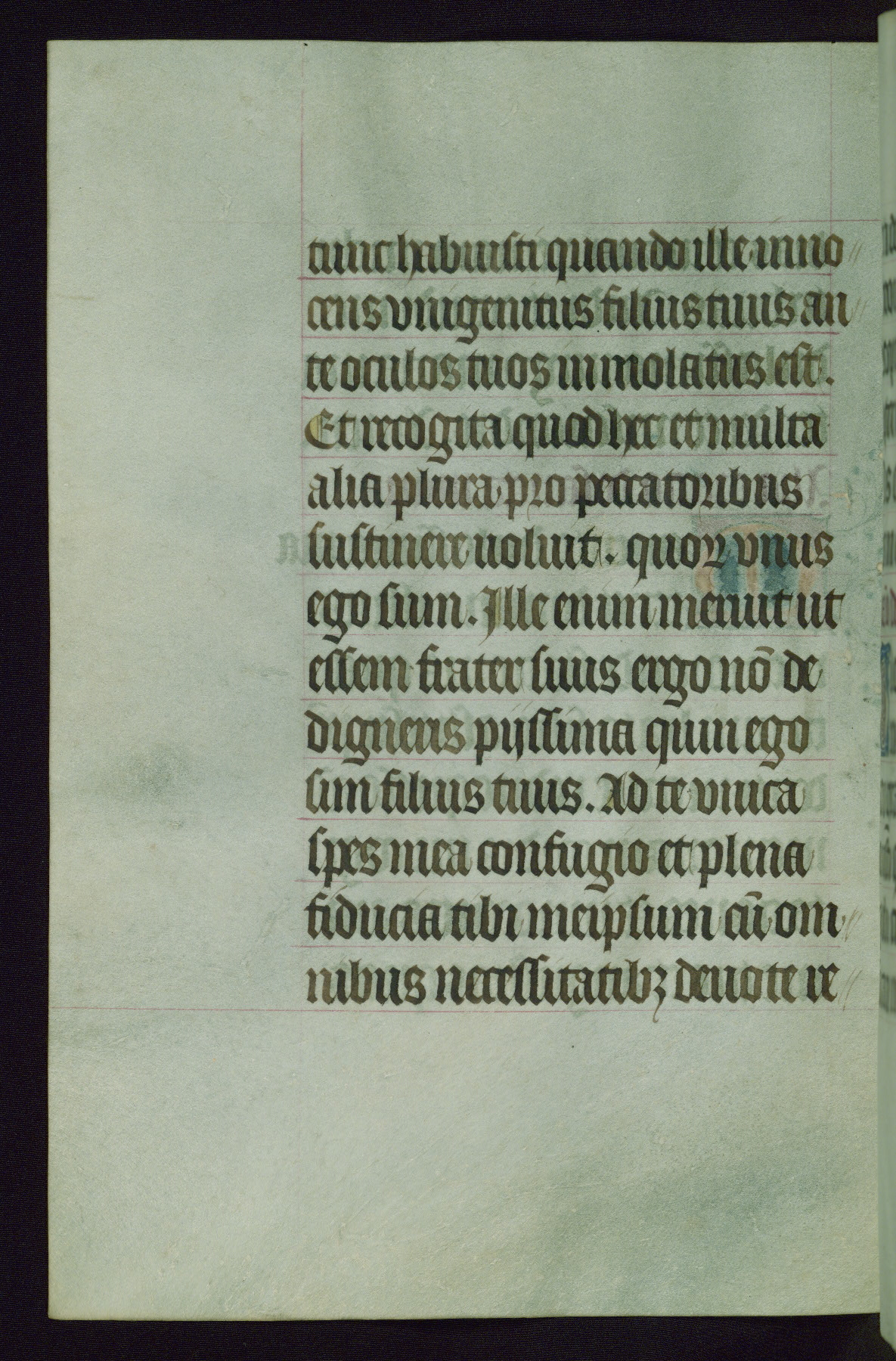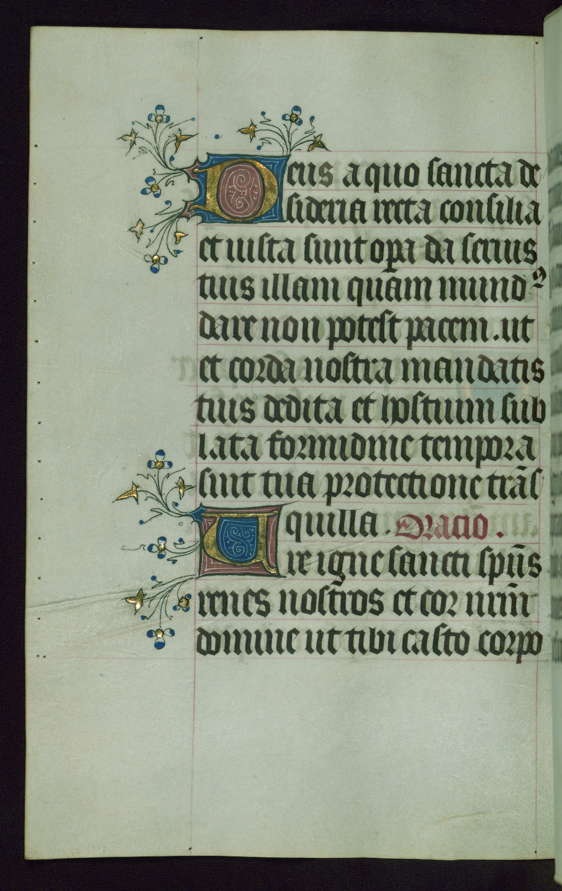 This Book of Hours, ca. 1460, was completed for use of Rome and illuminated under the influence, if not the direct participation, of Willem Vrelant. There remain twenty-two extant marginal calendar illustrations, thirteen extant full-page miniatures (many of which are paired with opening suffrages, perhaps suggesting a certain amount of significance to the owner), and one historiated initial. The contemporary binding, signed Livinus Stuaert, is dated 1477 and is most likely of Bruges or Ghent origin. It is thought that the first owner was French due to the French headings throughout and prominent fleur-de-lis figurations decorating the binding. Further, the first owner was likely female, suggested by the ways in which the book was structured to facilitate legibility. This is evinced by the large size of the script and the lack of abbreviations. While much of the text is standard, there remains evidence of personal significance and preference. This is seen in the chosen illuminations for those sections that are most significant to the owner. Most illuminations are paired with the opening page of staple Hours; however, many are accompanied by individual suffrages, constituting a large portion of the beginning of the manuscript. Personal preference is also shown in those sections of text that stray from the standard. The devotional sequence of this manuscript is notable for its sheer length and diversity of prayers as well as its inclusion of a French prayer not of official liturgy (fols. 215r-219v). The first collection of three prayers is headed and written in French. The prayer is attributed to St. Augustine and is described to guarantee a transformation of tribulation into joy through Christ's mercy, but only if the suppliant recites the prayer for thirty consecutive days. While it is not uncommon for evidence of an owner's predilections to surface in a Book of Hours, the particularly divergent features of this book allow readers to glean an intimate view of the patron.