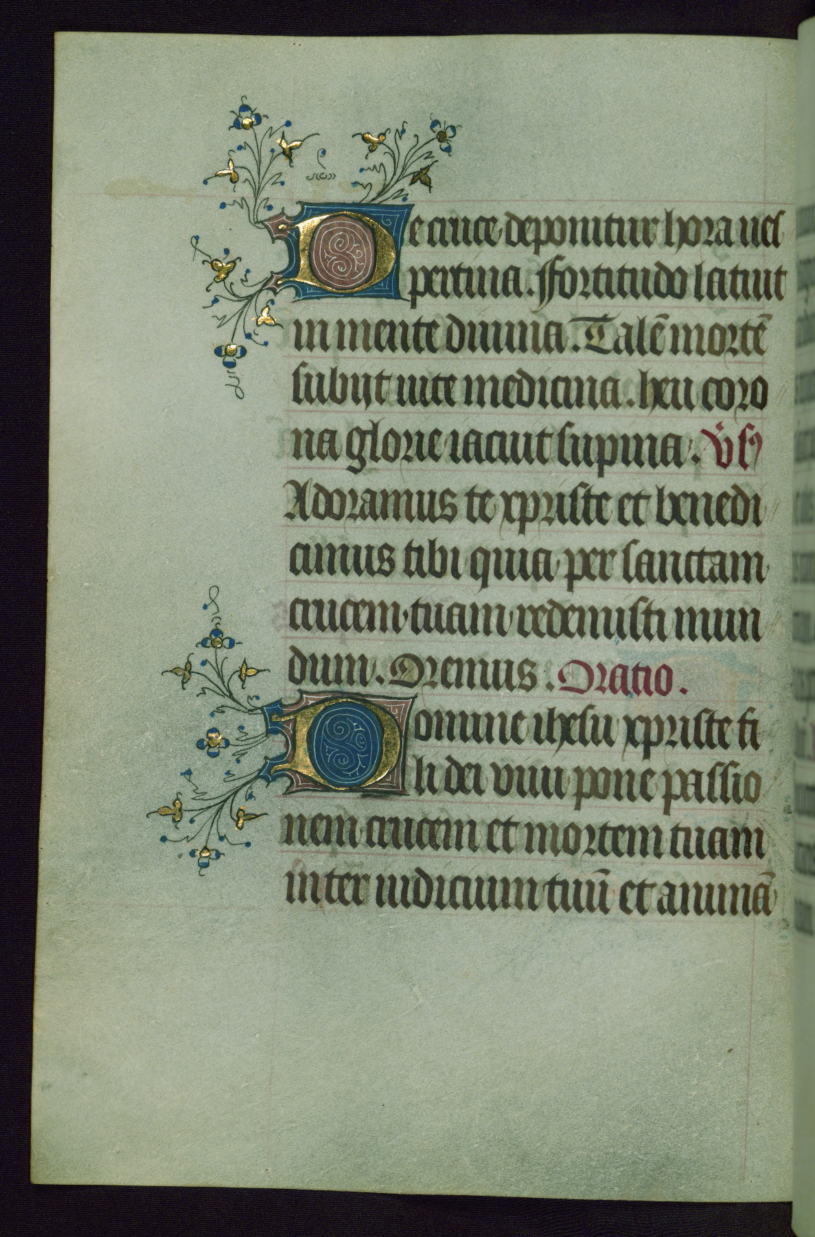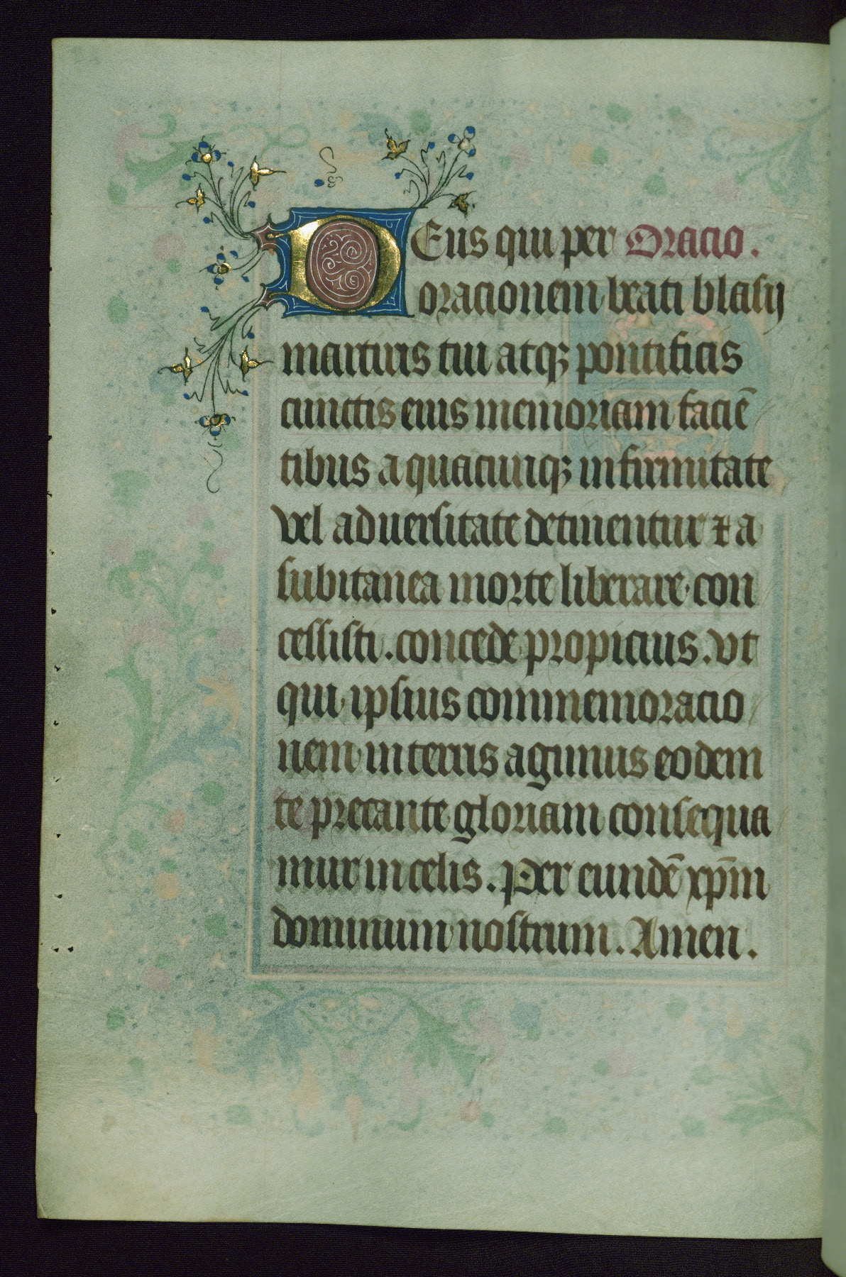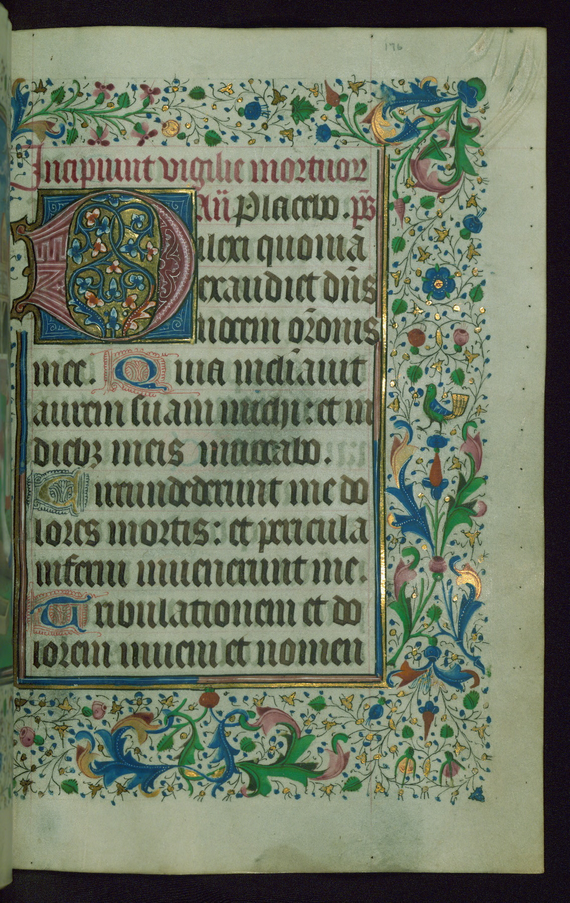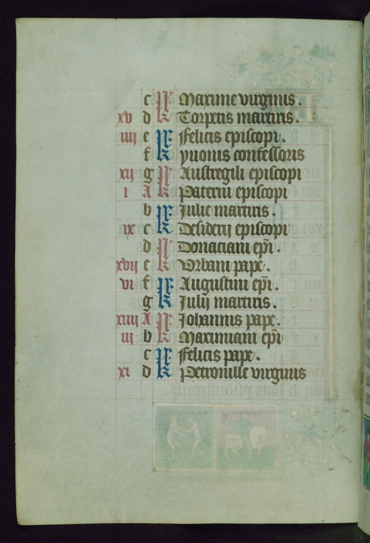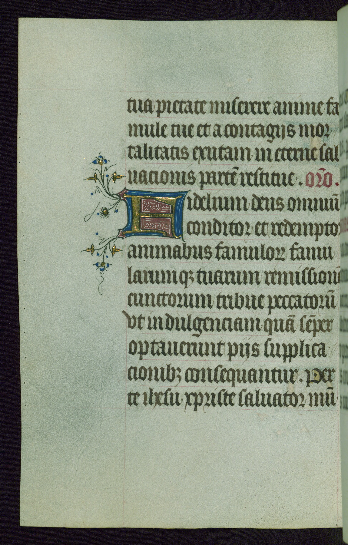 This Book of Hours, ca. 1460, was completed for use of Rome and illuminated under the influence, if not the direct participation, of Willem Vrelant. There remain twenty-two extant marginal calendar illustrations, thirteen extant full-page miniatures (many of which are paired with opening suffrages, perhaps suggesting a certain amount of significance to the owner), and one historiated initial. The contemporary binding, signed Livinus Stuaert, is dated 1477 and is most likely of Bruges or Ghent origin. It is thought that the first owner was French due to the French headings throughout and prominent fleur-de-lis figurations decorating the binding. Further, the first owner was likely female, suggested by the ways in which the book was structured to facilitate legibility. This is evinced by the large size of the script and the lack of abbreviations. While much of the text is standard, there remains evidence of personal significance and preference. This is seen in the chosen illuminations for those sections that are most significant to the owner. Most illuminations are paired with the opening page of staple Hours; however, many are accompanied by individual suffrages, constituting a large portion of the beginning of the manuscript. Personal preference is also shown in those sections of text that stray from the standard. The devotional sequence of this manuscript is notable for its sheer length and diversity of prayers as well as its inclusion of a French prayer not of official liturgy (fols. 215r-219v). The first collection of three prayers is headed and written in French. The prayer is attributed to St. Augustine and is described to guarantee a transformation of tribulation into joy through Christ's mercy, but only if the suppliant recites the prayer for thirty consecutive days. While it is not uncommon for evidence of an owner's predilections to surface in a Book of Hours, the particularly divergent features of this book allow readers to glean an intimate view of the patron.
