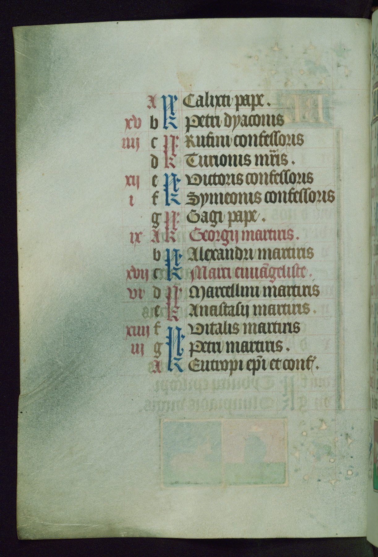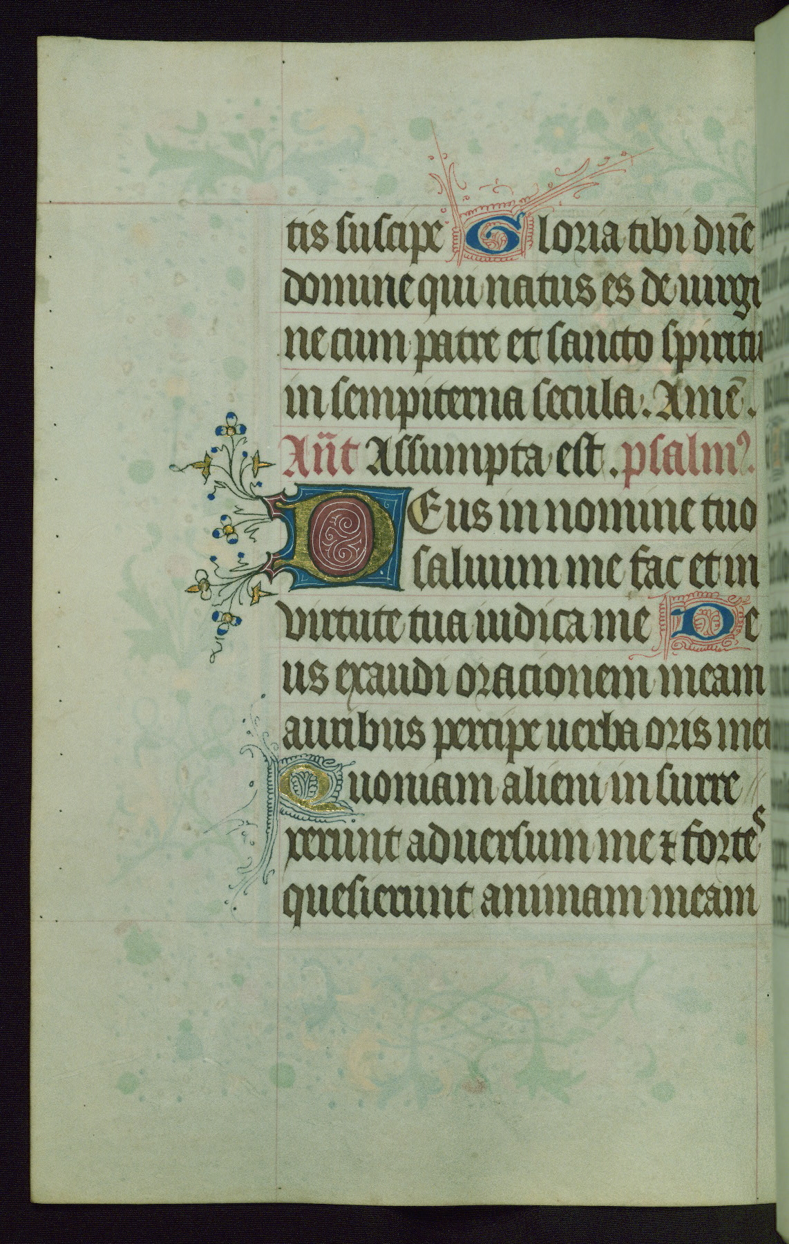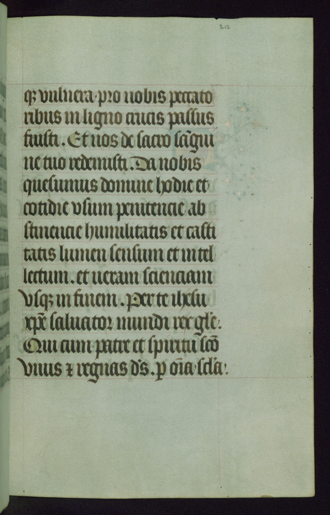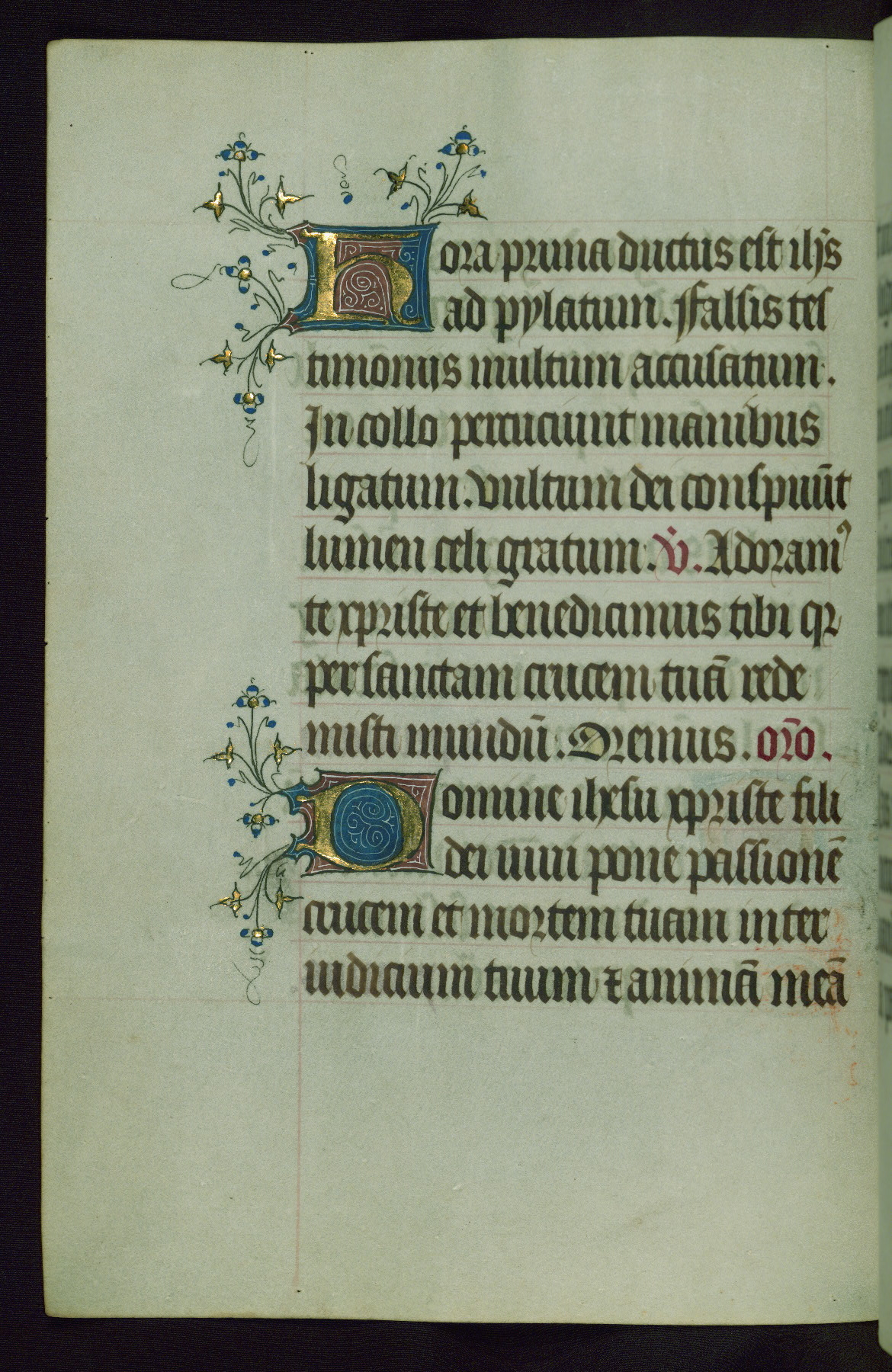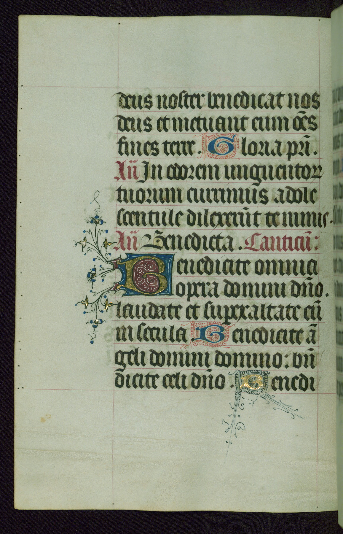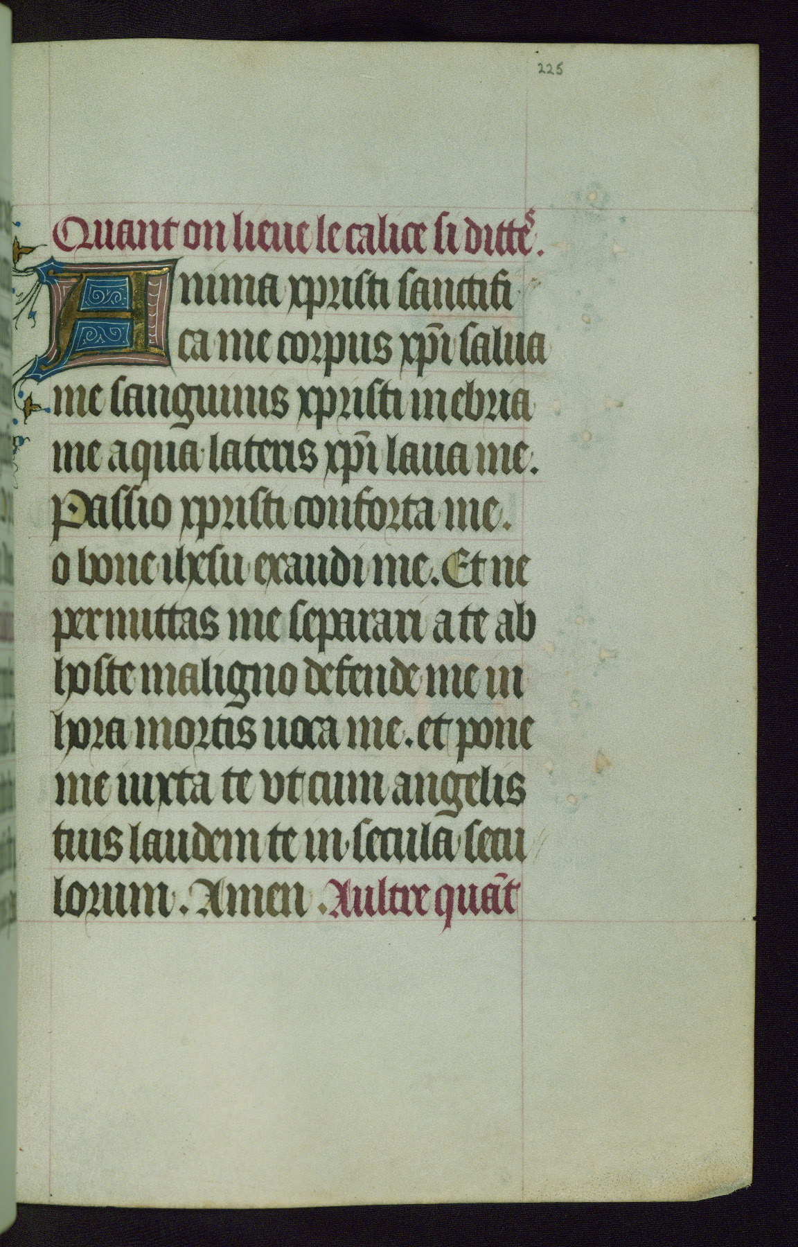 This Book of Hours, ca. 1460, was completed for use of Rome and illuminated under the influence, if not the direct participation, of Willem Vrelant. There remain twenty-two extant marginal calendar illustrations, thirteen extant full-page miniatures (many of which are paired with opening suffrages, perhaps suggesting a certain amount of significance to the owner), and one historiated initial. The contemporary binding, signed Livinus Stuaert, is dated 1477 and is most likely of Bruges or Ghent origin. It is thought that the first owner was French due to the French headings throughout and prominent fleur-de-lis figurations decorating the binding. Further, the first owner was likely female, suggested by the ways in which the book was structured to facilitate legibility. This is evinced by the large size of the script and the lack of abbreviations. While much of the text is standard, there remains evidence of personal significance and preference. This is seen in the chosen illuminations for those sections that are most significant to the owner. Most illuminations are paired with the opening page of staple Hours; however, many are accompanied by individual suffrages, constituting a large portion of the beginning of the manuscript. Personal preference is also shown in those sections of text that stray from the standard. The devotional sequence of this manuscript is notable for its sheer length and diversity of prayers as well as its inclusion of a French prayer not of official liturgy (fols. 215r-219v). The first collection of three prayers is headed and written in French. The prayer is attributed to St. Augustine and is described to guarantee a transformation of tribulation into joy through Christ's mercy, but only if the suppliant recites the prayer for thirty consecutive days. While it is not uncommon for evidence of an owner's predilections to surface in a Book of Hours, the particularly divergent features of this book allow readers to glean an intimate view of the patron.