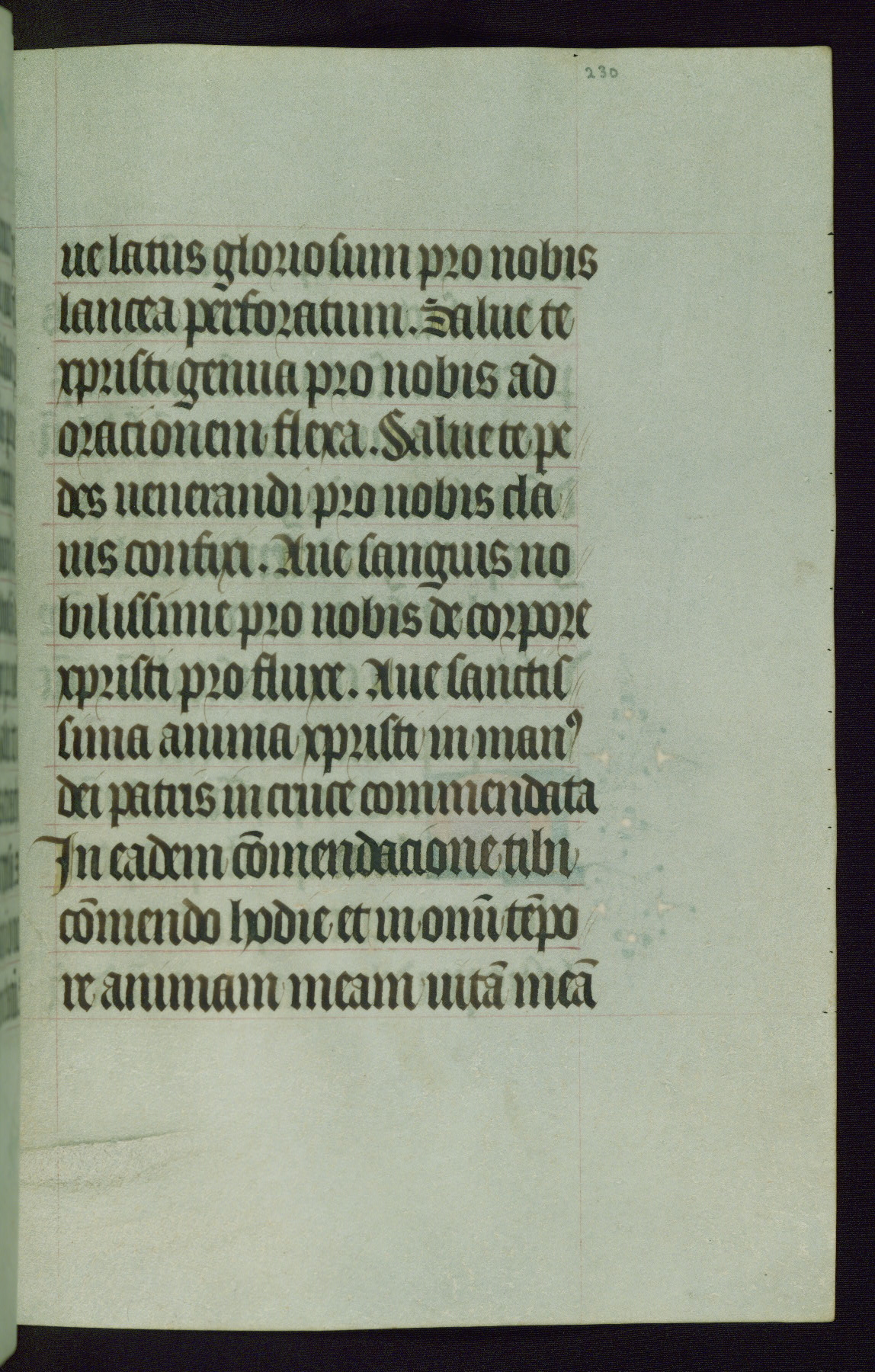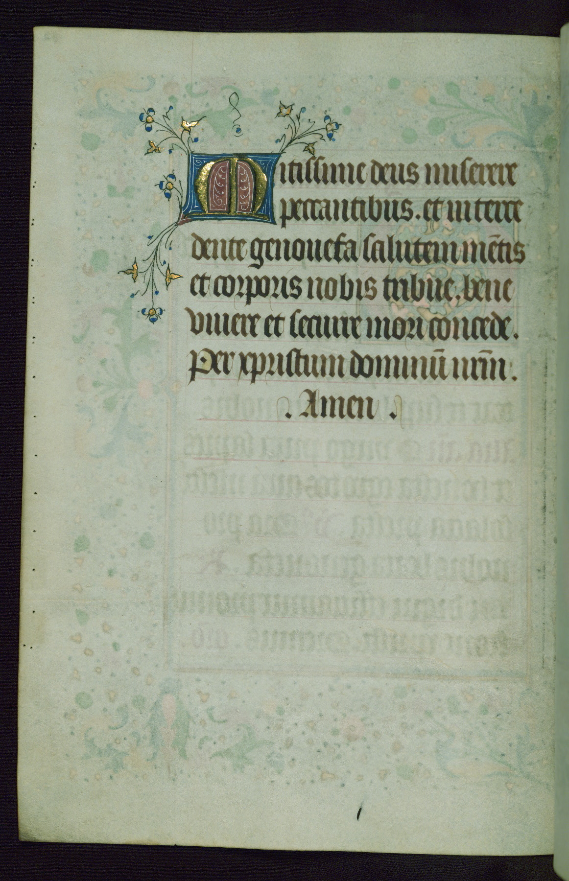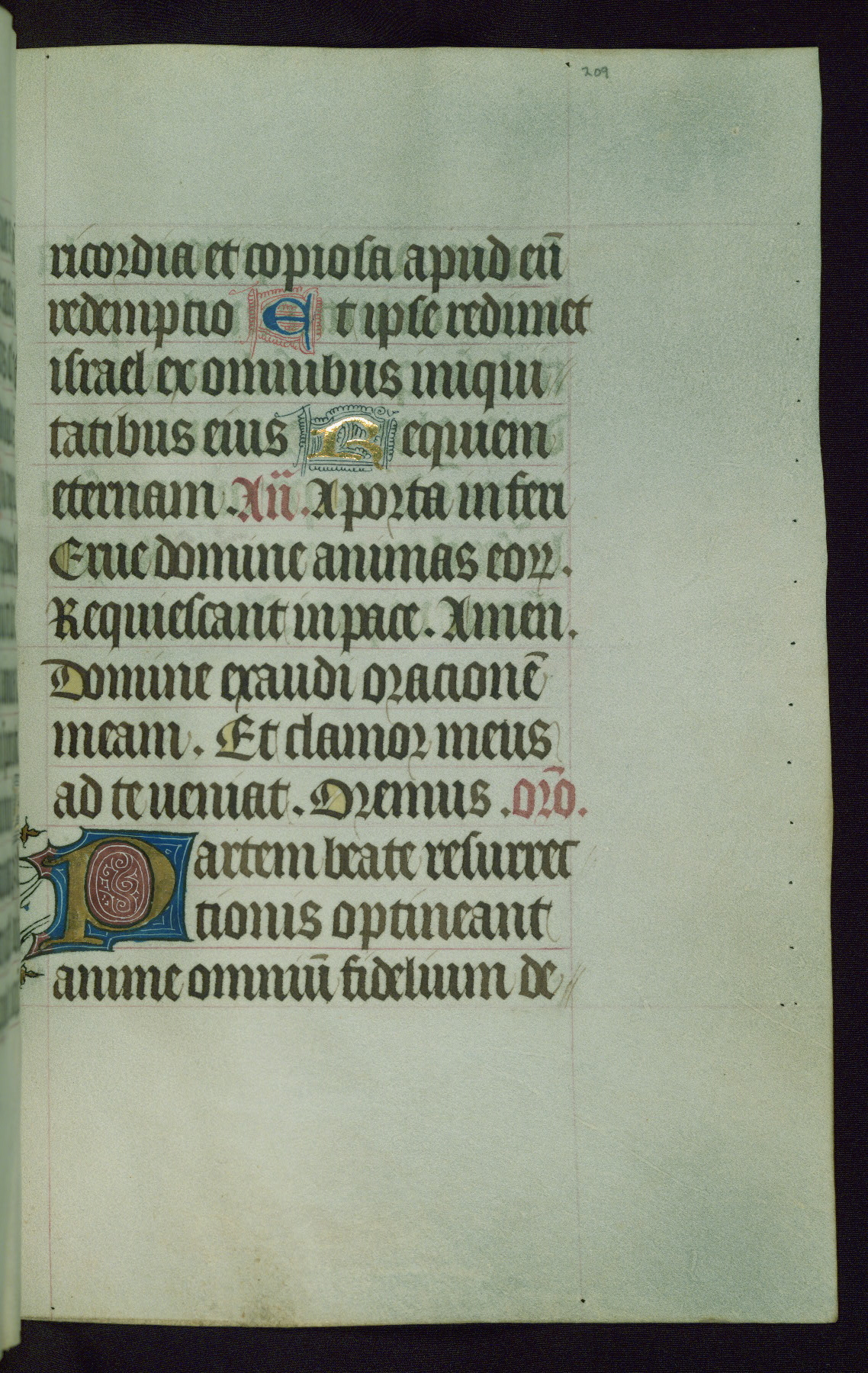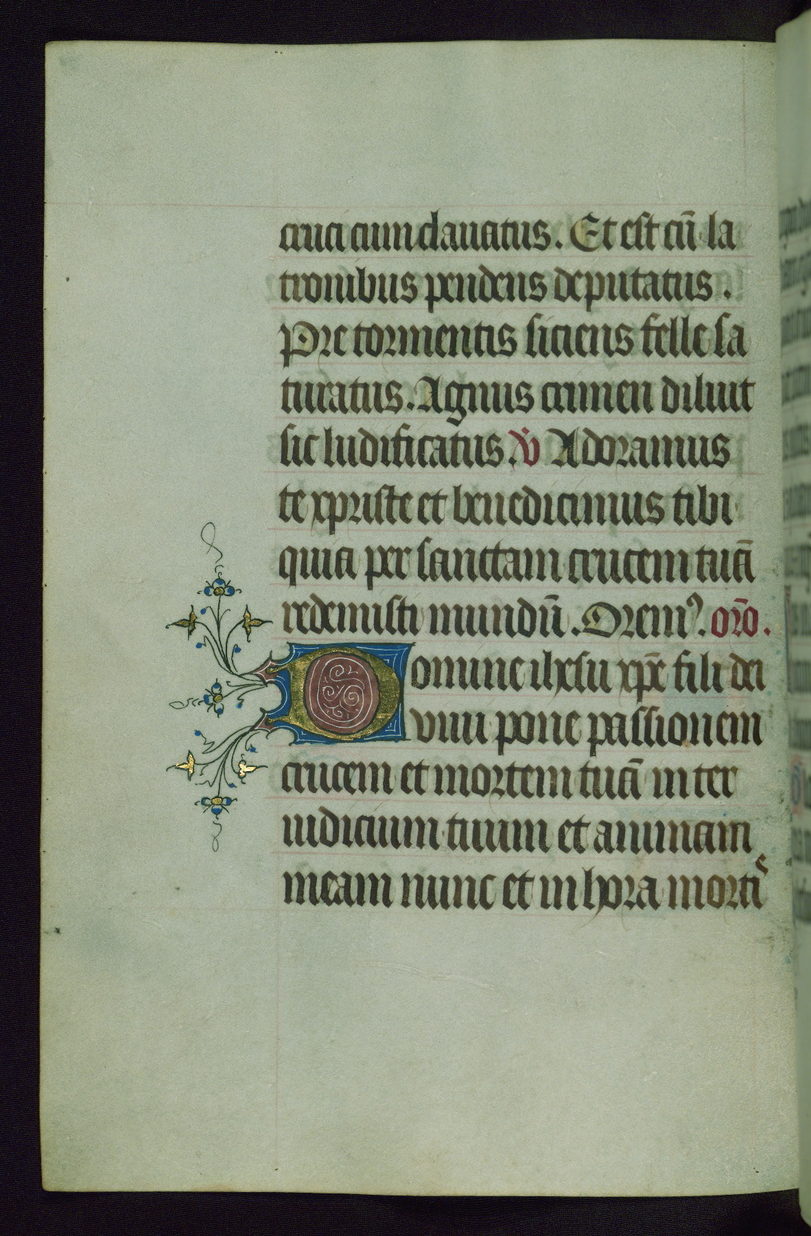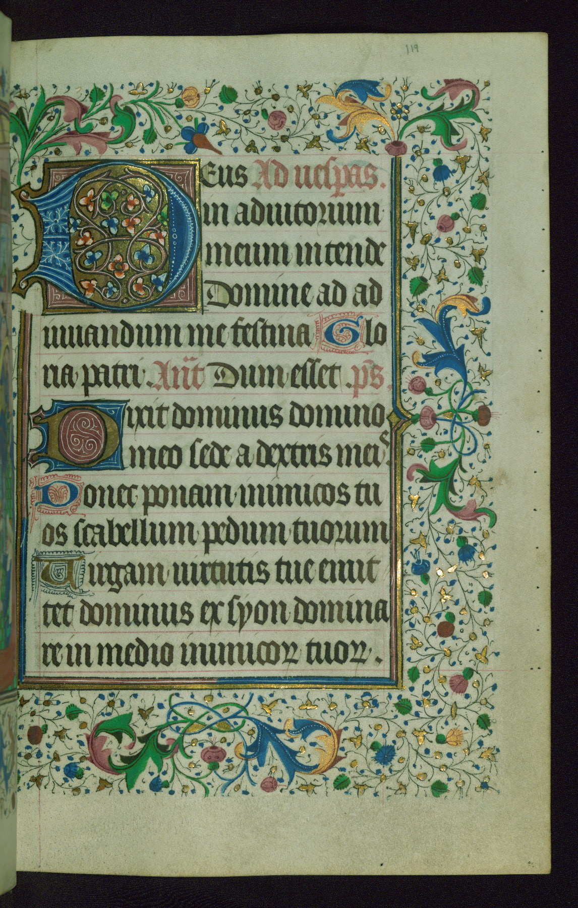 This Book of Hours, ca. 1460, was completed for use of Rome and illuminated under the influence, if not the direct participation, of Willem Vrelant. There remain twenty-two extant marginal calendar illustrations, thirteen extant full-page miniatures (many of which are paired with opening suffrages, perhaps suggesting a certain amount of significance to the owner), and one historiated initial. The contemporary binding, signed Livinus Stuaert, is dated 1477 and is most likely of Bruges or Ghent origin. It is thought that the first owner was French due to the French headings throughout and prominent fleur-de-lis figurations decorating the binding. Further, the first owner was likely female, suggested by the ways in which the book was structured to facilitate legibility. This is evinced by the large size of the script and the lack of abbreviations. While much of the text is standard, there remains evidence of personal significance and preference. This is seen in the chosen illuminations for those sections that are most significant to the owner. Most illuminations are paired with the opening page of staple Hours; however, many are accompanied by individual suffrages, constituting a large portion of the beginning of the manuscript. Personal preference is also shown in those sections of text that stray from the standard. The devotional sequence of this manuscript is notable for its sheer length and diversity of prayers as well as its inclusion of a French prayer not of official liturgy (fols. 215r-219v). The first collection of three prayers is headed and written in French. The prayer is attributed to St. Augustine and is described to guarantee a transformation of tribulation into joy through Christ's mercy, but only if the suppliant recites the prayer for thirty consecutive days. While it is not uncommon for evidence of an owner's predilections to surface in a Book of Hours, the particularly divergent features of this book allow readers to glean an intimate view of the patron.