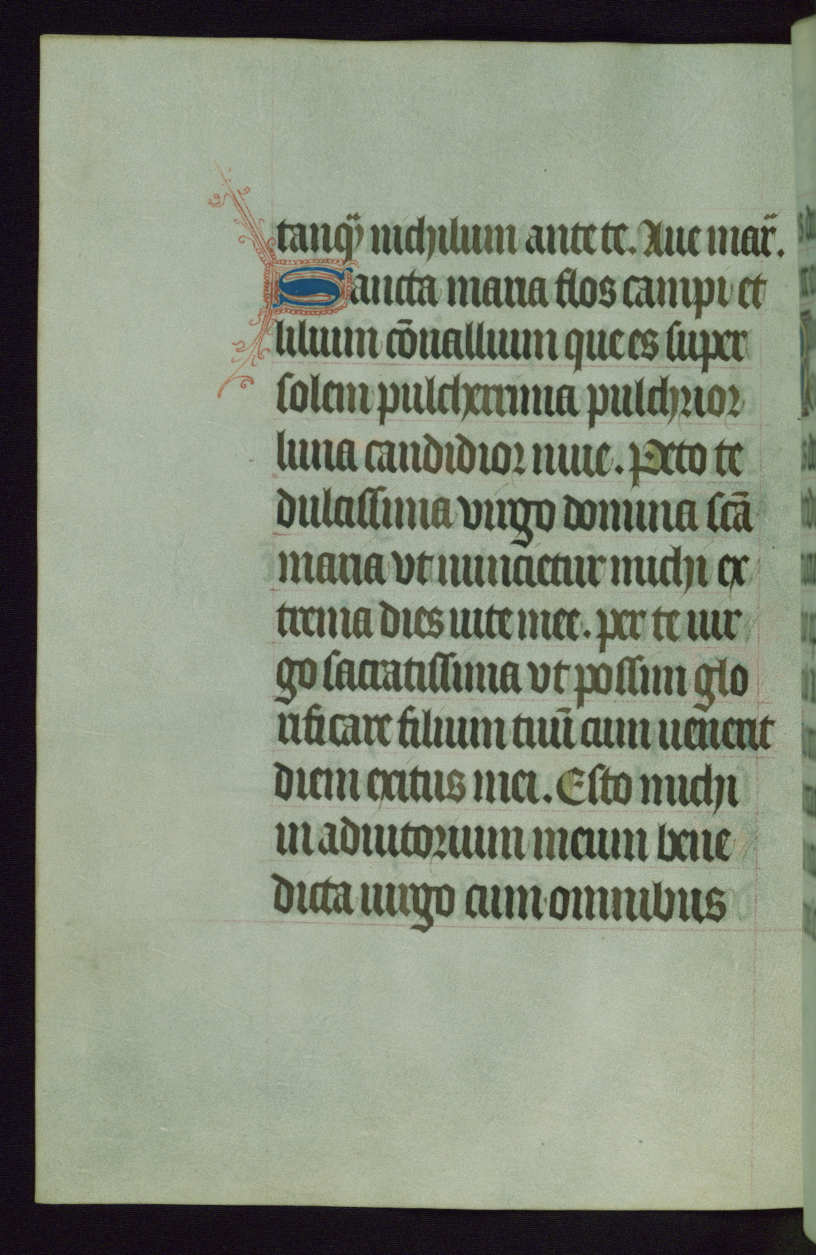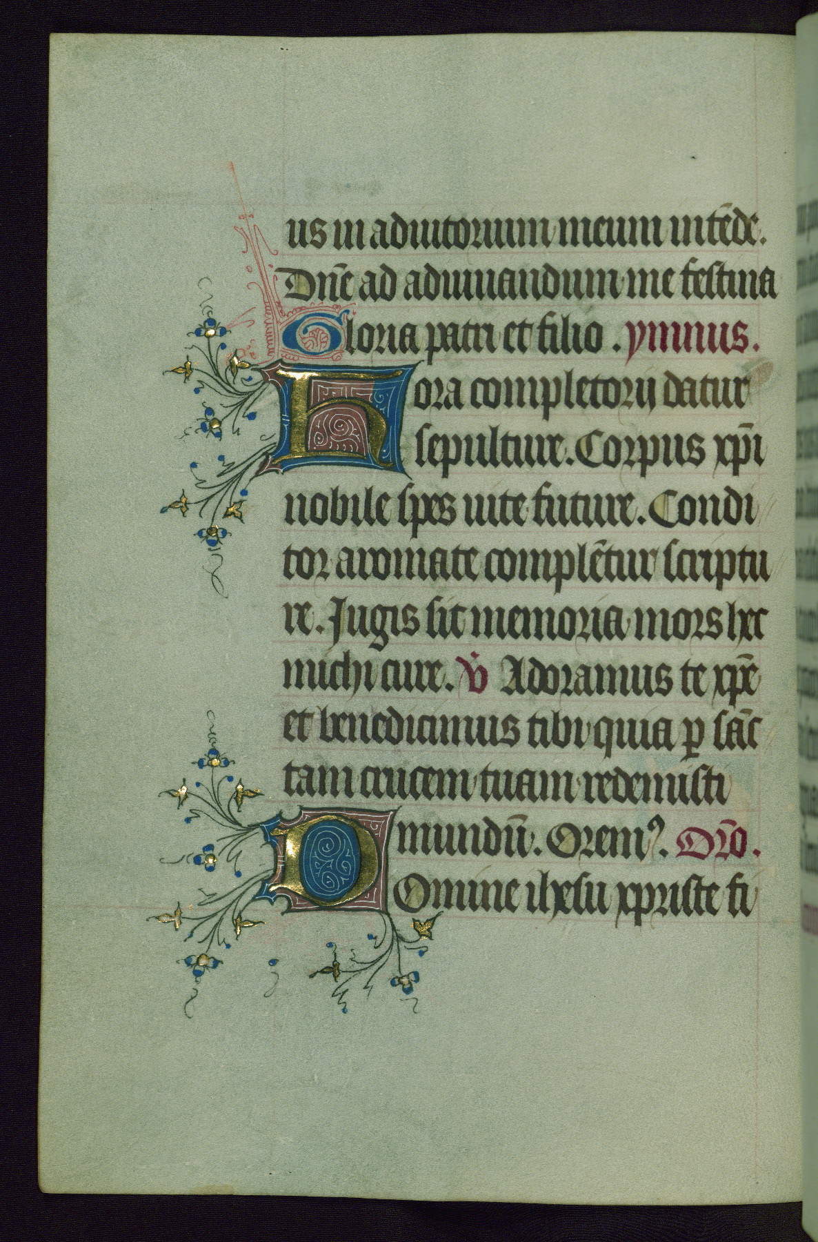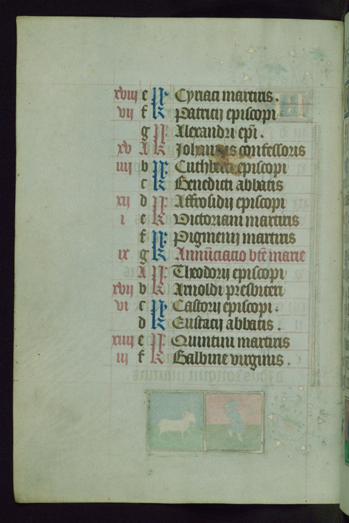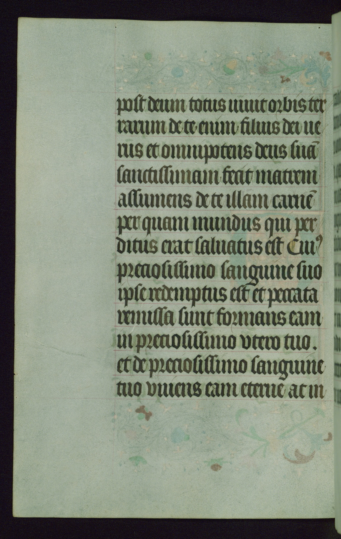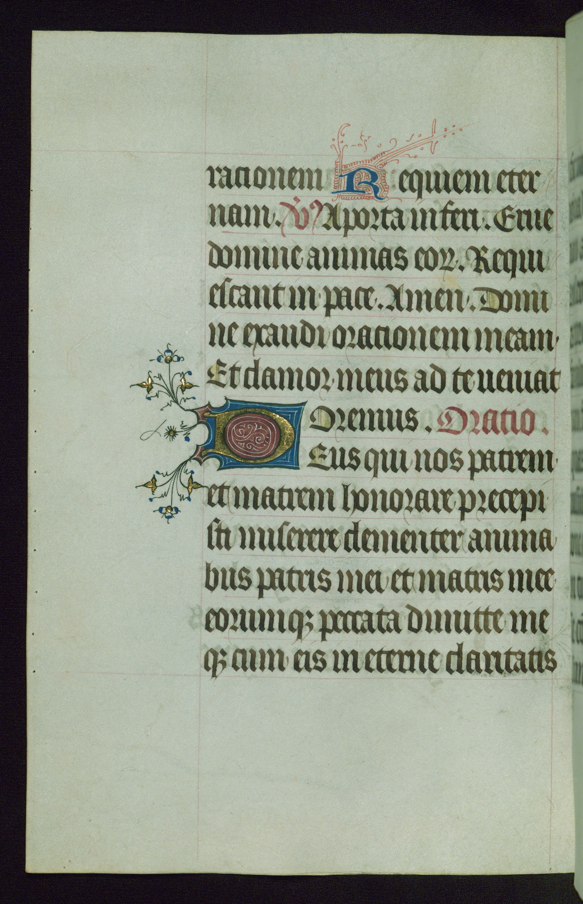 This Book of Hours, ca. 1460, was completed for use of Rome and illuminated under the influence, if not the direct participation, of Willem Vrelant. There remain twenty-two extant marginal calendar illustrations, thirteen extant full-page miniatures (many of which are paired with opening suffrages, perhaps suggesting a certain amount of significance to the owner), and one historiated initial. The contemporary binding, signed Livinus Stuaert, is dated 1477 and is most likely of Bruges or Ghent origin. It is thought that the first owner was French due to the French headings throughout and prominent fleur-de-lis figurations decorating the binding. Further, the first owner was likely female, suggested by the ways in which the book was structured to facilitate legibility. This is evinced by the large size of the script and the lack of abbreviations. While much of the text is standard, there remains evidence of personal significance and preference. This is seen in the chosen illuminations for those sections that are most significant to the owner. Most illuminations are paired with the opening page of staple Hours; however, many are accompanied by individual suffrages, constituting a large portion of the beginning of the manuscript. Personal preference is also shown in those sections of text that stray from the standard. The devotional sequence of this manuscript is notable for its sheer length and diversity of prayers as well as its inclusion of a French prayer not of official liturgy (fols. 215r-219v). The first collection of three prayers is headed and written in French. The prayer is attributed to St. Augustine and is described to guarantee a transformation of tribulation into joy through Christ's mercy, but only if the suppliant recites the prayer for thirty consecutive days. While it is not uncommon for evidence of an owner's predilections to surface in a Book of Hours, the particularly divergent features of this book allow readers to glean an intimate view of the patron.