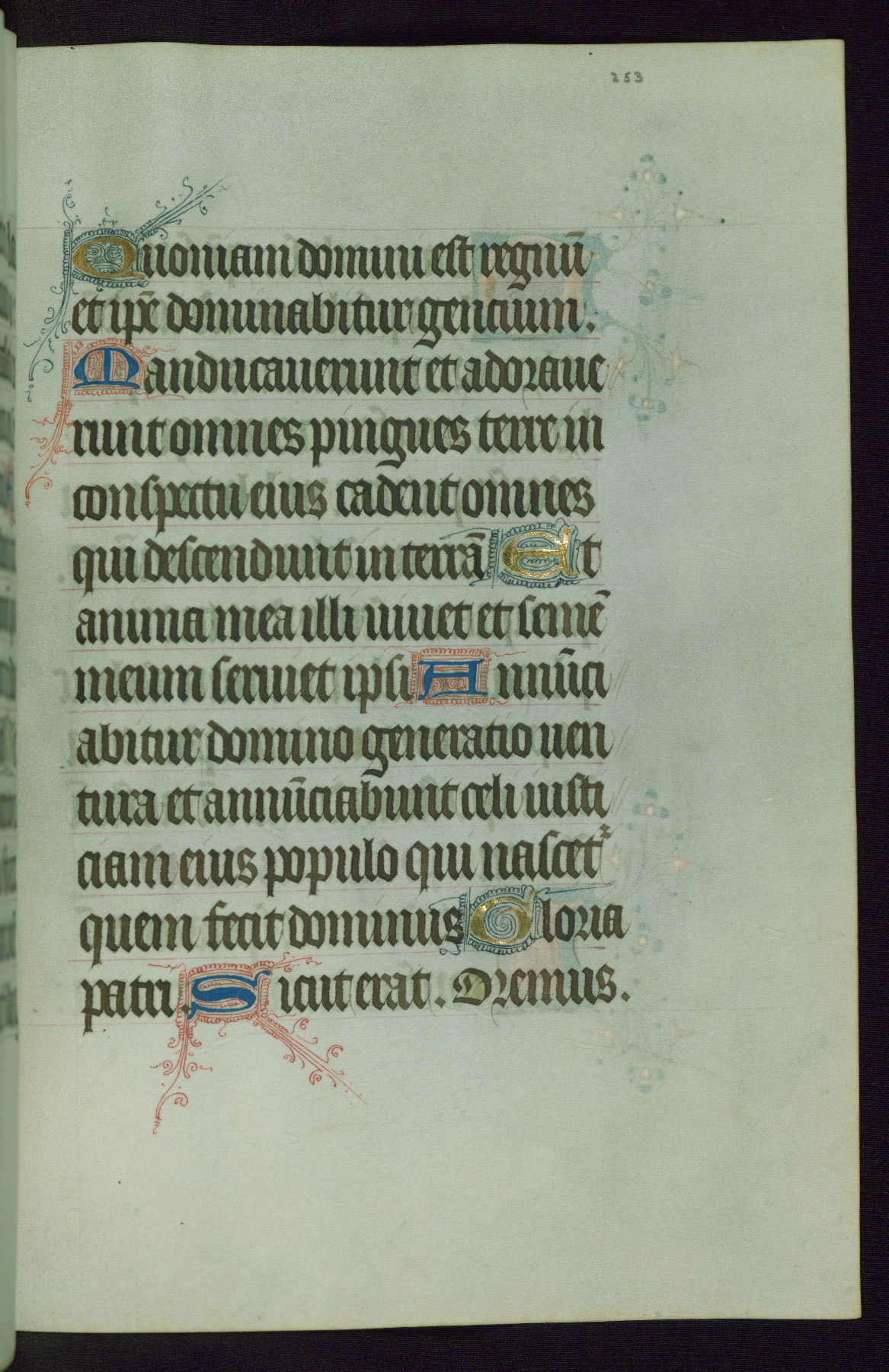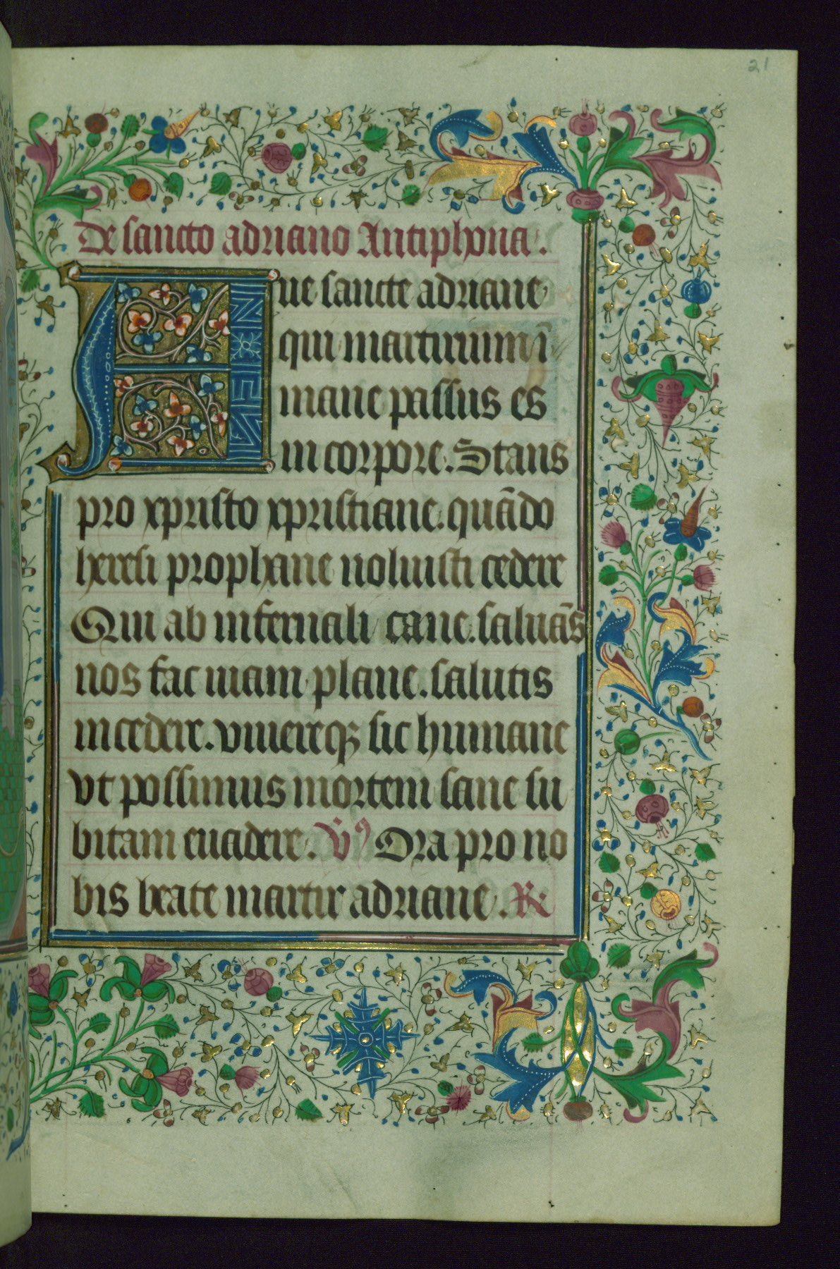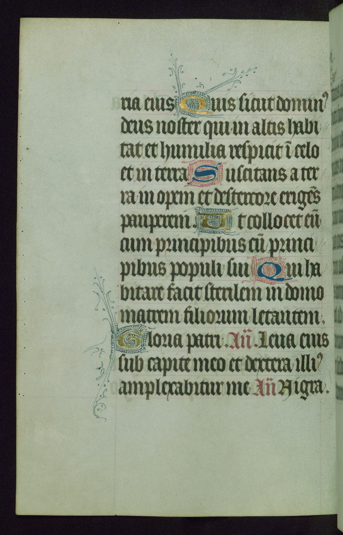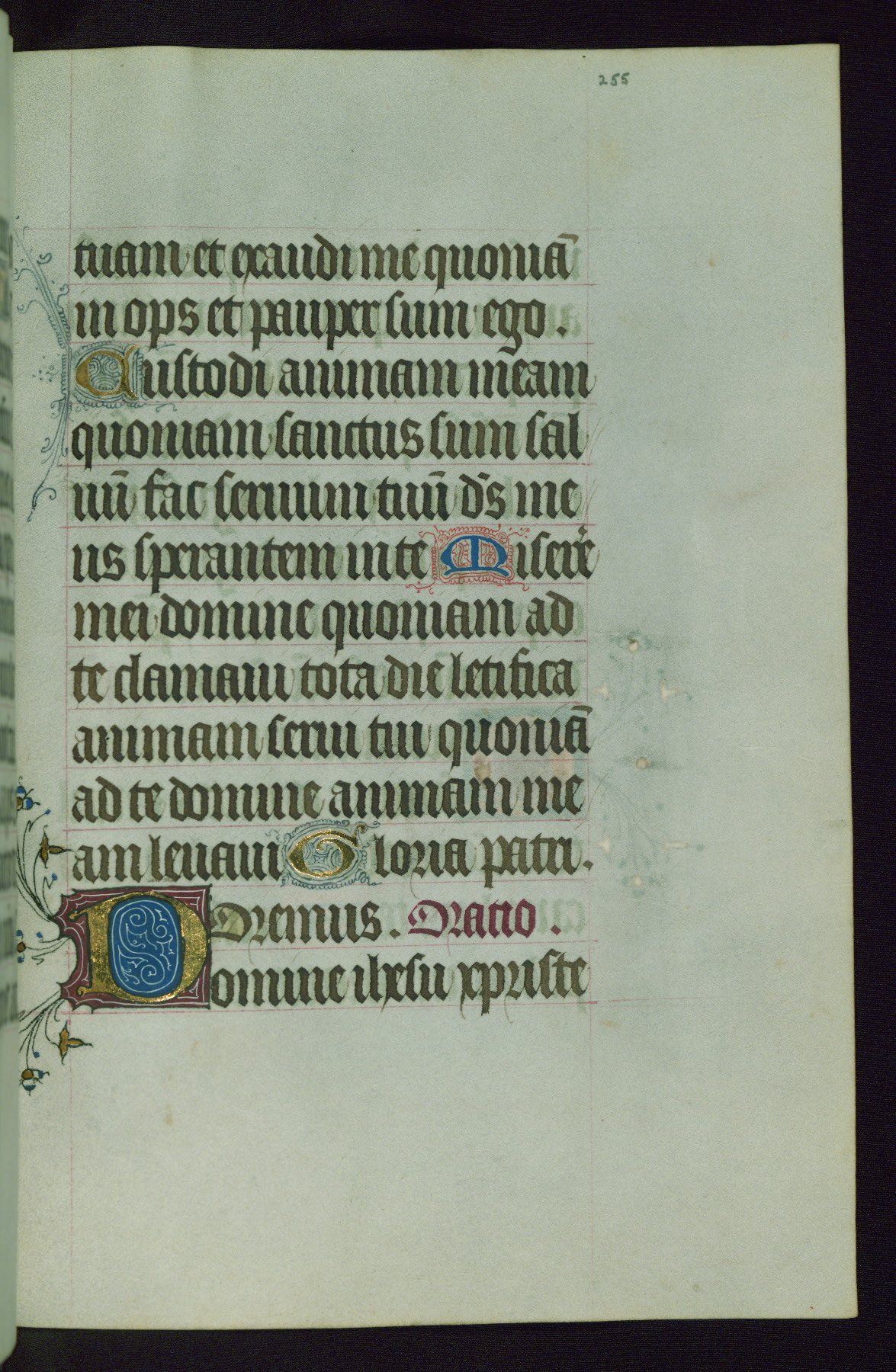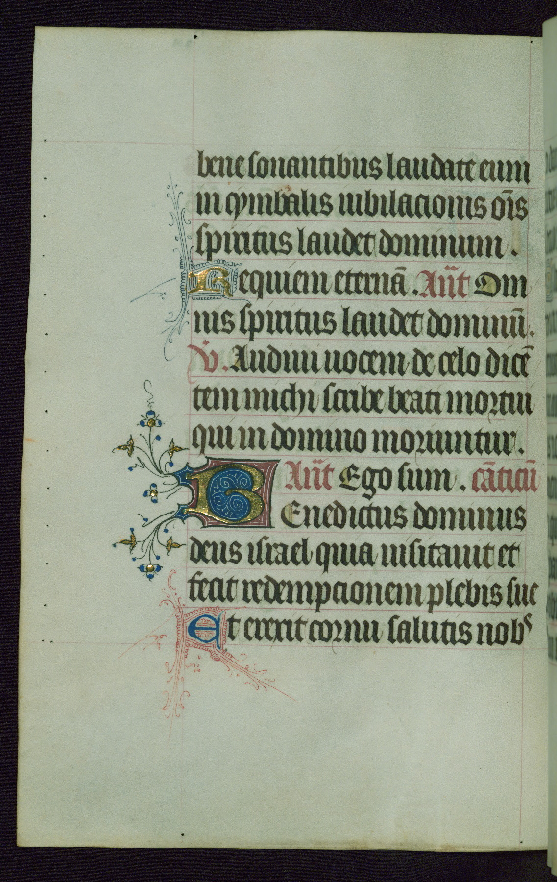 This Book of Hours, ca. 1460, was completed for use of Rome and illuminated under the influence, if not the direct participation, of Willem Vrelant. There remain twenty-two extant marginal calendar illustrations, thirteen extant full-page miniatures (many of which are paired with opening suffrages, perhaps suggesting a certain amount of significance to the owner), and one historiated initial. The contemporary binding, signed Livinus Stuaert, is dated 1477 and is most likely of Bruges or Ghent origin. It is thought that the first owner was French due to the French headings throughout and prominent fleur-de-lis figurations decorating the binding. Further, the first owner was likely female, suggested by the ways in which the book was structured to facilitate legibility. This is evinced by the large size of the script and the lack of abbreviations. While much of the text is standard, there remains evidence of personal significance and preference. This is seen in the chosen illuminations for those sections that are most significant to the owner. Most illuminations are paired with the opening page of staple Hours; however, many are accompanied by individual suffrages, constituting a large portion of the beginning of the manuscript. Personal preference is also shown in those sections of text that stray from the standard. The devotional sequence of this manuscript is notable for its sheer length and diversity of prayers as well as its inclusion of a French prayer not of official liturgy (fols. 215r-219v). The first collection of three prayers is headed and written in French. The prayer is attributed to St. Augustine and is described to guarantee a transformation of tribulation into joy through Christ's mercy, but only if the suppliant recites the prayer for thirty consecutive days. While it is not uncommon for evidence of an owner's predilections to surface in a Book of Hours, the particularly divergent features of this book allow readers to glean an intimate view of the patron.