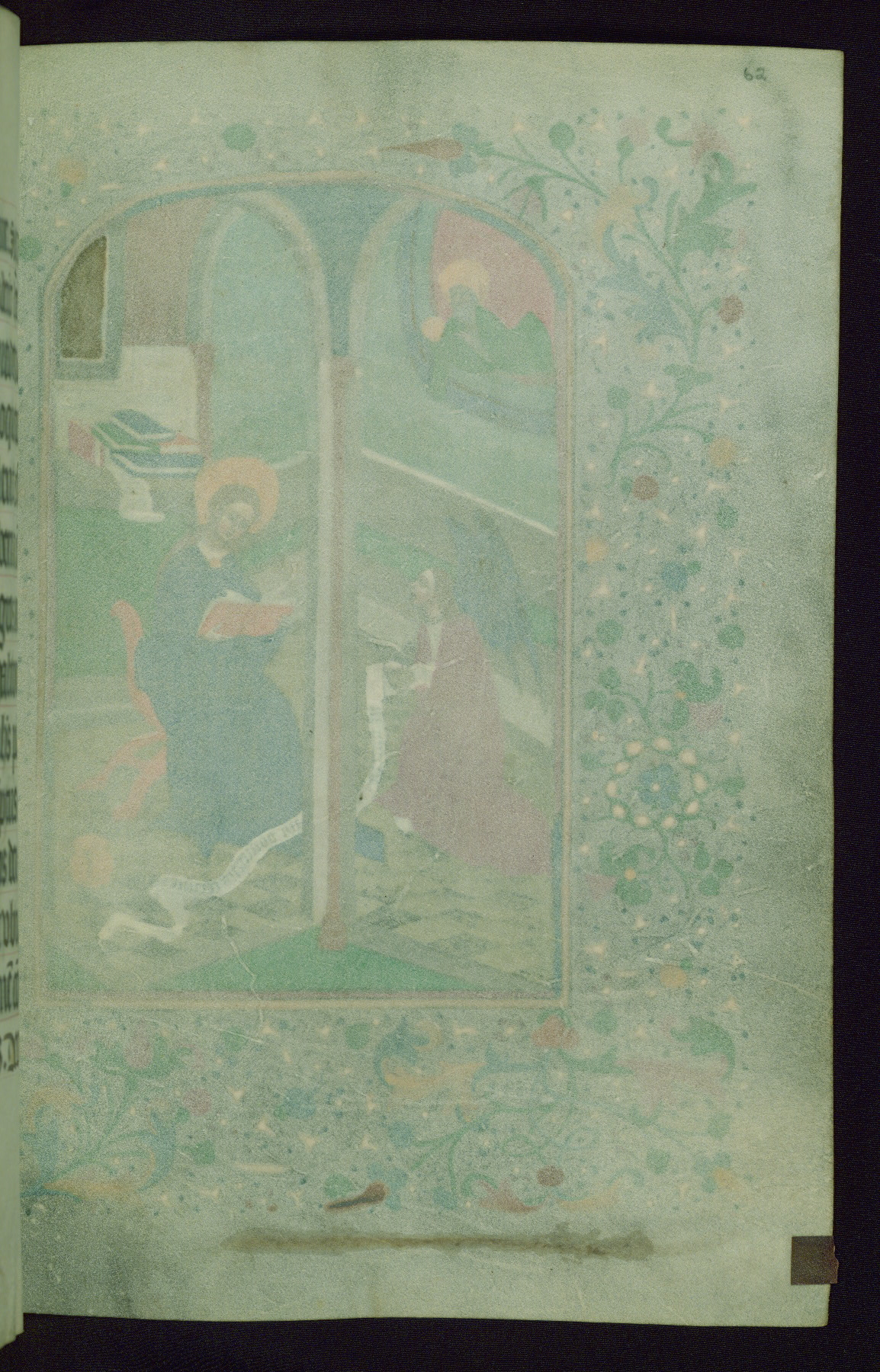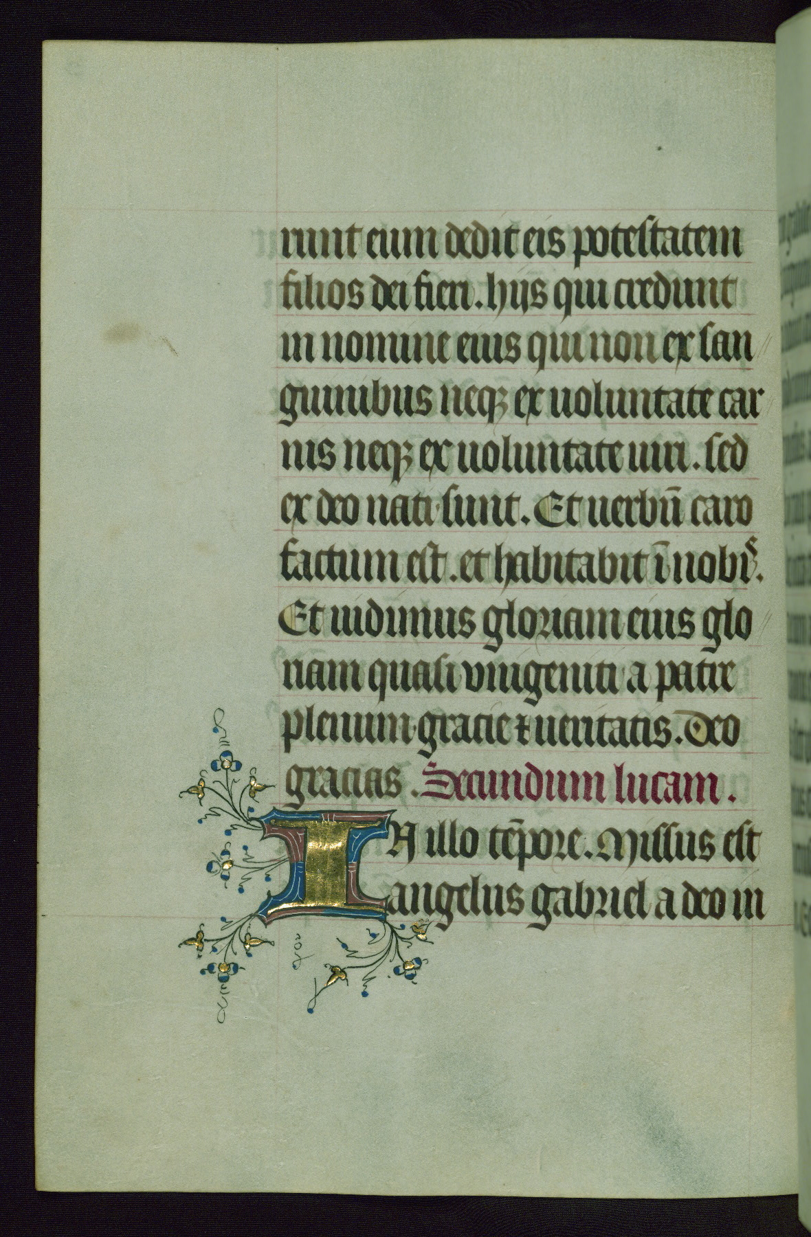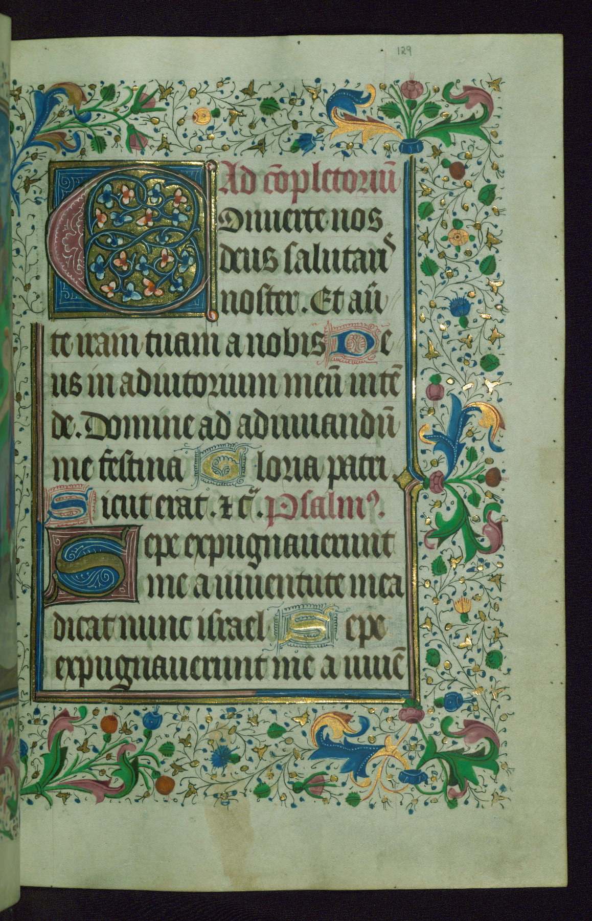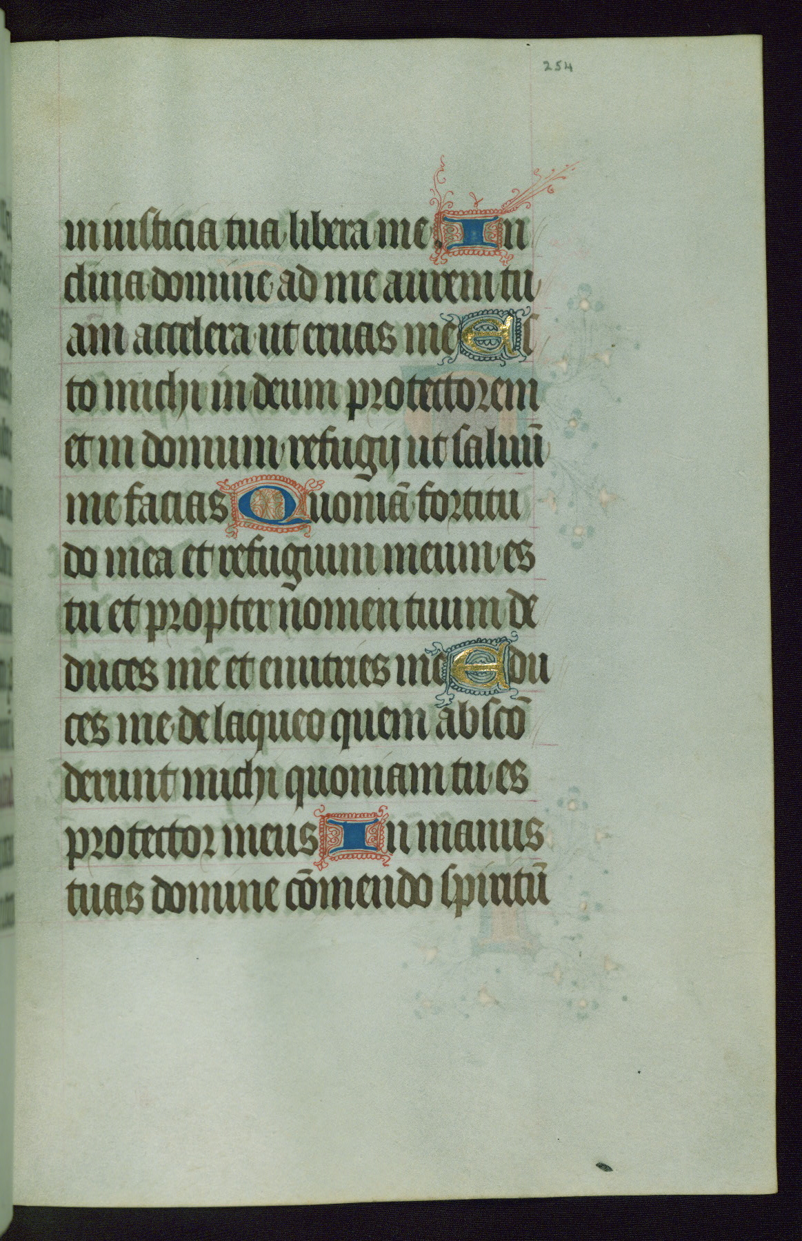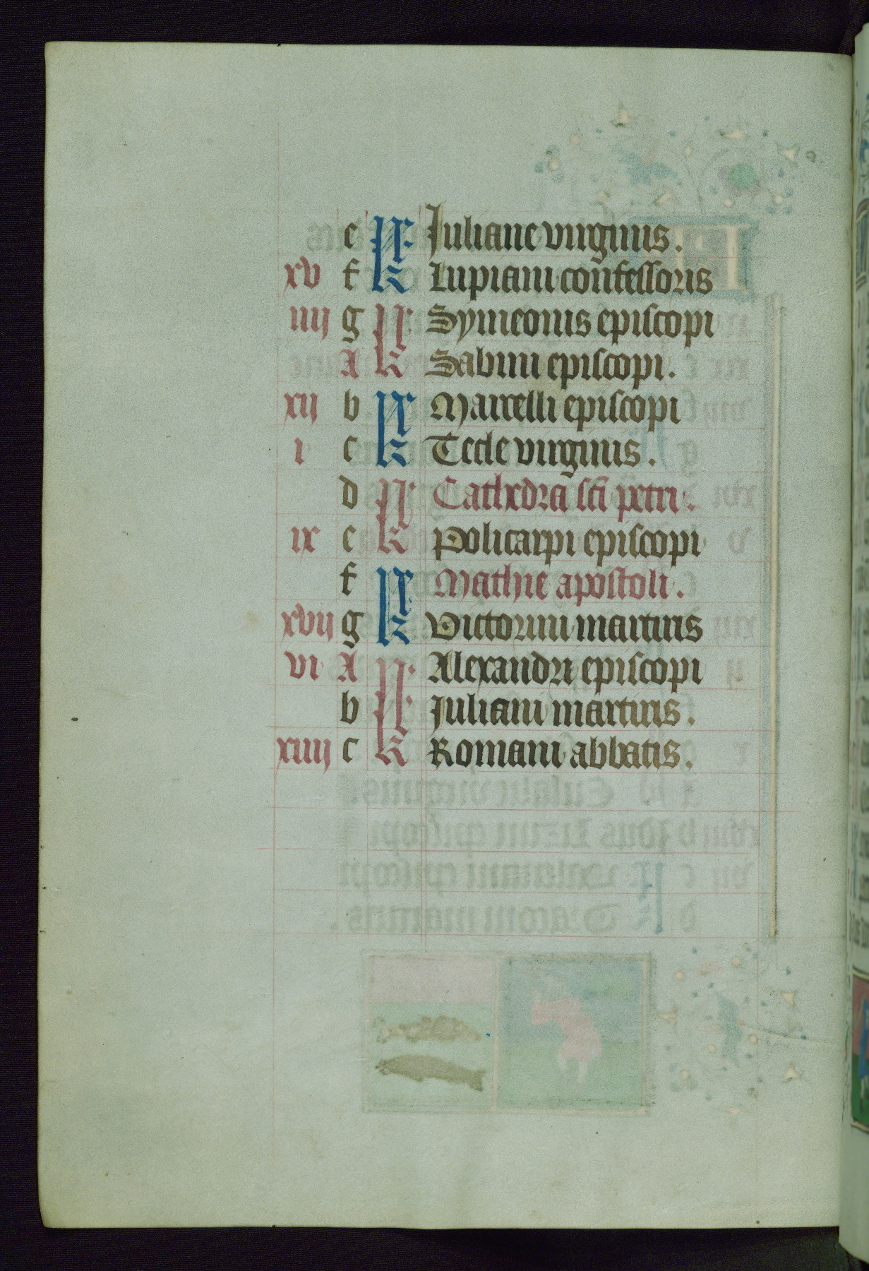 This Book of Hours, ca. 1460, was completed for use of Rome and illuminated under the influence, if not the direct participation, of Willem Vrelant. There remain twenty-two extant marginal calendar illustrations, thirteen extant full-page miniatures (many of which are paired with opening suffrages, perhaps suggesting a certain amount of significance to the owner), and one historiated initial. The contemporary binding, signed Livinus Stuaert, is dated 1477 and is most likely of Bruges or Ghent origin. It is thought that the first owner was French due to the French headings throughout and prominent fleur-de-lis figurations decorating the binding. Further, the first owner was likely female, suggested by the ways in which the book was structured to facilitate legibility. This is evinced by the large size of the script and the lack of abbreviations. While much of the text is standard, there remains evidence of personal significance and preference. This is seen in the chosen illuminations for those sections that are most significant to the owner. Most illuminations are paired with the opening page of staple Hours; however, many are accompanied by individual suffrages, constituting a large portion of the beginning of the manuscript. Personal preference is also shown in those sections of text that stray from the standard. The devotional sequence of this manuscript is notable for its sheer length and diversity of prayers as well as its inclusion of a French prayer not of official liturgy (fols. 215r-219v). The first collection of three prayers is headed and written in French. The prayer is attributed to St. Augustine and is described to guarantee a transformation of tribulation into joy through Christ's mercy, but only if the suppliant recites the prayer for thirty consecutive days. While it is not uncommon for evidence of an owner's predilections to surface in a Book of Hours, the particularly divergent features of this book allow readers to glean an intimate view of the patron.