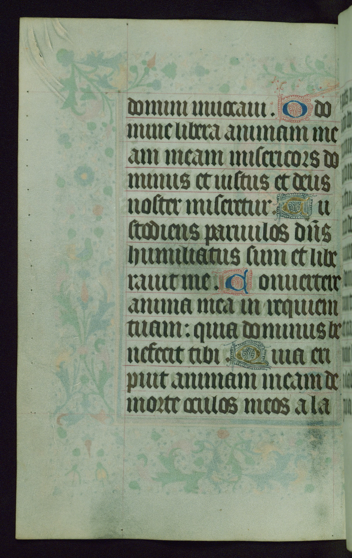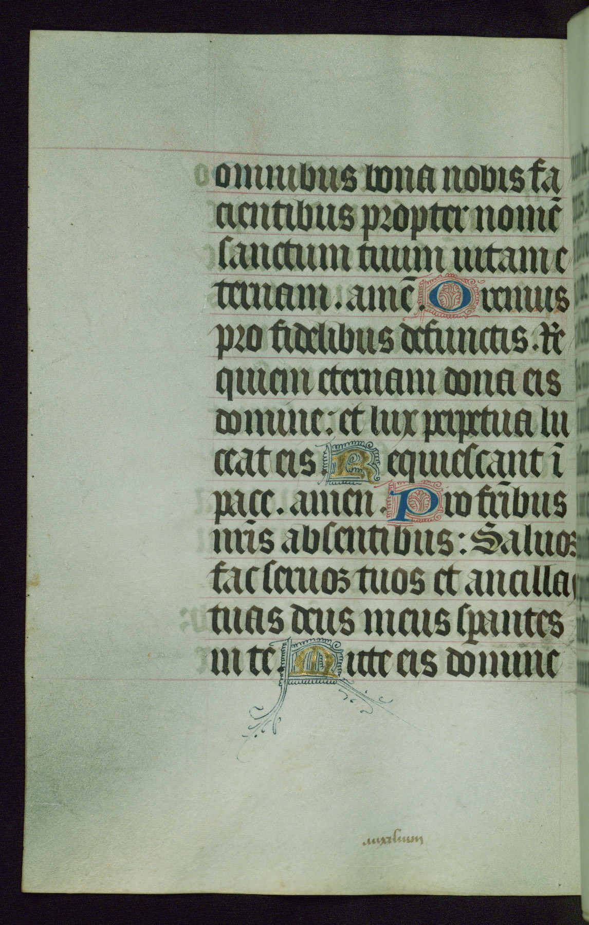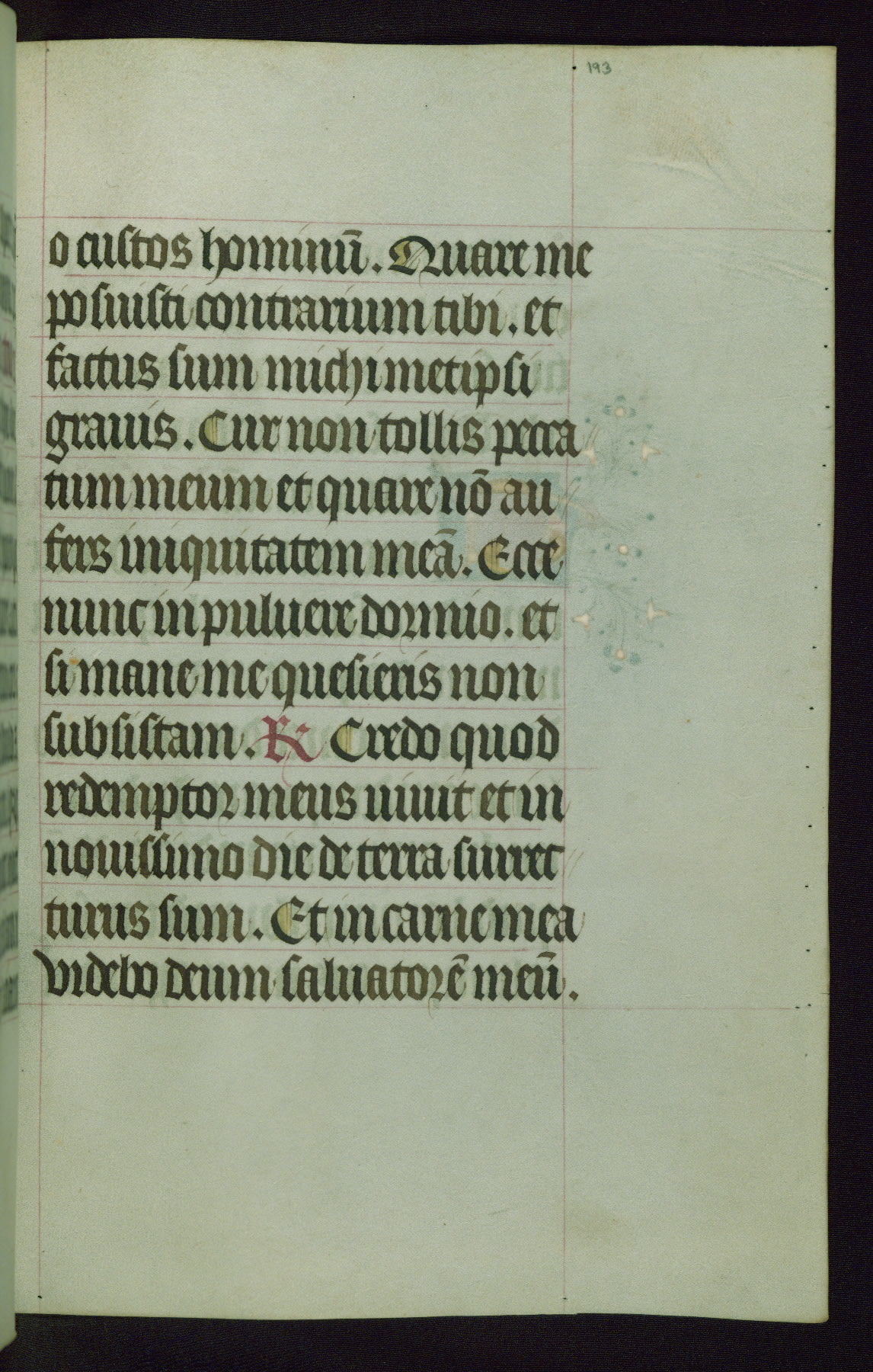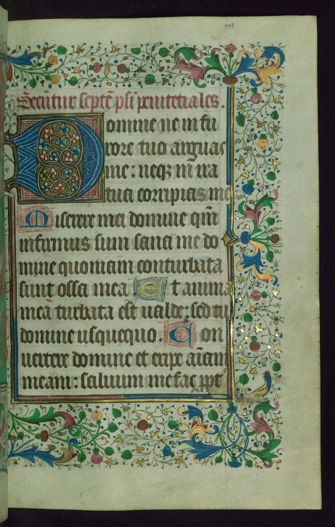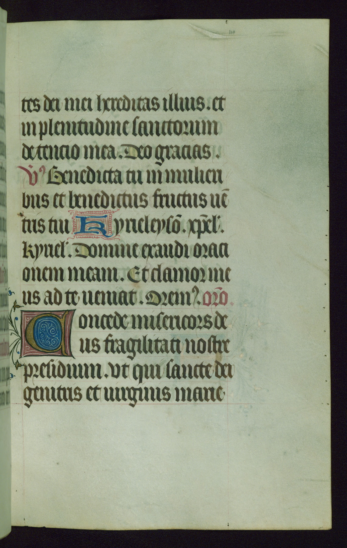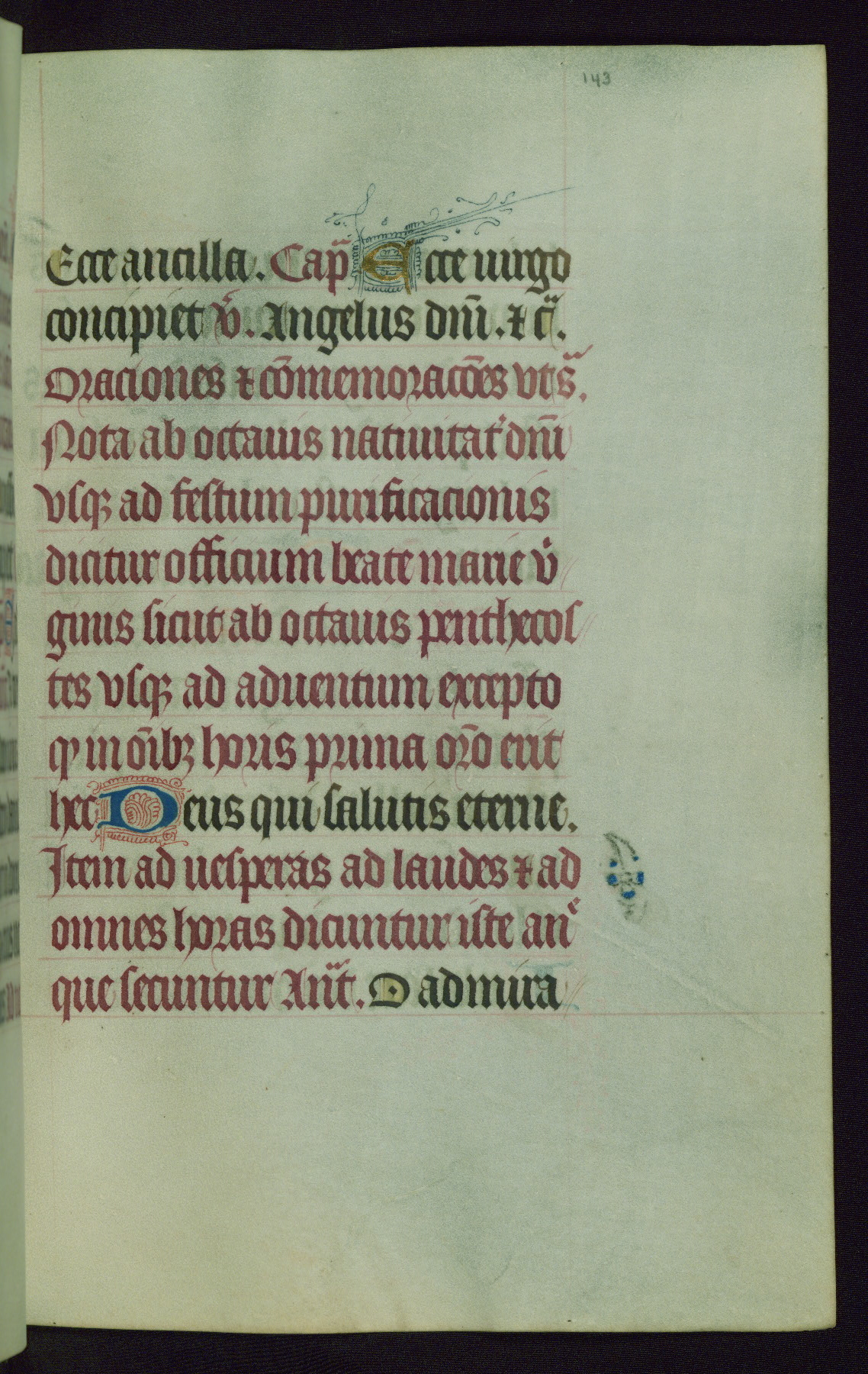 This Book of Hours, ca. 1460, was completed for use of Rome and illuminated under the influence, if not the direct participation, of Willem Vrelant. There remain twenty-two extant marginal calendar illustrations, thirteen extant full-page miniatures (many of which are paired with opening suffrages, perhaps suggesting a certain amount of significance to the owner), and one historiated initial. The contemporary binding, signed Livinus Stuaert, is dated 1477 and is most likely of Bruges or Ghent origin. It is thought that the first owner was French due to the French headings throughout and prominent fleur-de-lis figurations decorating the binding. Further, the first owner was likely female, suggested by the ways in which the book was structured to facilitate legibility. This is evinced by the large size of the script and the lack of abbreviations. While much of the text is standard, there remains evidence of personal significance and preference. This is seen in the chosen illuminations for those sections that are most significant to the owner. Most illuminations are paired with the opening page of staple Hours; however, many are accompanied by individual suffrages, constituting a large portion of the beginning of the manuscript. Personal preference is also shown in those sections of text that stray from the standard. The devotional sequence of this manuscript is notable for its sheer length and diversity of prayers as well as its inclusion of a French prayer not of official liturgy (fols. 215r-219v). The first collection of three prayers is headed and written in French. The prayer is attributed to St. Augustine and is described to guarantee a transformation of tribulation into joy through Christ's mercy, but only if the suppliant recites the prayer for thirty consecutive days. While it is not uncommon for evidence of an owner's predilections to surface in a Book of Hours, the particularly divergent features of this book allow readers to glean an intimate view of the patron.
