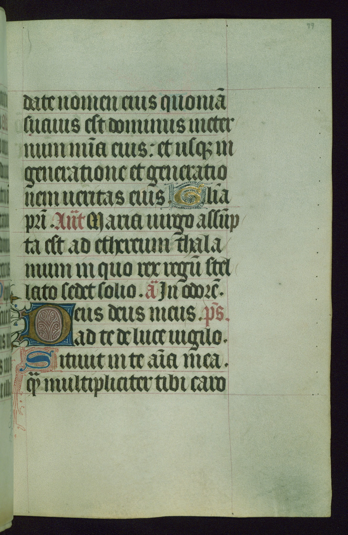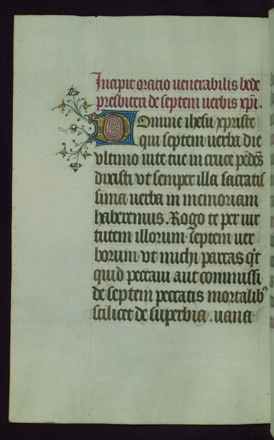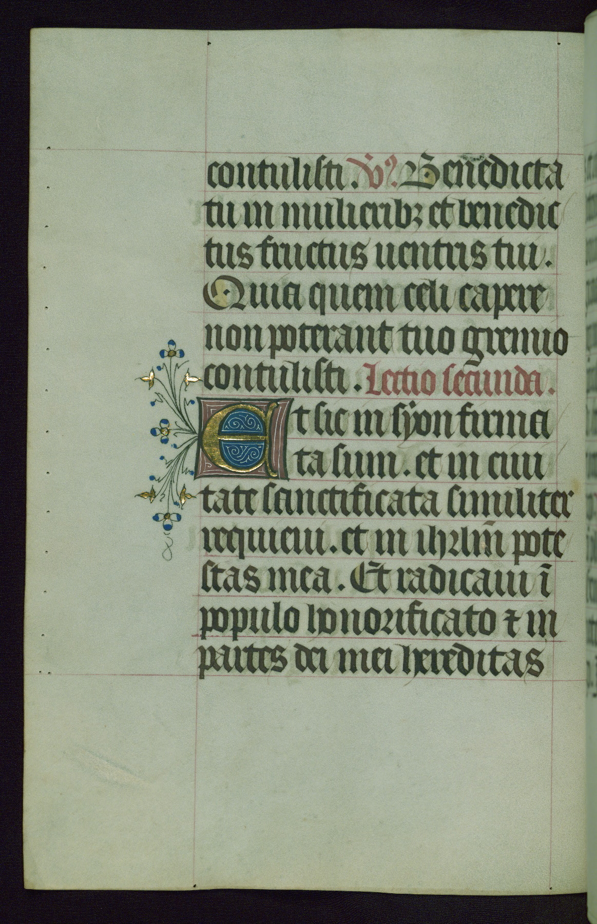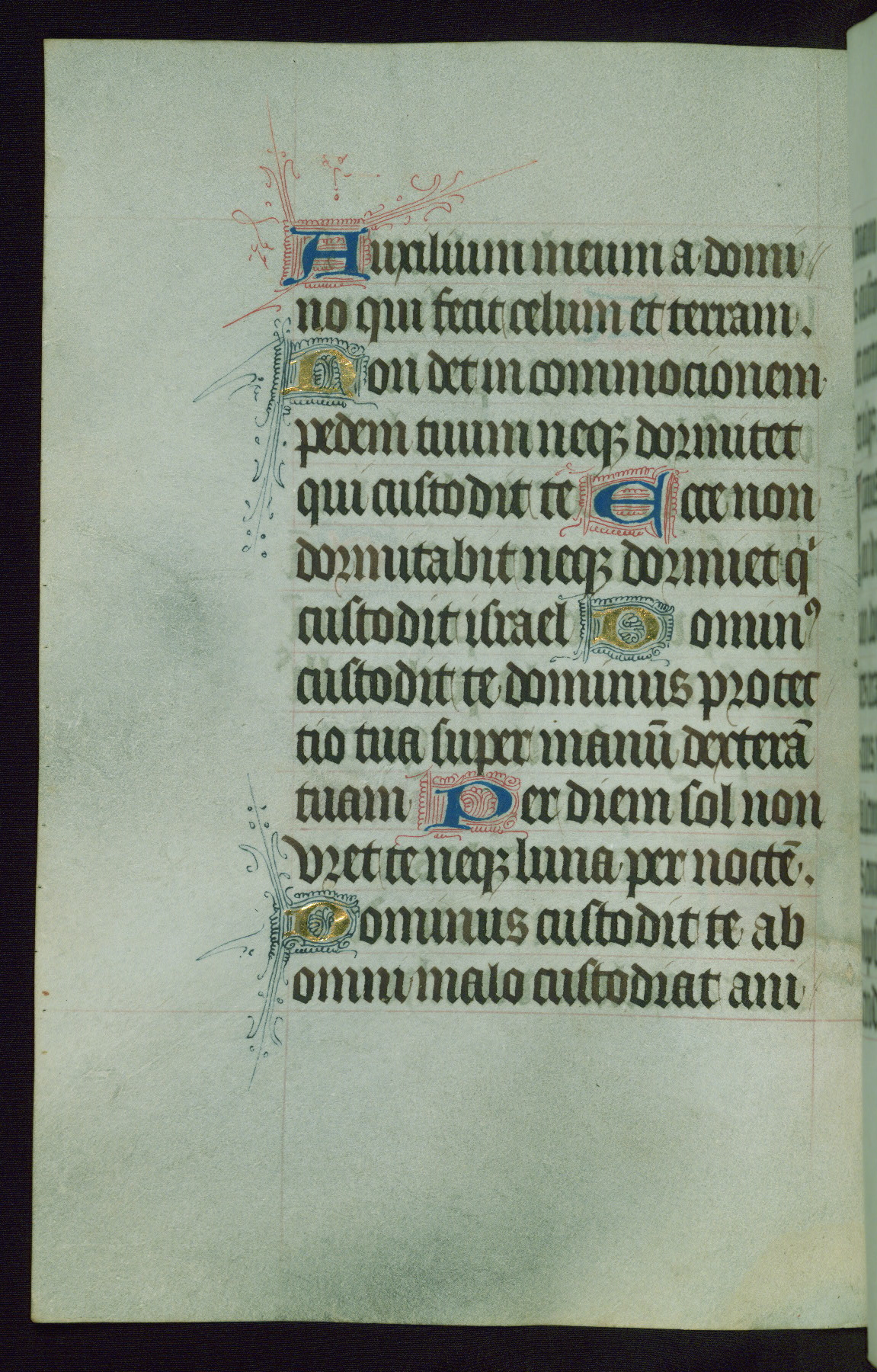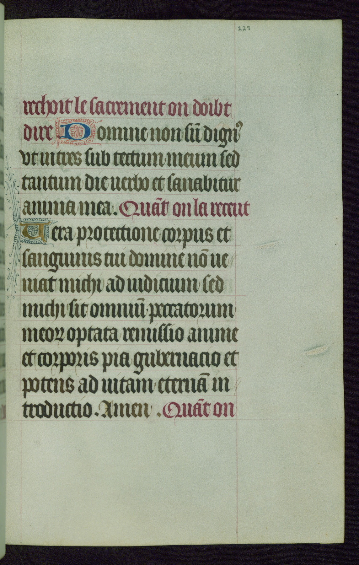 This Book of Hours, ca. 1460, was completed for use of Rome and illuminated under the influence, if not the direct participation, of Willem Vrelant. There remain twenty-two extant marginal calendar illustrations, thirteen extant full-page miniatures (many of which are paired with opening suffrages, perhaps suggesting a certain amount of significance to the owner), and one historiated initial. The contemporary binding, signed Livinus Stuaert, is dated 1477 and is most likely of Bruges or Ghent origin. It is thought that the first owner was French due to the French headings throughout and prominent fleur-de-lis figurations decorating the binding. Further, the first owner was likely female, suggested by the ways in which the book was structured to facilitate legibility. This is evinced by the large size of the script and the lack of abbreviations. While much of the text is standard, there remains evidence of personal significance and preference. This is seen in the chosen illuminations for those sections that are most significant to the owner. Most illuminations are paired with the opening page of staple Hours; however, many are accompanied by individual suffrages, constituting a large portion of the beginning of the manuscript. Personal preference is also shown in those sections of text that stray from the standard. The devotional sequence of this manuscript is notable for its sheer length and diversity of prayers as well as its inclusion of a French prayer not of official liturgy (fols. 215r-219v). The first collection of three prayers is headed and written in French. The prayer is attributed to St. Augustine and is described to guarantee a transformation of tribulation into joy through Christ's mercy, but only if the suppliant recites the prayer for thirty consecutive days. While it is not uncommon for evidence of an owner's predilections to surface in a Book of Hours, the particularly divergent features of this book allow readers to glean an intimate view of the patron.