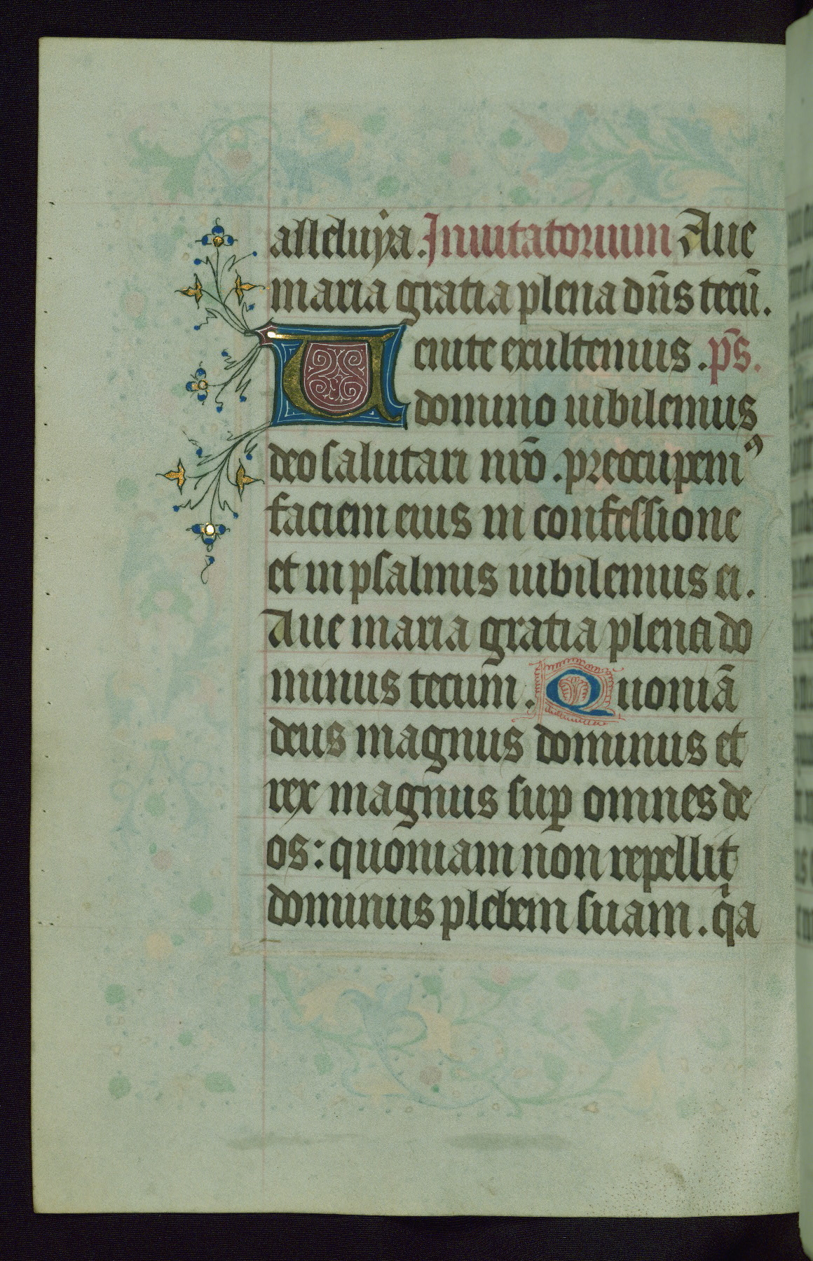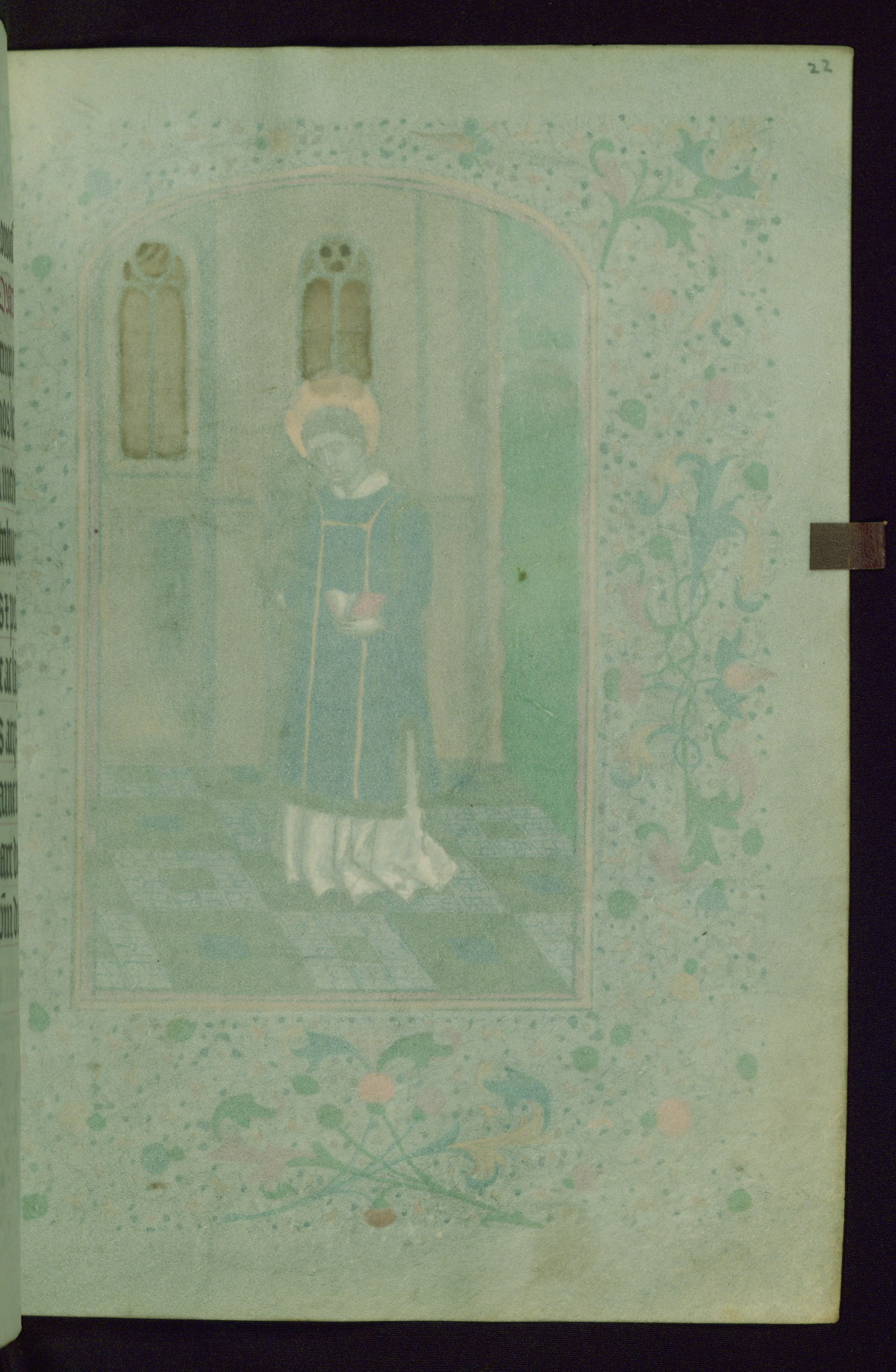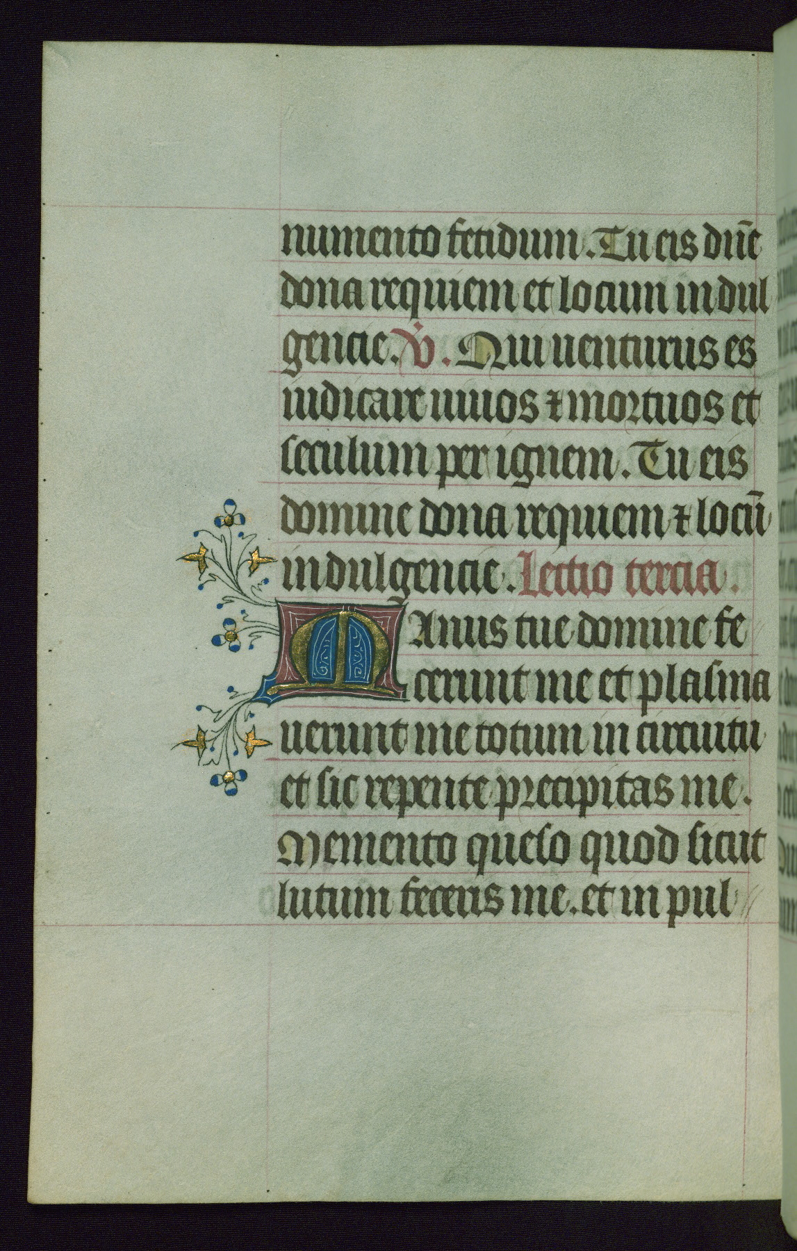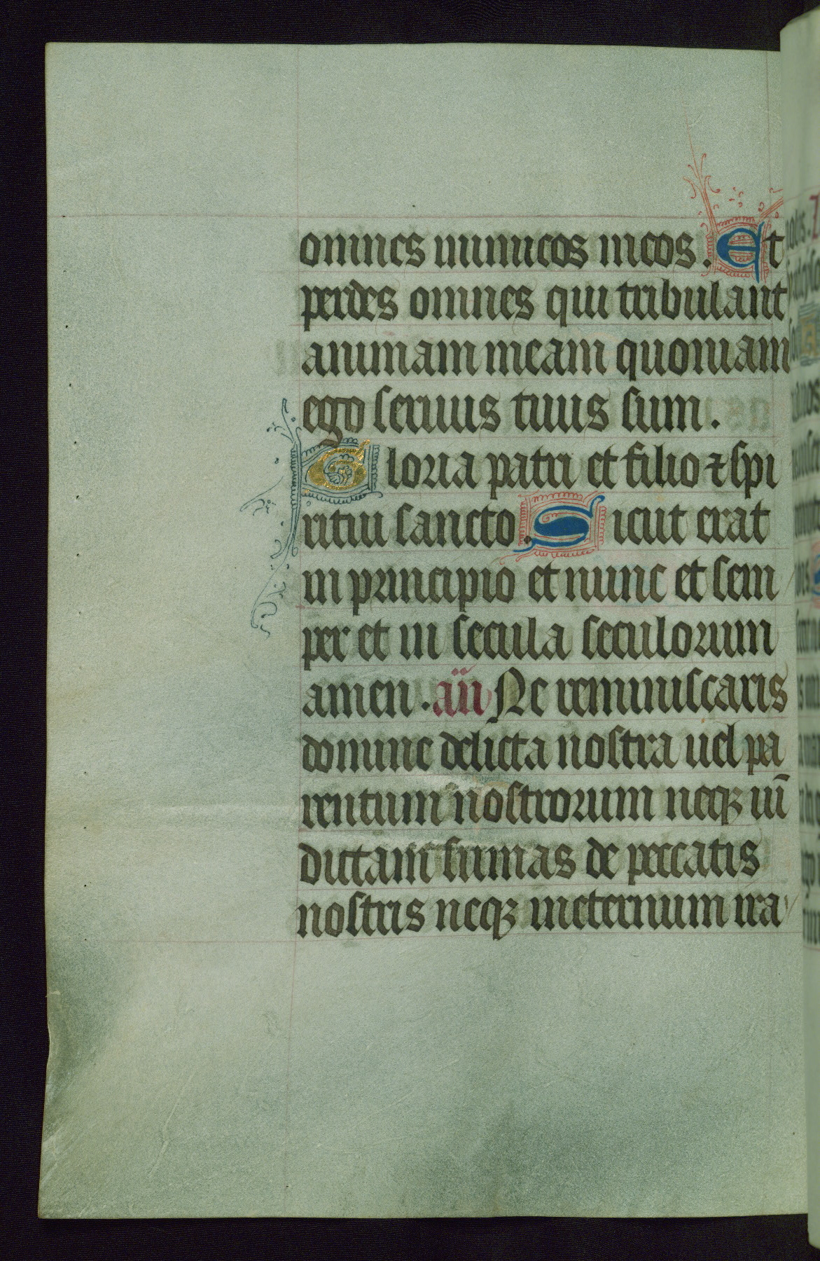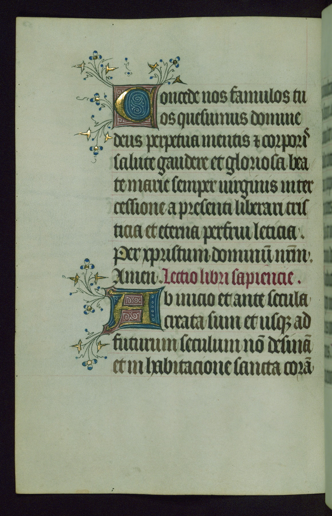 This Book of Hours, ca. 1460, was completed for use of Rome and illuminated under the influence, if not the direct participation, of Willem Vrelant. There remain twenty-two extant marginal calendar illustrations, thirteen extant full-page miniatures (many of which are paired with opening suffrages, perhaps suggesting a certain amount of significance to the owner), and one historiated initial. The contemporary binding, signed Livinus Stuaert, is dated 1477 and is most likely of Bruges or Ghent origin. It is thought that the first owner was French due to the French headings throughout and prominent fleur-de-lis figurations decorating the binding. Further, the first owner was likely female, suggested by the ways in which the book was structured to facilitate legibility. This is evinced by the large size of the script and the lack of abbreviations. While much of the text is standard, there remains evidence of personal significance and preference. This is seen in the chosen illuminations for those sections that are most significant to the owner. Most illuminations are paired with the opening page of staple Hours; however, many are accompanied by individual suffrages, constituting a large portion of the beginning of the manuscript. Personal preference is also shown in those sections of text that stray from the standard. The devotional sequence of this manuscript is notable for its sheer length and diversity of prayers as well as its inclusion of a French prayer not of official liturgy (fols. 215r-219v). The first collection of three prayers is headed and written in French. The prayer is attributed to St. Augustine and is described to guarantee a transformation of tribulation into joy through Christ's mercy, but only if the suppliant recites the prayer for thirty consecutive days. While it is not uncommon for evidence of an owner's predilections to surface in a Book of Hours, the particularly divergent features of this book allow readers to glean an intimate view of the patron.