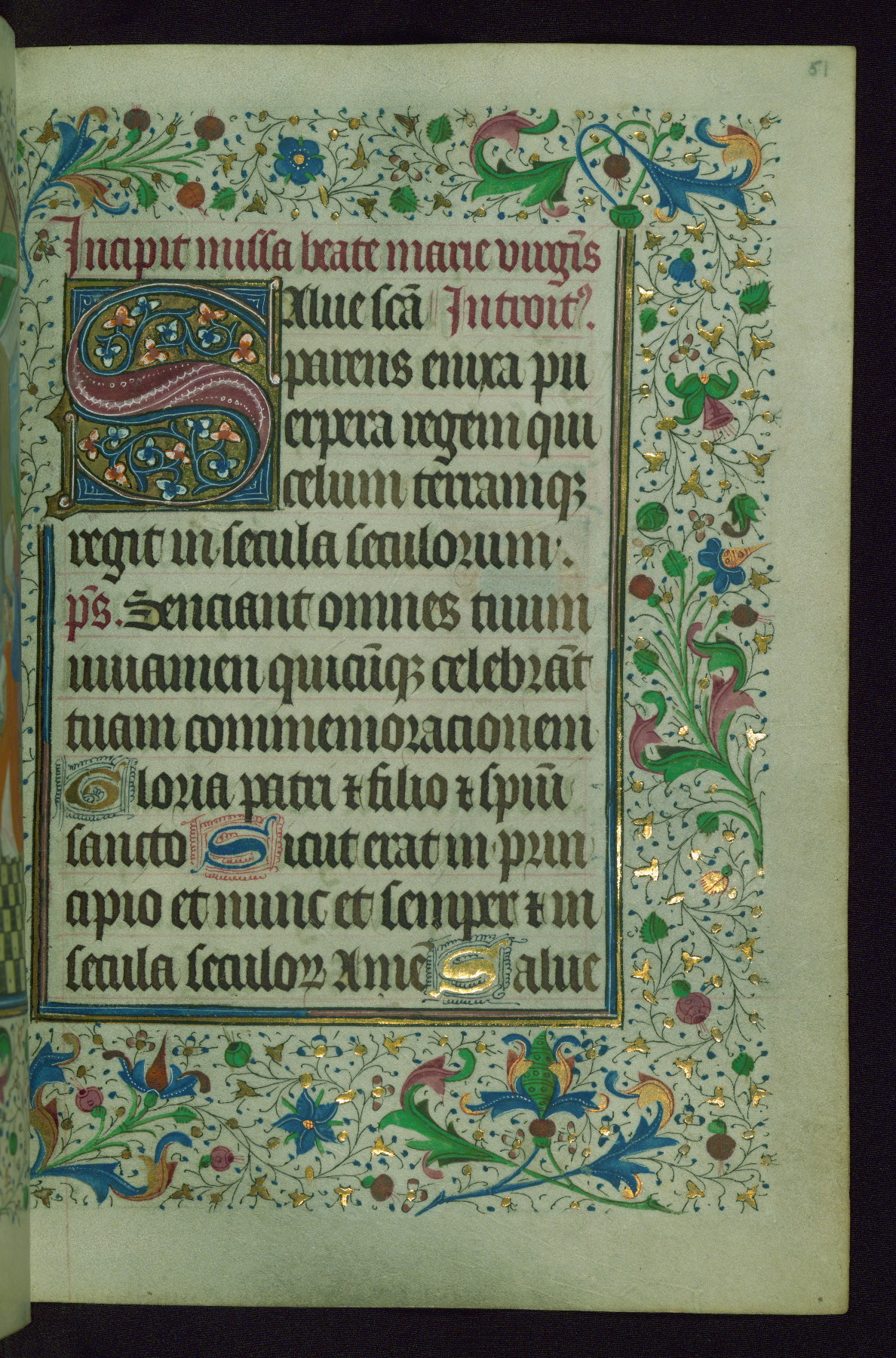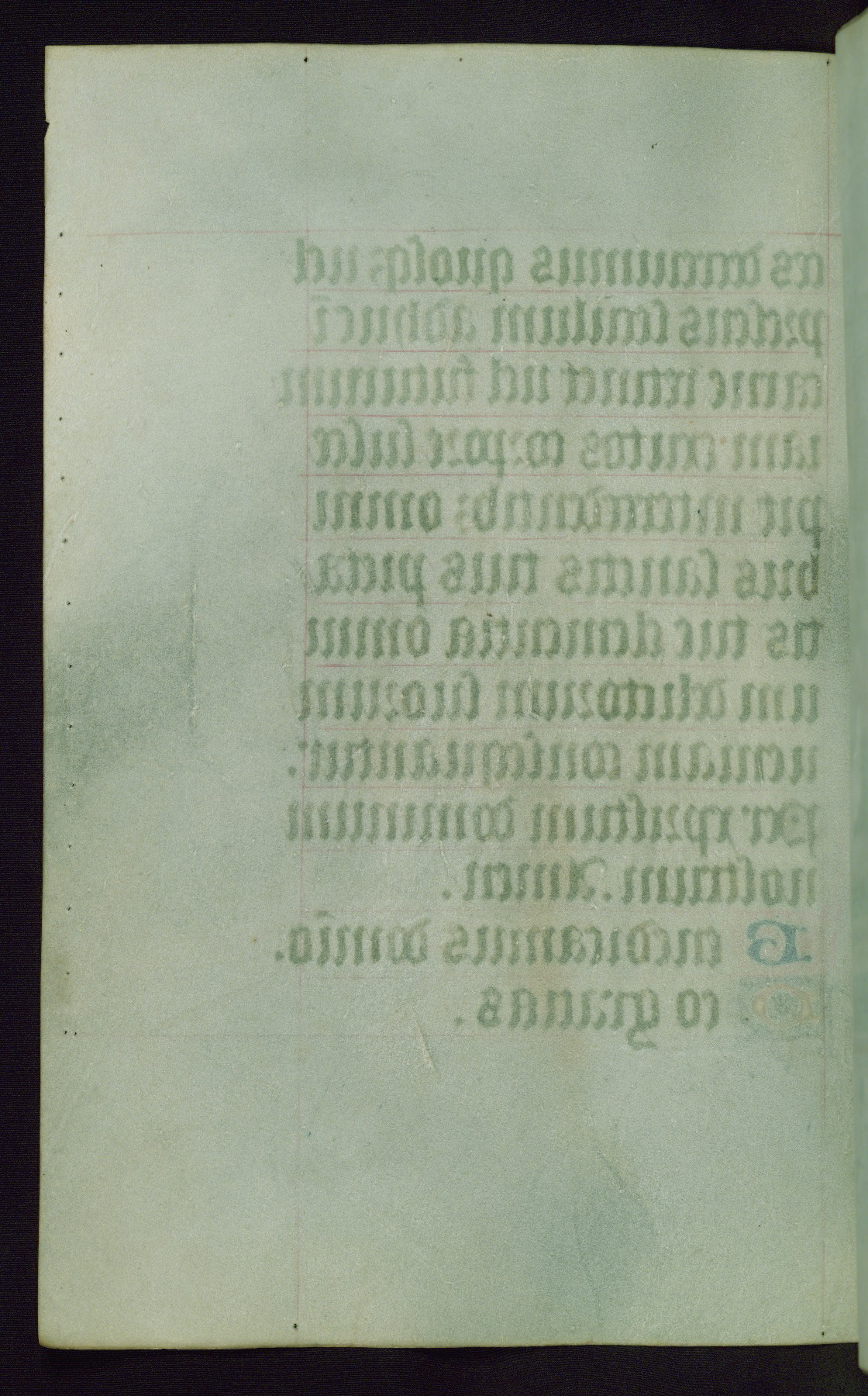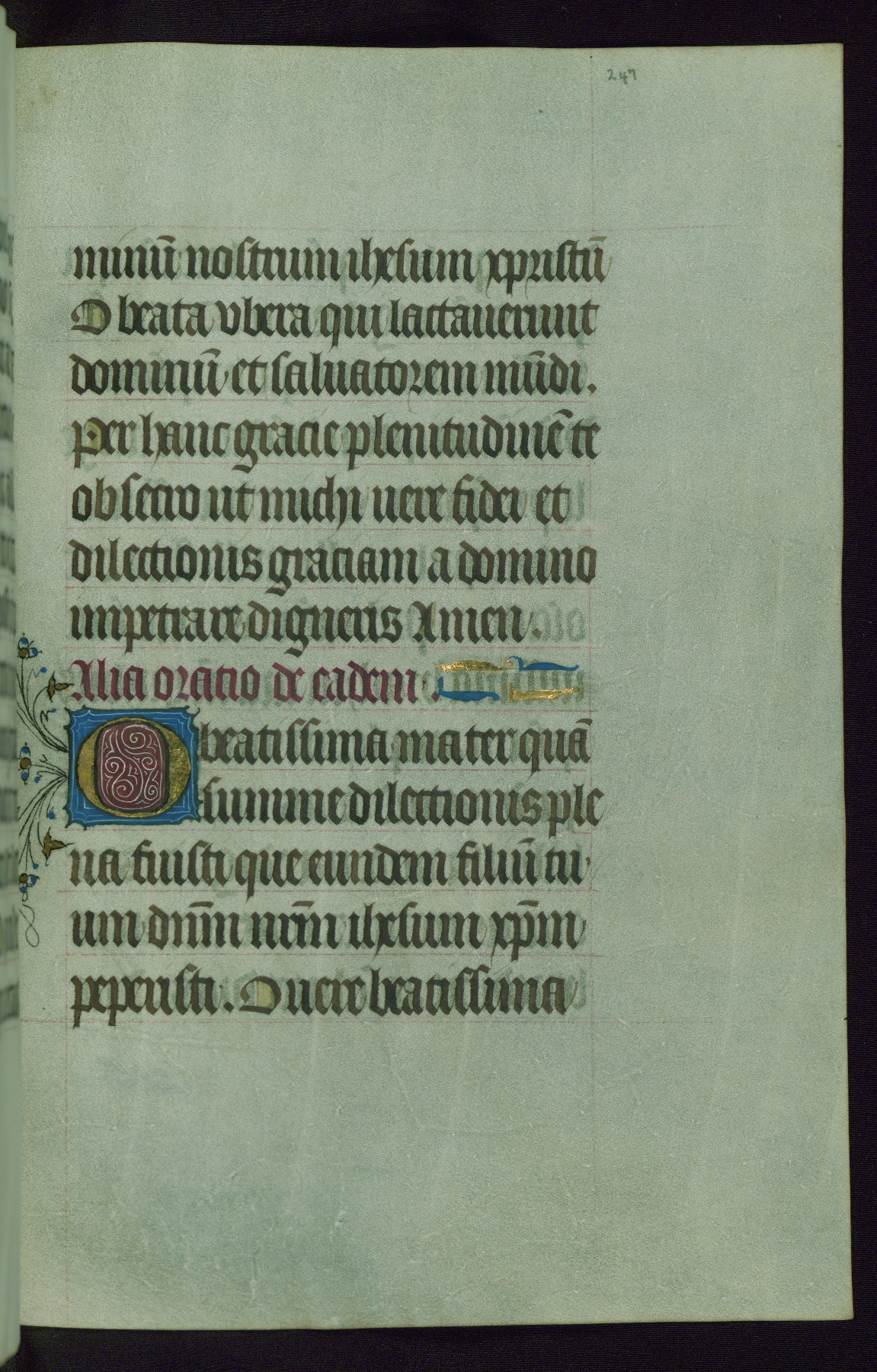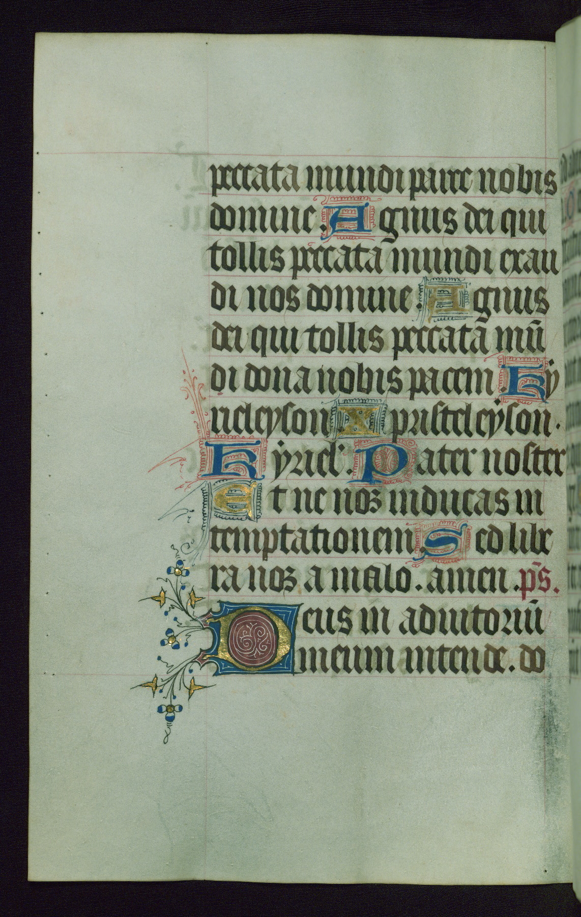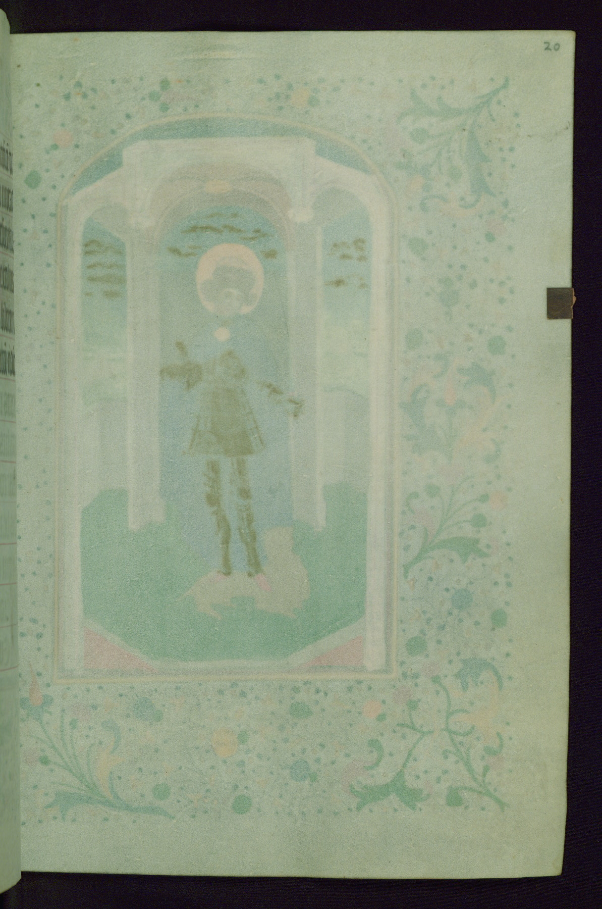This Book of Hours, ca. 1460, was completed for use of Rome and illuminated under the influence, if not the direct participation, of Willem Vrelant. There remain twenty-two extant marginal calendar illustrations, thirteen extant full-page miniatures (many of which are paired with opening suffrages, perhaps suggesting a certain amount of significance to the owner), and one historiated initial. The contemporary binding, signed Livinus Stuaert, is dated 1477 and is most likely of Bruges or Ghent origin. It is thought that the first owner was French due to the French headings throughout and prominent fleur-de-lis figurations decorating the binding. Further, the first owner was likely female, suggested by the ways in which the book was structured to facilitate legibility. This is evinced by the large size of the script and the lack of abbreviations. While much of the text is standard, there remains evidence of personal significance and preference. This is seen in the chosen illuminations for those sections that are most significant to the owner. Most illuminations are paired with the opening page of staple Hours; however, many are accompanied by individual suffrages, constituting a large portion of the beginning of the manuscript. Personal preference is also shown in those sections of text that stray from the standard. The devotional sequence of this manuscript is notable for its sheer length and diversity of prayers as well as its inclusion of a French prayer not of official liturgy (fols. 215r-219v). The first collection of three prayers is headed and written in French. The prayer is attributed to St. Augustine and is described to guarantee a transformation of tribulation into joy through Christ's mercy, but only if the suppliant recites the prayer for thirty consecutive days. While it is not uncommon for evidence of an owner's predilections to surface in a Book of Hours, the particularly divergent features of this book allow readers to glean an intimate view of the patron.