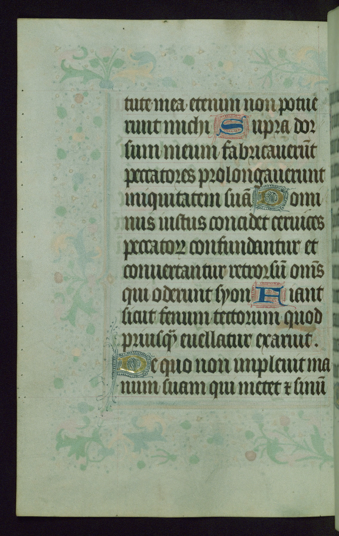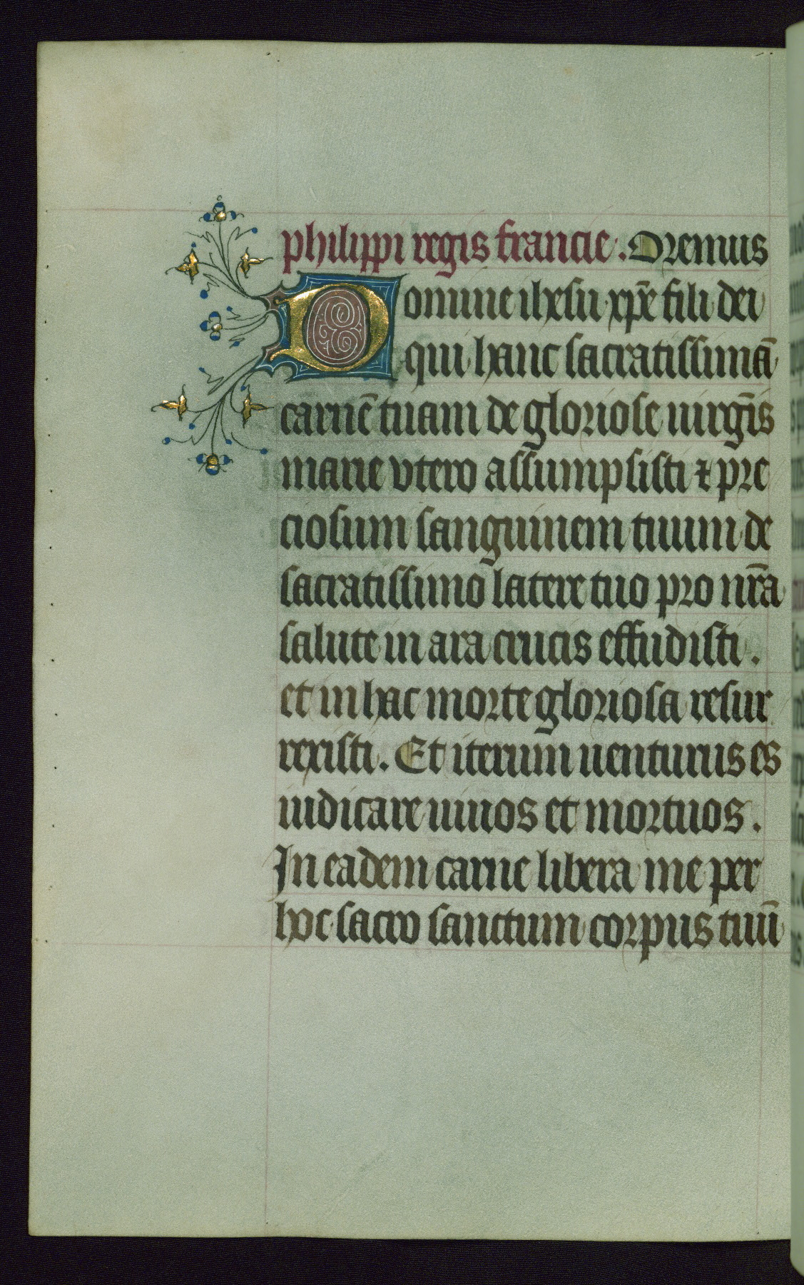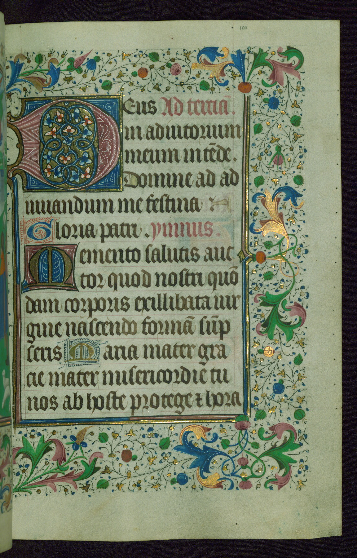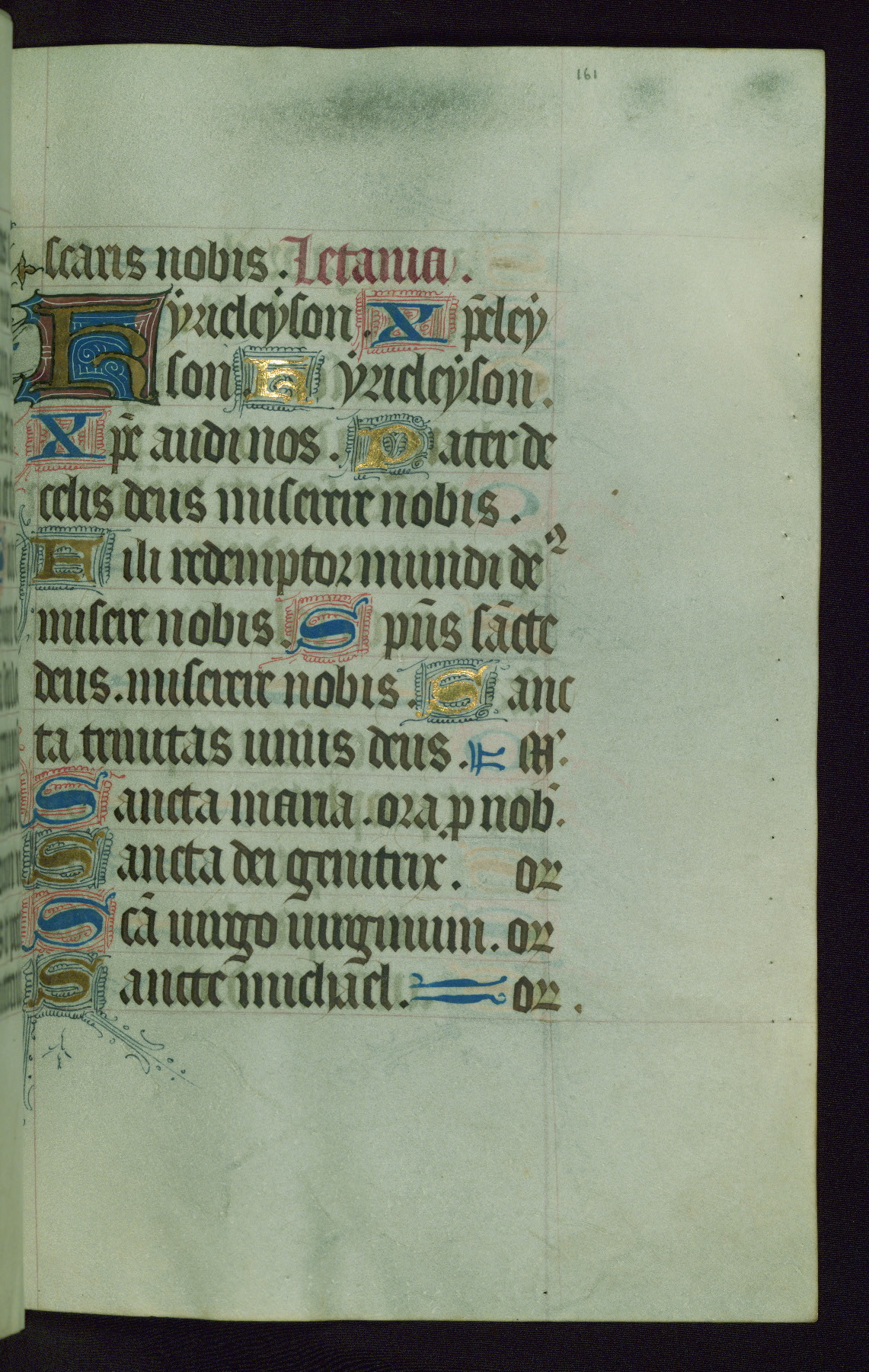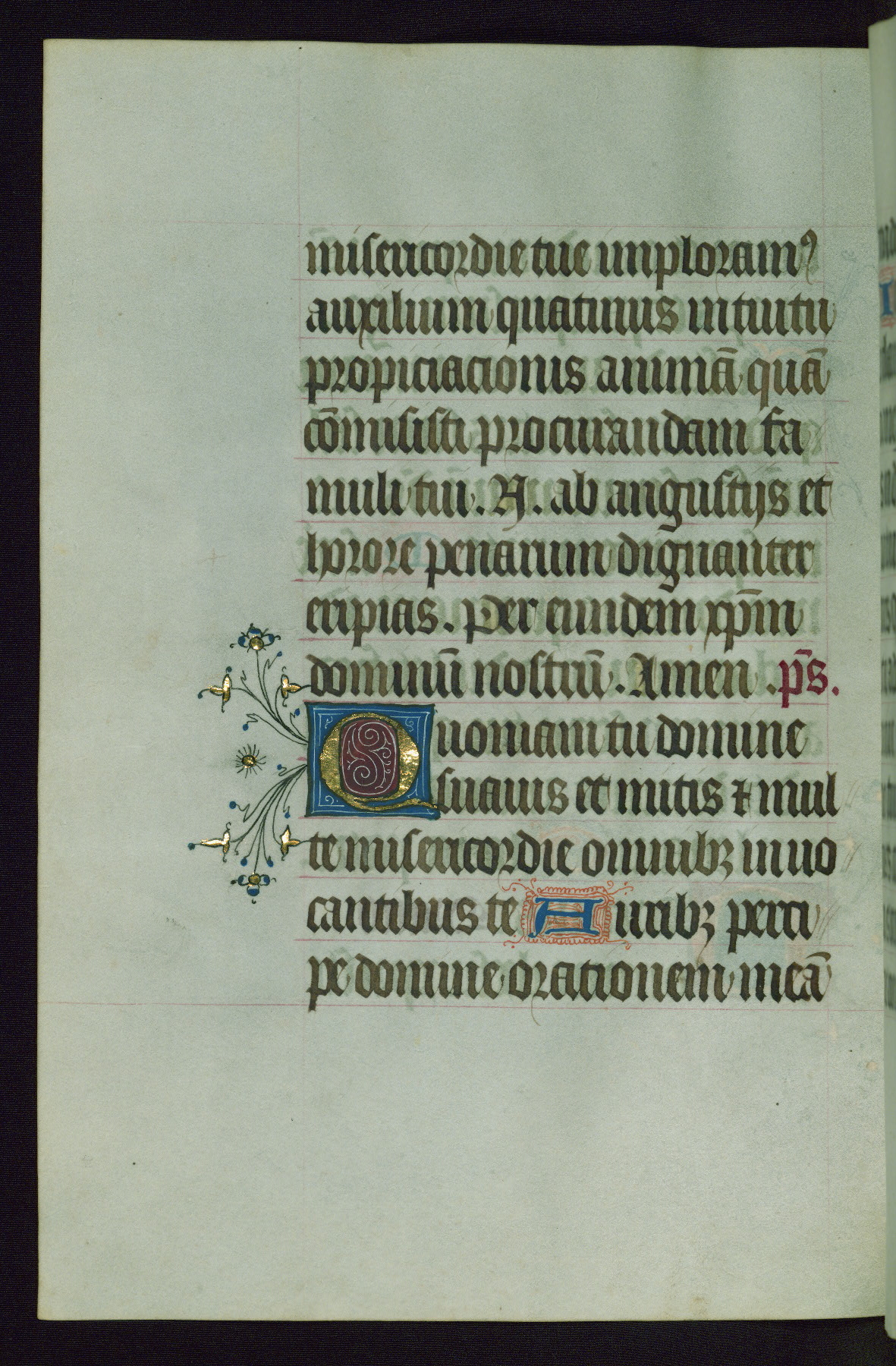 This Book of Hours, ca. 1460, was completed for use of Rome and illuminated under the influence, if not the direct participation, of Willem Vrelant. There remain twenty-two extant marginal calendar illustrations, thirteen extant full-page miniatures (many of which are paired with opening suffrages, perhaps suggesting a certain amount of significance to the owner), and one historiated initial. The contemporary binding, signed Livinus Stuaert, is dated 1477 and is most likely of Bruges or Ghent origin. It is thought that the first owner was French due to the French headings throughout and prominent fleur-de-lis figurations decorating the binding. Further, the first owner was likely female, suggested by the ways in which the book was structured to facilitate legibility. This is evinced by the large size of the script and the lack of abbreviations. While much of the text is standard, there remains evidence of personal significance and preference. This is seen in the chosen illuminations for those sections that are most significant to the owner. Most illuminations are paired with the opening page of staple Hours; however, many are accompanied by individual suffrages, constituting a large portion of the beginning of the manuscript. Personal preference is also shown in those sections of text that stray from the standard. The devotional sequence of this manuscript is notable for its sheer length and diversity of prayers as well as its inclusion of a French prayer not of official liturgy (fols. 215r-219v). The first collection of three prayers is headed and written in French. The prayer is attributed to St. Augustine and is described to guarantee a transformation of tribulation into joy through Christ's mercy, but only if the suppliant recites the prayer for thirty consecutive days. While it is not uncommon for evidence of an owner's predilections to surface in a Book of Hours, the particularly divergent features of this book allow readers to glean an intimate view of the patron.