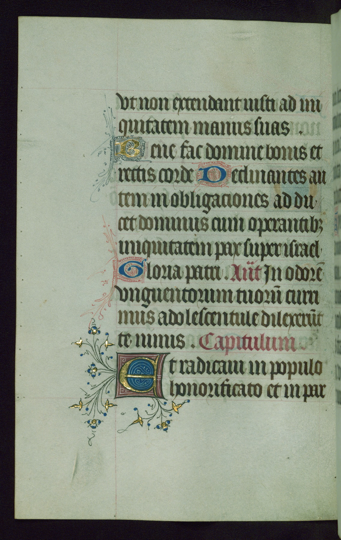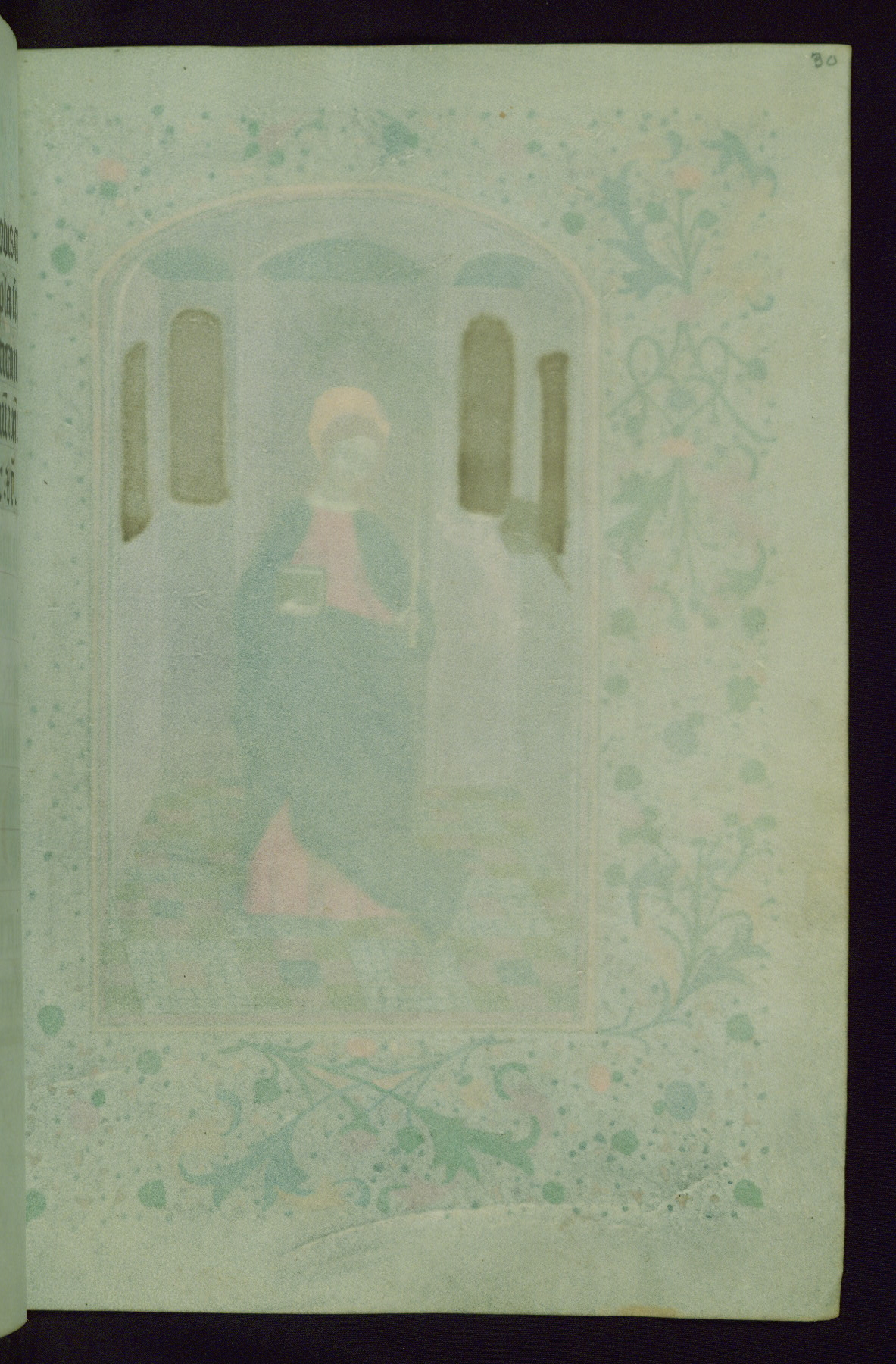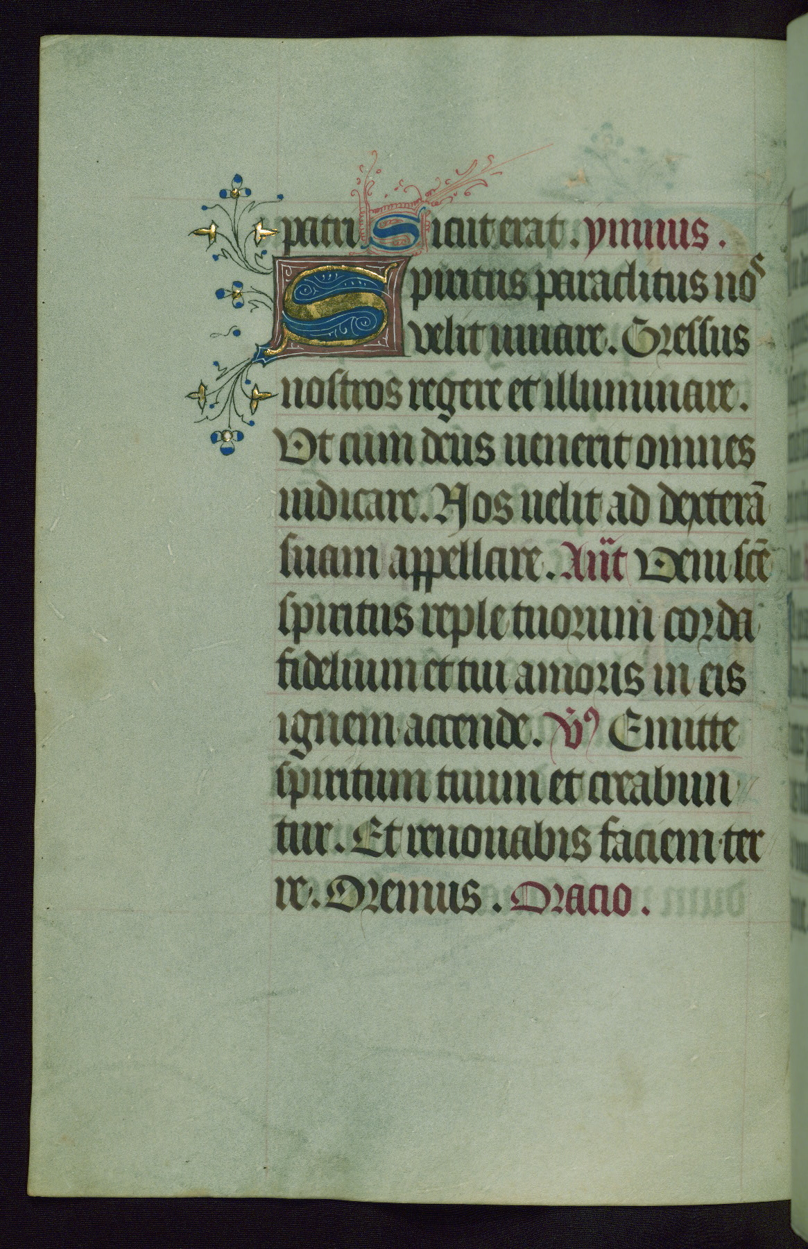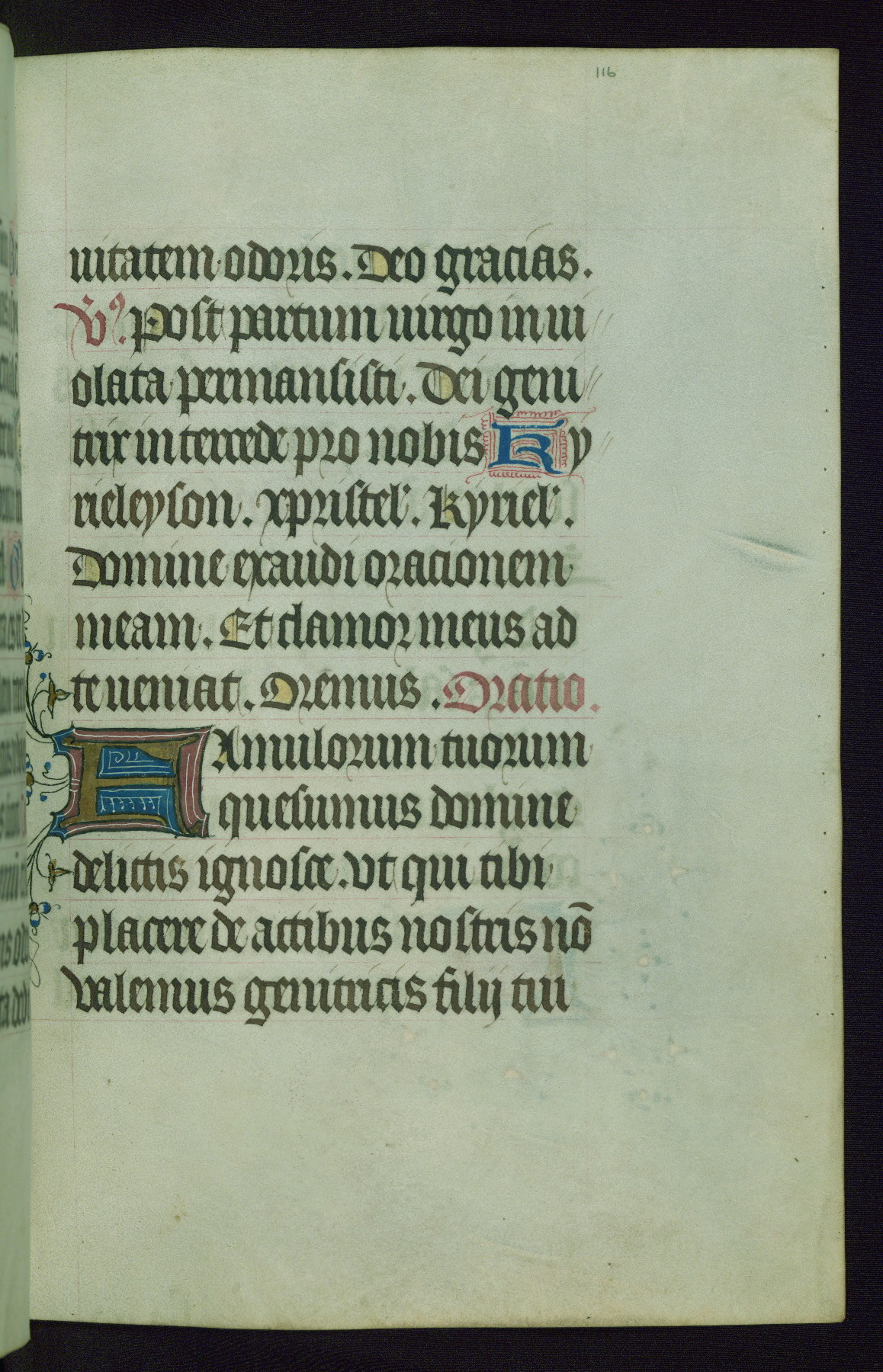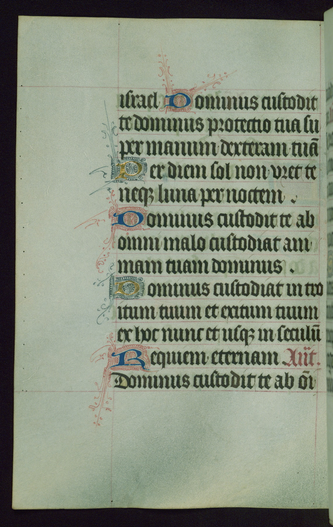This Book of Hours, ca. 1460, was completed for use of Rome and illuminated under the influence, if not the direct participation, of Willem Vrelant. There remain twenty-two extant marginal calendar illustrations, thirteen extant full-page miniatures (many of which are paired with opening suffrages, perhaps suggesting a certain amount of significance to the owner), and one historiated initial. The contemporary binding, signed Livinus Stuaert, is dated 1477 and is most likely of Bruges or Ghent origin. It is thought that the first owner was French due to the French headings throughout and prominent fleur-de-lis figurations decorating the binding. Further, the first owner was likely female, suggested by the ways in which the book was structured to facilitate legibility. This is evinced by the large size of the script and the lack of abbreviations. While much of the text is standard, there remains evidence of personal significance and preference. This is seen in the chosen illuminations for those sections that are most significant to the owner. Most illuminations are paired with the opening page of staple Hours; however, many are accompanied by individual suffrages, constituting a large portion of the beginning of the manuscript. Personal preference is also shown in those sections of text that stray from the standard. The devotional sequence of this manuscript is notable for its sheer length and diversity of prayers as well as its inclusion of a French prayer not of official liturgy (fols. 215r-219v). The first collection of three prayers is headed and written in French. The prayer is attributed to St. Augustine and is described to guarantee a transformation of tribulation into joy through Christ's mercy, but only if the suppliant recites the prayer for thirty consecutive days. While it is not uncommon for evidence of an owner's predilections to surface in a Book of Hours, the particularly divergent features of this book allow readers to glean an intimate view of the patron.