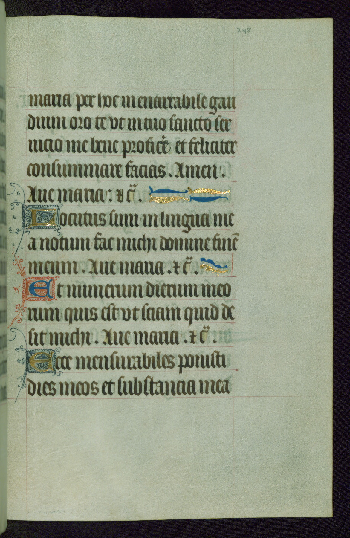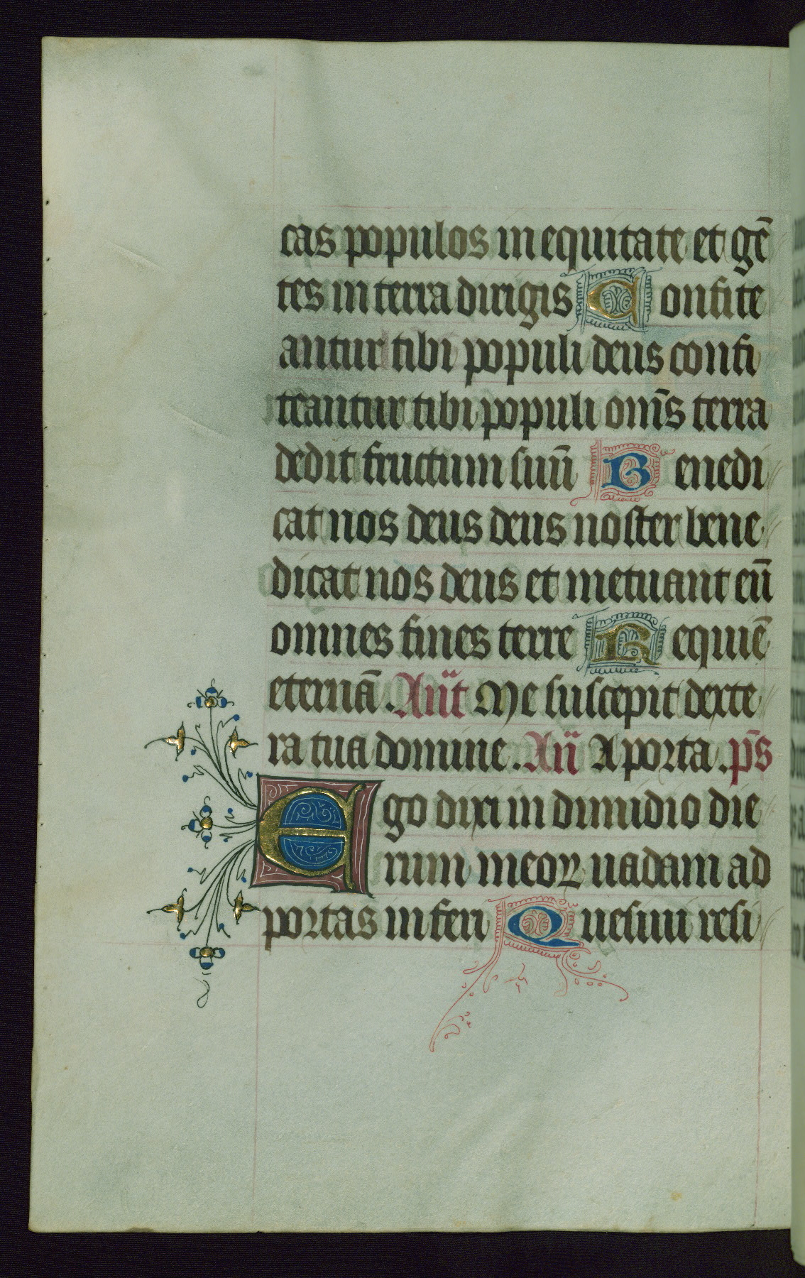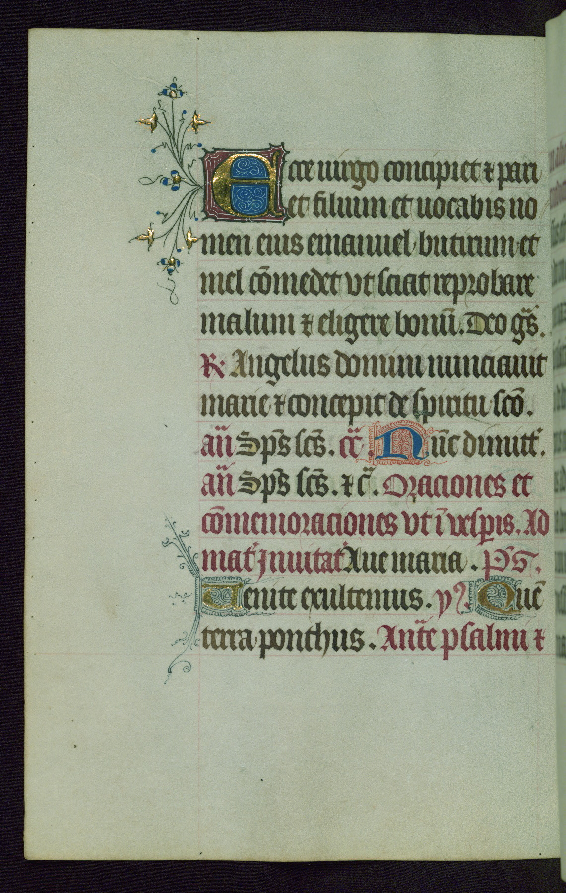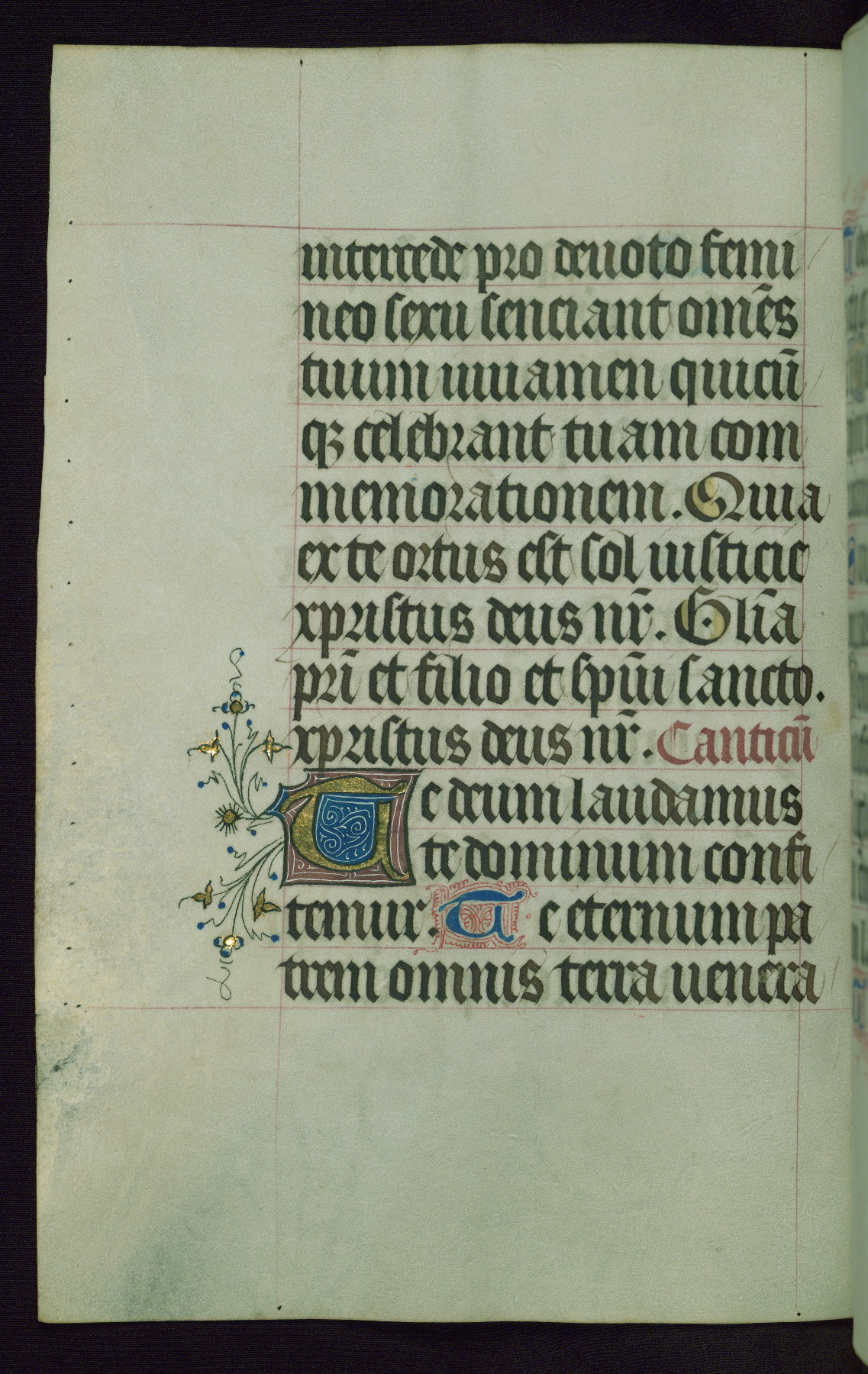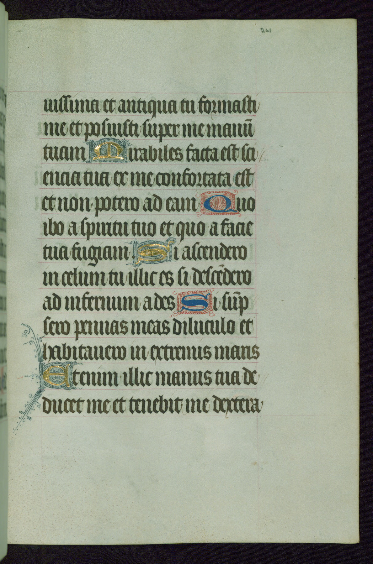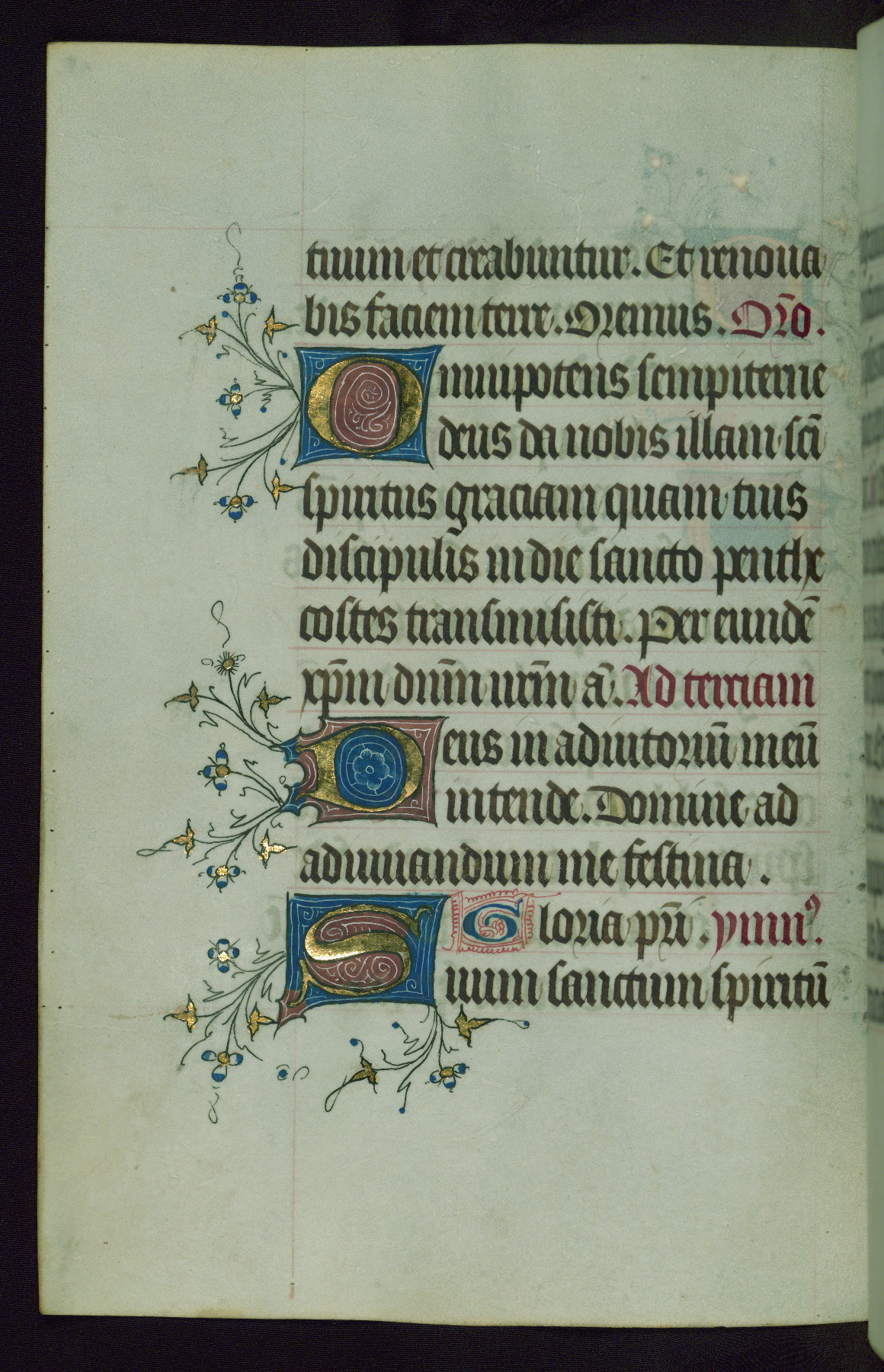 This Book of Hours, ca. 1460, was completed for use of Rome and illuminated under the influence, if not the direct participation, of Willem Vrelant. There remain twenty-two extant marginal calendar illustrations, thirteen extant full-page miniatures (many of which are paired with opening suffrages, perhaps suggesting a certain amount of significance to the owner), and one historiated initial. The contemporary binding, signed Livinus Stuaert, is dated 1477 and is most likely of Bruges or Ghent origin. It is thought that the first owner was French due to the French headings throughout and prominent fleur-de-lis figurations decorating the binding. Further, the first owner was likely female, suggested by the ways in which the book was structured to facilitate legibility. This is evinced by the large size of the script and the lack of abbreviations. While much of the text is standard, there remains evidence of personal significance and preference. This is seen in the chosen illuminations for those sections that are most significant to the owner. Most illuminations are paired with the opening page of staple Hours; however, many are accompanied by individual suffrages, constituting a large portion of the beginning of the manuscript. Personal preference is also shown in those sections of text that stray from the standard. The devotional sequence of this manuscript is notable for its sheer length and diversity of prayers as well as its inclusion of a French prayer not of official liturgy (fols. 215r-219v). The first collection of three prayers is headed and written in French. The prayer is attributed to St. Augustine and is described to guarantee a transformation of tribulation into joy through Christ's mercy, but only if the suppliant recites the prayer for thirty consecutive days. While it is not uncommon for evidence of an owner's predilections to surface in a Book of Hours, the particularly divergent features of this book allow readers to glean an intimate view of the patron.