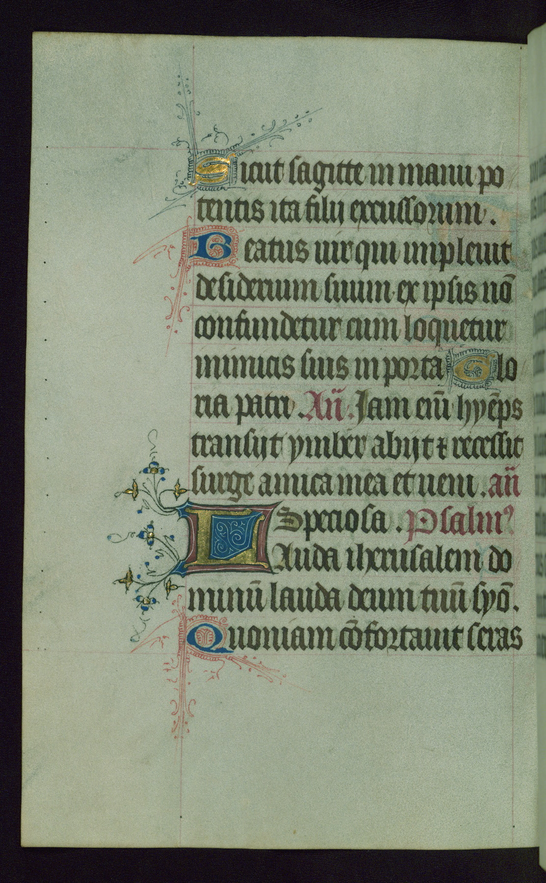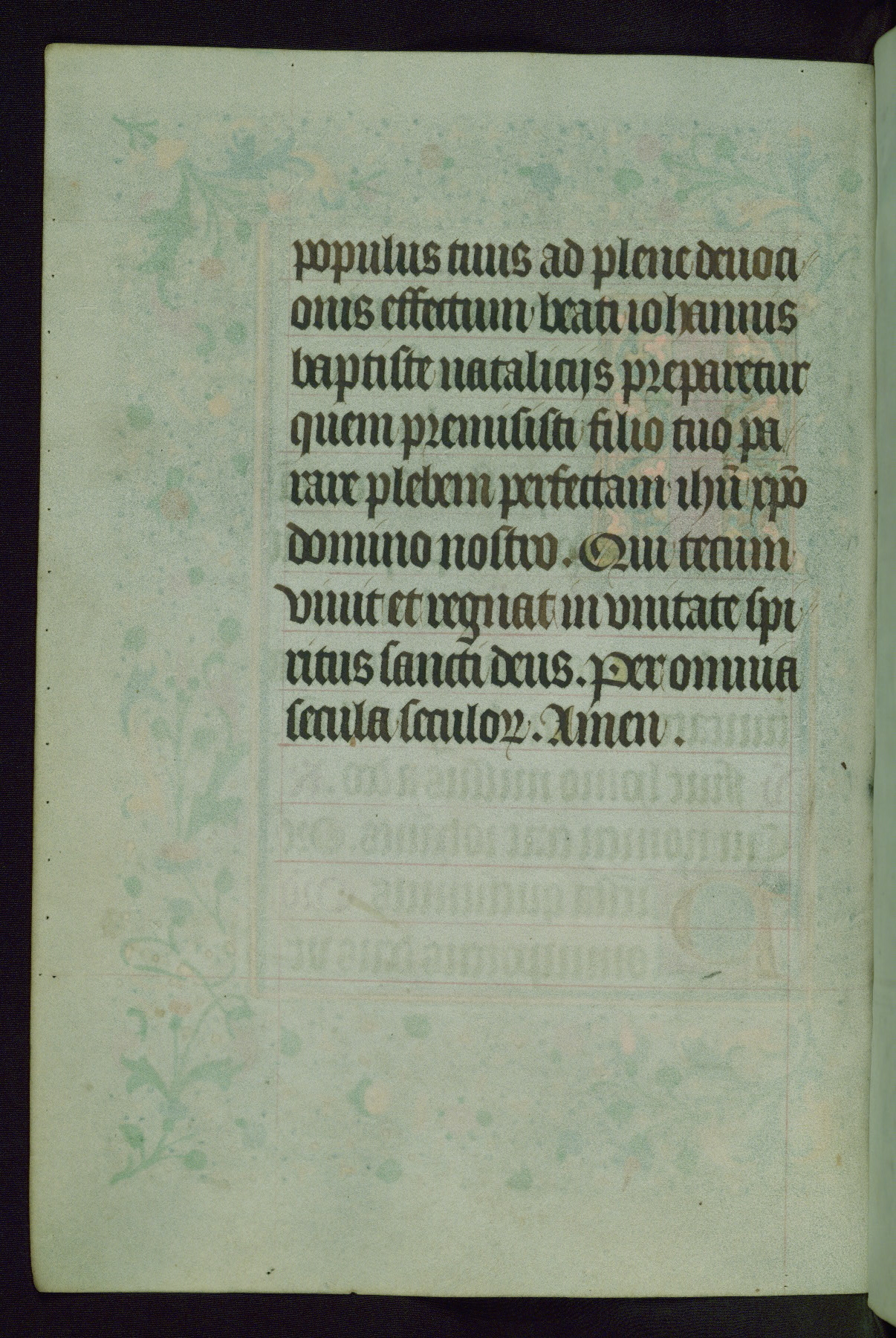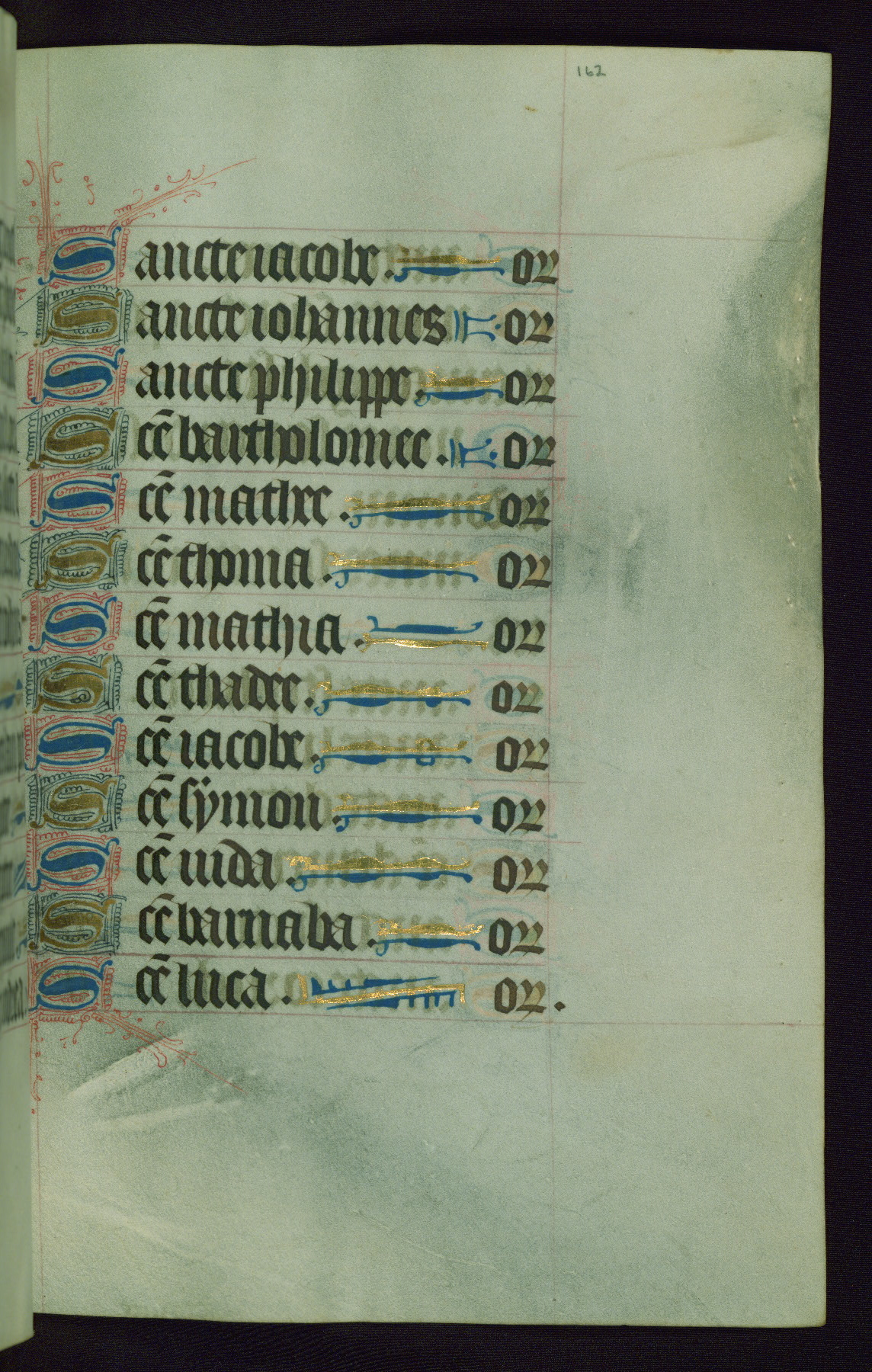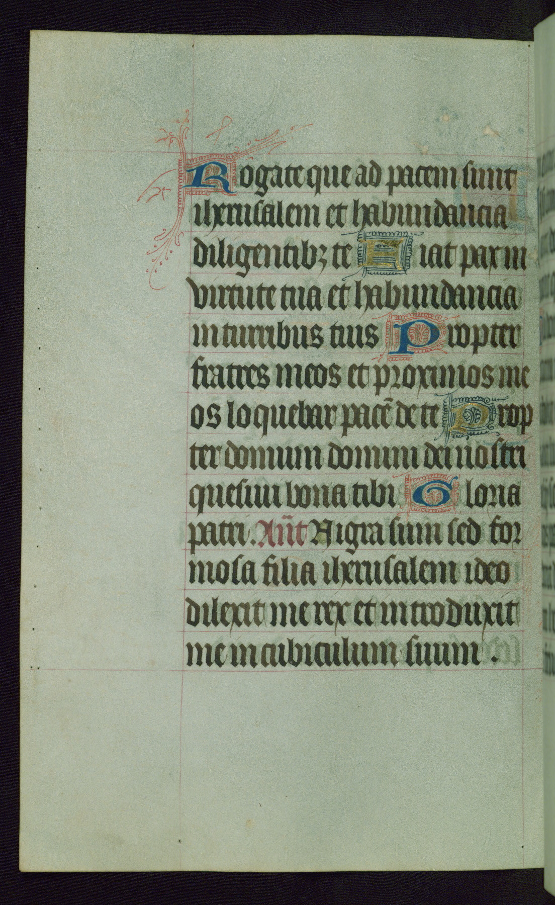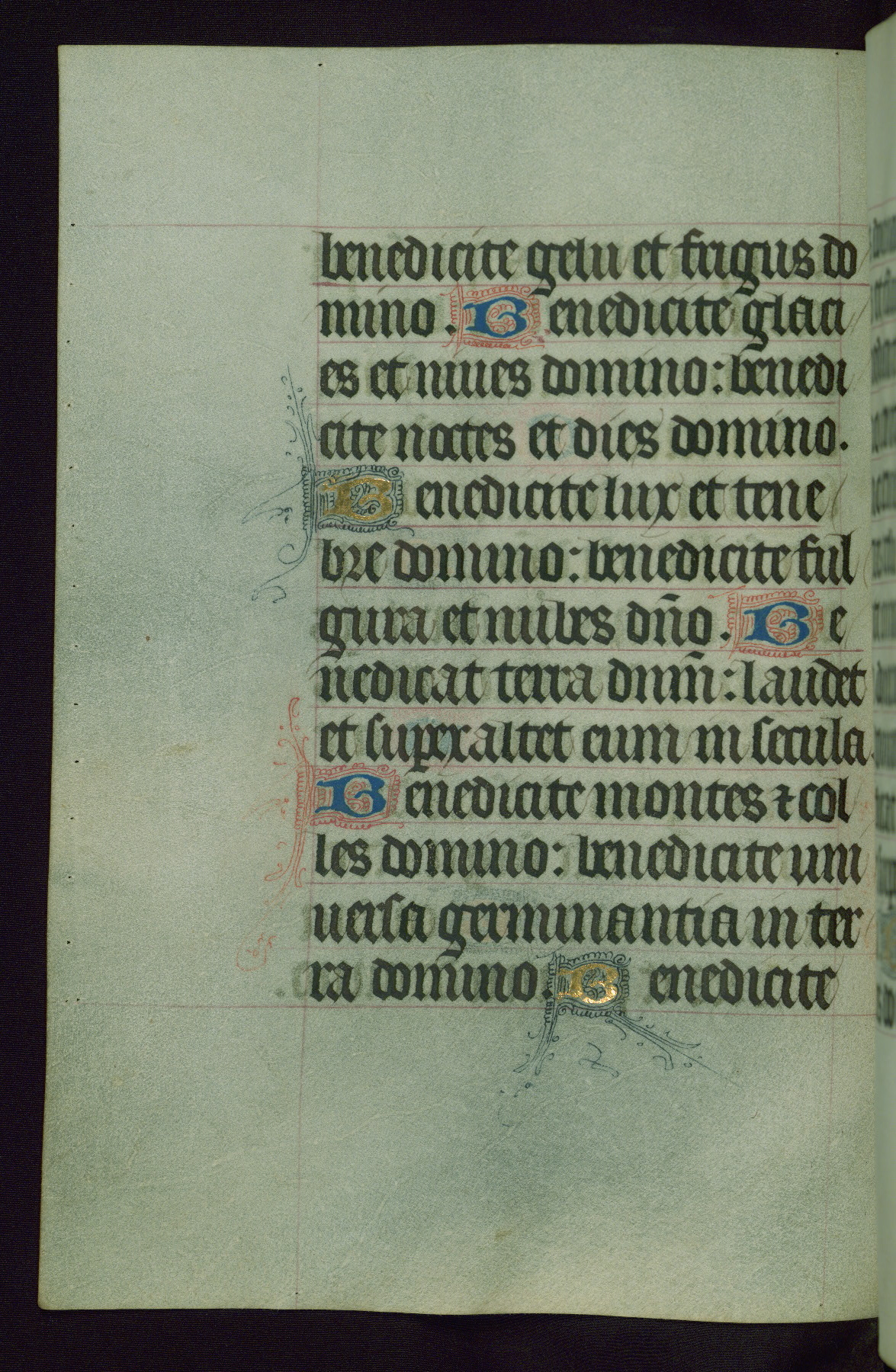 This Book of Hours, ca. 1460, was completed for use of Rome and illuminated under the influence, if not the direct participation, of Willem Vrelant. There remain twenty-two extant marginal calendar illustrations, thirteen extant full-page miniatures (many of which are paired with opening suffrages, perhaps suggesting a certain amount of significance to the owner), and one historiated initial. The contemporary binding, signed Livinus Stuaert, is dated 1477 and is most likely of Bruges or Ghent origin. It is thought that the first owner was French due to the French headings throughout and prominent fleur-de-lis figurations decorating the binding. Further, the first owner was likely female, suggested by the ways in which the book was structured to facilitate legibility. This is evinced by the large size of the script and the lack of abbreviations. While much of the text is standard, there remains evidence of personal significance and preference. This is seen in the chosen illuminations for those sections that are most significant to the owner. Most illuminations are paired with the opening page of staple Hours; however, many are accompanied by individual suffrages, constituting a large portion of the beginning of the manuscript. Personal preference is also shown in those sections of text that stray from the standard. The devotional sequence of this manuscript is notable for its sheer length and diversity of prayers as well as its inclusion of a French prayer not of official liturgy (fols. 215r-219v). The first collection of three prayers is headed and written in French. The prayer is attributed to St. Augustine and is described to guarantee a transformation of tribulation into joy through Christ's mercy, but only if the suppliant recites the prayer for thirty consecutive days. While it is not uncommon for evidence of an owner's predilections to surface in a Book of Hours, the particularly divergent features of this book allow readers to glean an intimate view of the patron.