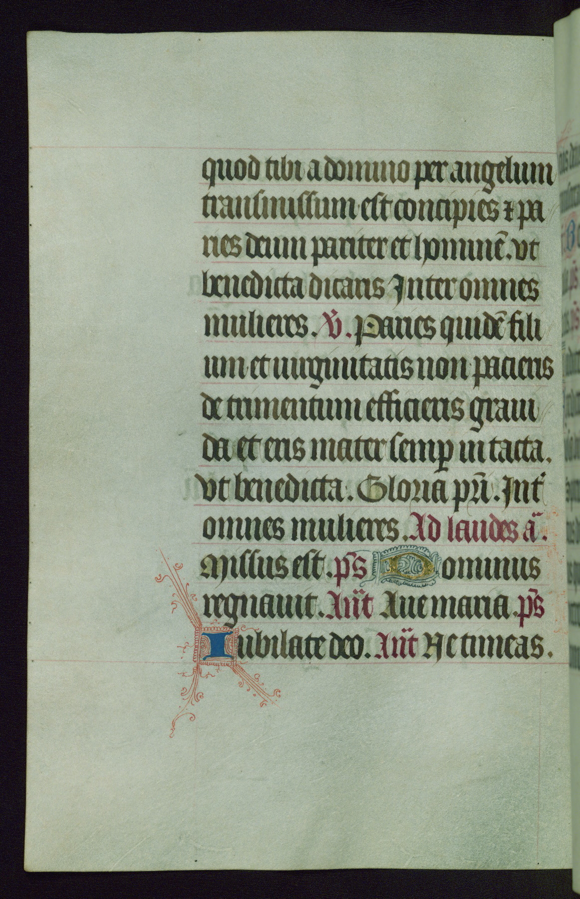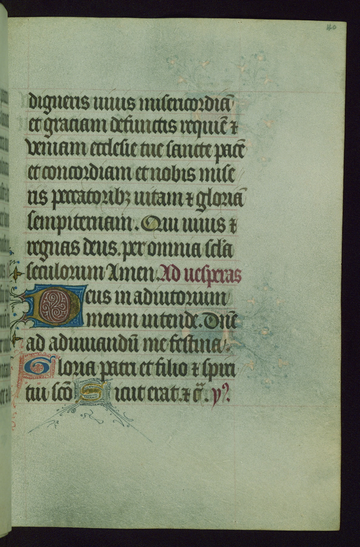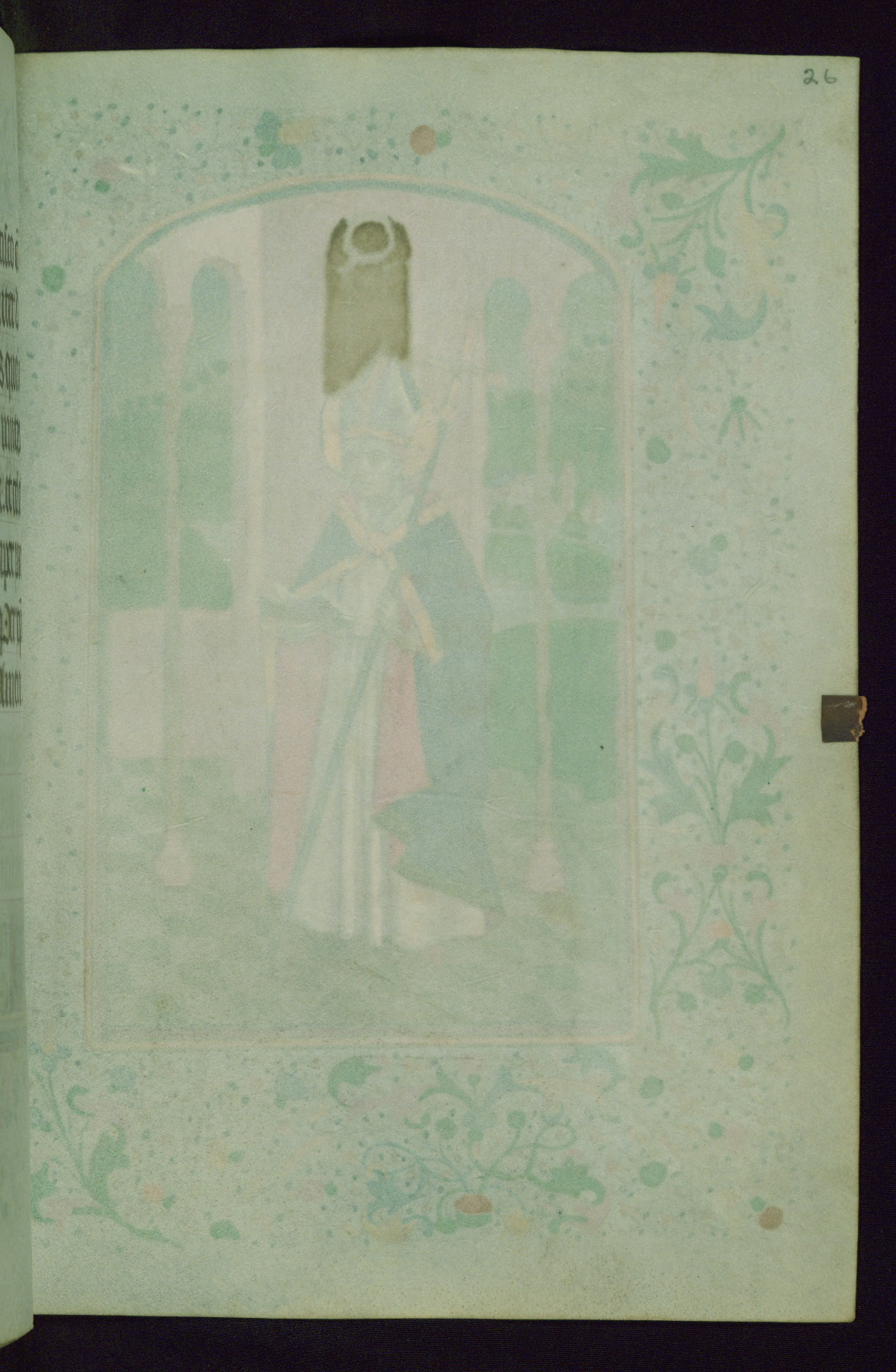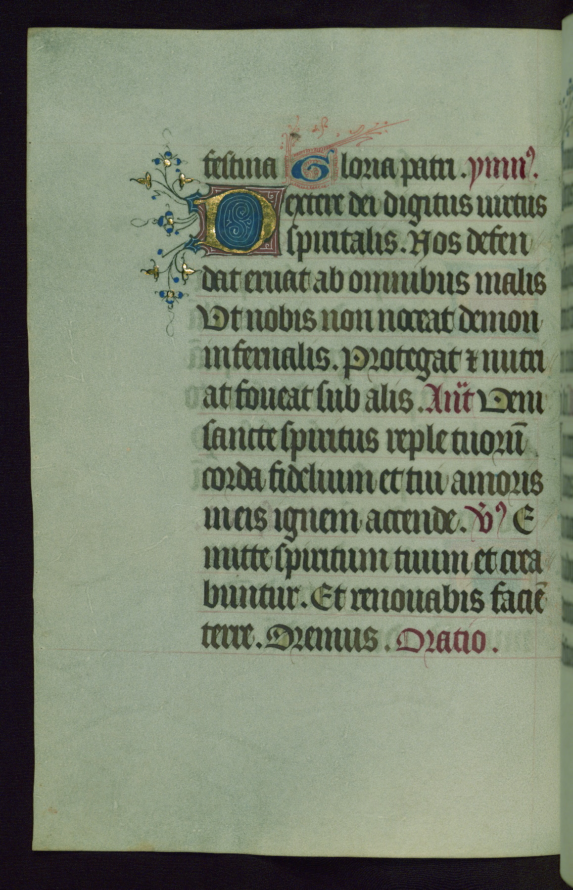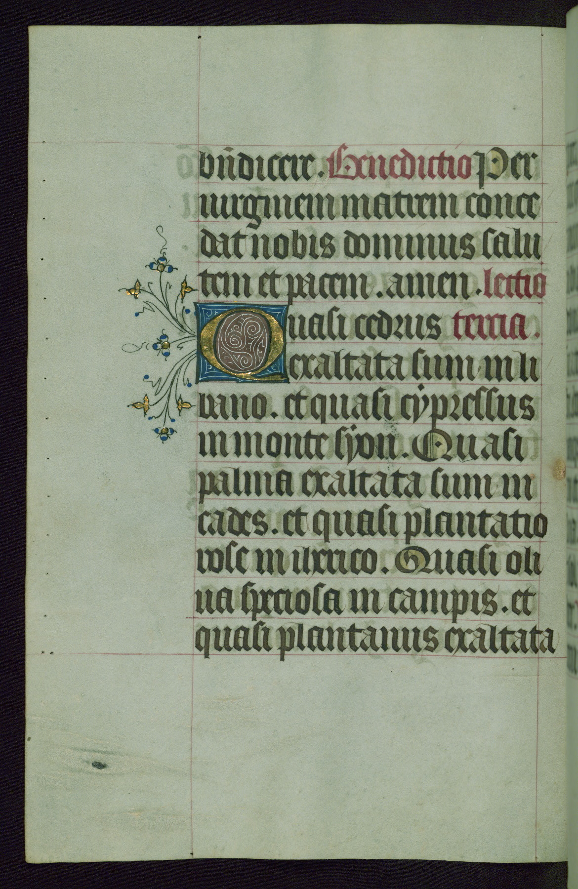 This Book of Hours, ca. 1460, was completed for use of Rome and illuminated under the influence, if not the direct participation, of Willem Vrelant. There remain twenty-two extant marginal calendar illustrations, thirteen extant full-page miniatures (many of which are paired with opening suffrages, perhaps suggesting a certain amount of significance to the owner), and one historiated initial. The contemporary binding, signed Livinus Stuaert, is dated 1477 and is most likely of Bruges or Ghent origin. It is thought that the first owner was French due to the French headings throughout and prominent fleur-de-lis figurations decorating the binding. Further, the first owner was likely female, suggested by the ways in which the book was structured to facilitate legibility. This is evinced by the large size of the script and the lack of abbreviations. While much of the text is standard, there remains evidence of personal significance and preference. This is seen in the chosen illuminations for those sections that are most significant to the owner. Most illuminations are paired with the opening page of staple Hours; however, many are accompanied by individual suffrages, constituting a large portion of the beginning of the manuscript. Personal preference is also shown in those sections of text that stray from the standard. The devotional sequence of this manuscript is notable for its sheer length and diversity of prayers as well as its inclusion of a French prayer not of official liturgy (fols. 215r-219v). The first collection of three prayers is headed and written in French. The prayer is attributed to St. Augustine and is described to guarantee a transformation of tribulation into joy through Christ's mercy, but only if the suppliant recites the prayer for thirty consecutive days. While it is not uncommon for evidence of an owner's predilections to surface in a Book of Hours, the particularly divergent features of this book allow readers to glean an intimate view of the patron.