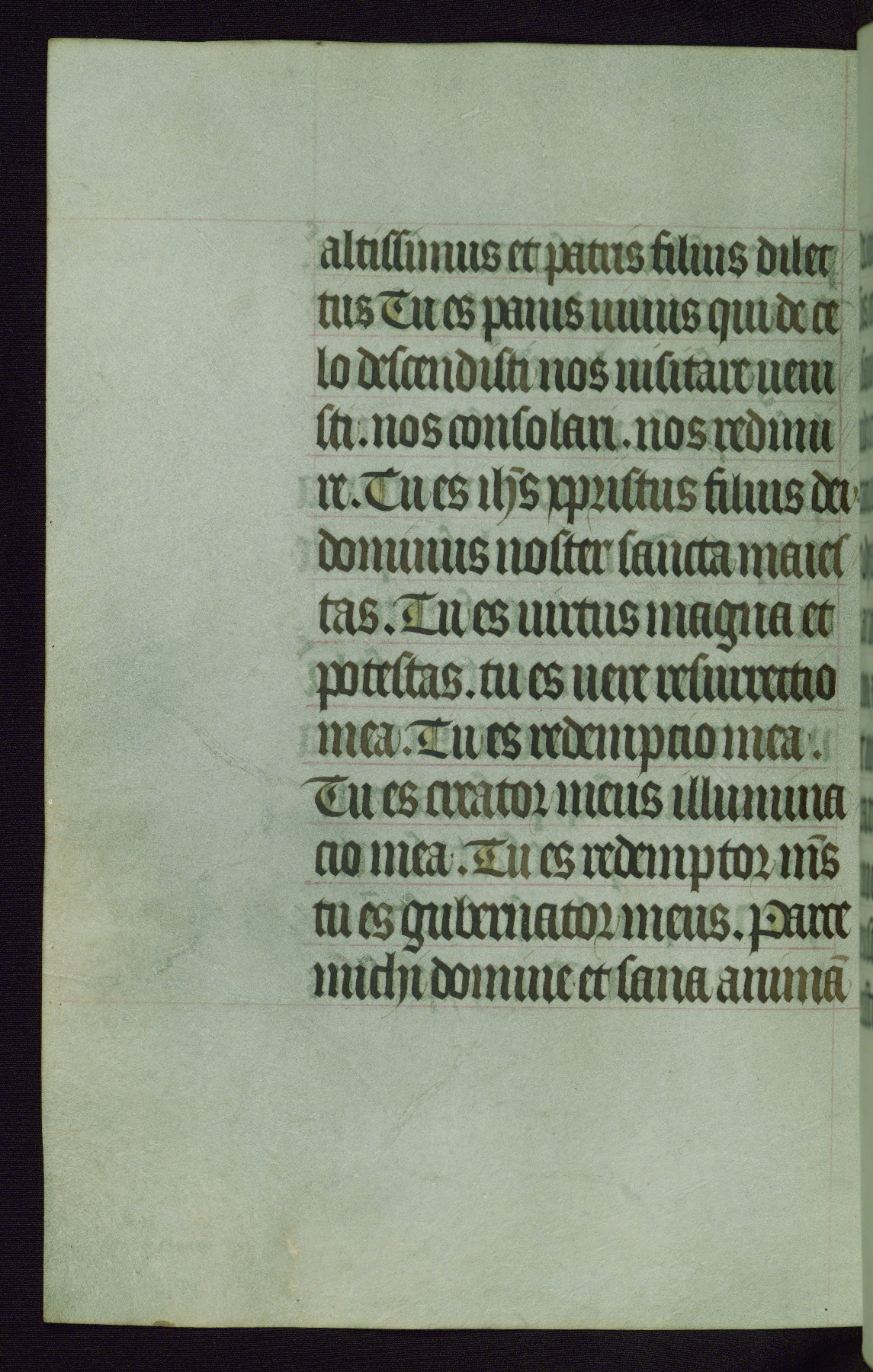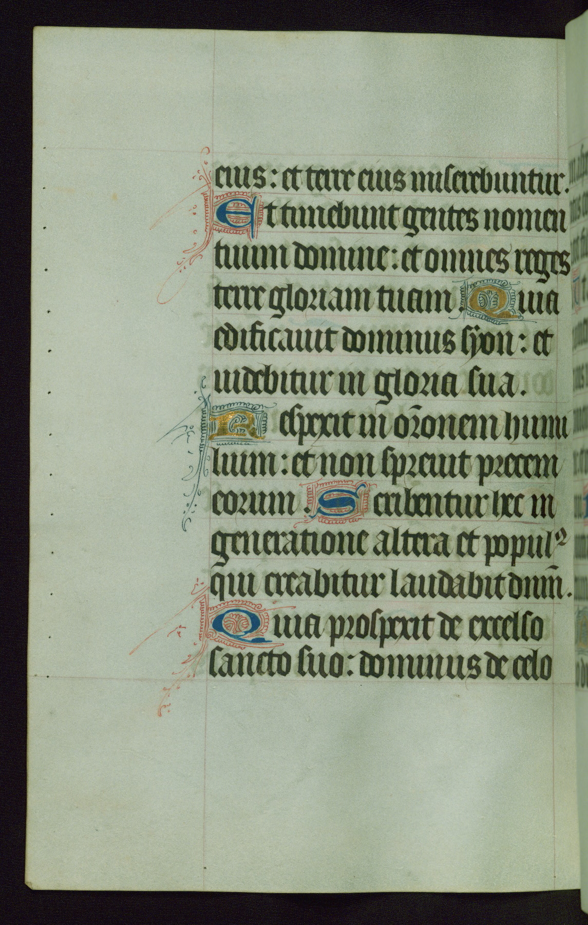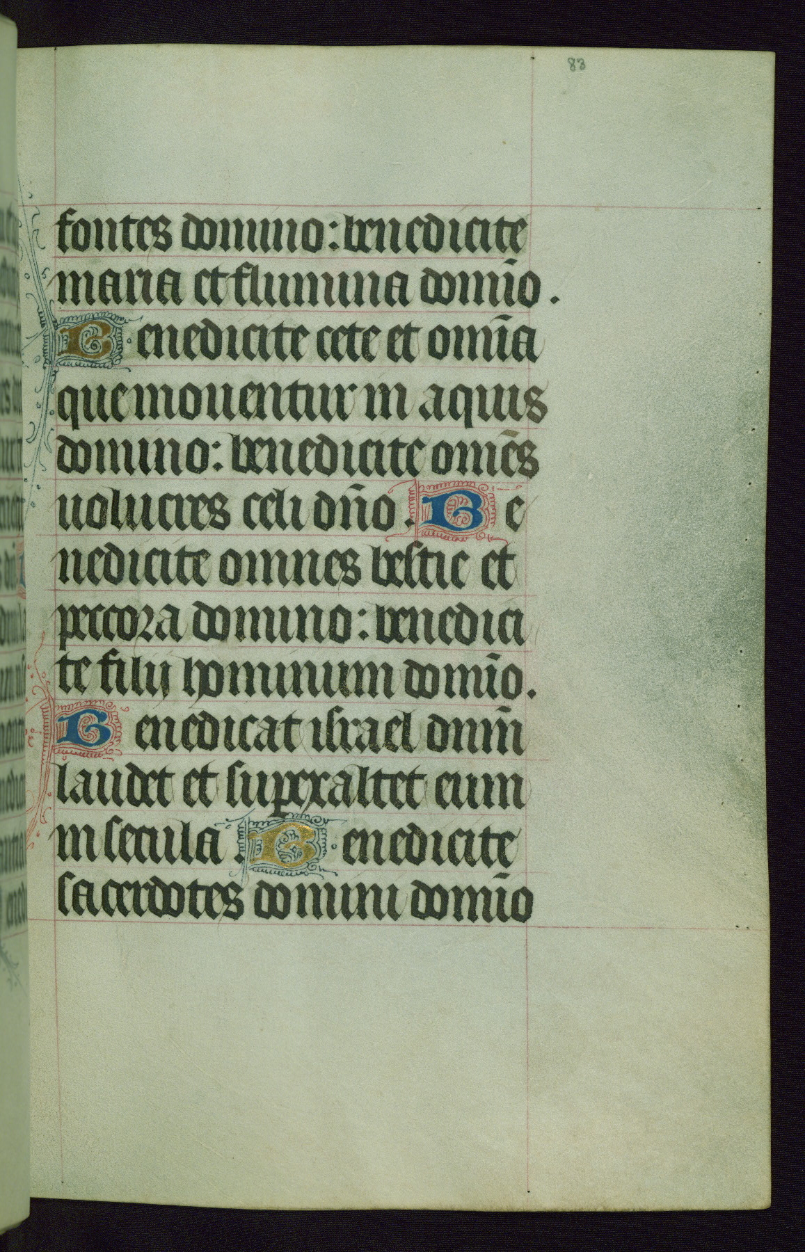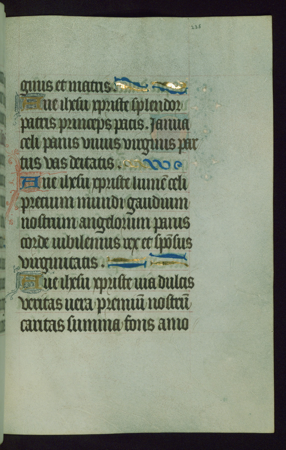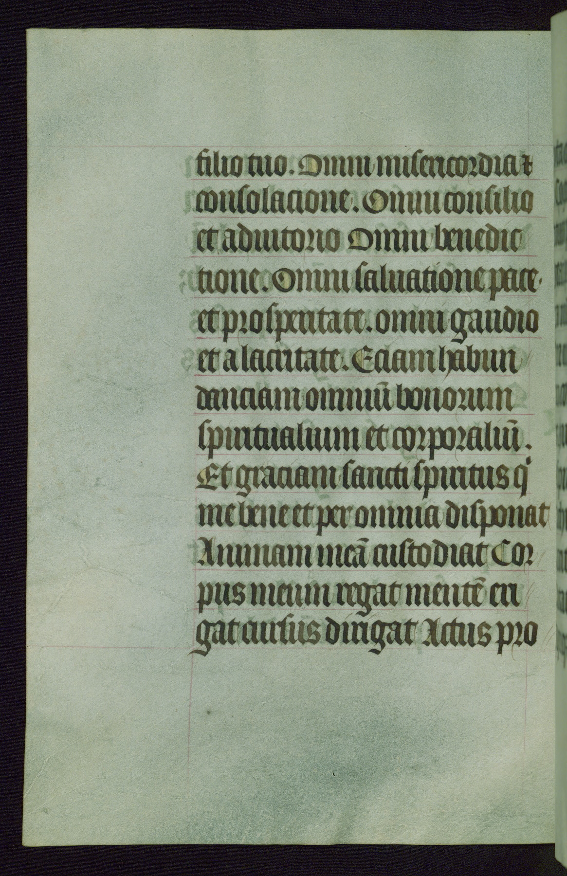 This Book of Hours, ca. 1460, was completed for use of Rome and illuminated under the influence, if not the direct participation, of Willem Vrelant. There remain twenty-two extant marginal calendar illustrations, thirteen extant full-page miniatures (many of which are paired with opening suffrages, perhaps suggesting a certain amount of significance to the owner), and one historiated initial. The contemporary binding, signed Livinus Stuaert, is dated 1477 and is most likely of Bruges or Ghent origin. It is thought that the first owner was French due to the French headings throughout and prominent fleur-de-lis figurations decorating the binding. Further, the first owner was likely female, suggested by the ways in which the book was structured to facilitate legibility. This is evinced by the large size of the script and the lack of abbreviations. While much of the text is standard, there remains evidence of personal significance and preference. This is seen in the chosen illuminations for those sections that are most significant to the owner. Most illuminations are paired with the opening page of staple Hours; however, many are accompanied by individual suffrages, constituting a large portion of the beginning of the manuscript. Personal preference is also shown in those sections of text that stray from the standard. The devotional sequence of this manuscript is notable for its sheer length and diversity of prayers as well as its inclusion of a French prayer not of official liturgy (fols. 215r-219v). The first collection of three prayers is headed and written in French. The prayer is attributed to St. Augustine and is described to guarantee a transformation of tribulation into joy through Christ's mercy, but only if the suppliant recites the prayer for thirty consecutive days. While it is not uncommon for evidence of an owner's predilections to surface in a Book of Hours, the particularly divergent features of this book allow readers to glean an intimate view of the patron.