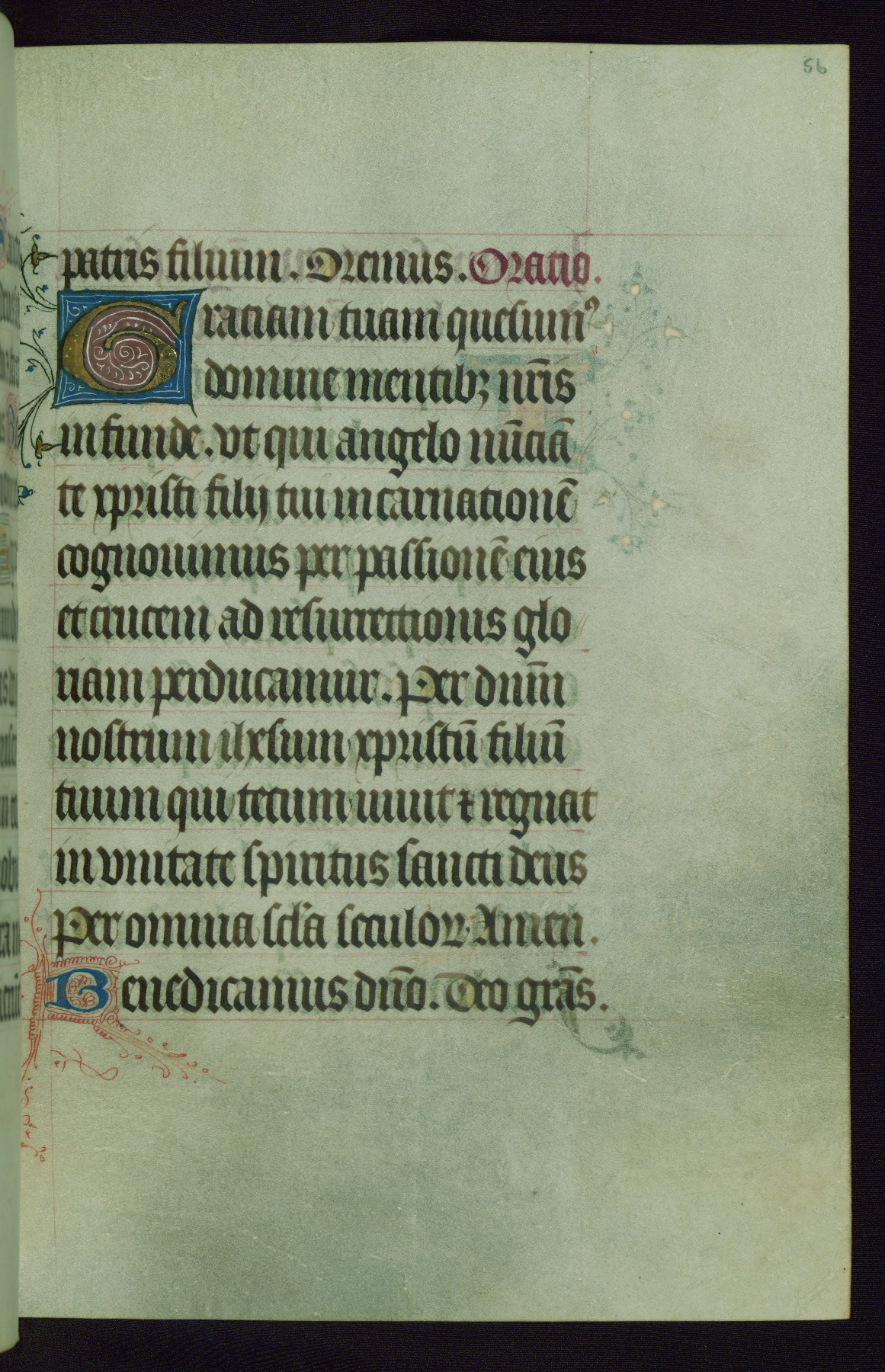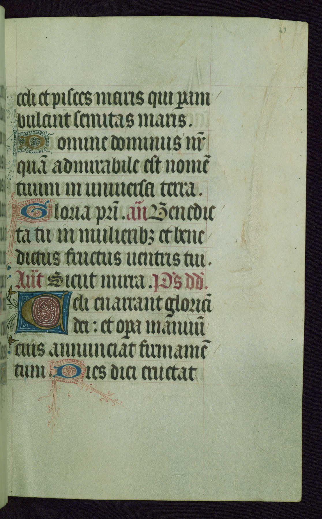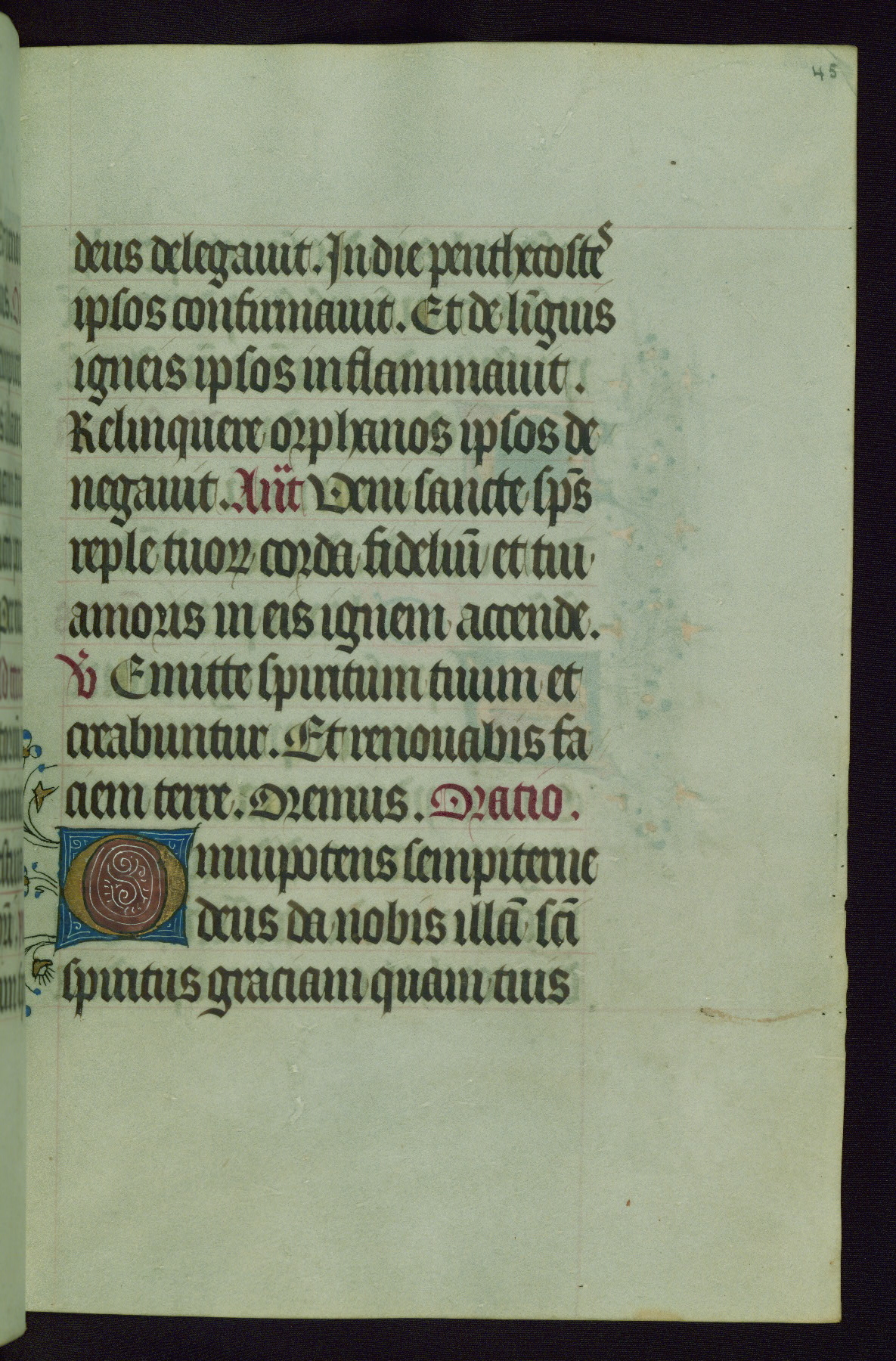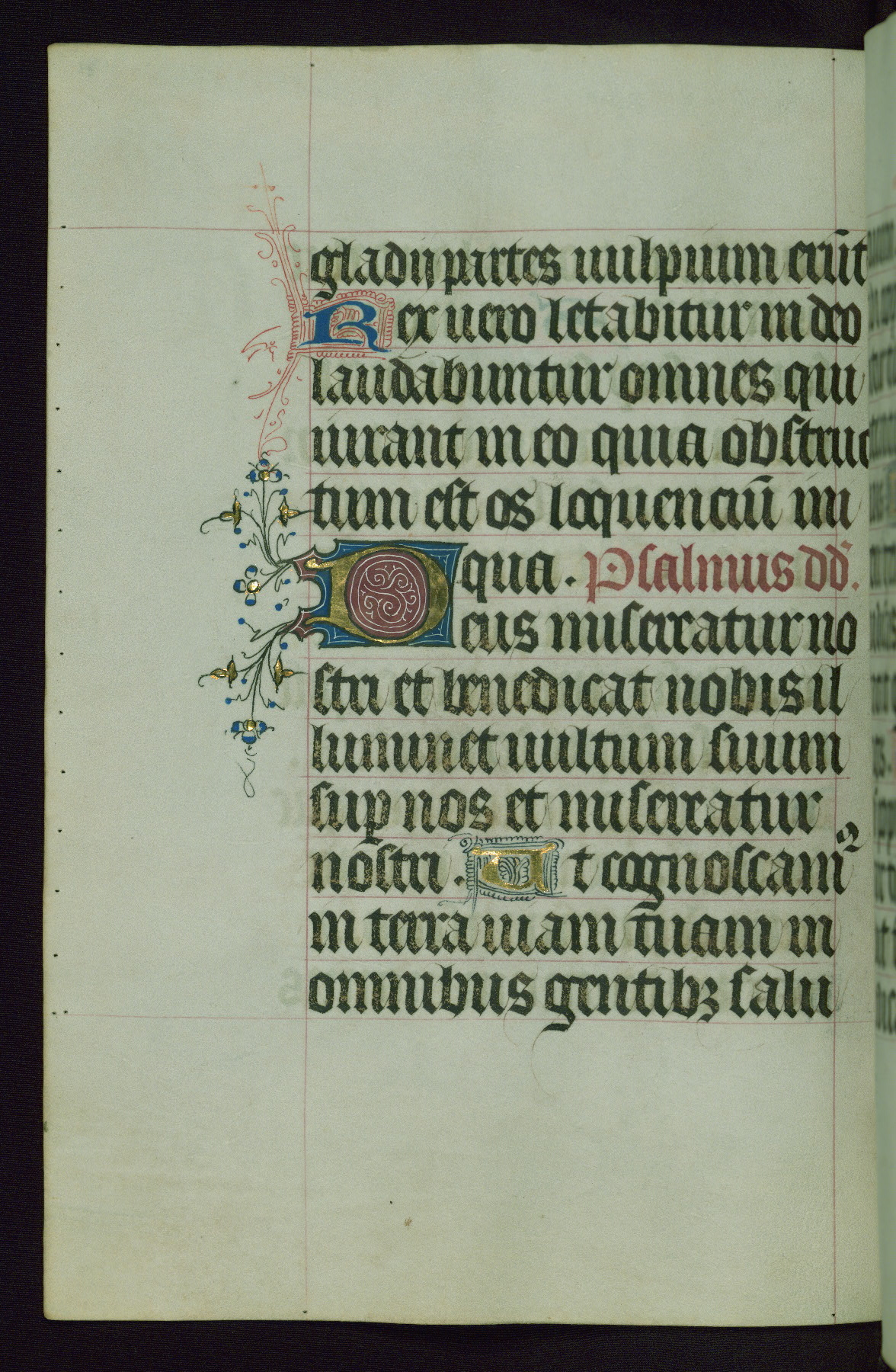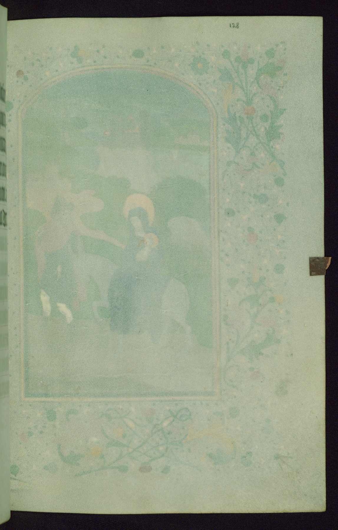This Book of Hours, ca. 1460, was completed for use of Rome and illuminated under the influence, if not the direct participation, of Willem Vrelant. There remain twenty-two extant marginal calendar illustrations, thirteen extant full-page miniatures (many of which are paired with opening suffrages, perhaps suggesting a certain amount of significance to the owner), and one historiated initial. The contemporary binding, signed Livinus Stuaert, is dated 1477 and is most likely of Bruges or Ghent origin. It is thought that the first owner was French due to the French headings throughout and prominent fleur-de-lis figurations decorating the binding. Further, the first owner was likely female, suggested by the ways in which the book was structured to facilitate legibility. This is evinced by the large size of the script and the lack of abbreviations. While much of the text is standard, there remains evidence of personal significance and preference. This is seen in the chosen illuminations for those sections that are most significant to the owner. Most illuminations are paired with the opening page of staple Hours; however, many are accompanied by individual suffrages, constituting a large portion of the beginning of the manuscript. Personal preference is also shown in those sections of text that stray from the standard. The devotional sequence of this manuscript is notable for its sheer length and diversity of prayers as well as its inclusion of a French prayer not of official liturgy (fols. 215r-219v). The first collection of three prayers is headed and written in French. The prayer is attributed to St. Augustine and is described to guarantee a transformation of tribulation into joy through Christ's mercy, but only if the suppliant recites the prayer for thirty consecutive days. While it is not uncommon for evidence of an owner's predilections to surface in a Book of Hours, the particularly divergent features of this book allow readers to glean an intimate view of the patron.
