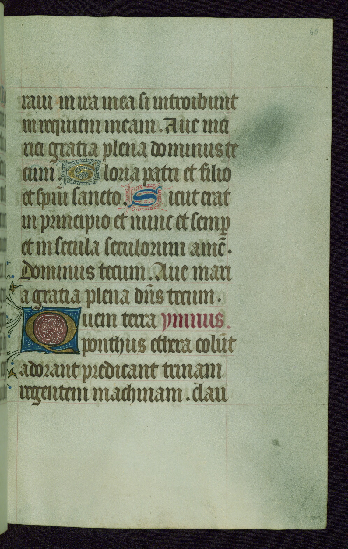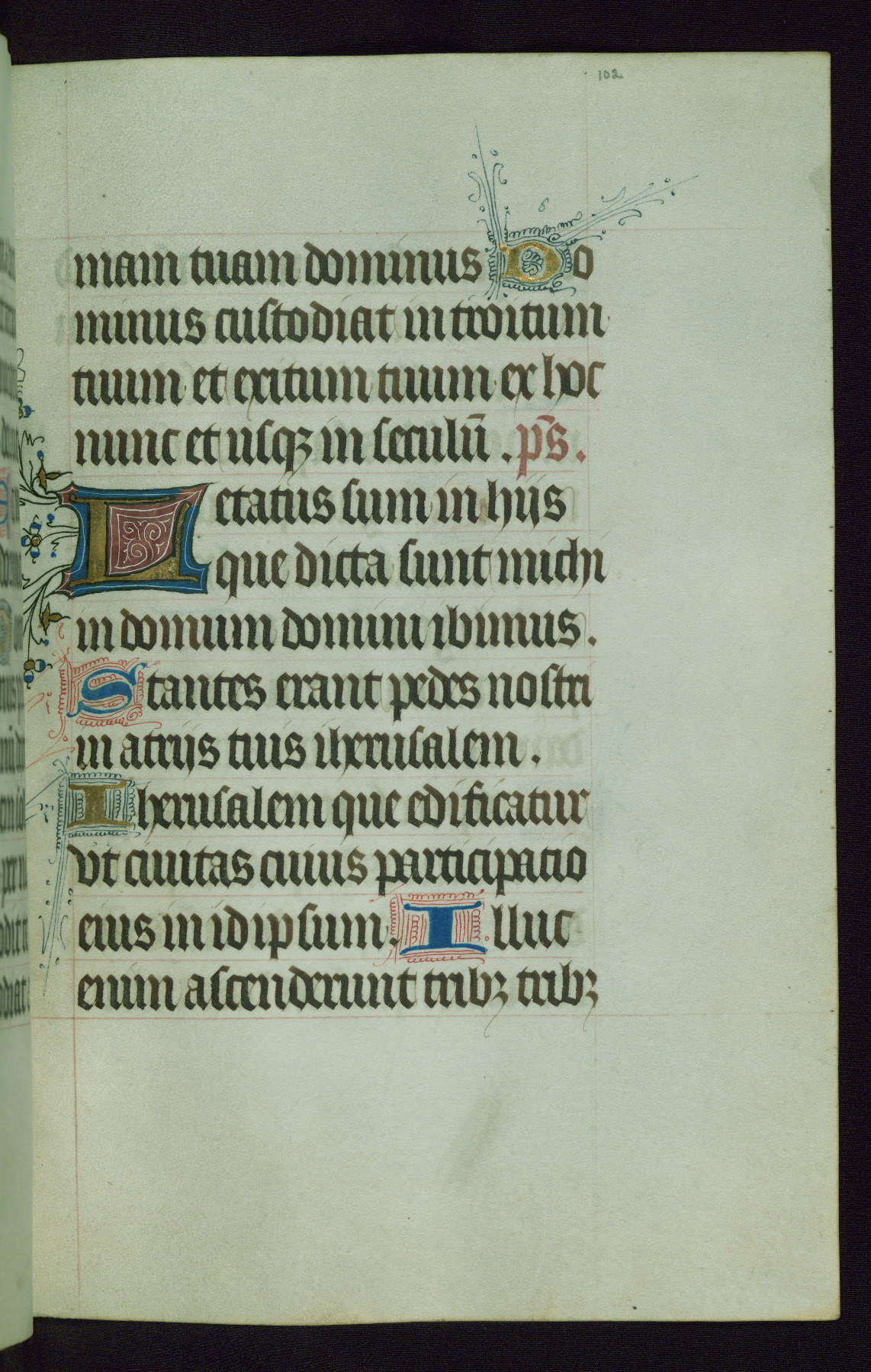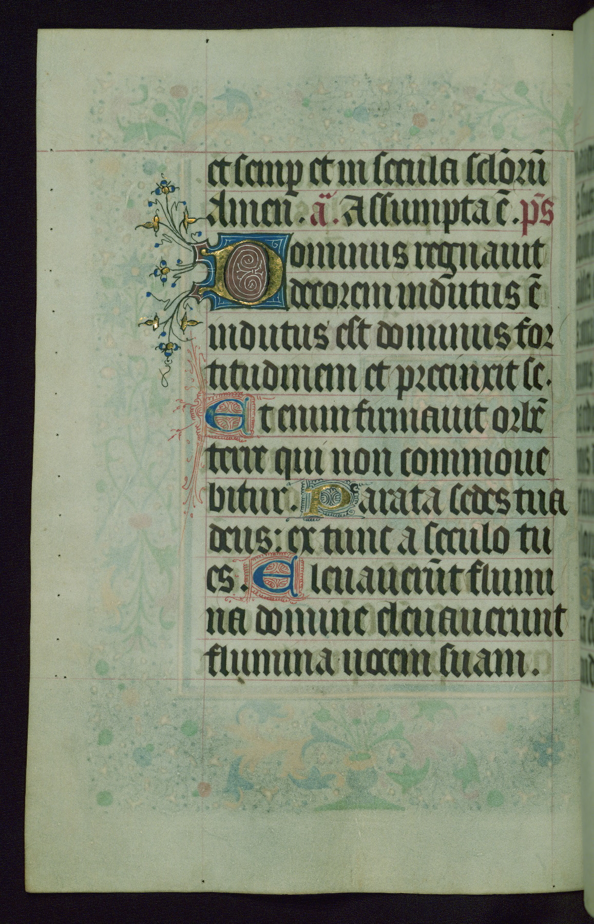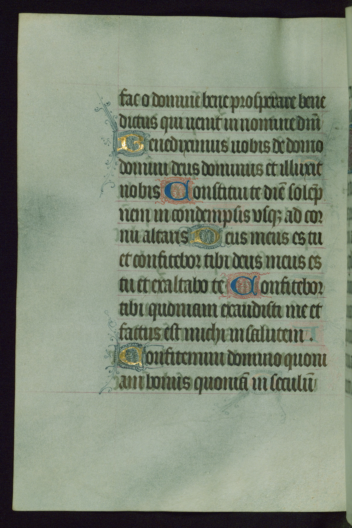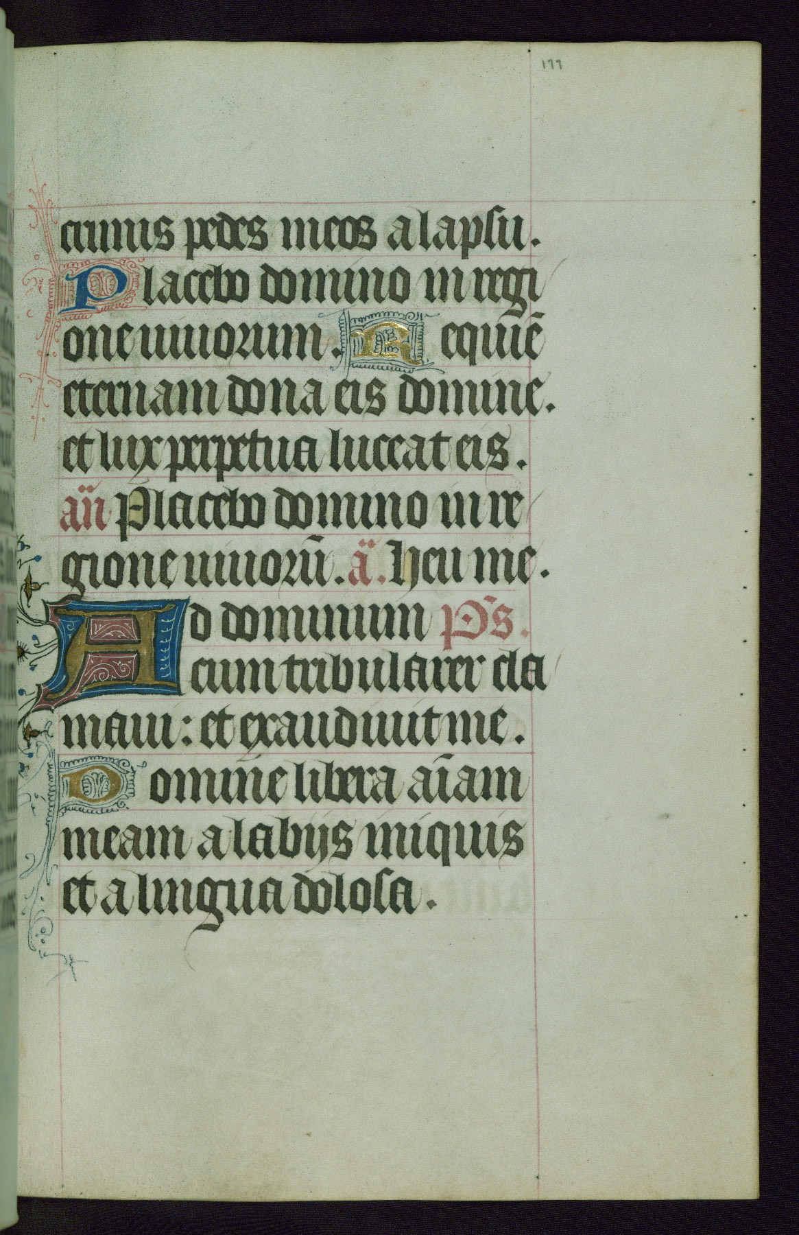 This Book of Hours, ca. 1460, was completed for use of Rome and illuminated under the influence, if not the direct participation, of Willem Vrelant. There remain twenty-two extant marginal calendar illustrations, thirteen extant full-page miniatures (many of which are paired with opening suffrages, perhaps suggesting a certain amount of significance to the owner), and one historiated initial. The contemporary binding, signed Livinus Stuaert, is dated 1477 and is most likely of Bruges or Ghent origin. It is thought that the first owner was French due to the French headings throughout and prominent fleur-de-lis figurations decorating the binding. Further, the first owner was likely female, suggested by the ways in which the book was structured to facilitate legibility. This is evinced by the large size of the script and the lack of abbreviations. While much of the text is standard, there remains evidence of personal significance and preference. This is seen in the chosen illuminations for those sections that are most significant to the owner. Most illuminations are paired with the opening page of staple Hours; however, many are accompanied by individual suffrages, constituting a large portion of the beginning of the manuscript. Personal preference is also shown in those sections of text that stray from the standard. The devotional sequence of this manuscript is notable for its sheer length and diversity of prayers as well as its inclusion of a French prayer not of official liturgy (fols. 215r-219v). The first collection of three prayers is headed and written in French. The prayer is attributed to St. Augustine and is described to guarantee a transformation of tribulation into joy through Christ's mercy, but only if the suppliant recites the prayer for thirty consecutive days. While it is not uncommon for evidence of an owner's predilections to surface in a Book of Hours, the particularly divergent features of this book allow readers to glean an intimate view of the patron.