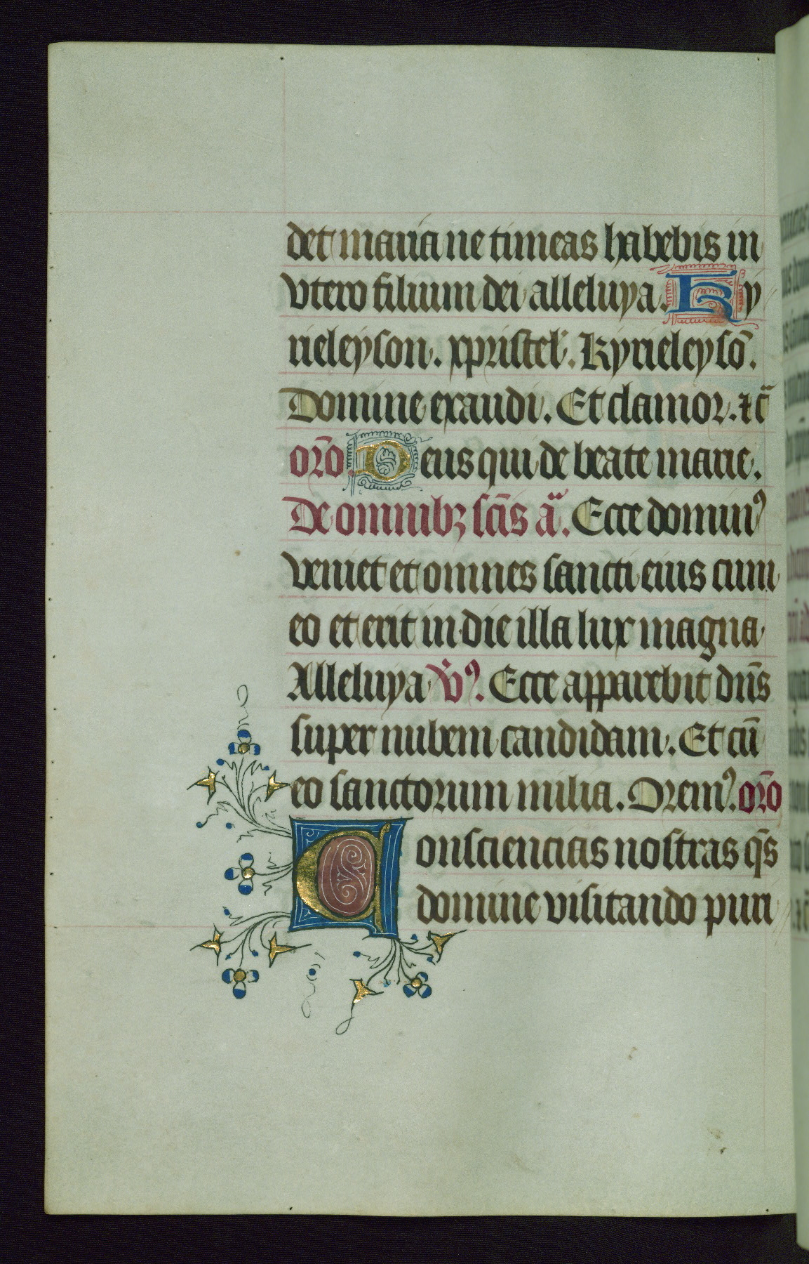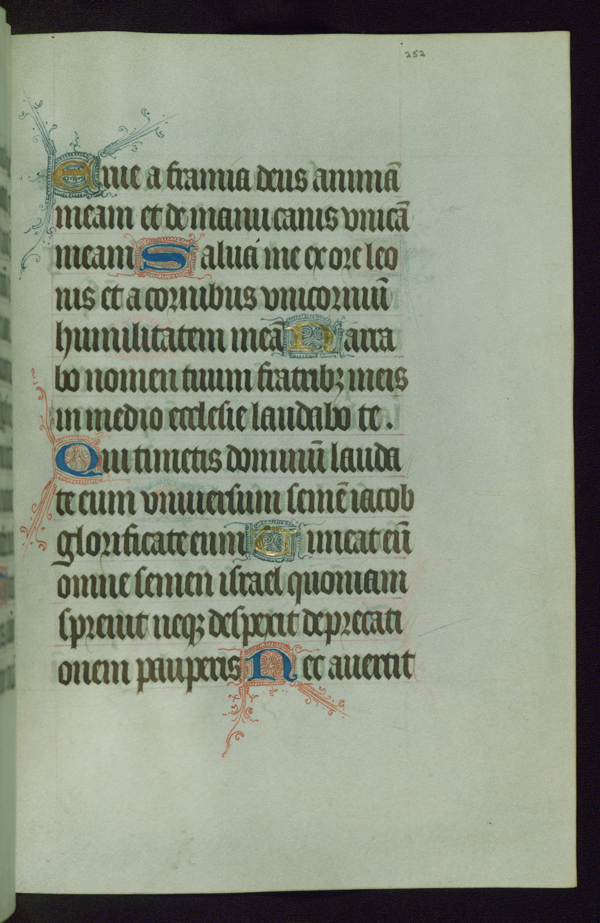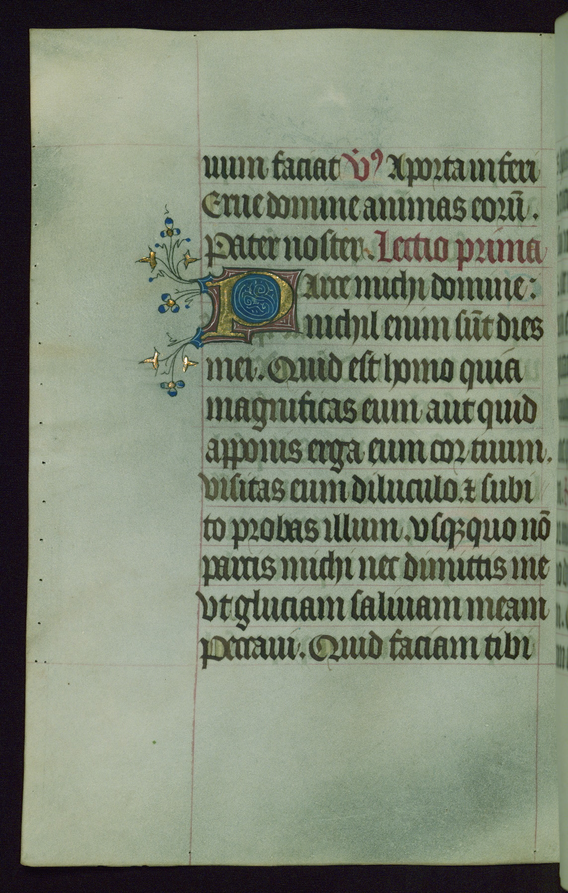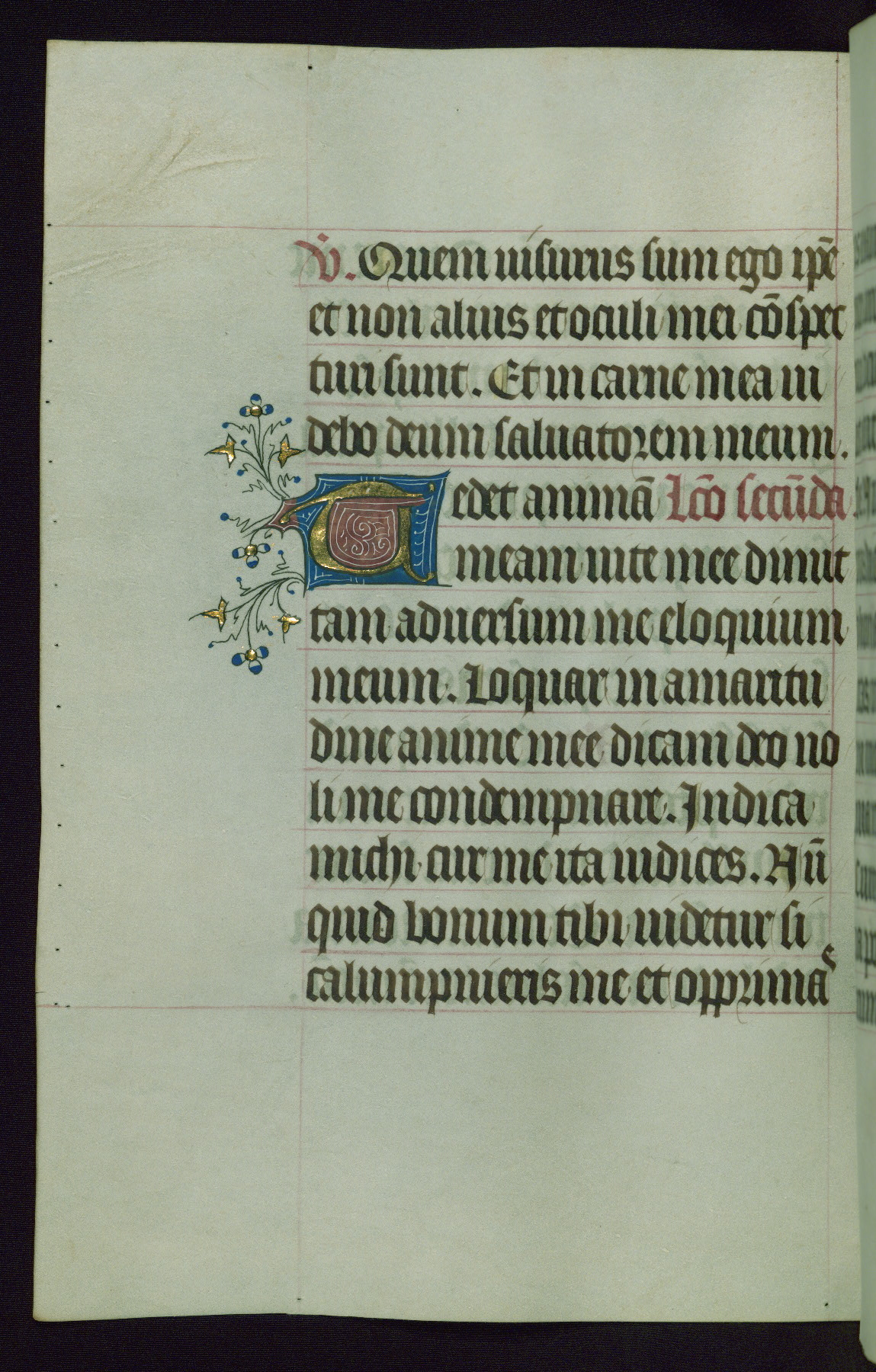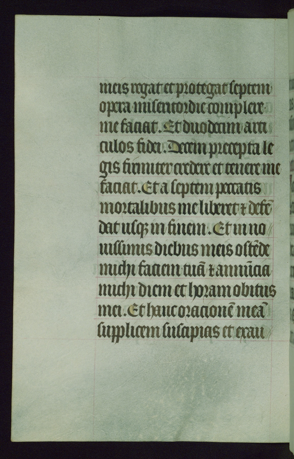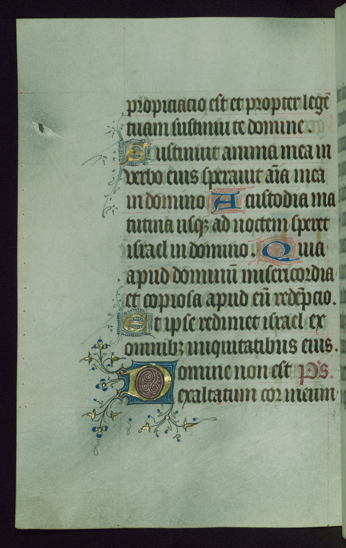 This Book of Hours, ca. 1460, was completed for use of Rome and illuminated under the influence, if not the direct participation, of Willem Vrelant. There remain twenty-two extant marginal calendar illustrations, thirteen extant full-page miniatures (many of which are paired with opening suffrages, perhaps suggesting a certain amount of significance to the owner), and one historiated initial. The contemporary binding, signed Livinus Stuaert, is dated 1477 and is most likely of Bruges or Ghent origin. It is thought that the first owner was French due to the French headings throughout and prominent fleur-de-lis figurations decorating the binding. Further, the first owner was likely female, suggested by the ways in which the book was structured to facilitate legibility. This is evinced by the large size of the script and the lack of abbreviations. While much of the text is standard, there remains evidence of personal significance and preference. This is seen in the chosen illuminations for those sections that are most significant to the owner. Most illuminations are paired with the opening page of staple Hours; however, many are accompanied by individual suffrages, constituting a large portion of the beginning of the manuscript. Personal preference is also shown in those sections of text that stray from the standard. The devotional sequence of this manuscript is notable for its sheer length and diversity of prayers as well as its inclusion of a French prayer not of official liturgy (fols. 215r-219v). The first collection of three prayers is headed and written in French. The prayer is attributed to St. Augustine and is described to guarantee a transformation of tribulation into joy through Christ's mercy, but only if the suppliant recites the prayer for thirty consecutive days. While it is not uncommon for evidence of an owner's predilections to surface in a Book of Hours, the particularly divergent features of this book allow readers to glean an intimate view of the patron.