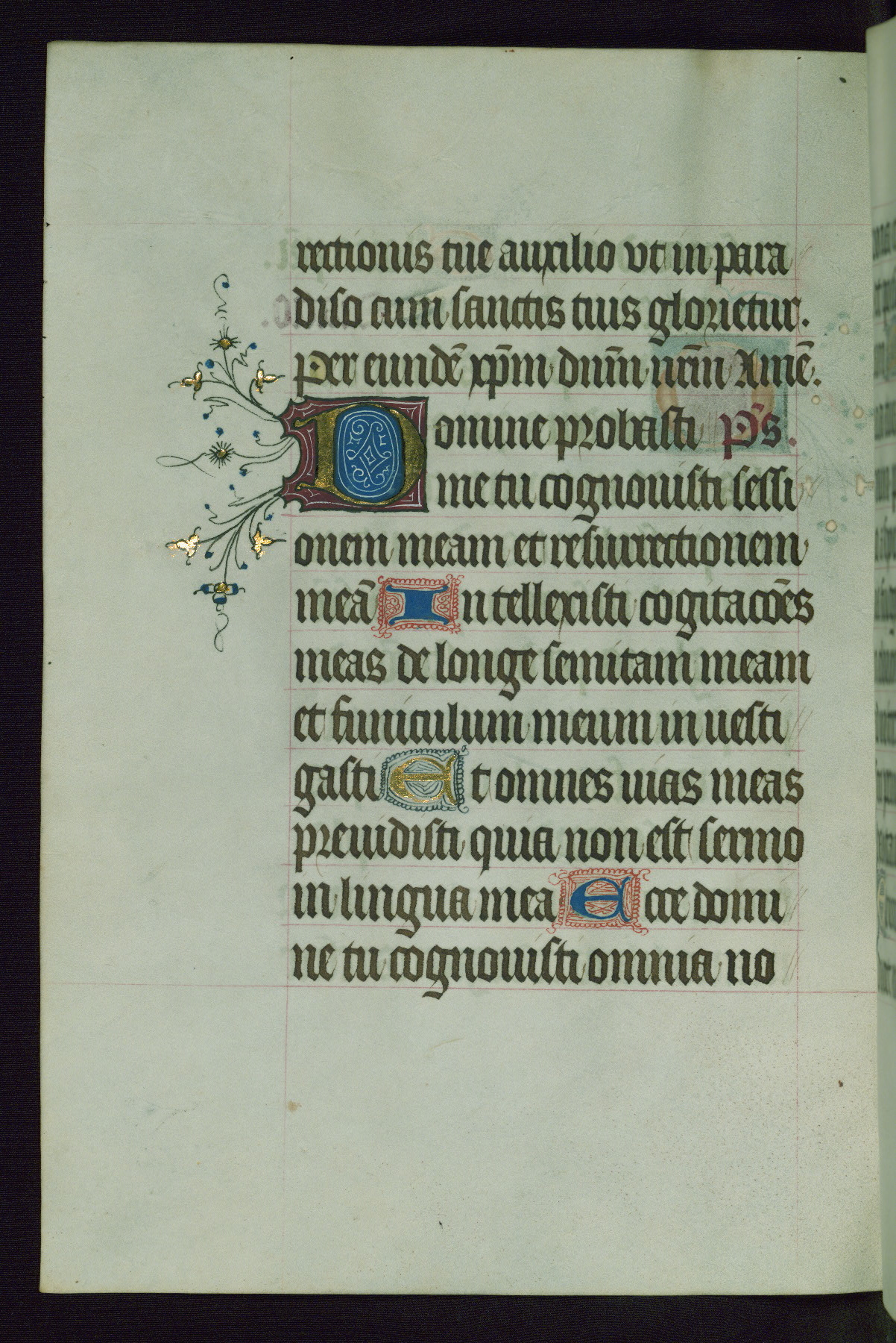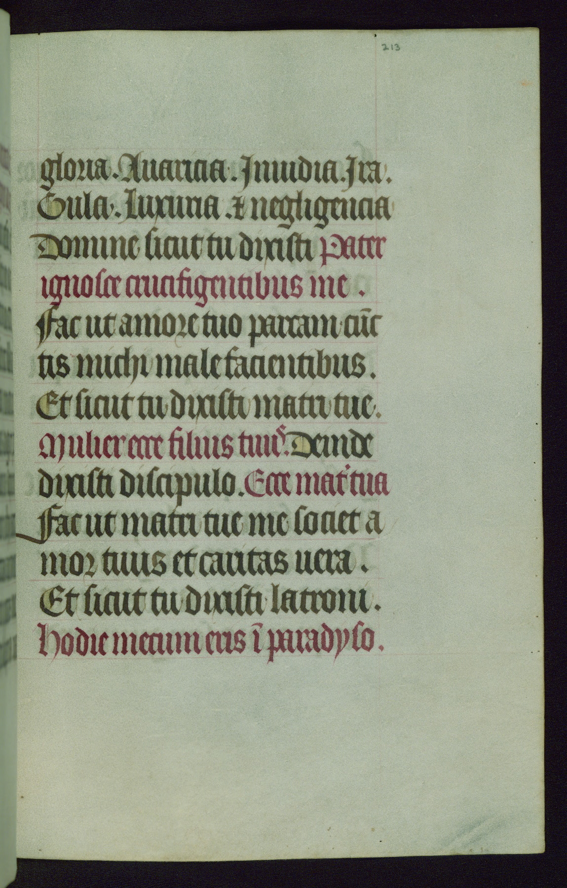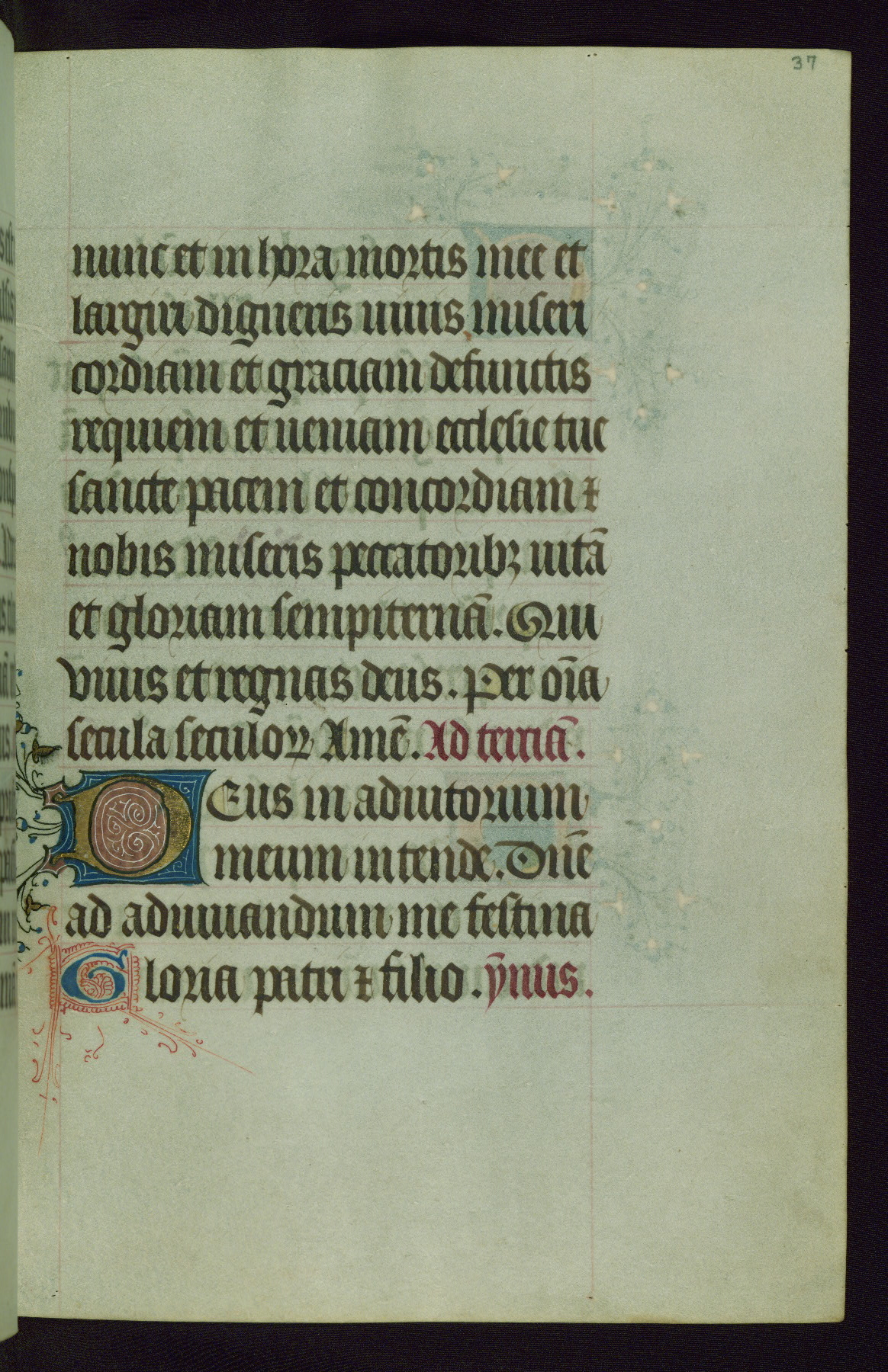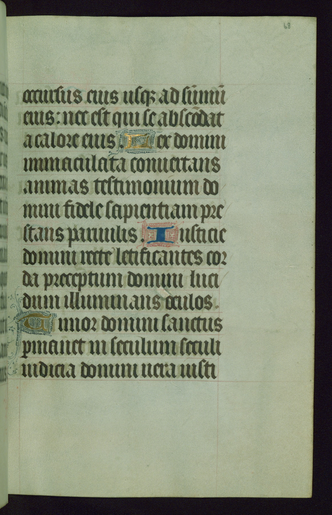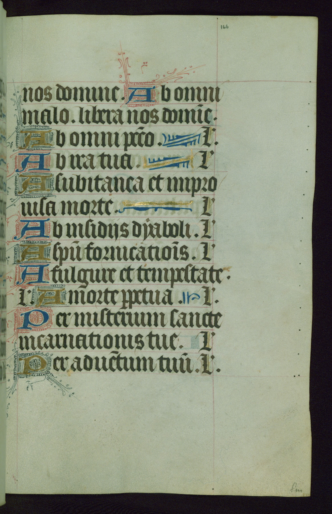 This Book of Hours, ca. 1460, was completed for use of Rome and illuminated under the influence, if not the direct participation, of Willem Vrelant. There remain twenty-two extant marginal calendar illustrations, thirteen extant full-page miniatures (many of which are paired with opening suffrages, perhaps suggesting a certain amount of significance to the owner), and one historiated initial. The contemporary binding, signed Livinus Stuaert, is dated 1477 and is most likely of Bruges or Ghent origin. It is thought that the first owner was French due to the French headings throughout and prominent fleur-de-lis figurations decorating the binding. Further, the first owner was likely female, suggested by the ways in which the book was structured to facilitate legibility. This is evinced by the large size of the script and the lack of abbreviations. While much of the text is standard, there remains evidence of personal significance and preference. This is seen in the chosen illuminations for those sections that are most significant to the owner. Most illuminations are paired with the opening page of staple Hours; however, many are accompanied by individual suffrages, constituting a large portion of the beginning of the manuscript. Personal preference is also shown in those sections of text that stray from the standard. The devotional sequence of this manuscript is notable for its sheer length and diversity of prayers as well as its inclusion of a French prayer not of official liturgy (fols. 215r-219v). The first collection of three prayers is headed and written in French. The prayer is attributed to St. Augustine and is described to guarantee a transformation of tribulation into joy through Christ's mercy, but only if the suppliant recites the prayer for thirty consecutive days. While it is not uncommon for evidence of an owner's predilections to surface in a Book of Hours, the particularly divergent features of this book allow readers to glean an intimate view of the patron.