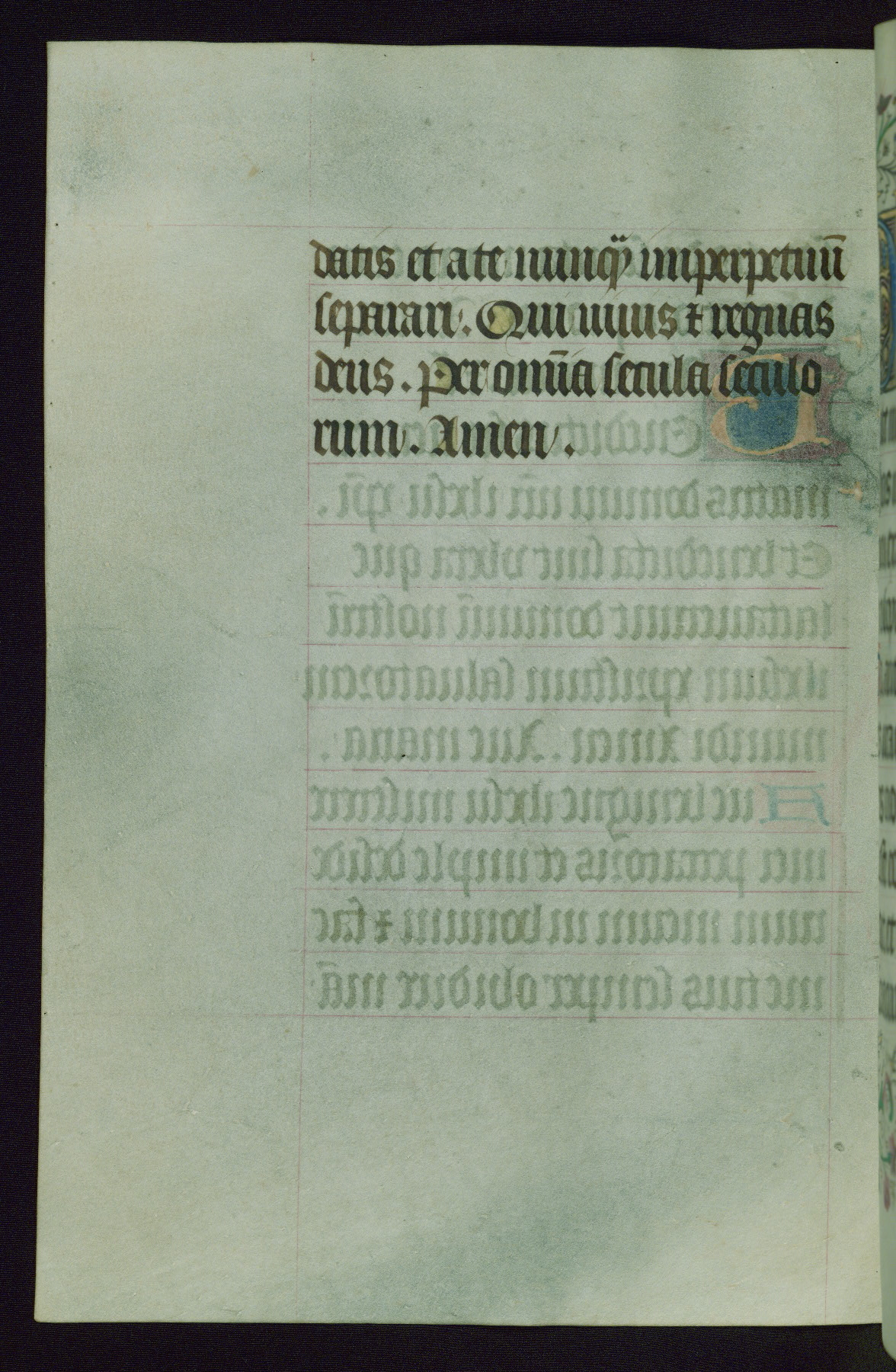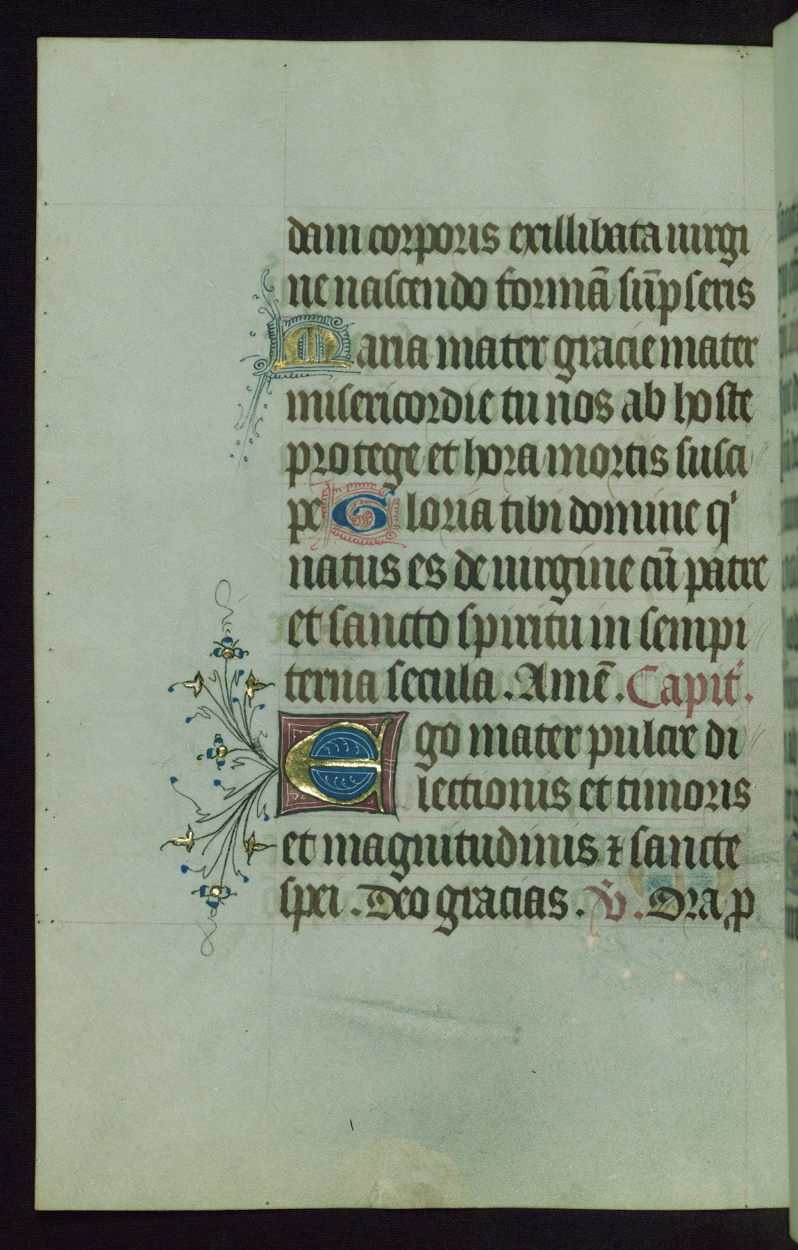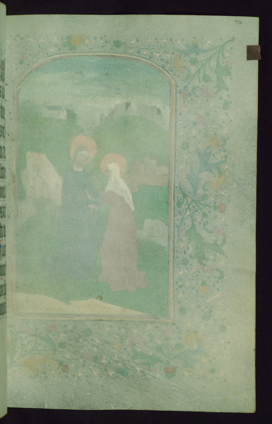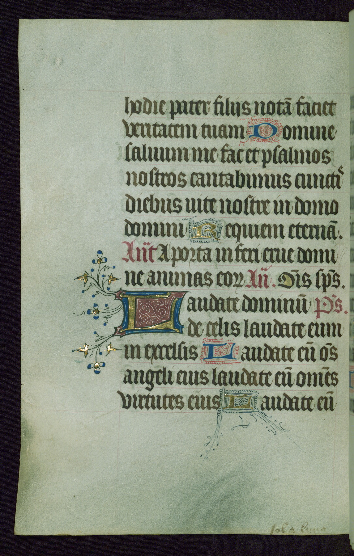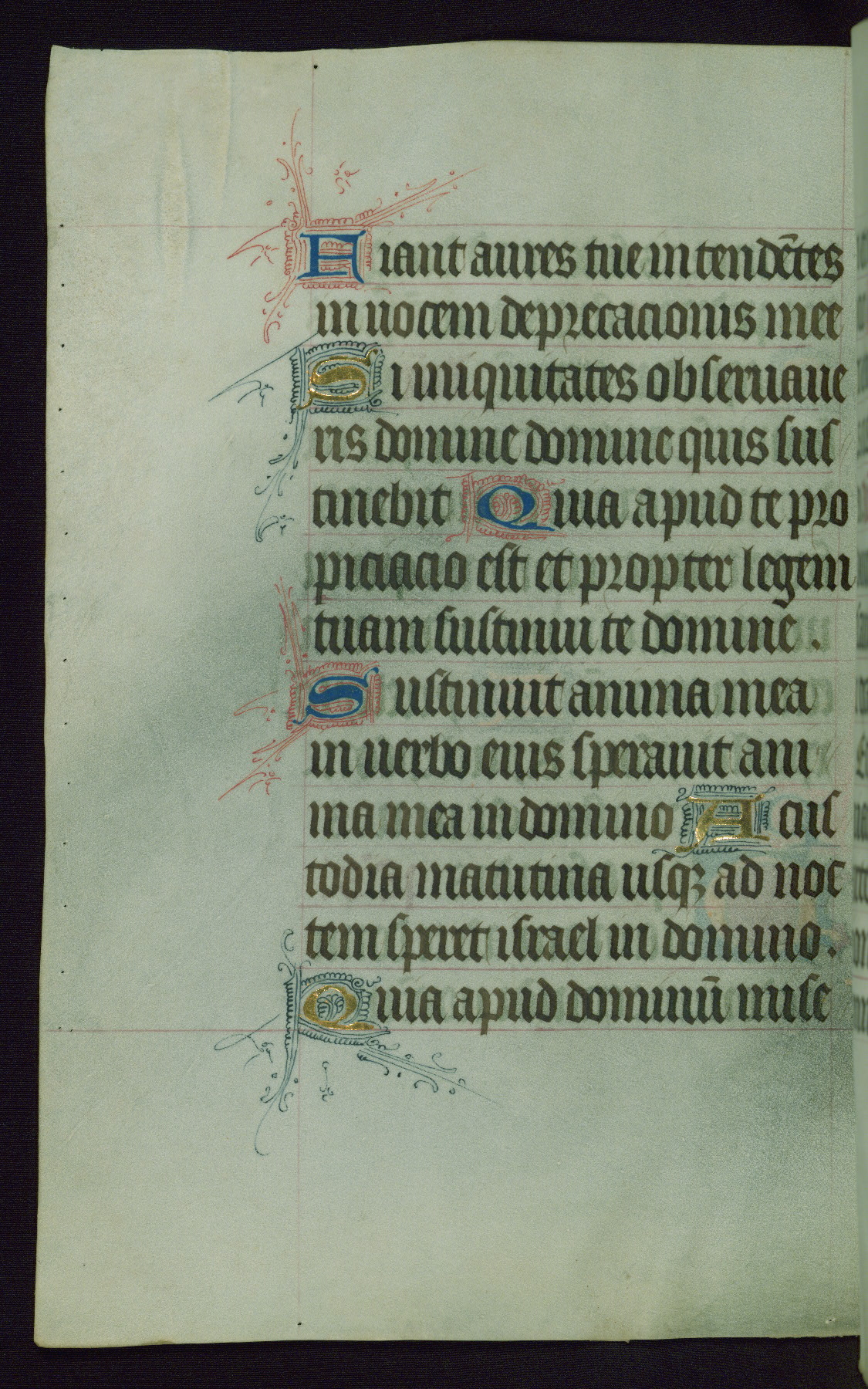 This Book of Hours, ca. 1460, was completed for use of Rome and illuminated under the influence, if not the direct participation, of Willem Vrelant. There remain twenty-two extant marginal calendar illustrations, thirteen extant full-page miniatures (many of which are paired with opening suffrages, perhaps suggesting a certain amount of significance to the owner), and one historiated initial. The contemporary binding, signed Livinus Stuaert, is dated 1477 and is most likely of Bruges or Ghent origin. It is thought that the first owner was French due to the French headings throughout and prominent fleur-de-lis figurations decorating the binding. Further, the first owner was likely female, suggested by the ways in which the book was structured to facilitate legibility. This is evinced by the large size of the script and the lack of abbreviations. While much of the text is standard, there remains evidence of personal significance and preference. This is seen in the chosen illuminations for those sections that are most significant to the owner. Most illuminations are paired with the opening page of staple Hours; however, many are accompanied by individual suffrages, constituting a large portion of the beginning of the manuscript. Personal preference is also shown in those sections of text that stray from the standard. The devotional sequence of this manuscript is notable for its sheer length and diversity of prayers as well as its inclusion of a French prayer not of official liturgy (fols. 215r-219v). The first collection of three prayers is headed and written in French. The prayer is attributed to St. Augustine and is described to guarantee a transformation of tribulation into joy through Christ's mercy, but only if the suppliant recites the prayer for thirty consecutive days. While it is not uncommon for evidence of an owner's predilections to surface in a Book of Hours, the particularly divergent features of this book allow readers to glean an intimate view of the patron.