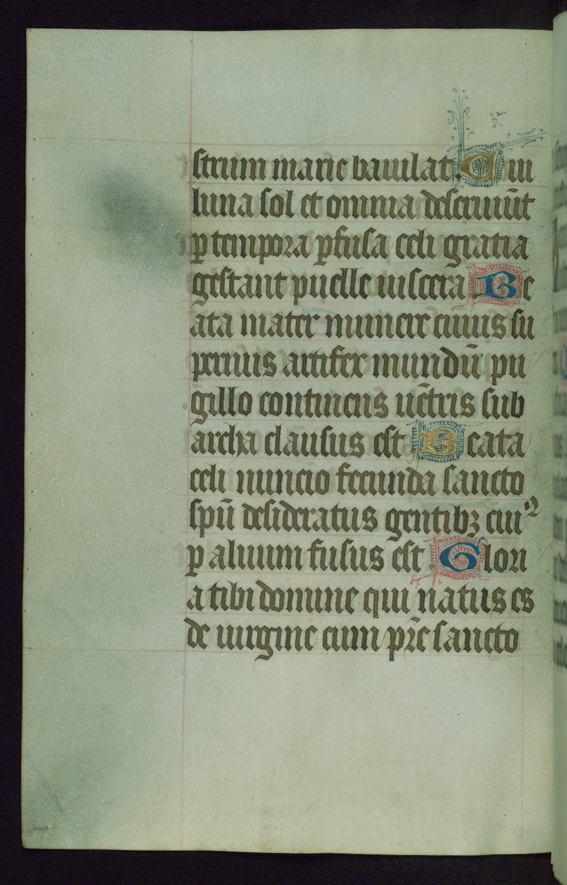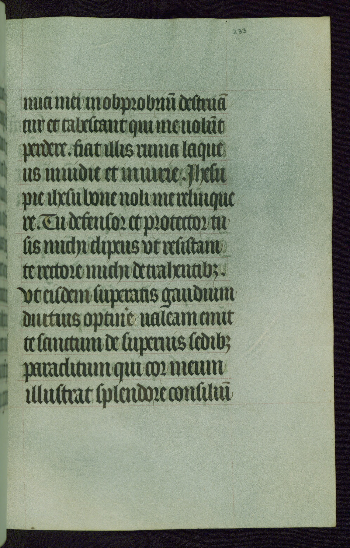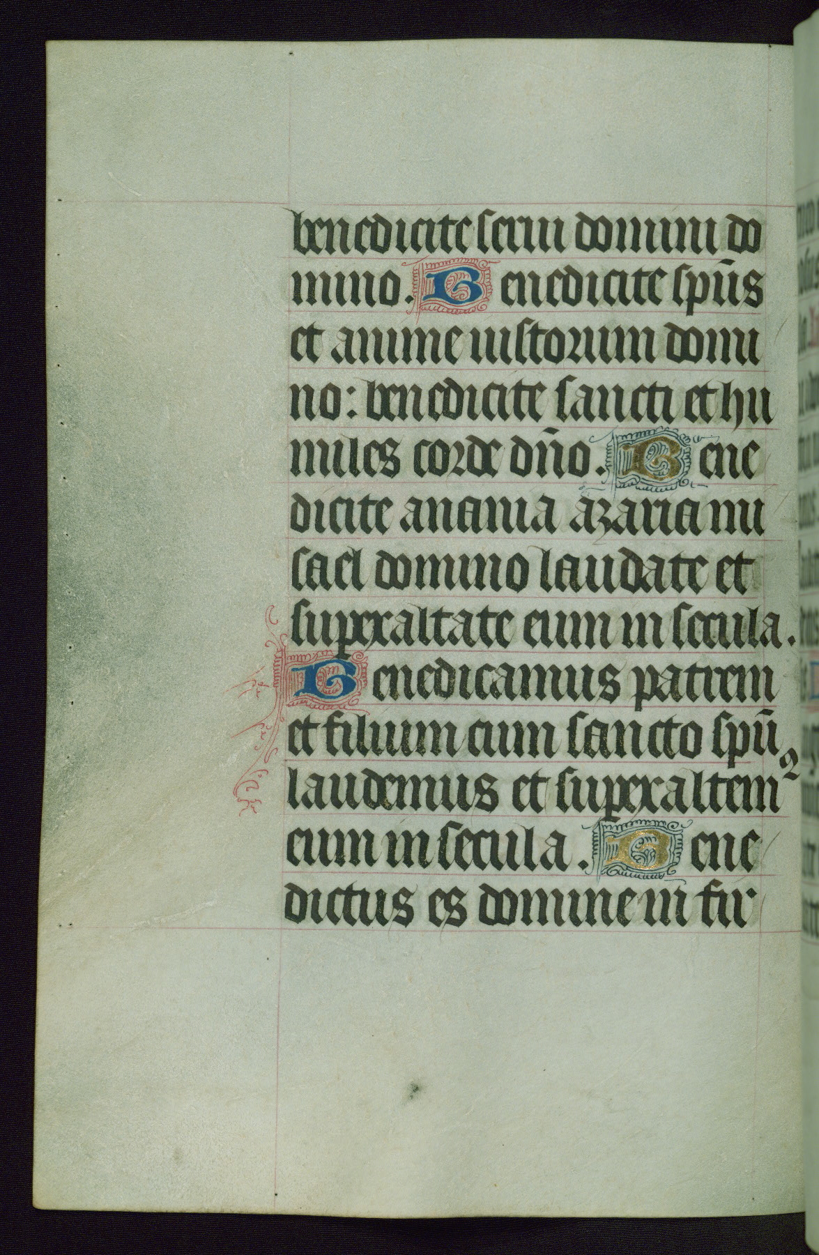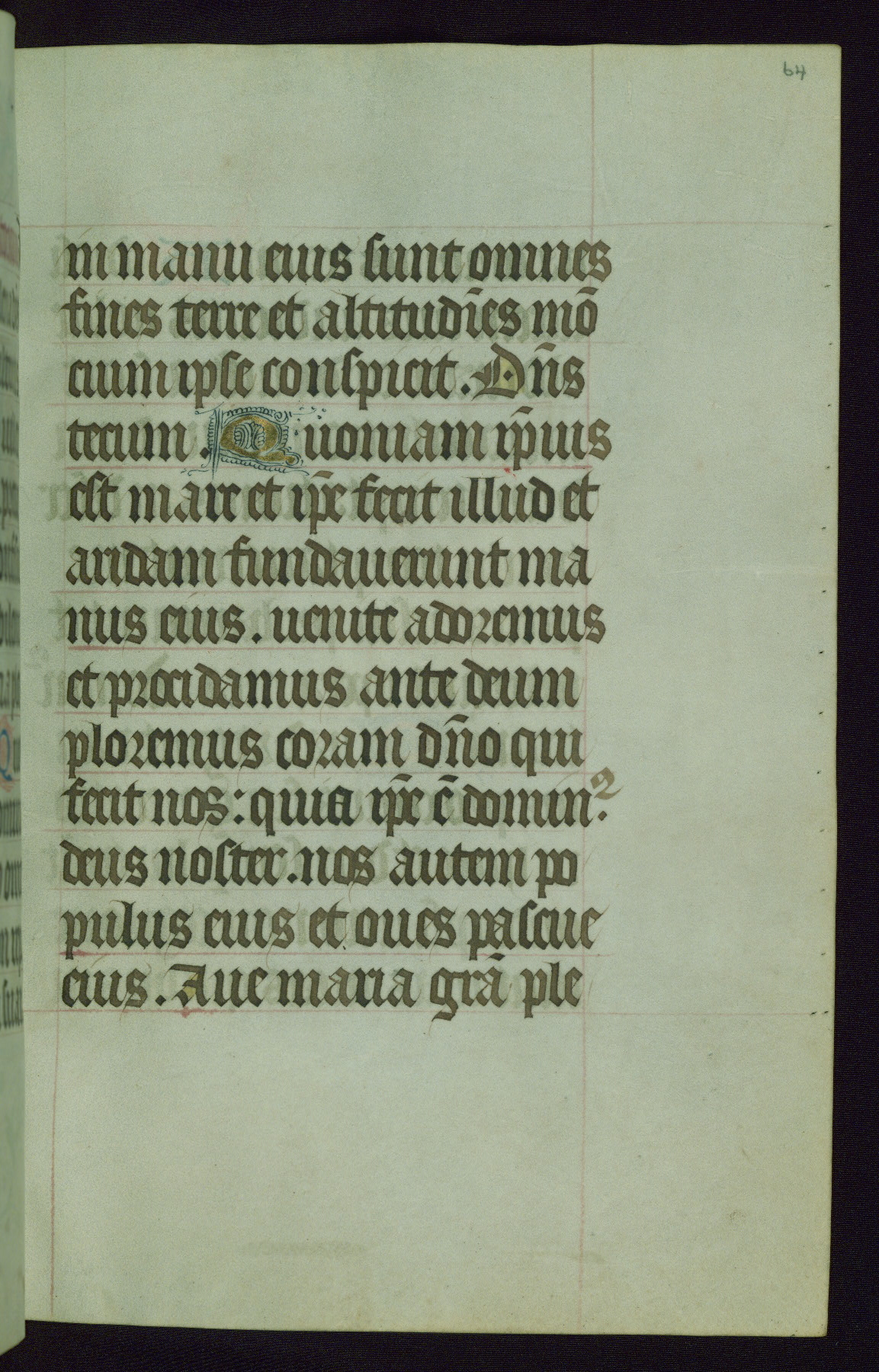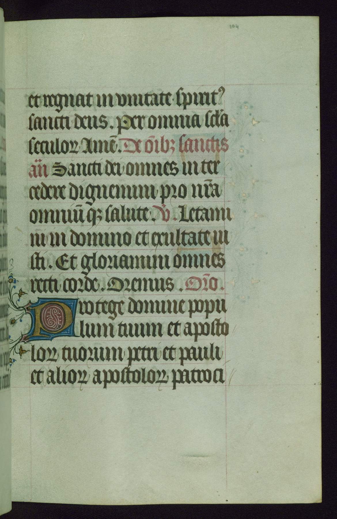 This Book of Hours, ca. 1460, was completed for use of Rome and illuminated under the influence, if not the direct participation, of Willem Vrelant. There remain twenty-two extant marginal calendar illustrations, thirteen extant full-page miniatures (many of which are paired with opening suffrages, perhaps suggesting a certain amount of significance to the owner), and one historiated initial. The contemporary binding, signed Livinus Stuaert, is dated 1477 and is most likely of Bruges or Ghent origin. It is thought that the first owner was French due to the French headings throughout and prominent fleur-de-lis figurations decorating the binding. Further, the first owner was likely female, suggested by the ways in which the book was structured to facilitate legibility. This is evinced by the large size of the script and the lack of abbreviations. While much of the text is standard, there remains evidence of personal significance and preference. This is seen in the chosen illuminations for those sections that are most significant to the owner. Most illuminations are paired with the opening page of staple Hours; however, many are accompanied by individual suffrages, constituting a large portion of the beginning of the manuscript. Personal preference is also shown in those sections of text that stray from the standard. The devotional sequence of this manuscript is notable for its sheer length and diversity of prayers as well as its inclusion of a French prayer not of official liturgy (fols. 215r-219v). The first collection of three prayers is headed and written in French. The prayer is attributed to St. Augustine and is described to guarantee a transformation of tribulation into joy through Christ's mercy, but only if the suppliant recites the prayer for thirty consecutive days. While it is not uncommon for evidence of an owner's predilections to surface in a Book of Hours, the particularly divergent features of this book allow readers to glean an intimate view of the patron.