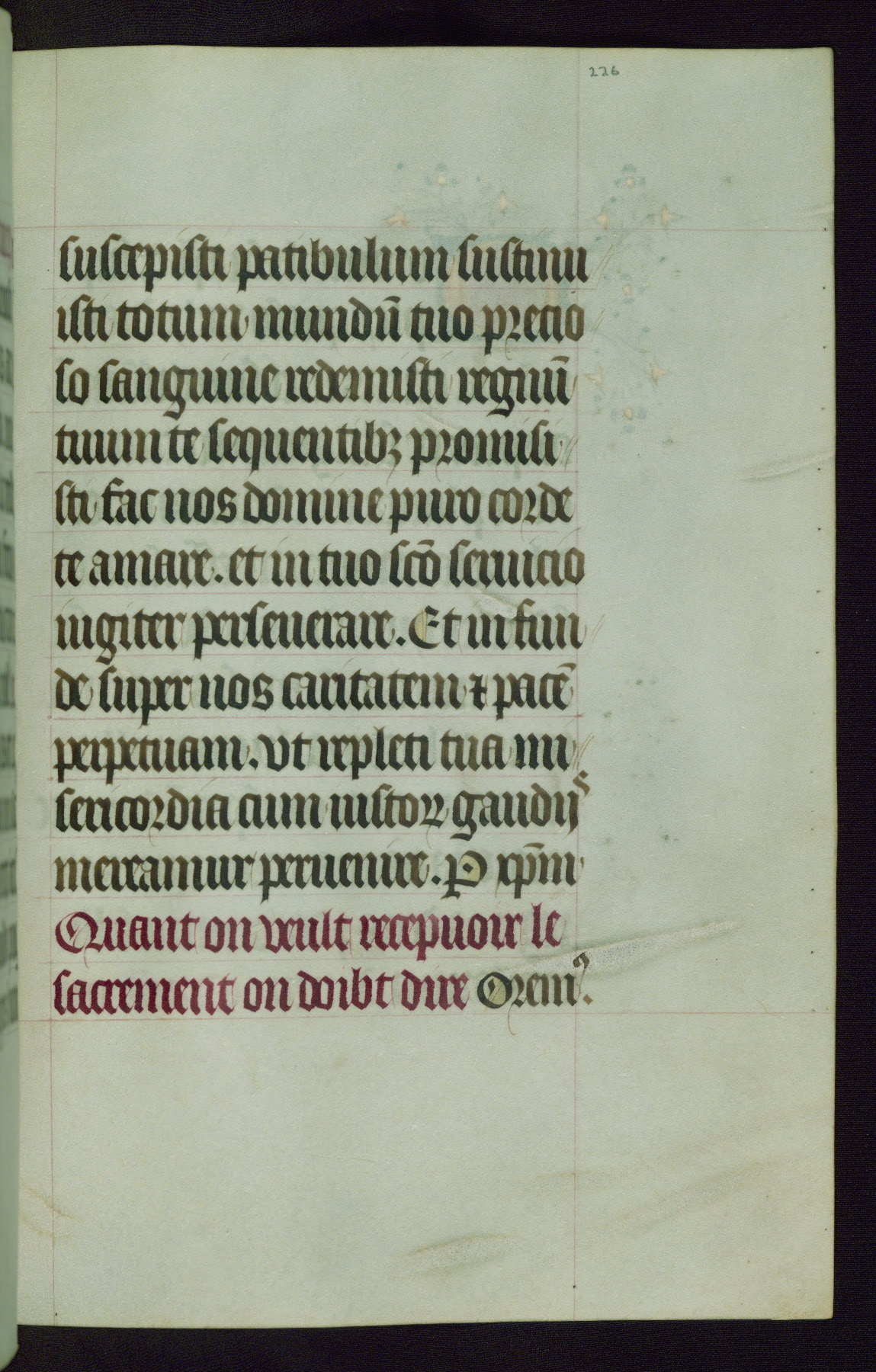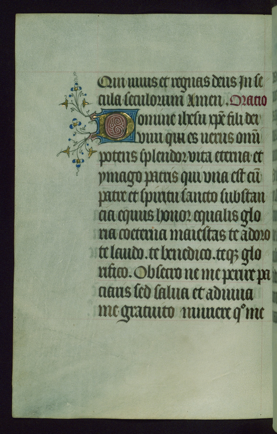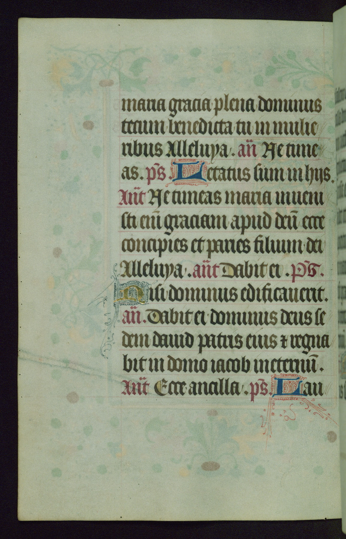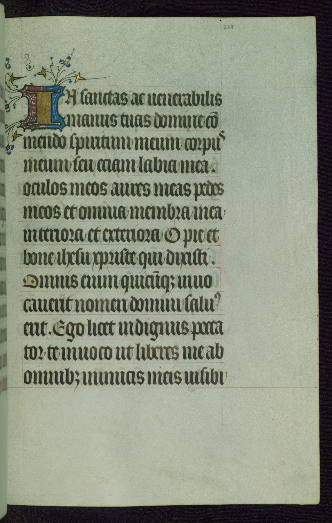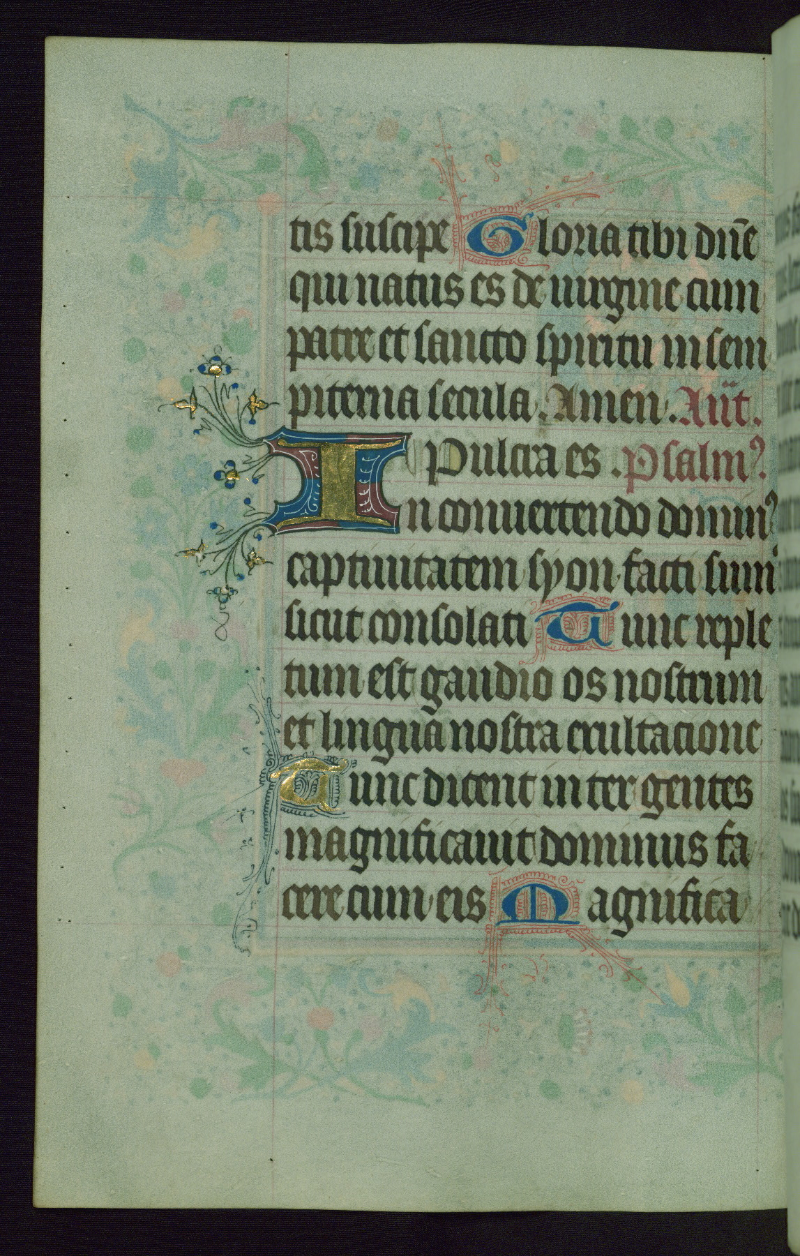 This Book of Hours, ca. 1460, was completed for use of Rome and illuminated under the influence, if not the direct participation, of Willem Vrelant. There remain twenty-two extant marginal calendar illustrations, thirteen extant full-page miniatures (many of which are paired with opening suffrages, perhaps suggesting a certain amount of significance to the owner), and one historiated initial. The contemporary binding, signed Livinus Stuaert, is dated 1477 and is most likely of Bruges or Ghent origin. It is thought that the first owner was French due to the French headings throughout and prominent fleur-de-lis figurations decorating the binding. Further, the first owner was likely female, suggested by the ways in which the book was structured to facilitate legibility. This is evinced by the large size of the script and the lack of abbreviations. While much of the text is standard, there remains evidence of personal significance and preference. This is seen in the chosen illuminations for those sections that are most significant to the owner. Most illuminations are paired with the opening page of staple Hours; however, many are accompanied by individual suffrages, constituting a large portion of the beginning of the manuscript. Personal preference is also shown in those sections of text that stray from the standard. The devotional sequence of this manuscript is notable for its sheer length and diversity of prayers as well as its inclusion of a French prayer not of official liturgy (fols. 215r-219v). The first collection of three prayers is headed and written in French. The prayer is attributed to St. Augustine and is described to guarantee a transformation of tribulation into joy through Christ's mercy, but only if the suppliant recites the prayer for thirty consecutive days. While it is not uncommon for evidence of an owner's predilections to surface in a Book of Hours, the particularly divergent features of this book allow readers to glean an intimate view of the patron.