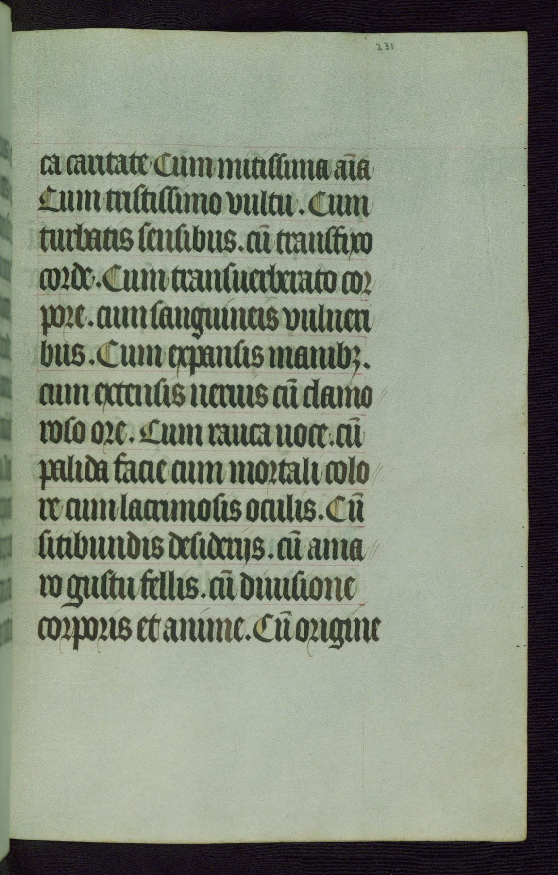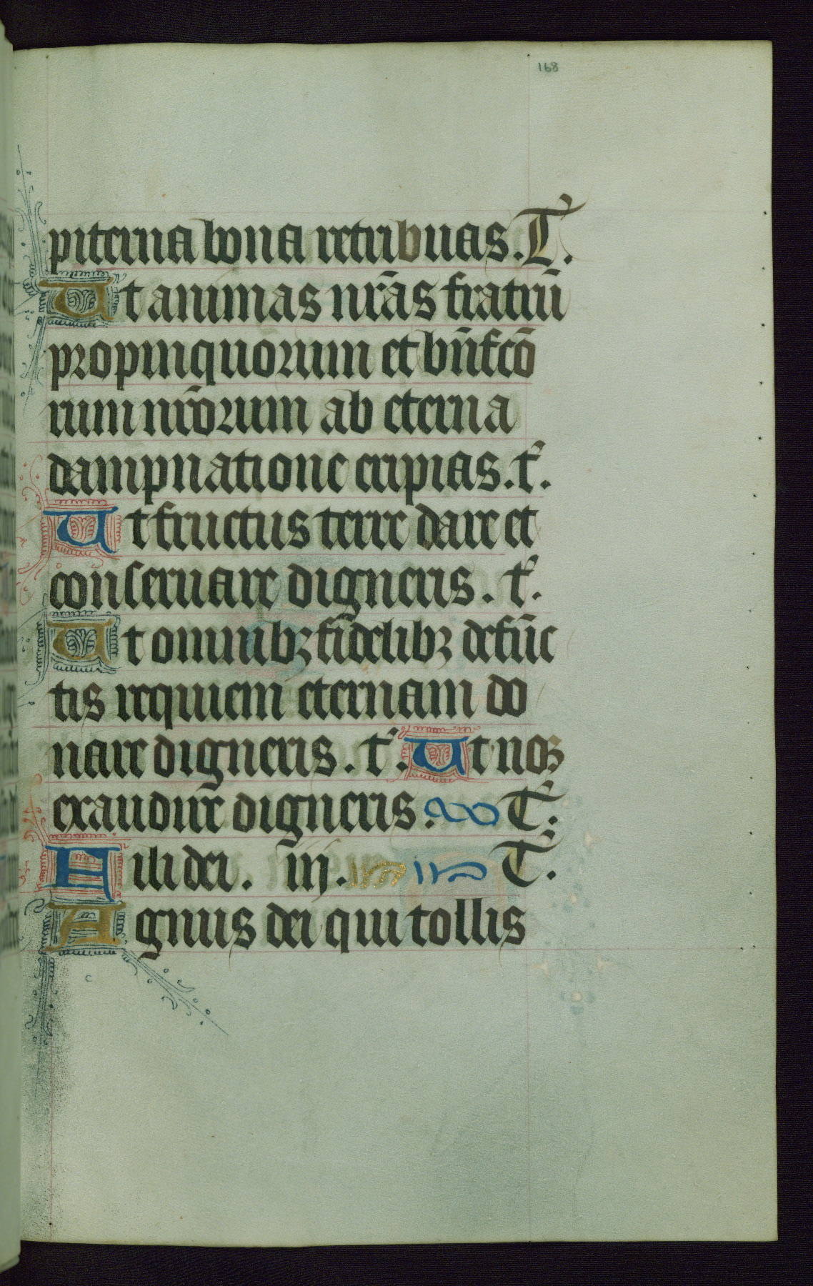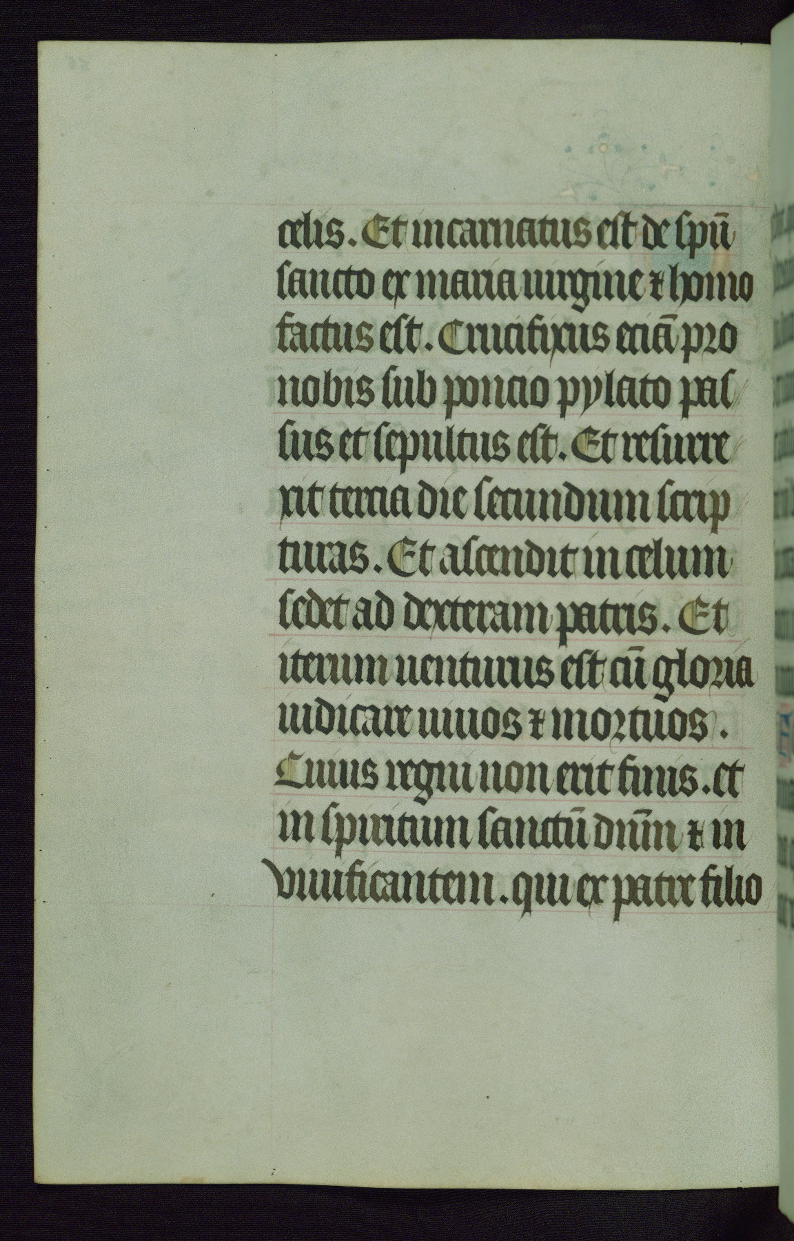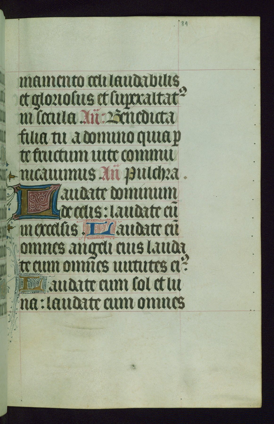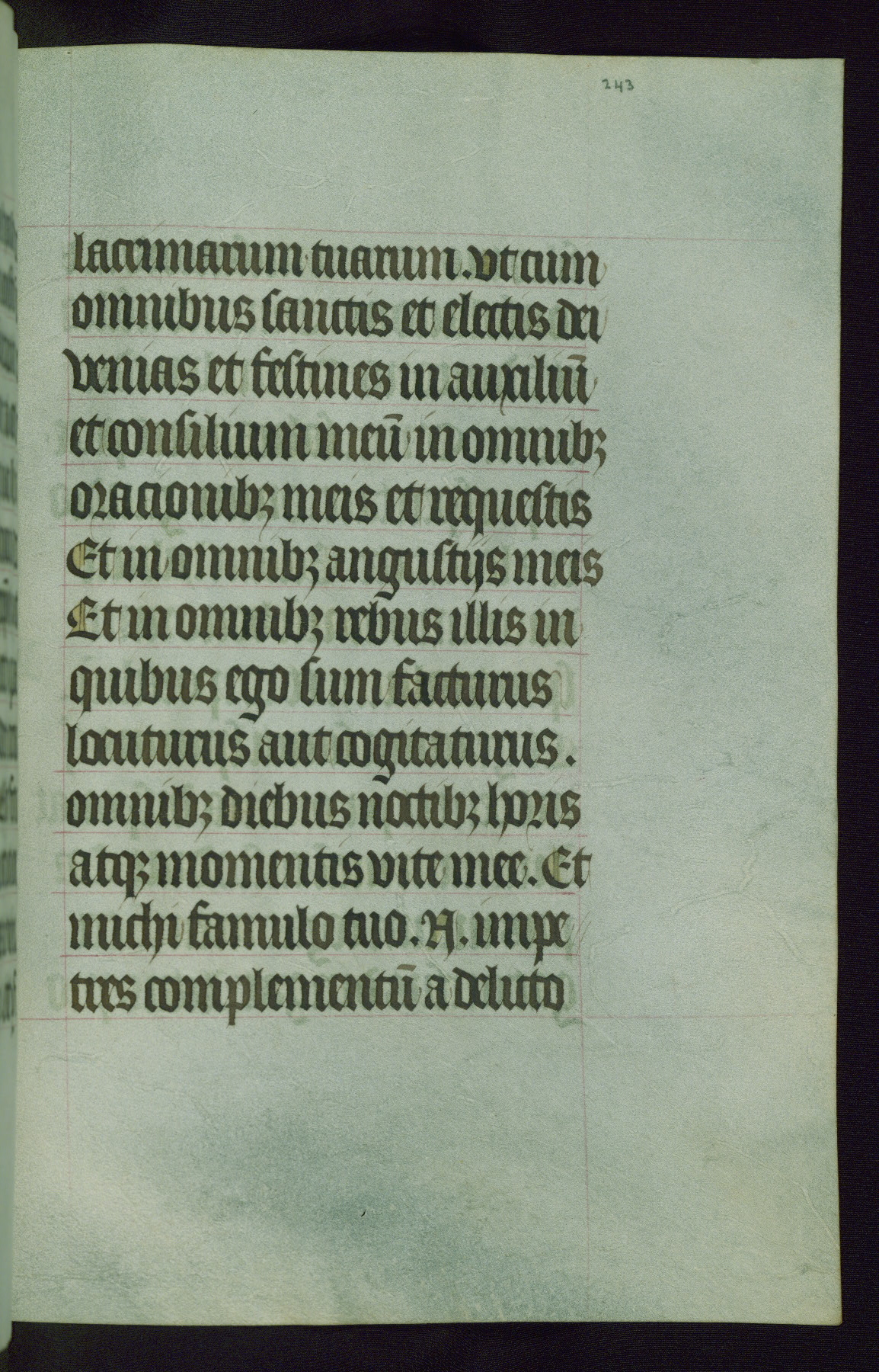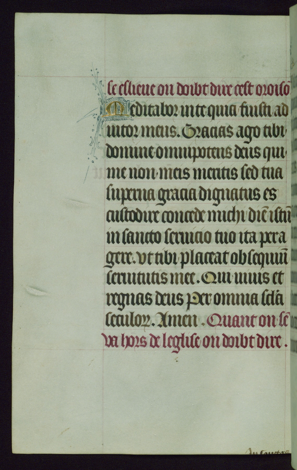 This Book of Hours, ca. 1460, was completed for use of Rome and illuminated under the influence, if not the direct participation, of Willem Vrelant. There remain twenty-two extant marginal calendar illustrations, thirteen extant full-page miniatures (many of which are paired with opening suffrages, perhaps suggesting a certain amount of significance to the owner), and one historiated initial. The contemporary binding, signed Livinus Stuaert, is dated 1477 and is most likely of Bruges or Ghent origin. It is thought that the first owner was French due to the French headings throughout and prominent fleur-de-lis figurations decorating the binding. Further, the first owner was likely female, suggested by the ways in which the book was structured to facilitate legibility. This is evinced by the large size of the script and the lack of abbreviations. While much of the text is standard, there remains evidence of personal significance and preference. This is seen in the chosen illuminations for those sections that are most significant to the owner. Most illuminations are paired with the opening page of staple Hours; however, many are accompanied by individual suffrages, constituting a large portion of the beginning of the manuscript. Personal preference is also shown in those sections of text that stray from the standard. The devotional sequence of this manuscript is notable for its sheer length and diversity of prayers as well as its inclusion of a French prayer not of official liturgy (fols. 215r-219v). The first collection of three prayers is headed and written in French. The prayer is attributed to St. Augustine and is described to guarantee a transformation of tribulation into joy through Christ's mercy, but only if the suppliant recites the prayer for thirty consecutive days. While it is not uncommon for evidence of an owner's predilections to surface in a Book of Hours, the particularly divergent features of this book allow readers to glean an intimate view of the patron.